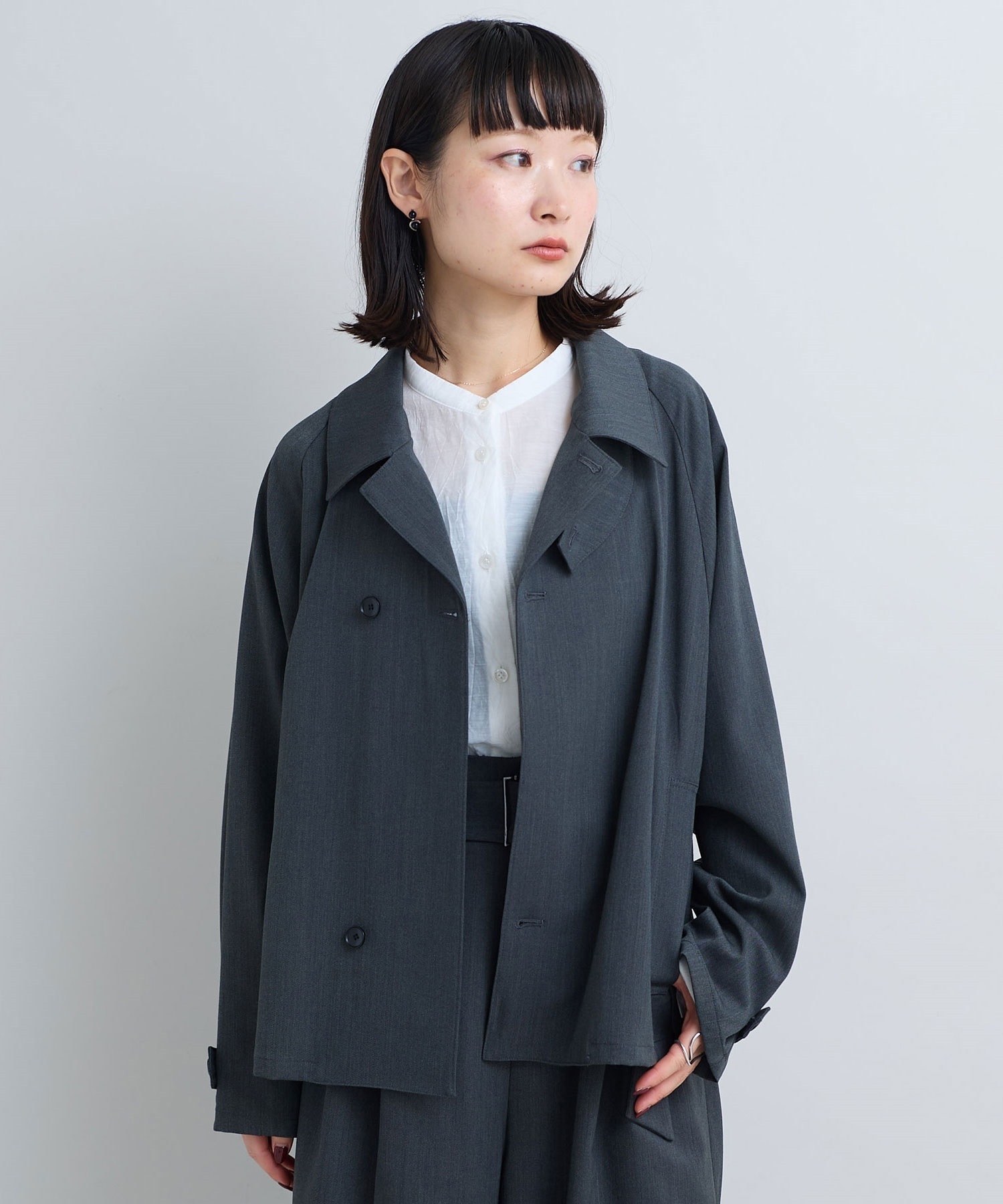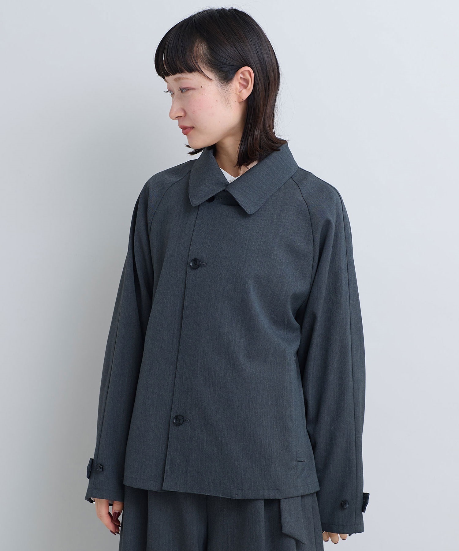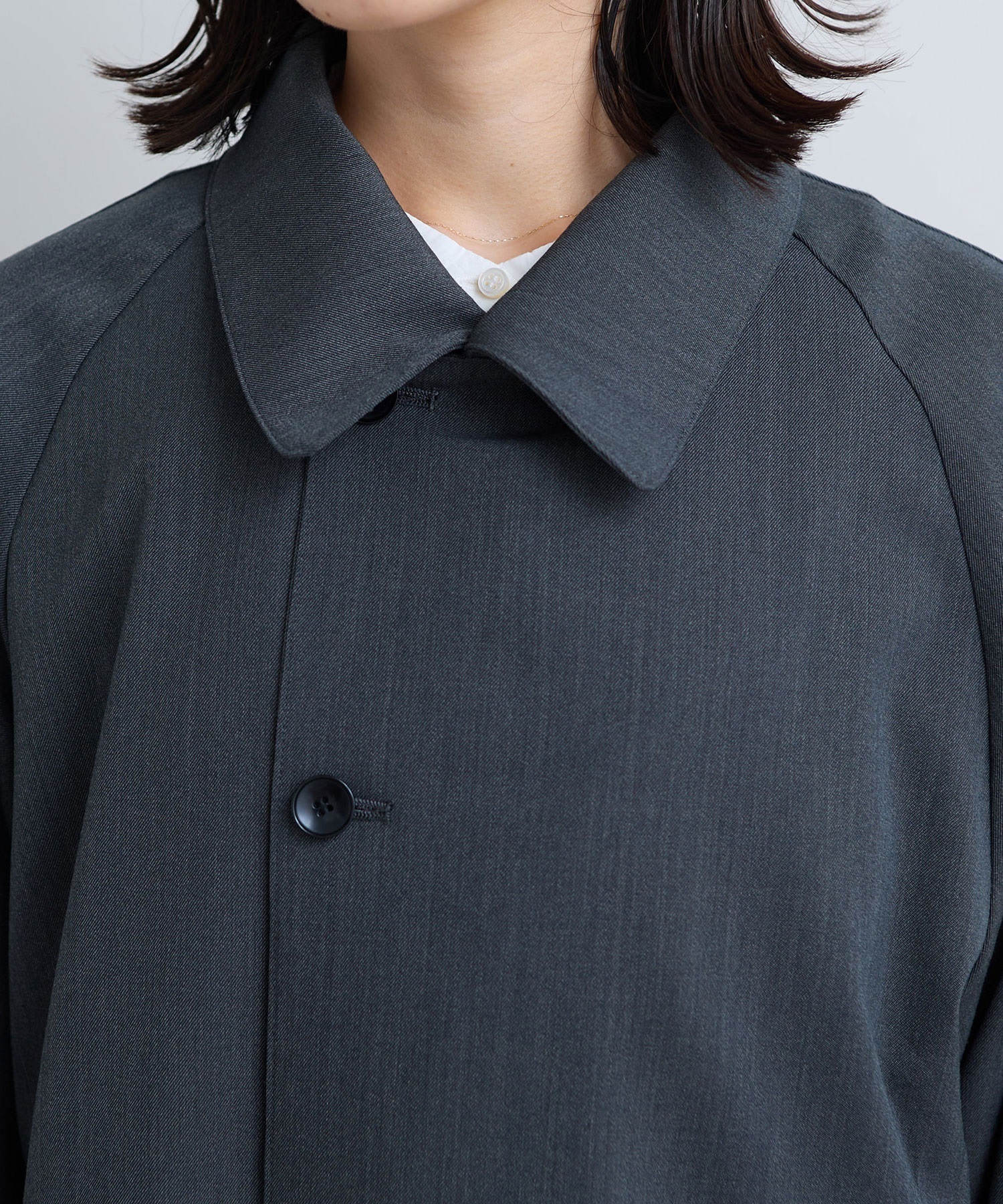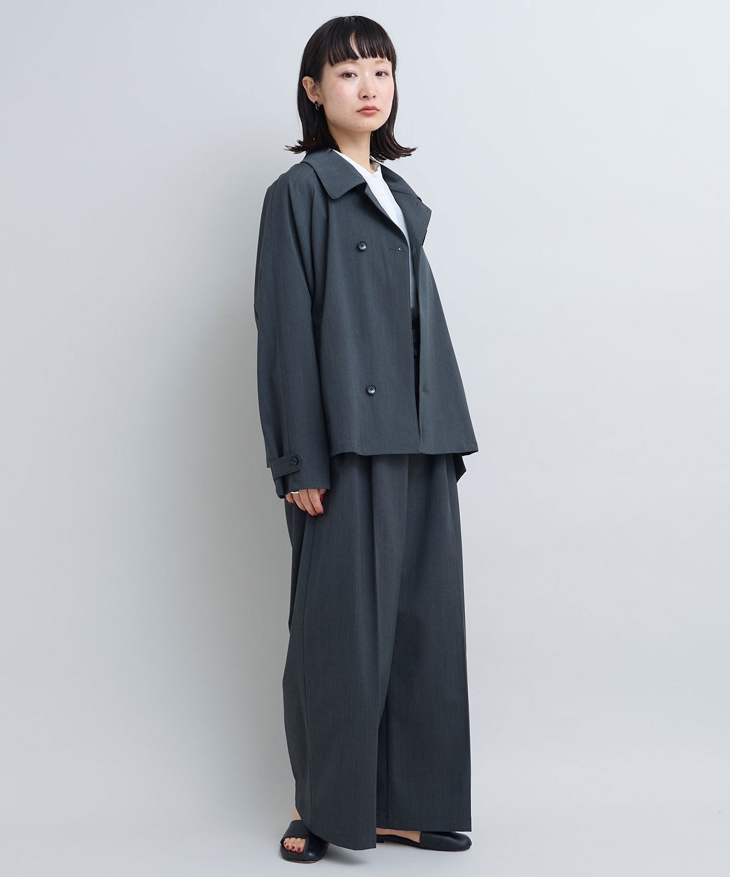 高密度に織り上げることでコンパクトに仕上げた、リサイクルポリエステル×ノンミュールウール素材のギャバジン生地を使用。