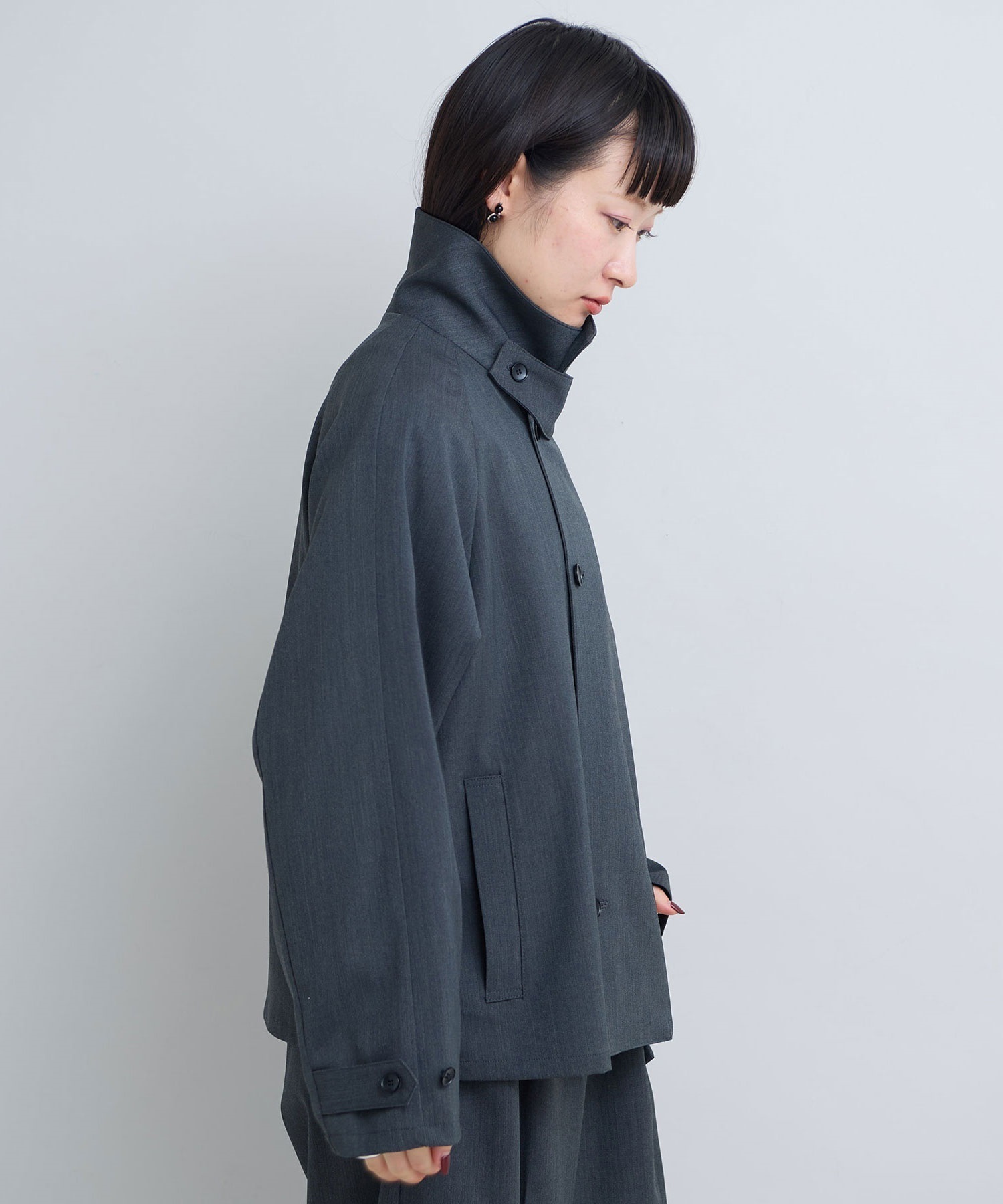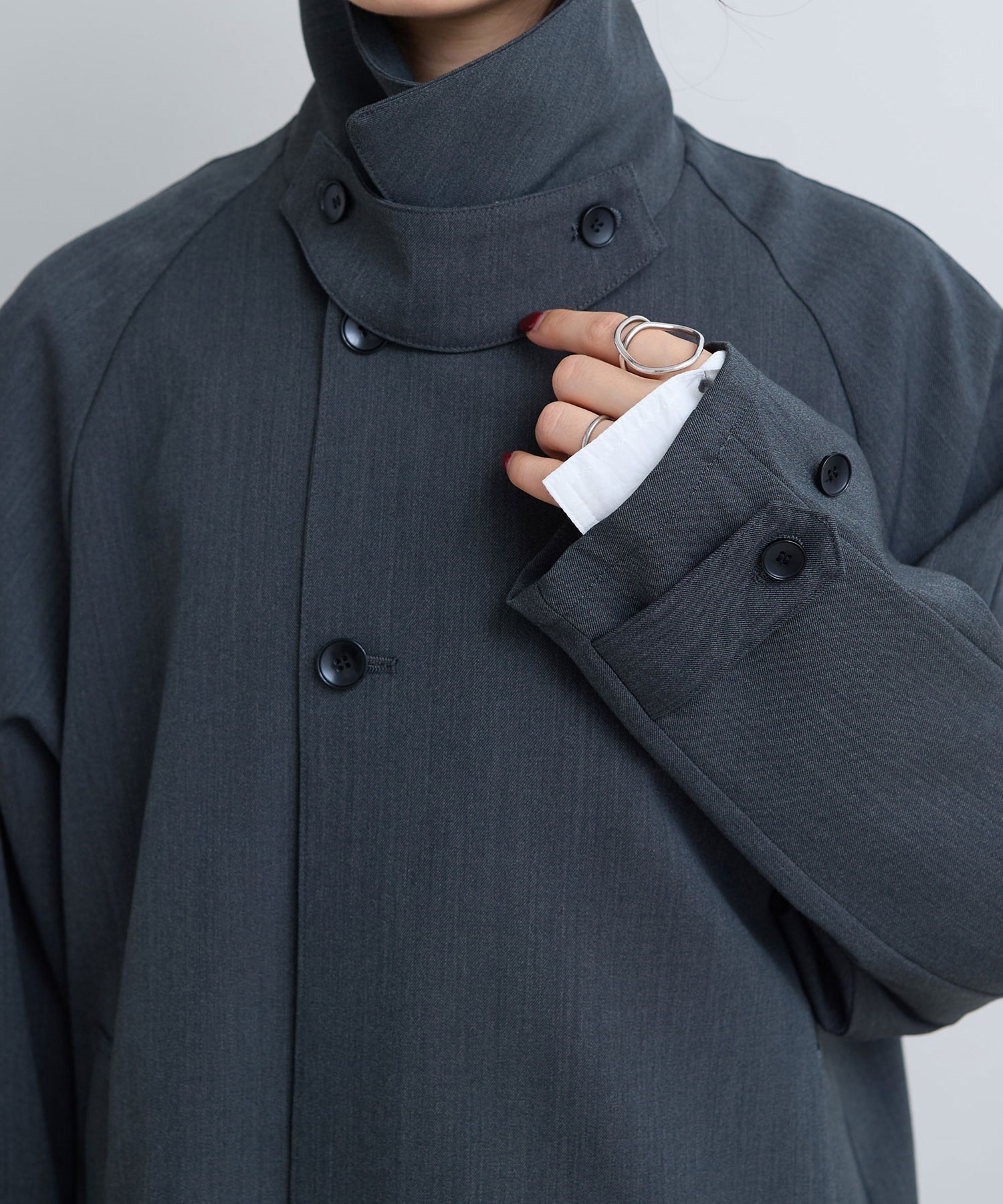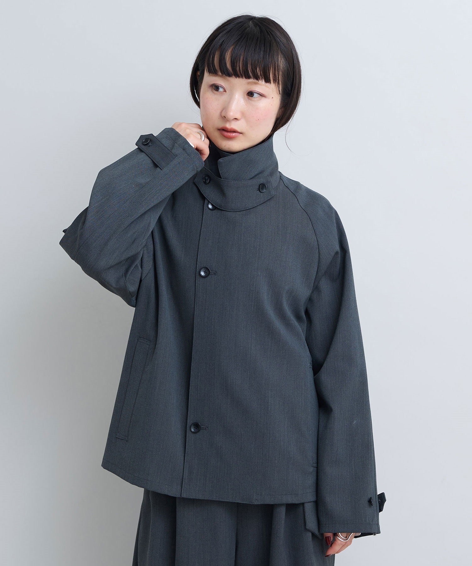 釦を上まで閉じ、襟を立ててチンウォーマーで止めることもできる2Way仕様です。