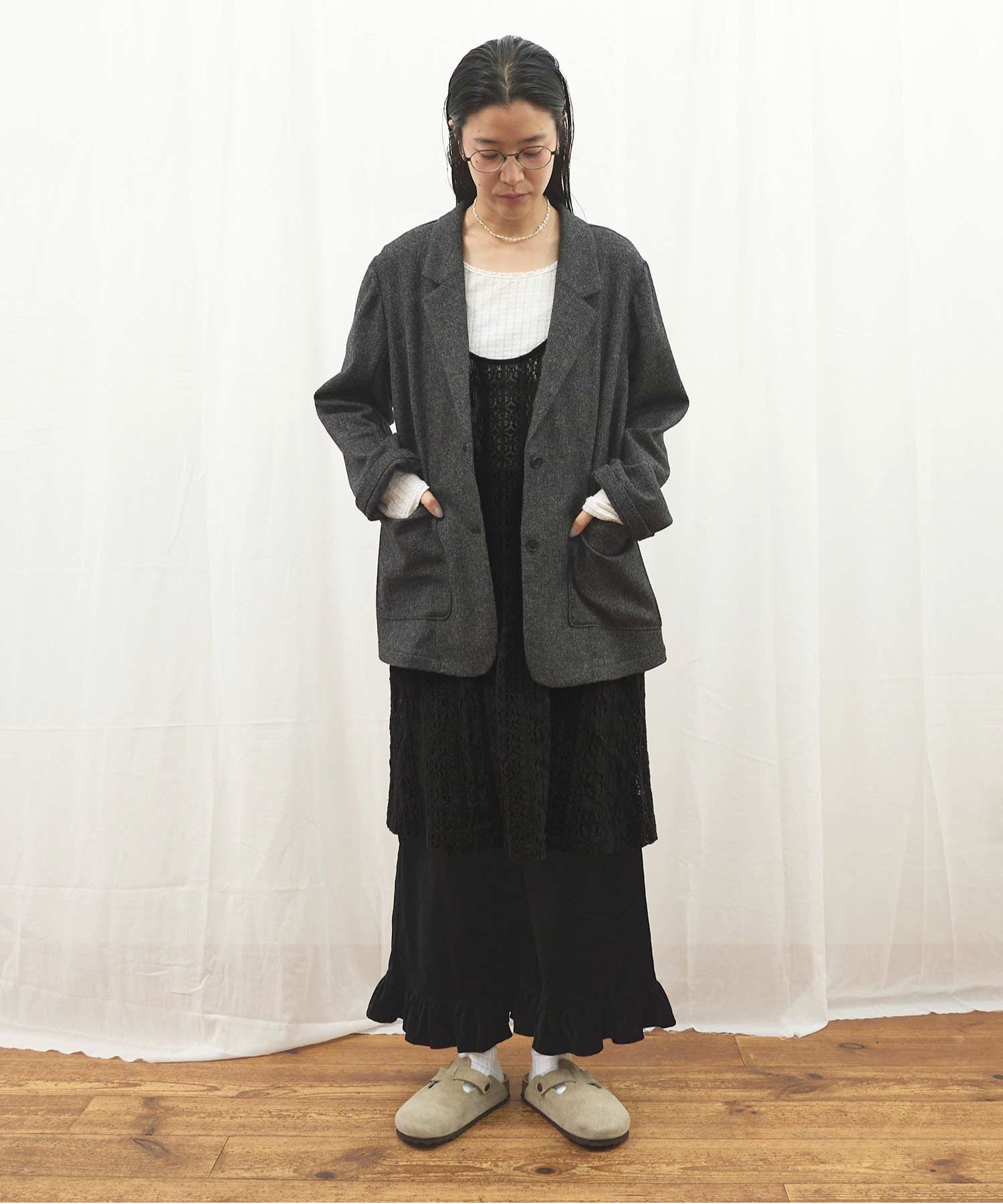 ゆったりサイズなのでスウェットなどの厚手トップスと合わせるのもおすすめです。