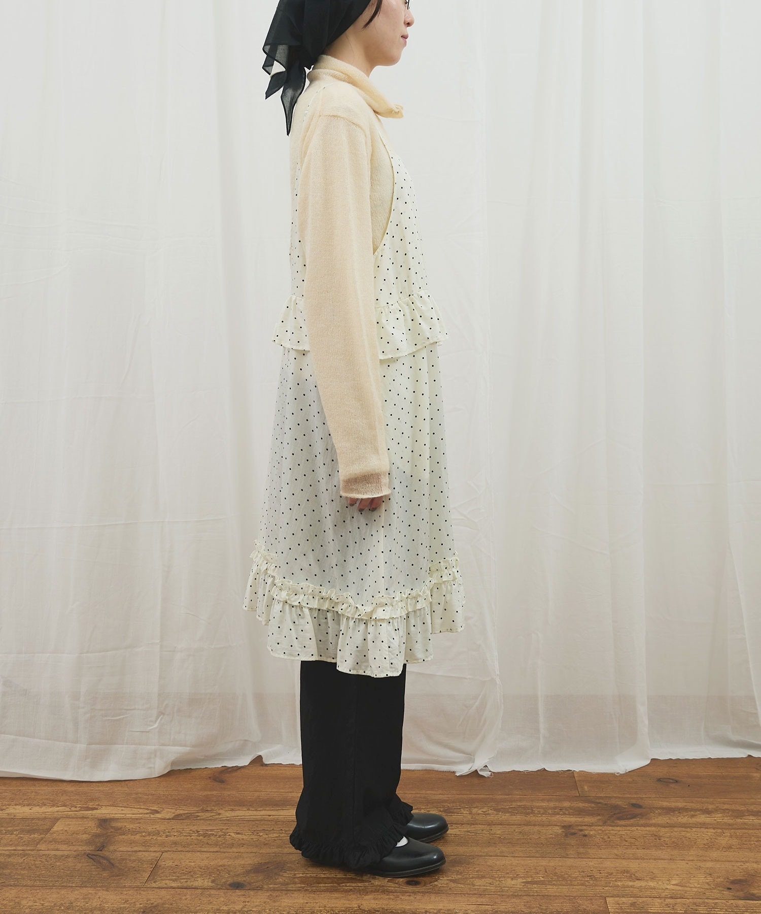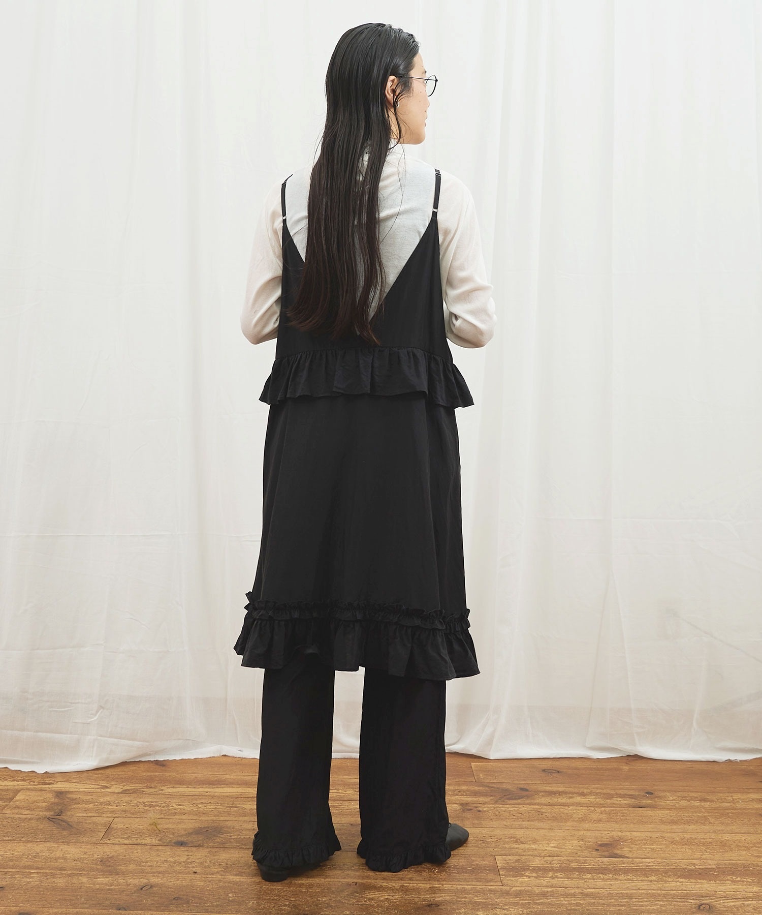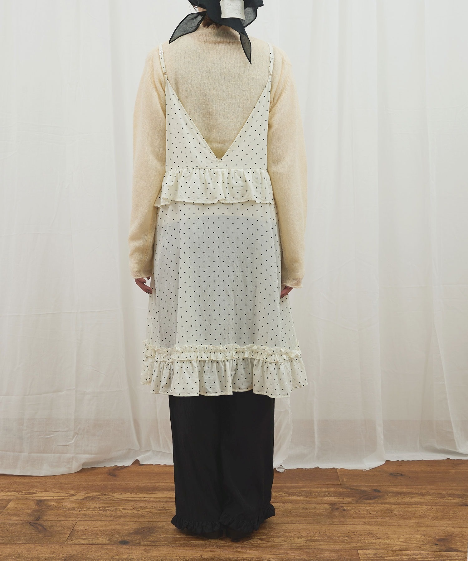 ワンピースは前後どちらを前にしても着られ、肩紐の長さも調節可能。華やかでありながら日常に着やすい1枚です。