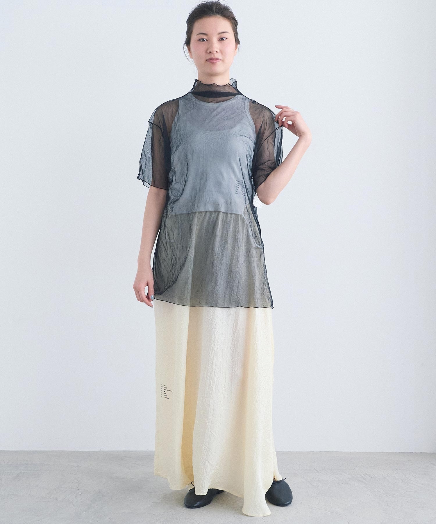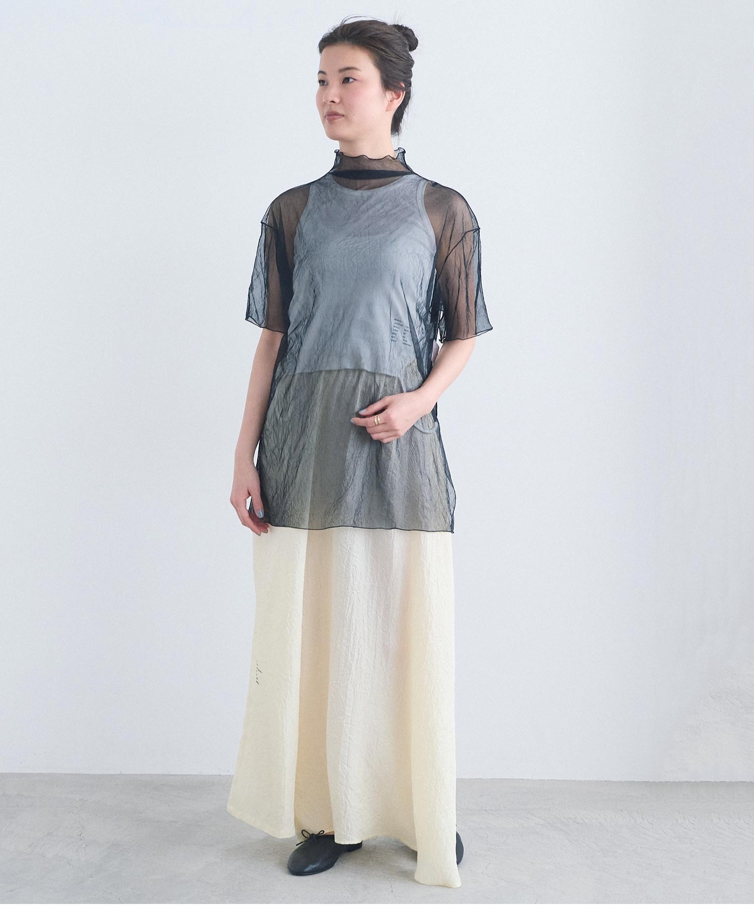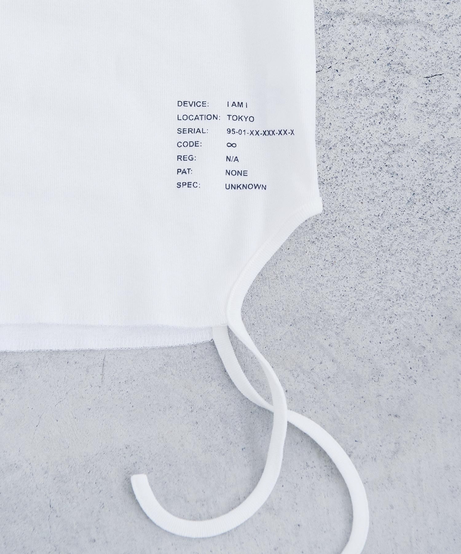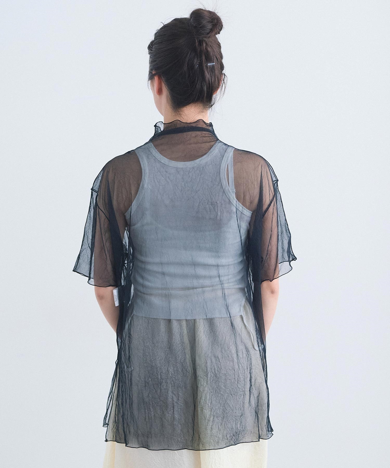 “つらら” のようにすっと下へ落ちるリボンが印象的なタンクトップ。