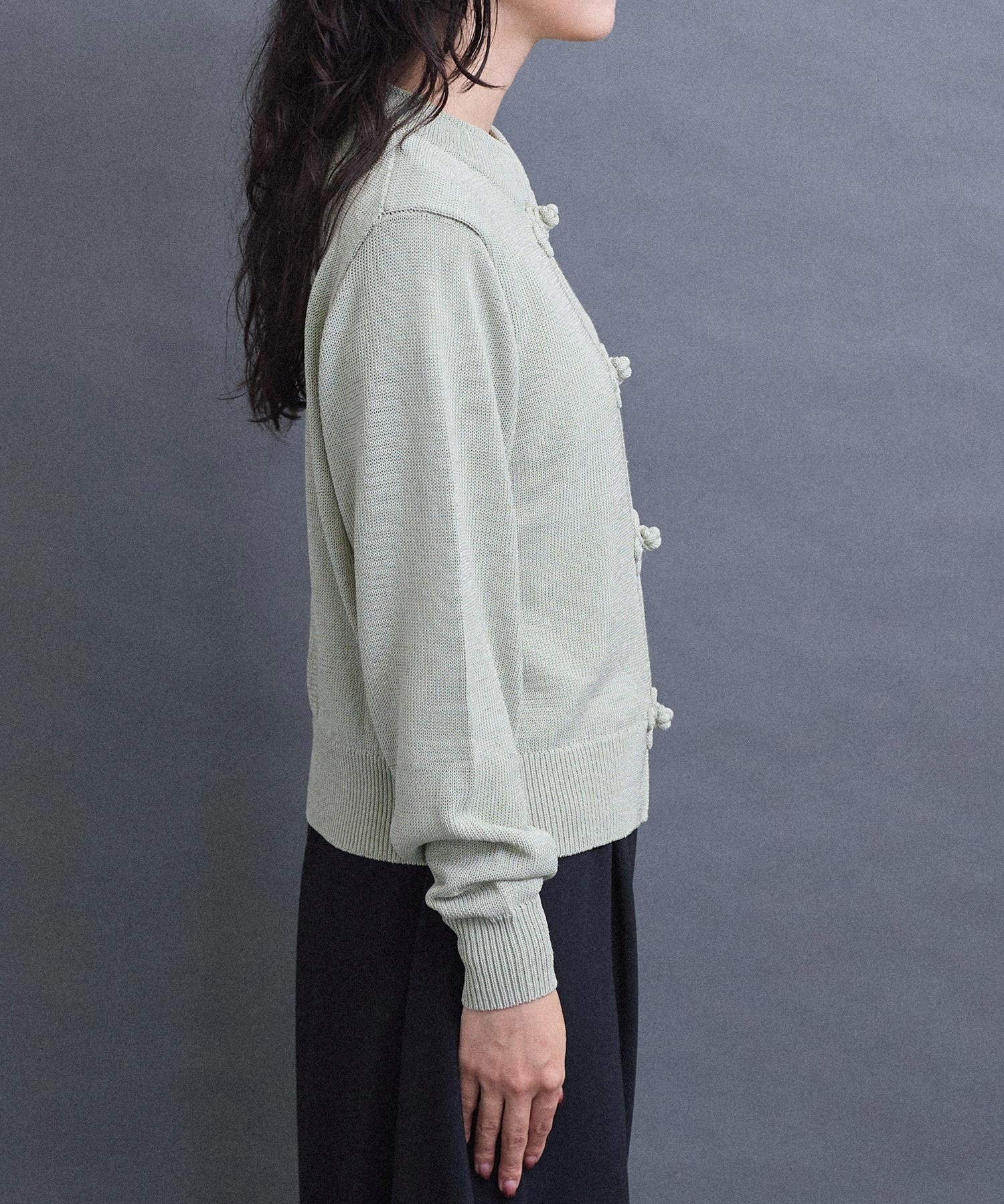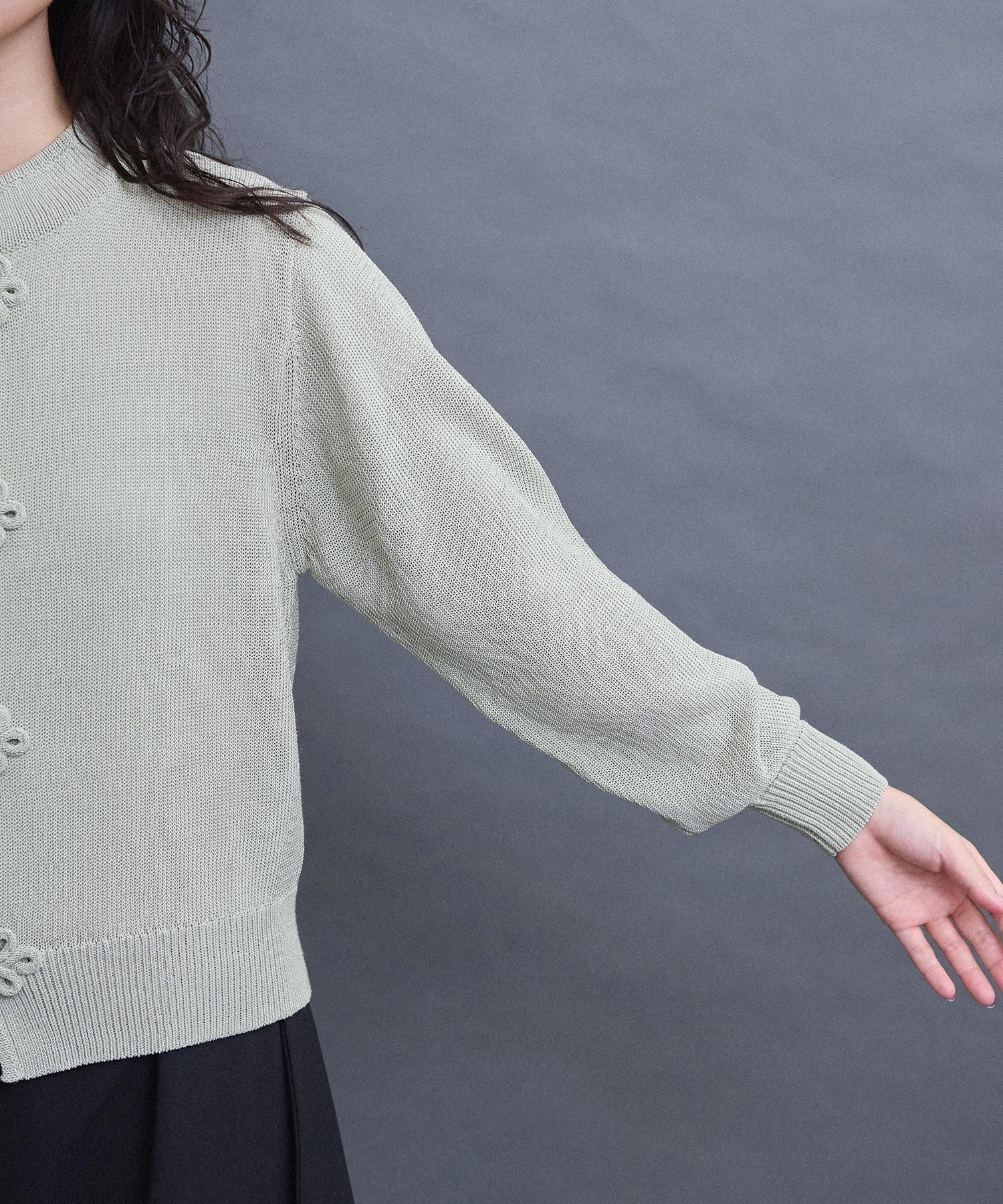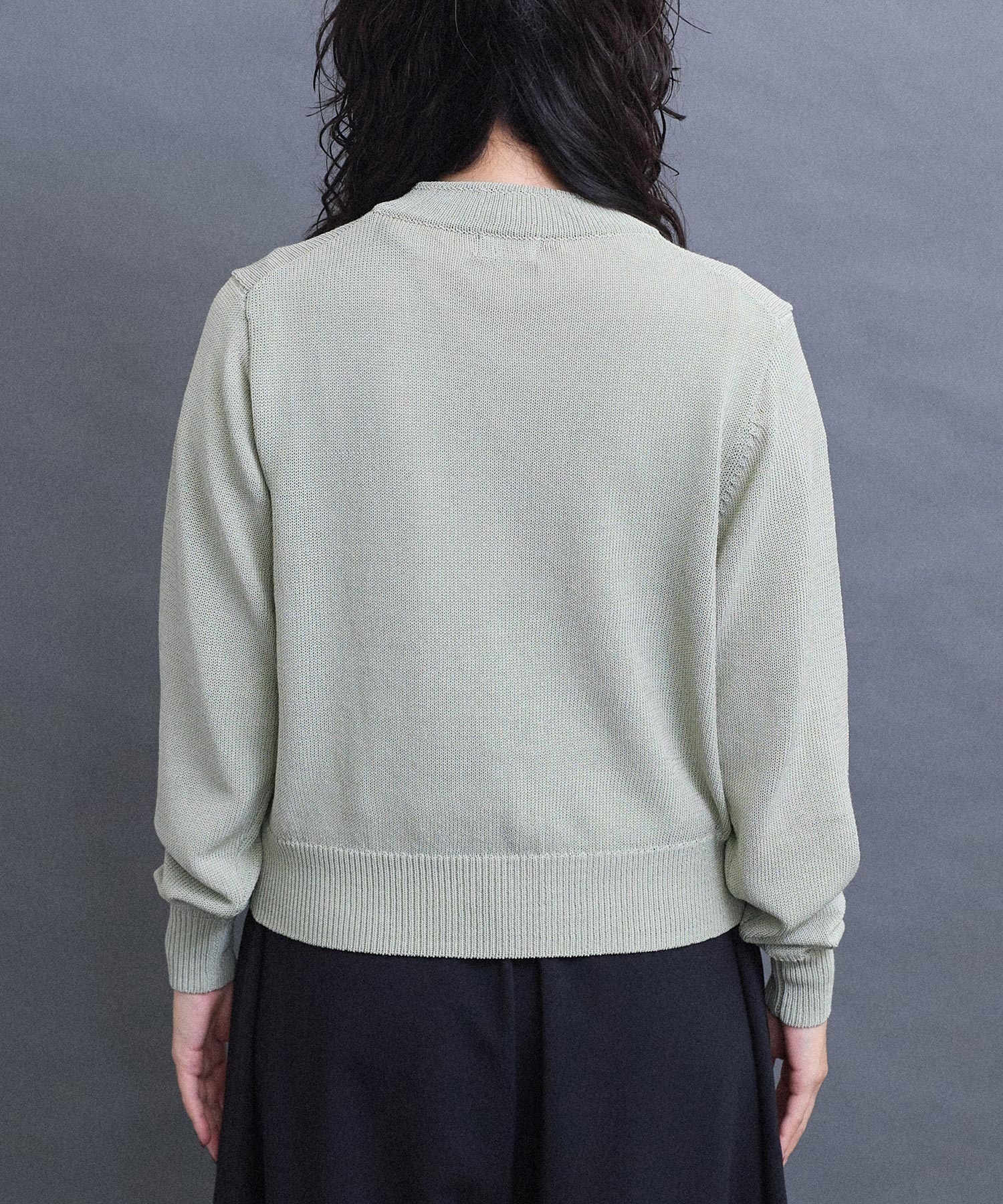 いつもより少し太めの糸で編んでいるため、ほどよい重さがあり着た時に体にしっくりとくる印象に仕上がりました。