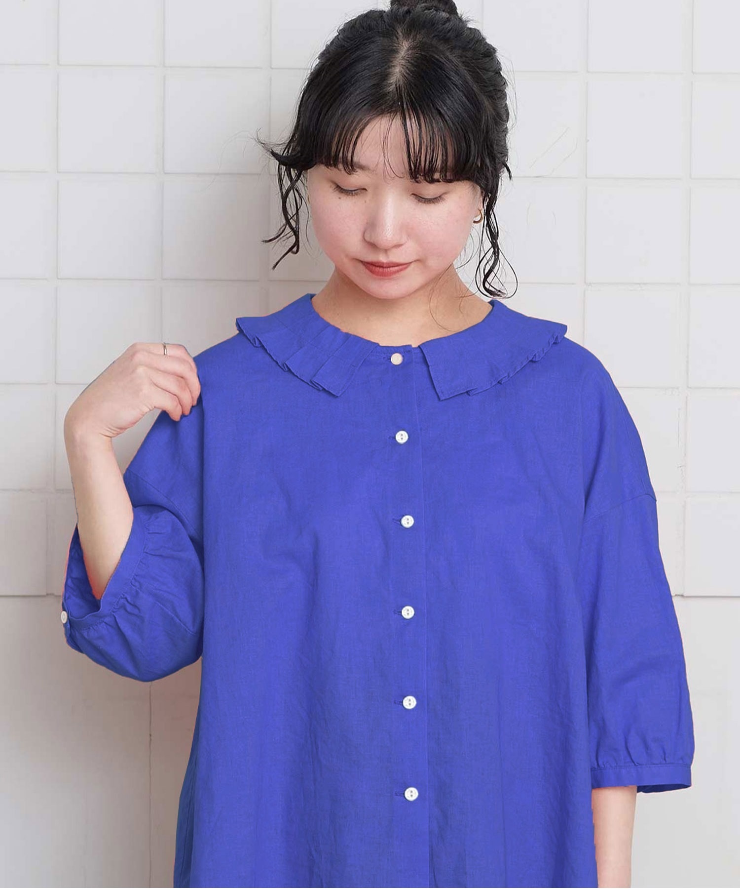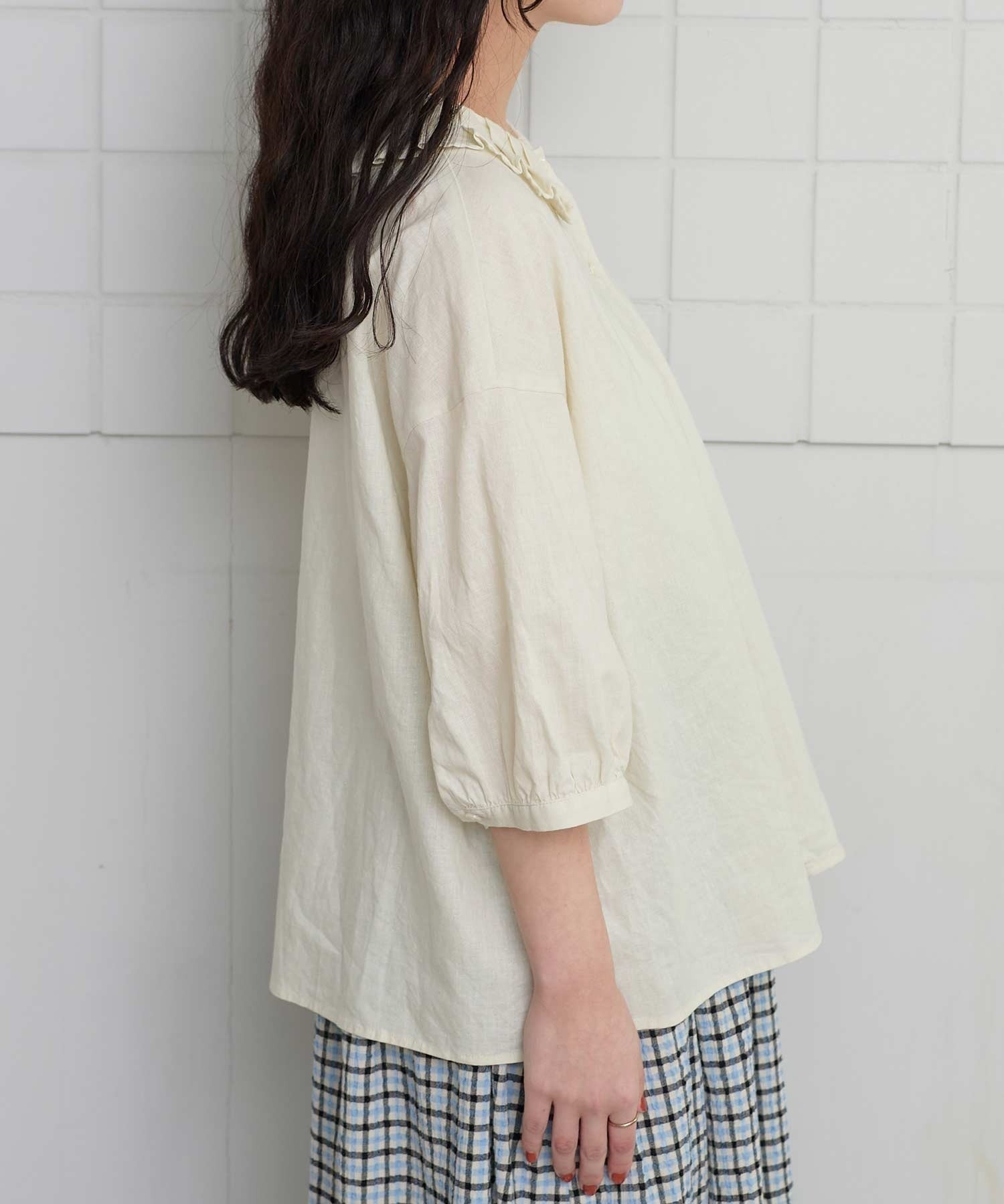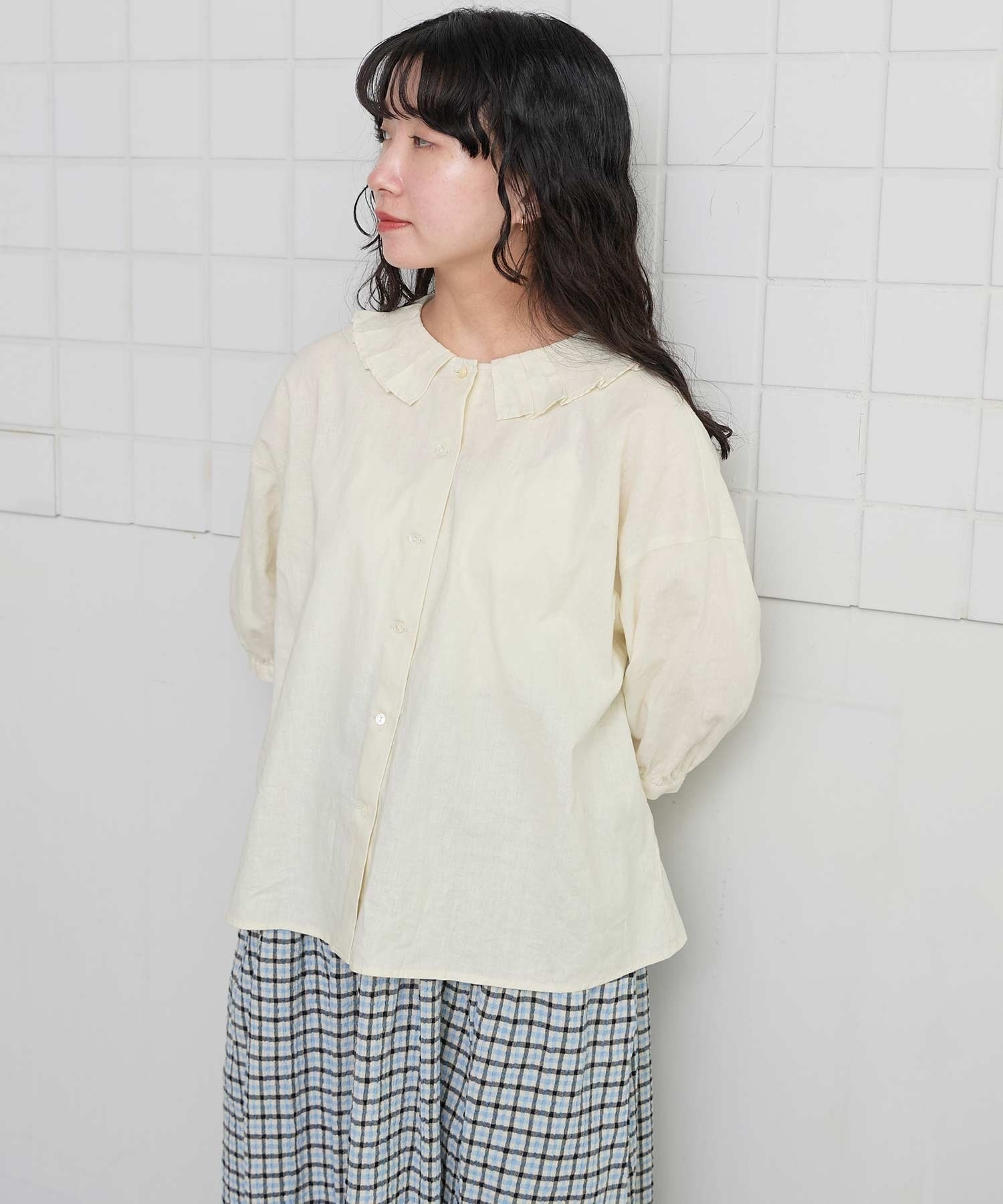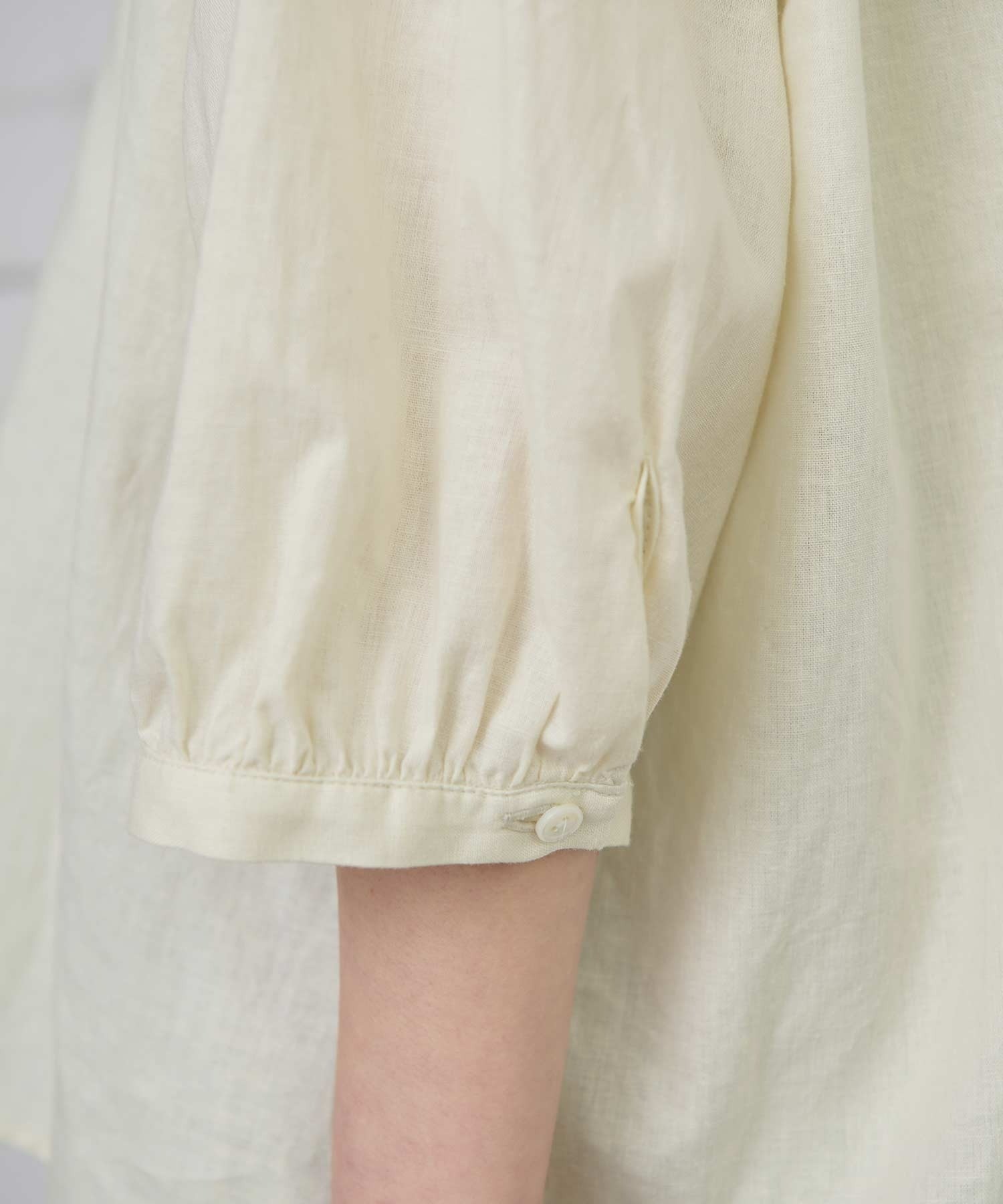 綿麻のほどよいしゃり感とやわらかな風合いがあるのでブラウスは羽織りにも◎