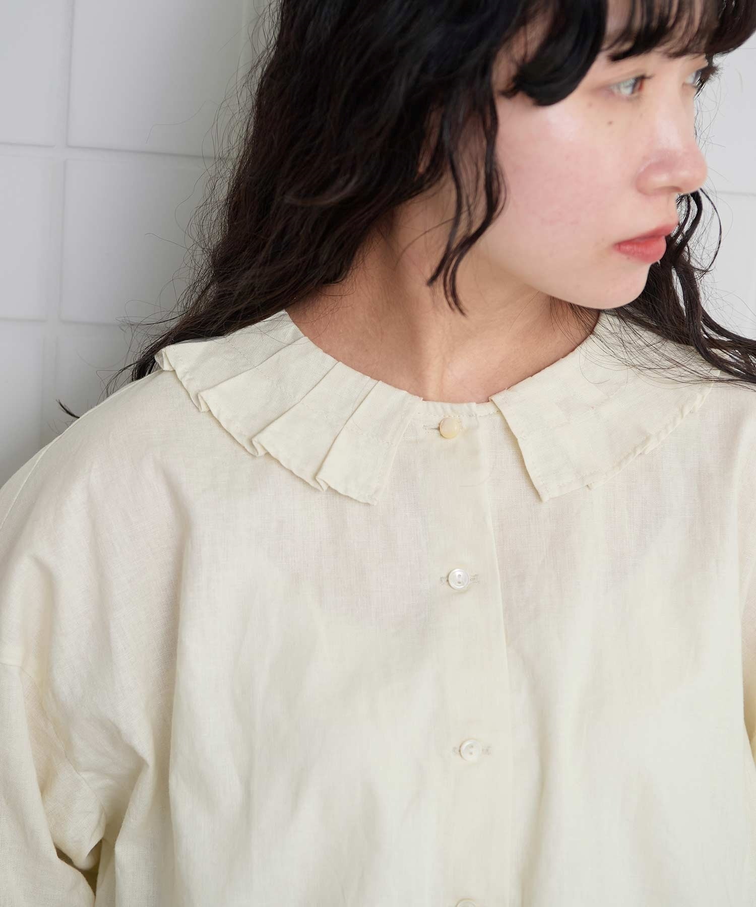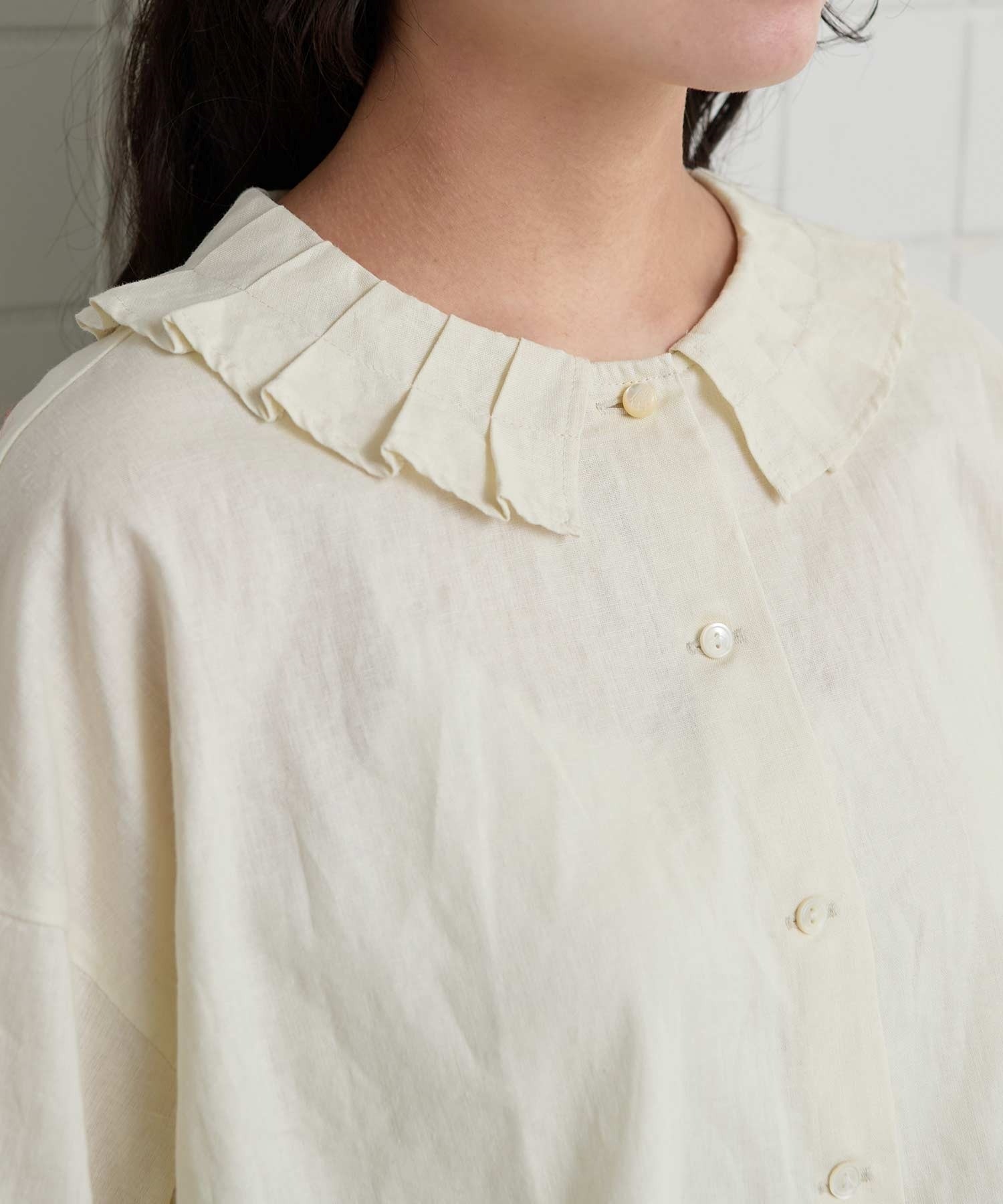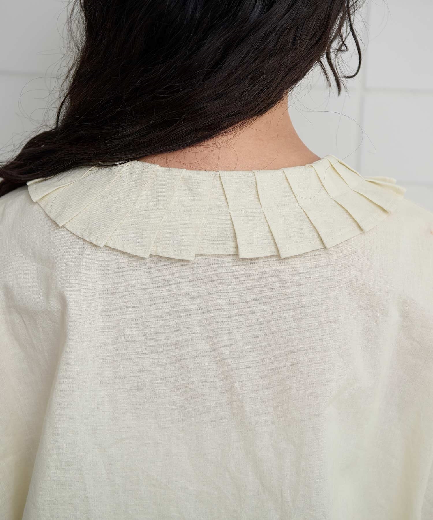 プリーツ状に畳まれたクラフト感のあるシャツ襟。