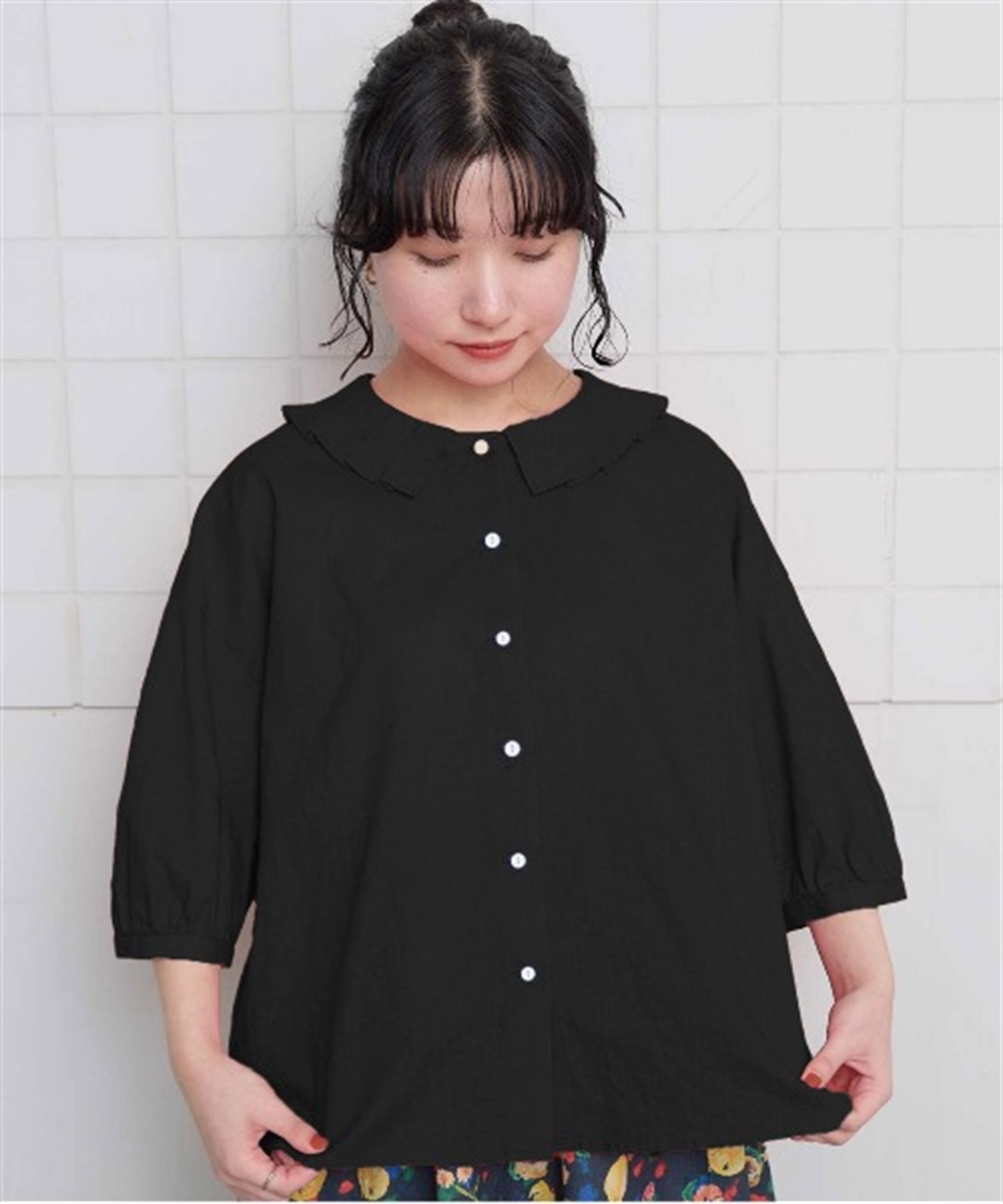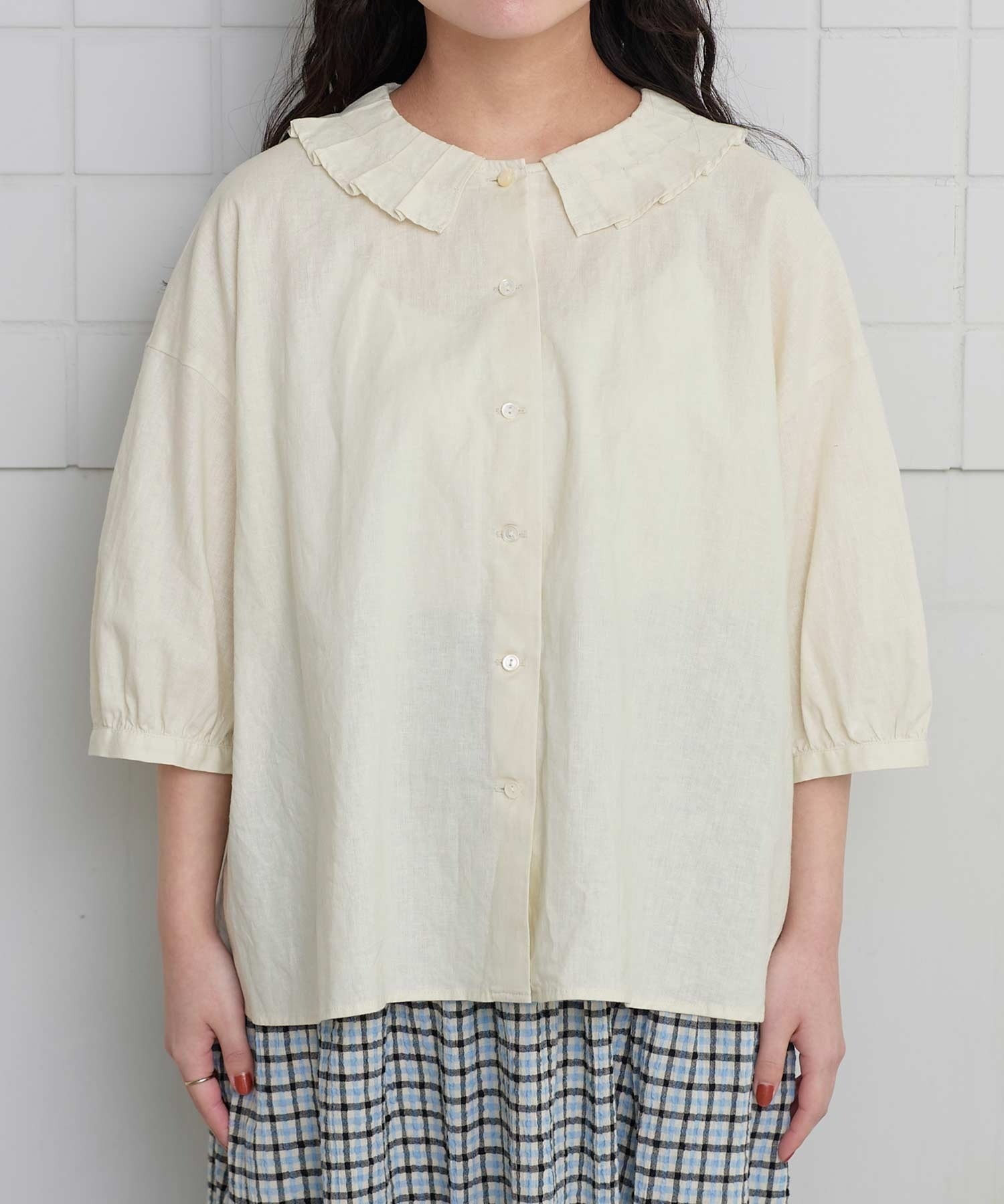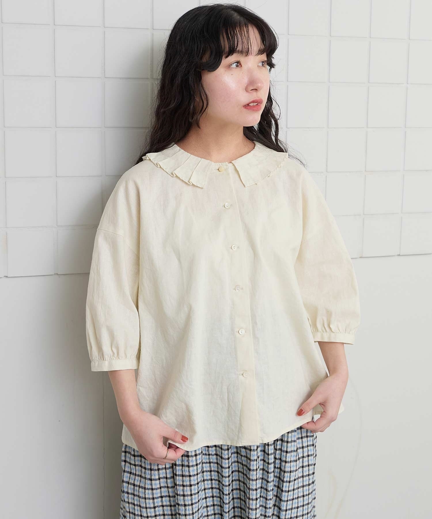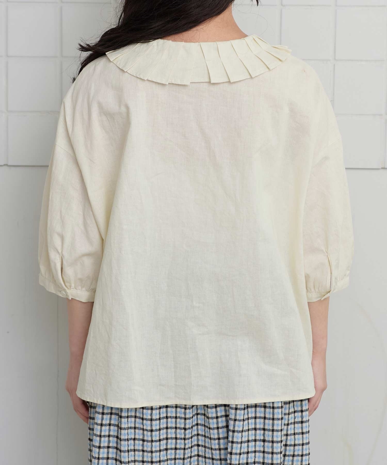 プリーツ状に畳まれたクラフト感のあるシャツ襟。