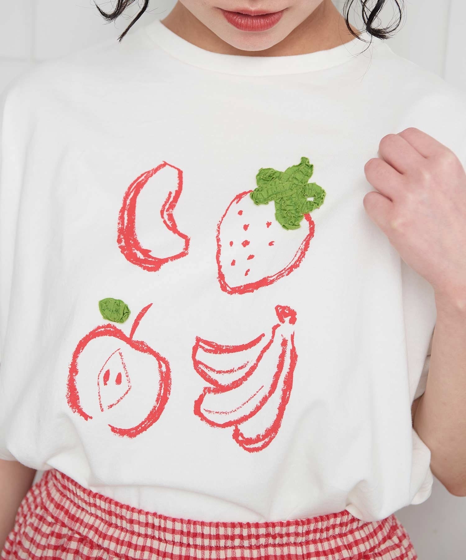 クレヨンで描いたりんご、いちご、バナナをプリントし、