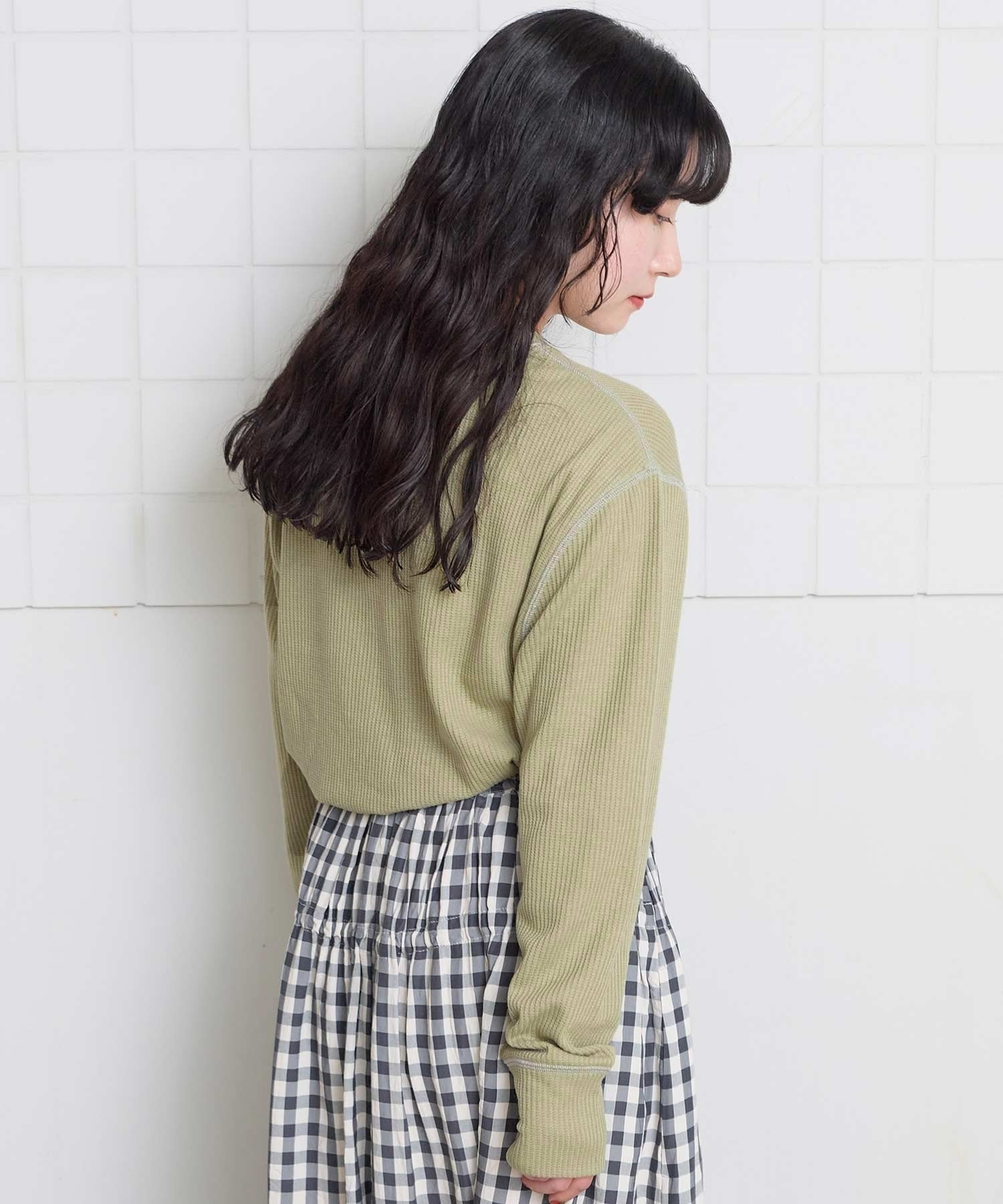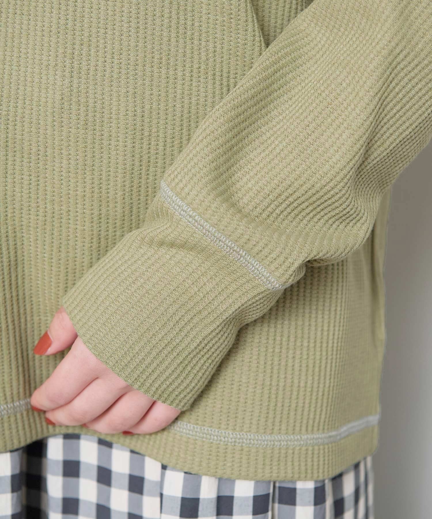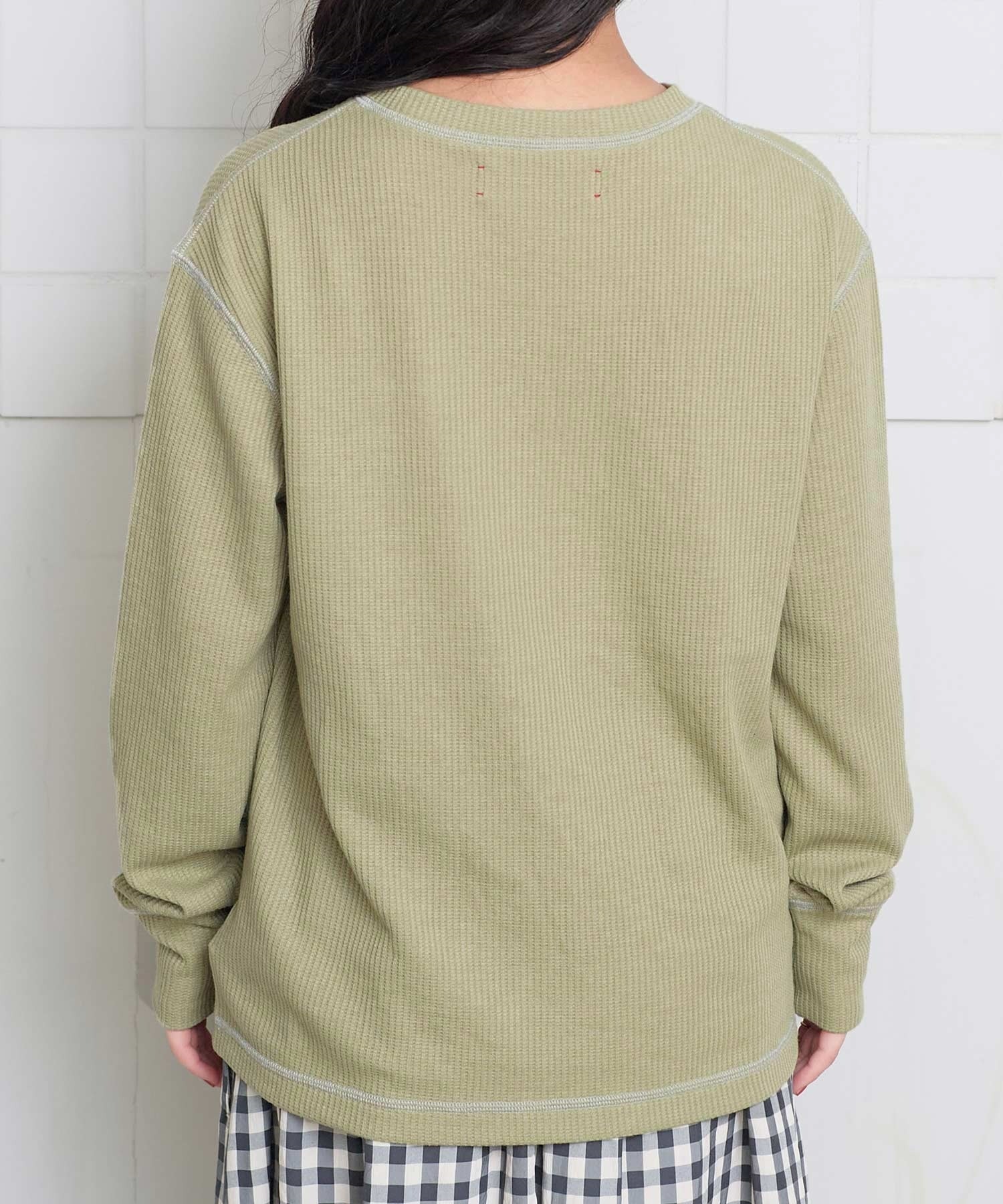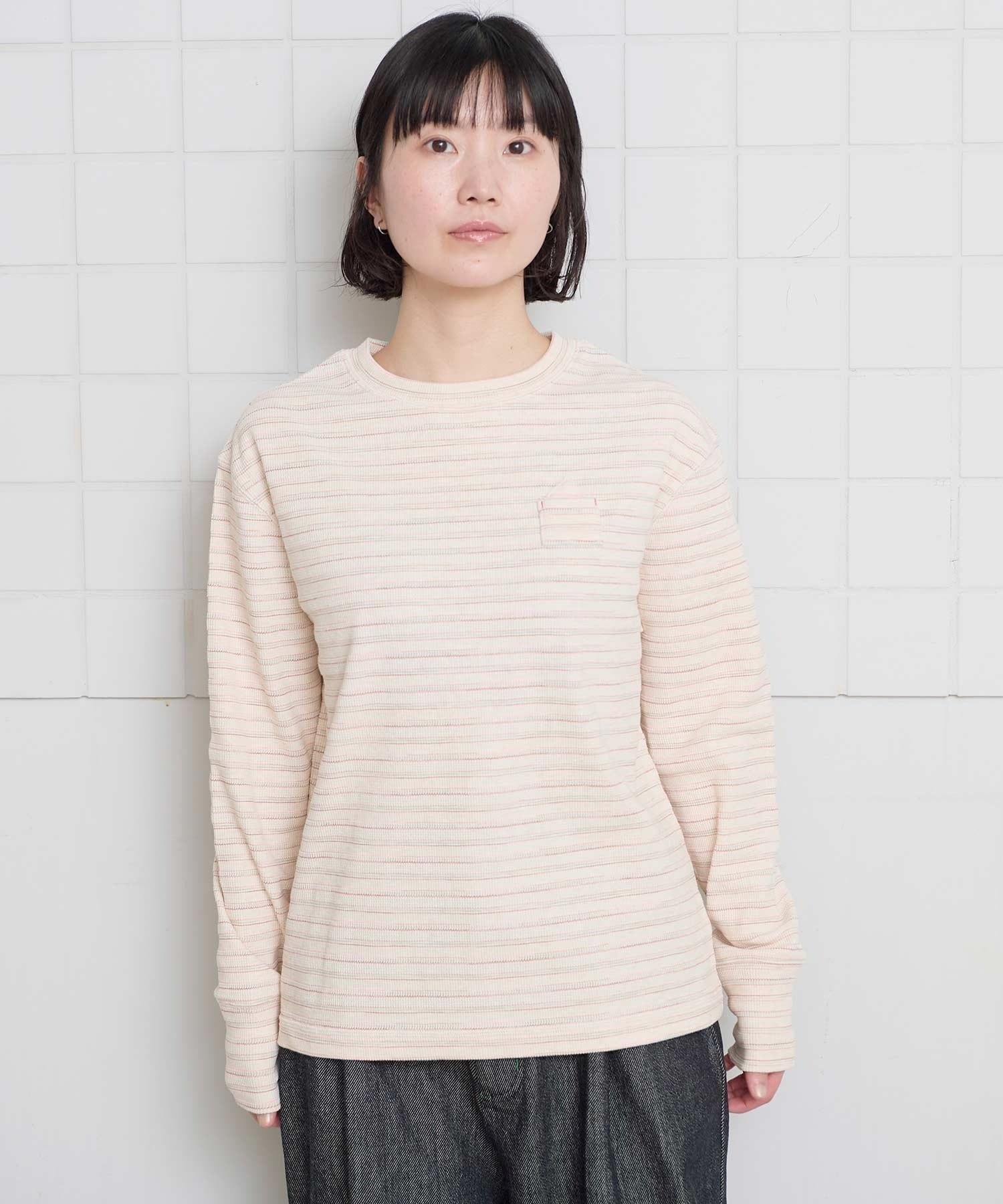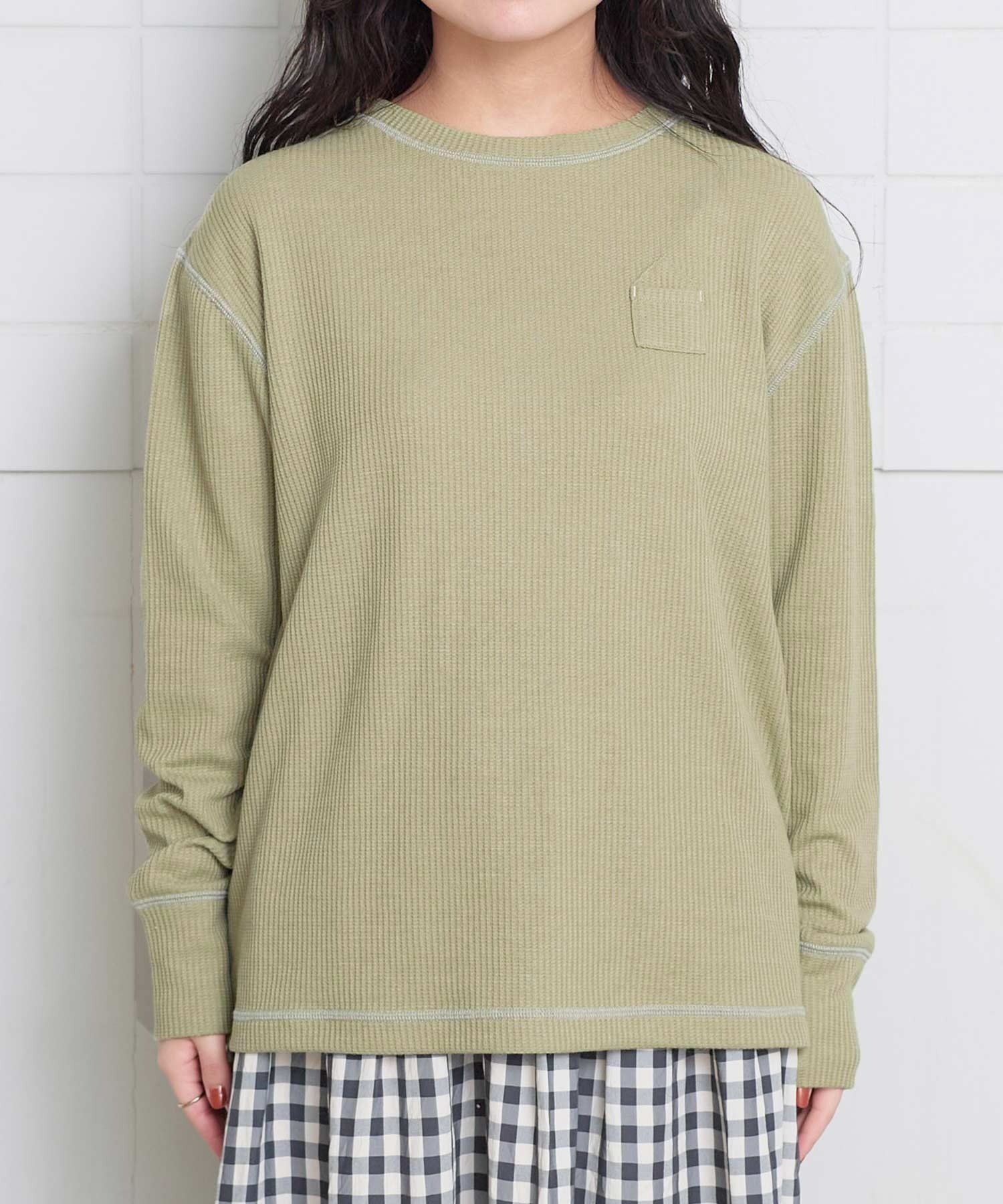 おうちの形をした、ちいさなポケットがついたワッフル生地のカットソー。