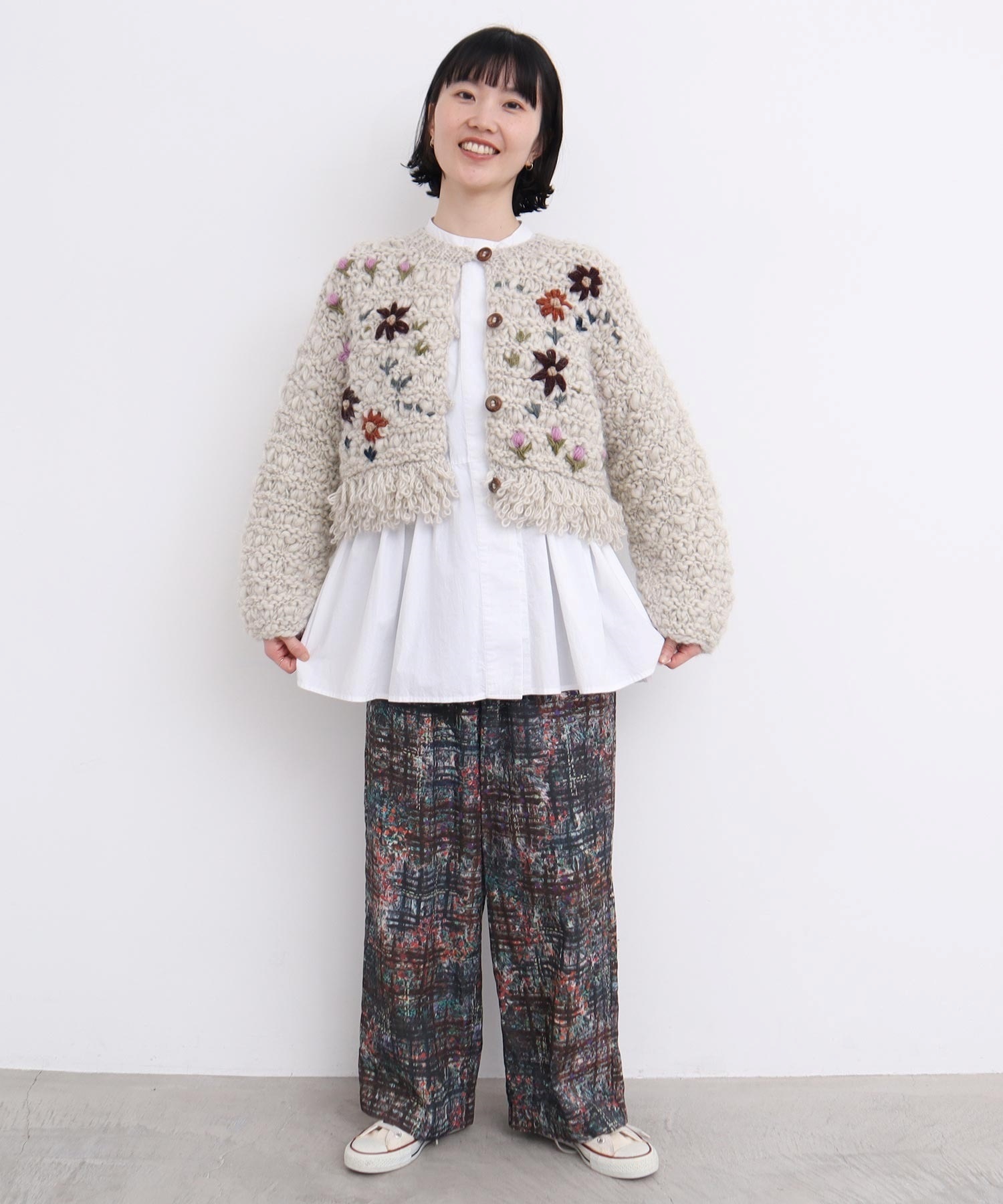 アウターの中にも着られるような、着こなしを絞りすぎないサイズ感のカーディガン。