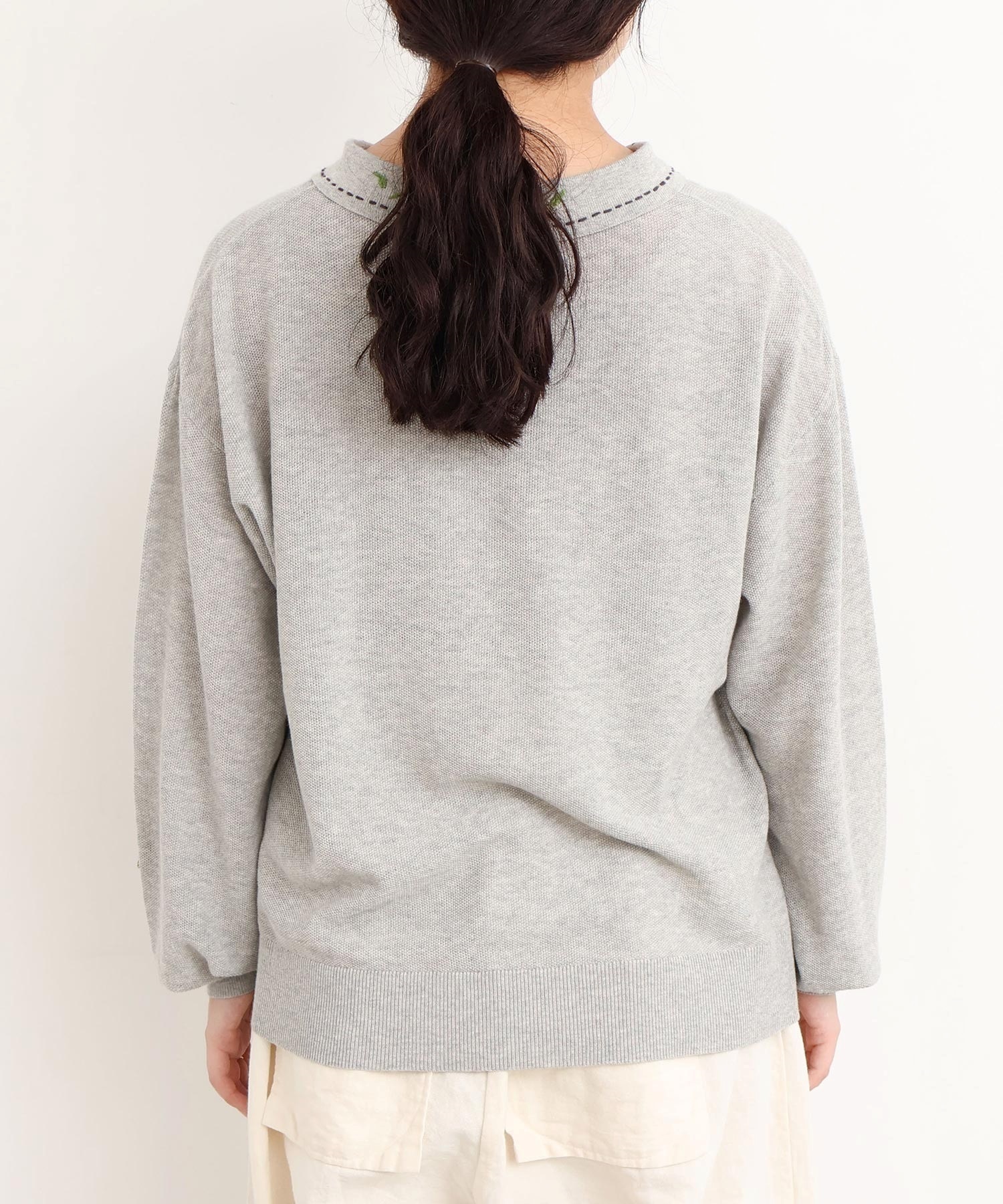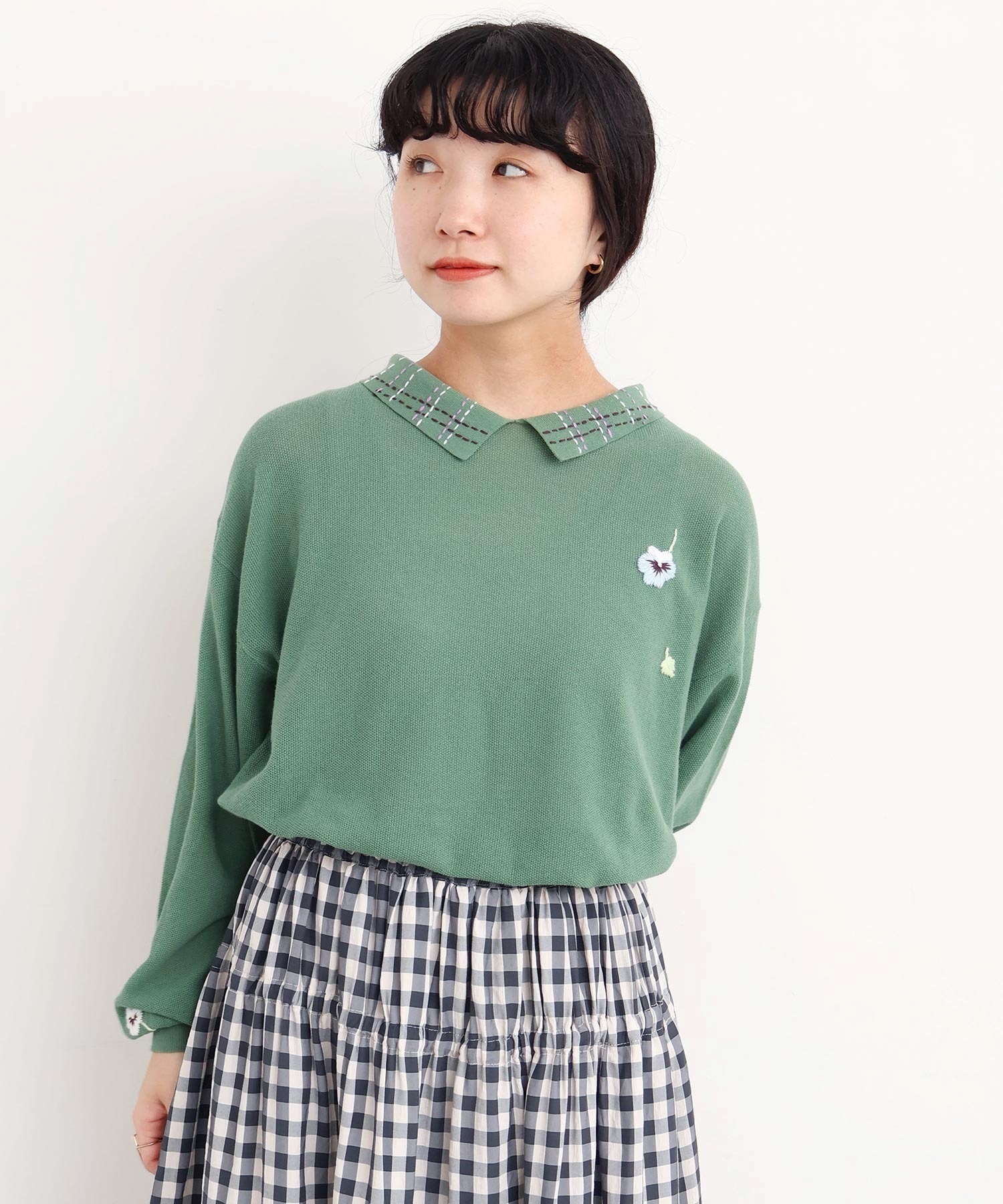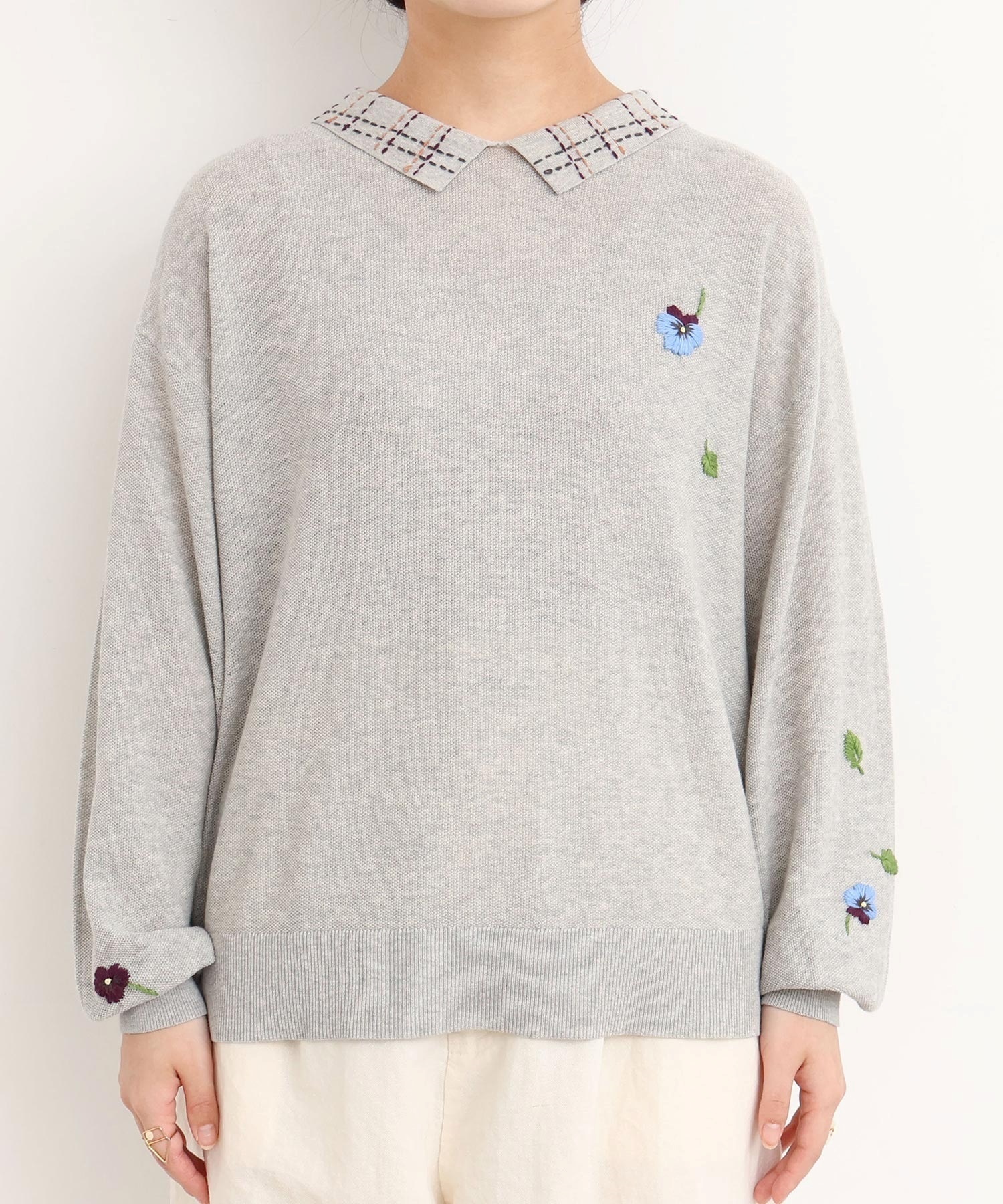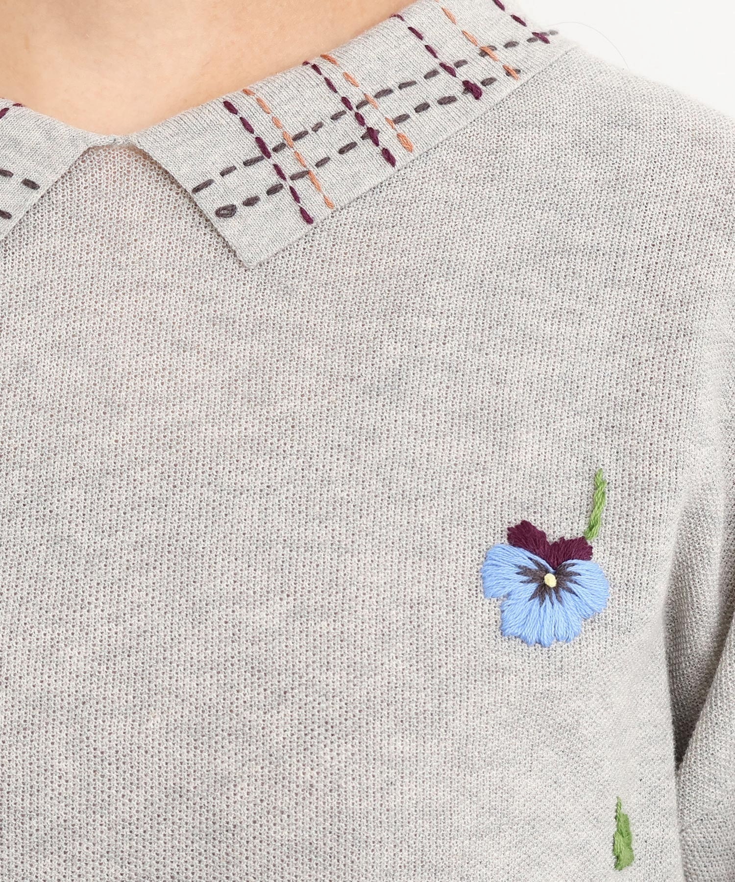 カジュアルにも着こなせる襟付きニットは、胸元のワンポイントと襟のチェック刺繍でコーディネートしやすいアイテムです。
