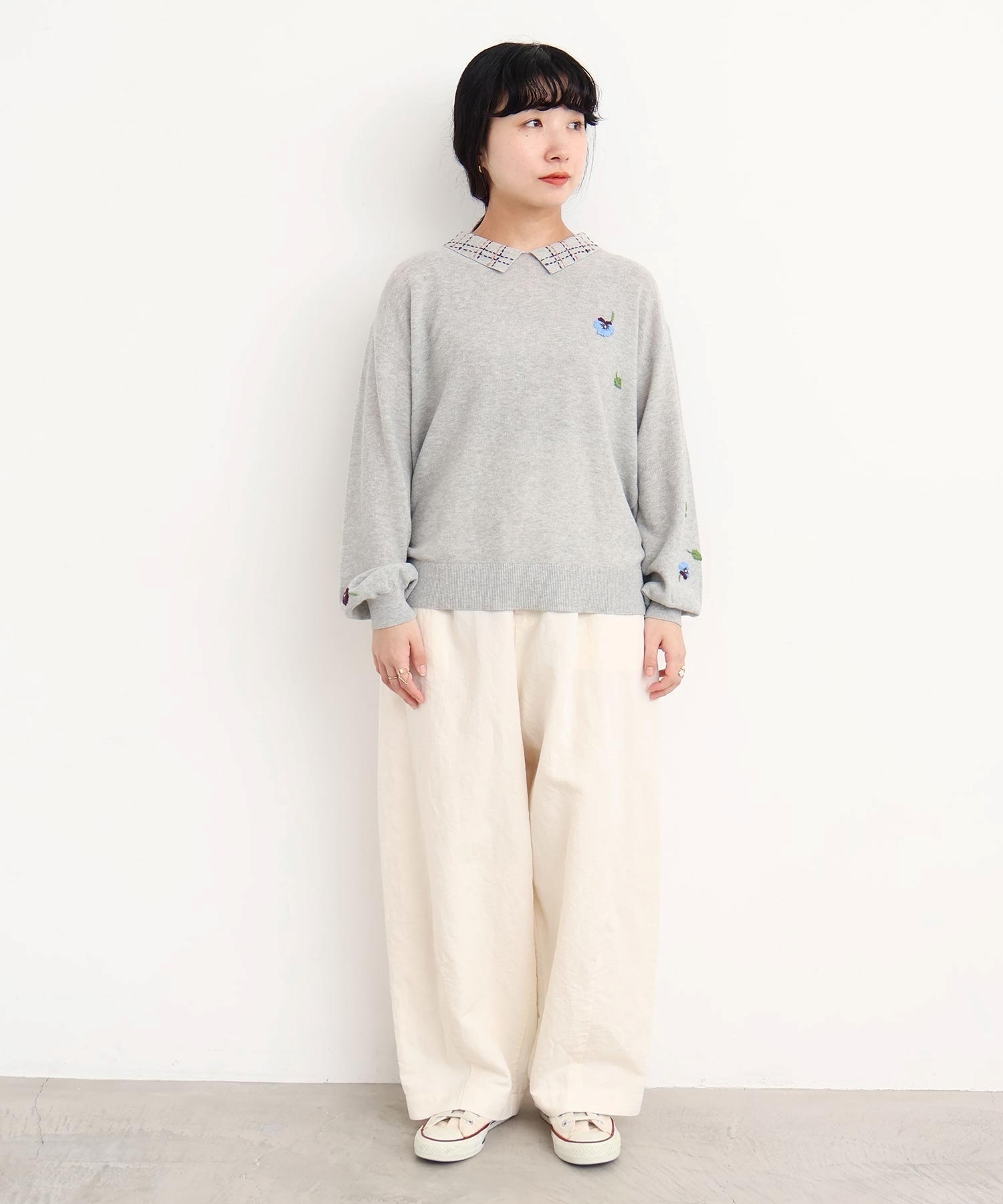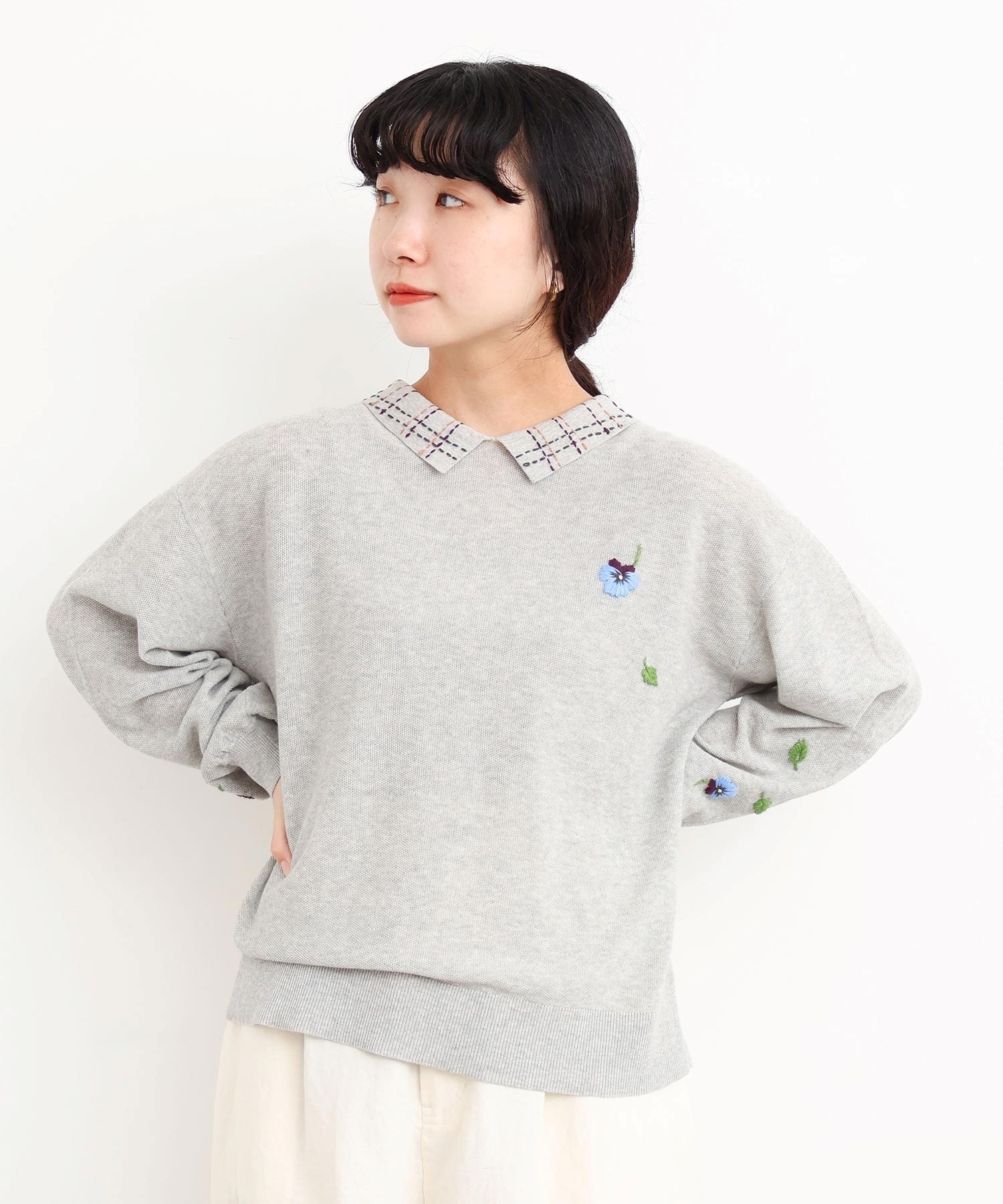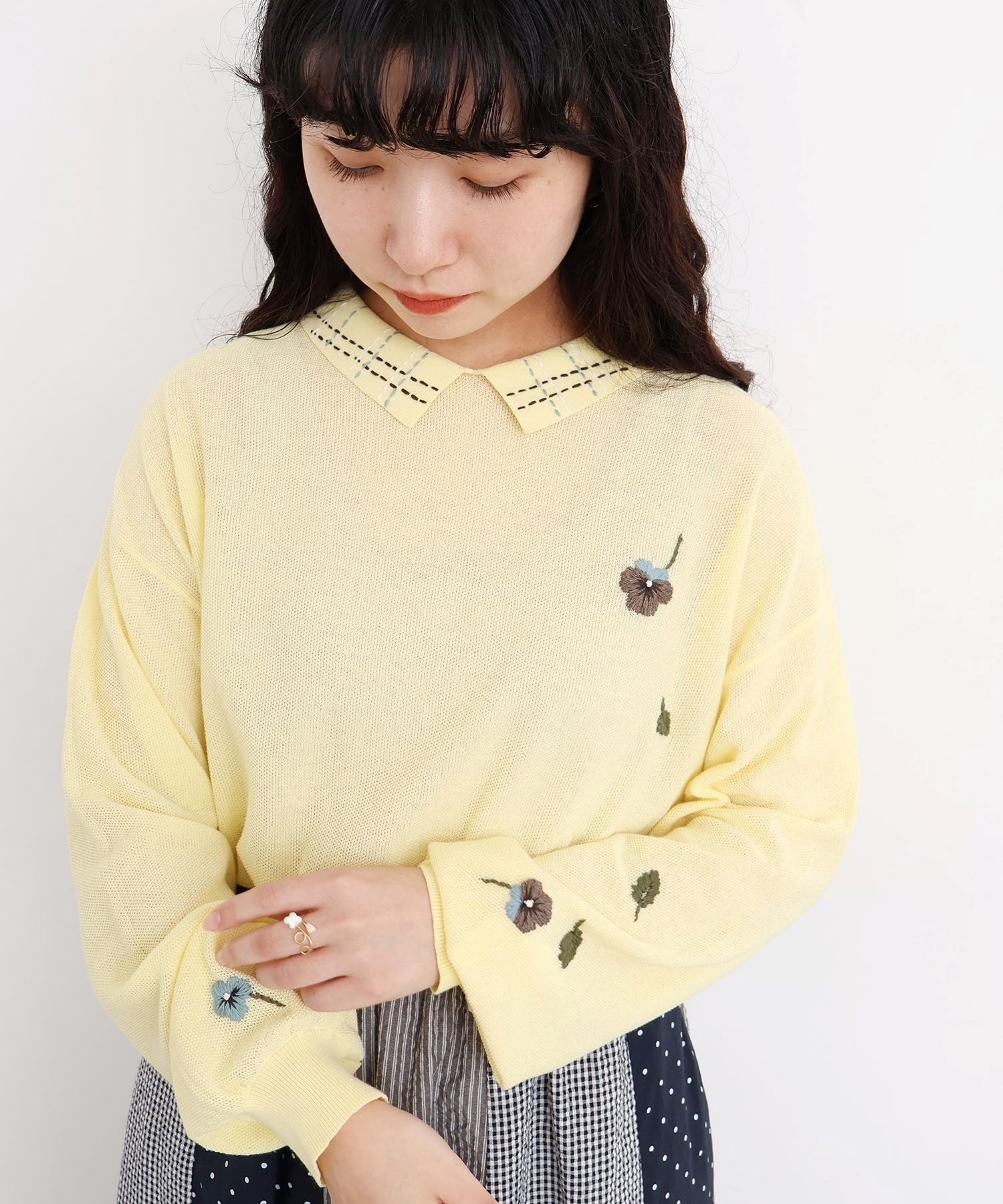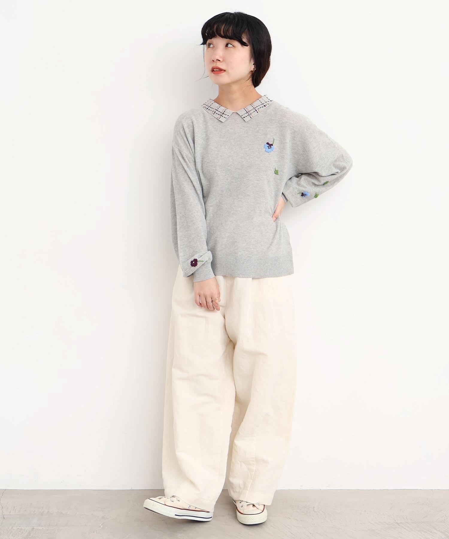 カジュアルにも着こなせる襟付きニットは、胸元のワンポイントと襟のチェック刺繍でコーディネートしやすいアイテムです。