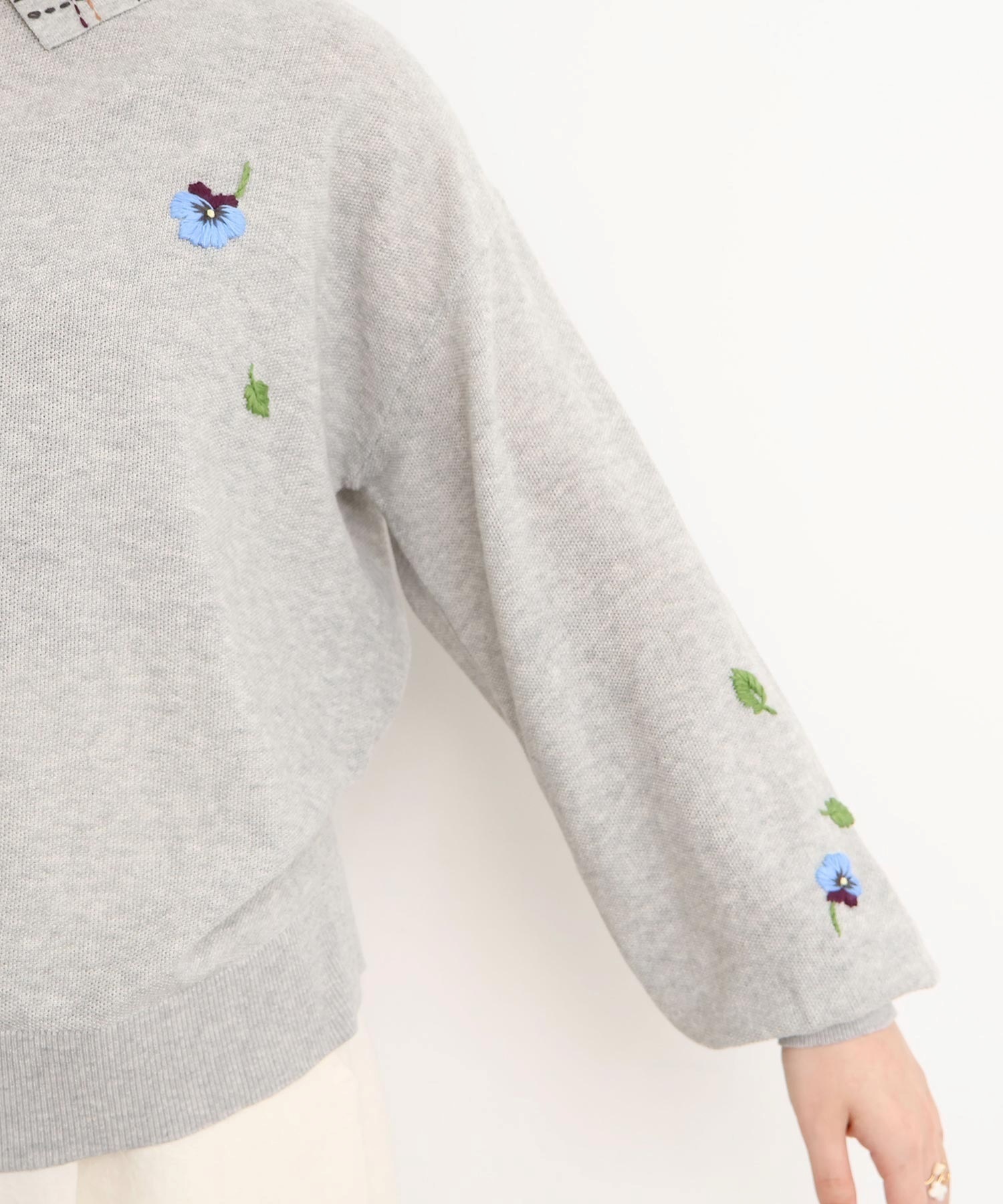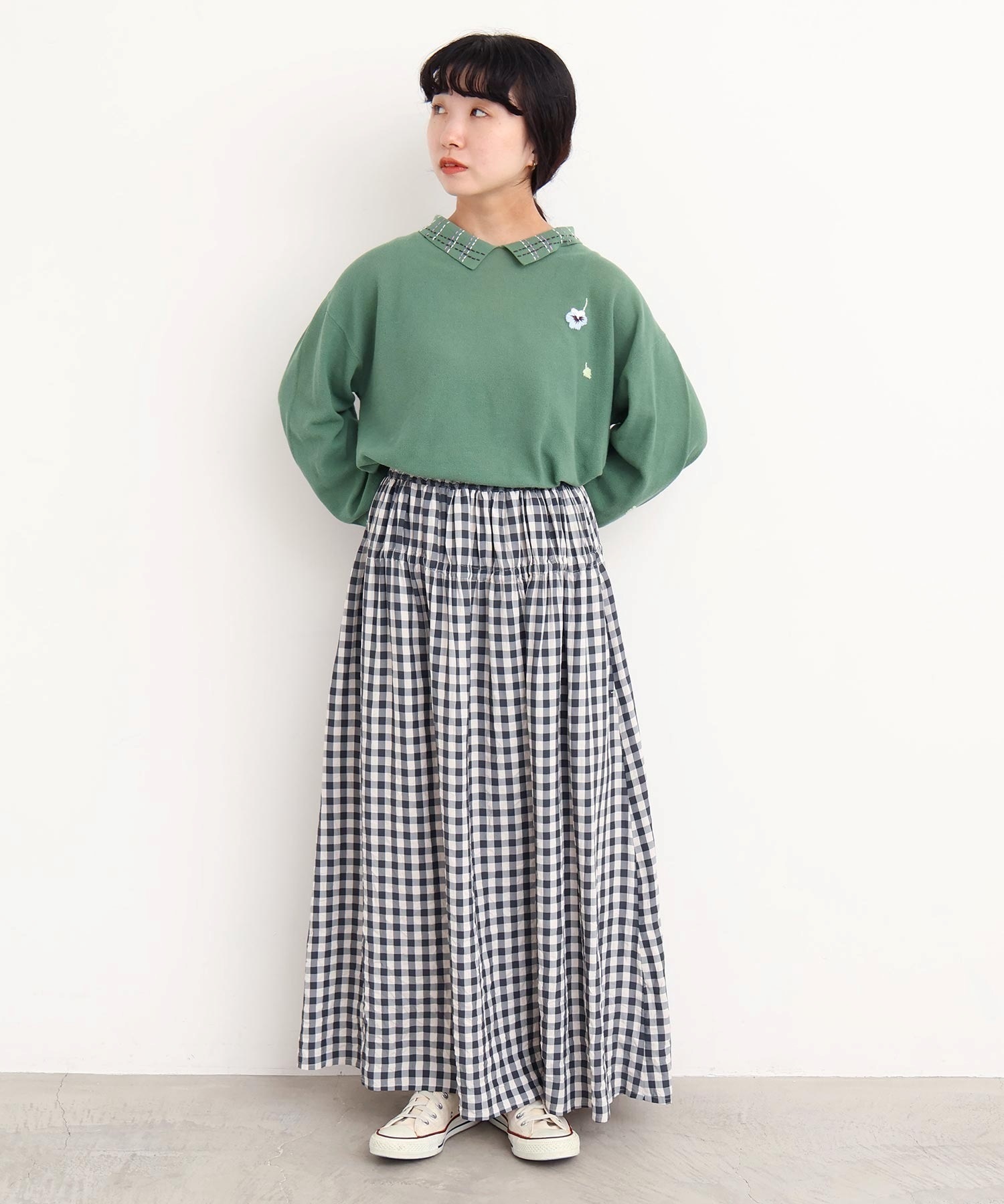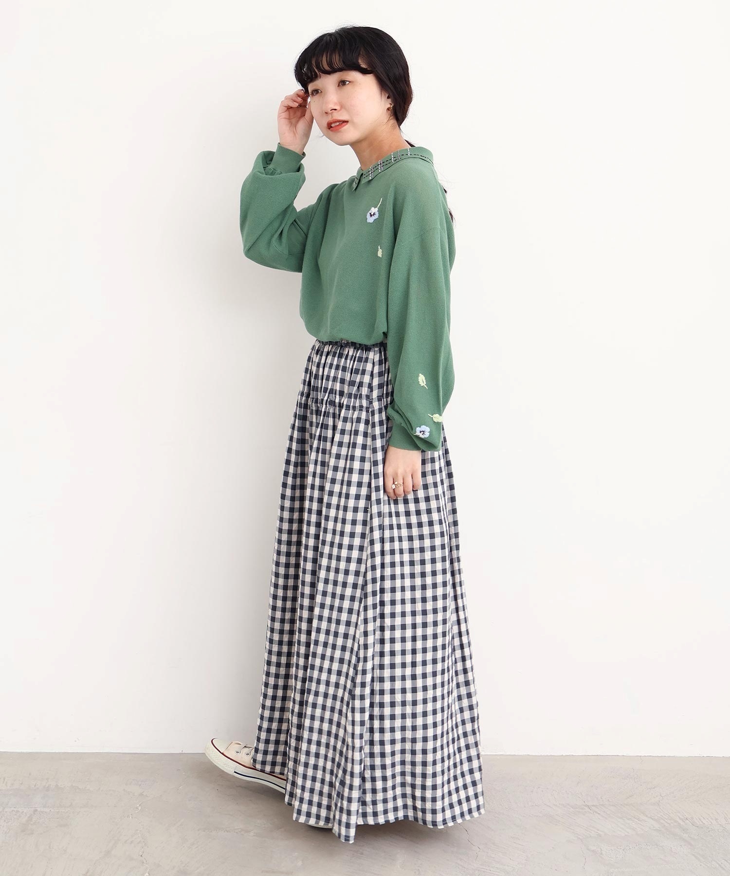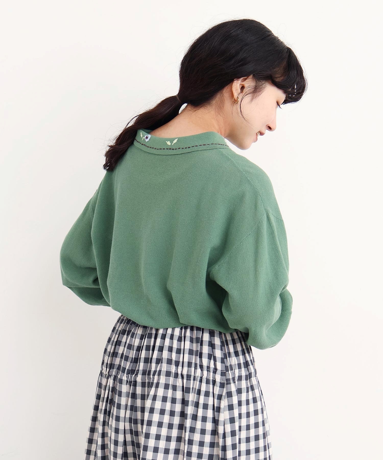 カジュアルにも着こなせる襟付きニットは、胸元のワンポイントと襟のチェック刺繍でコーディネートしやすいアイテムです。