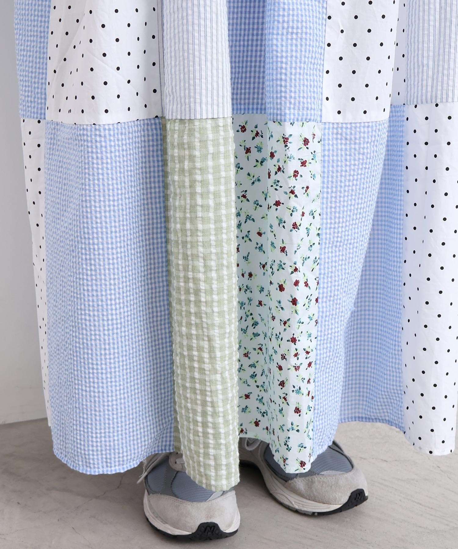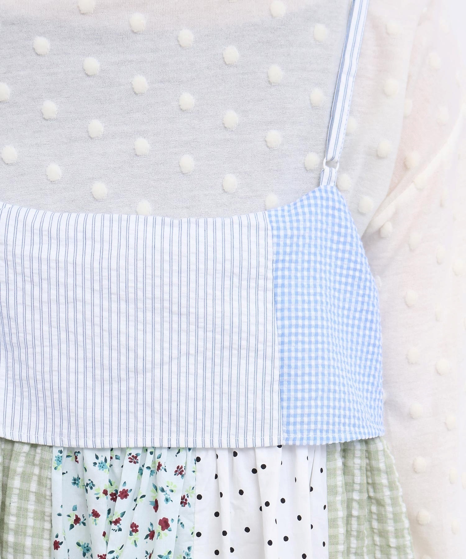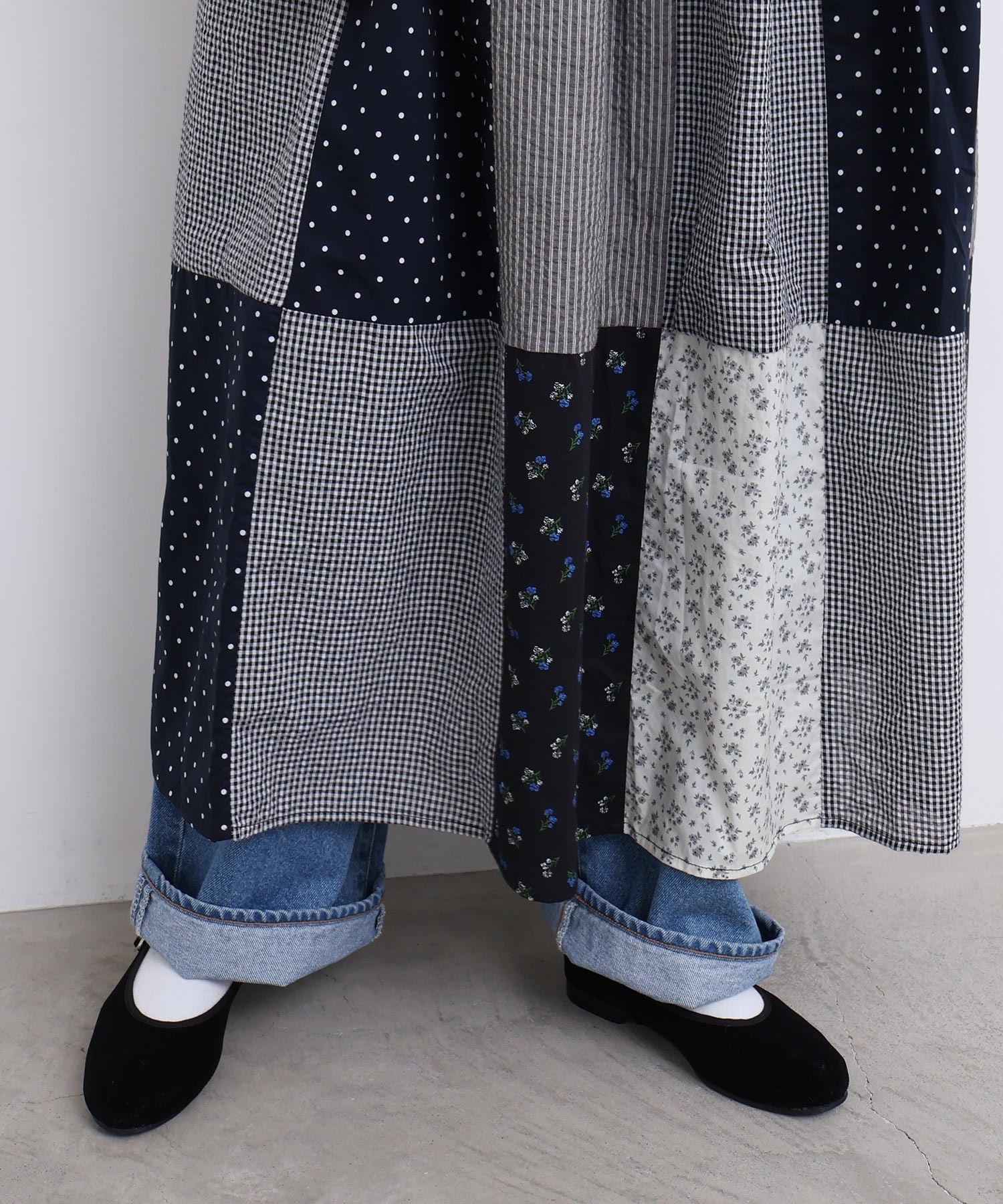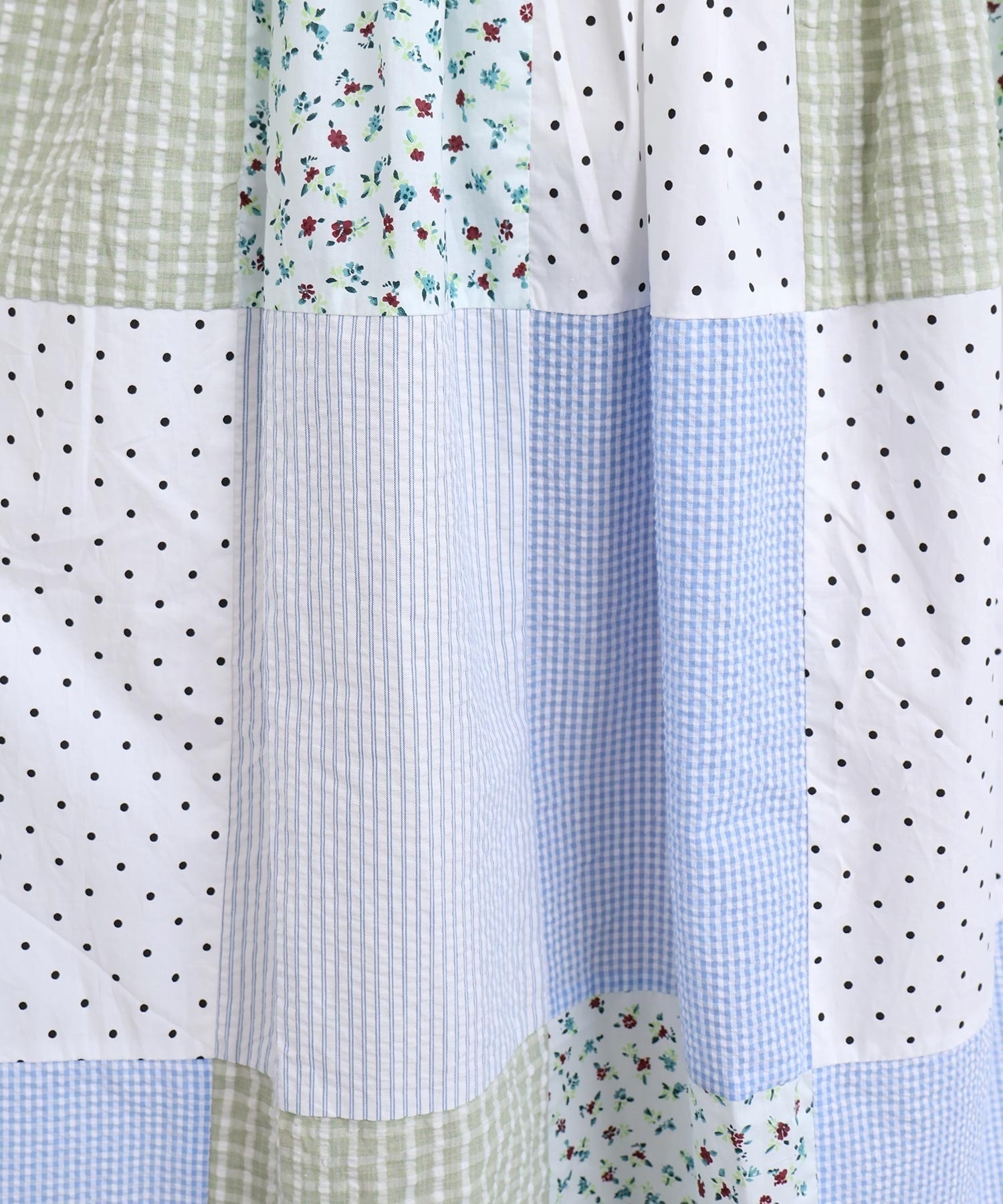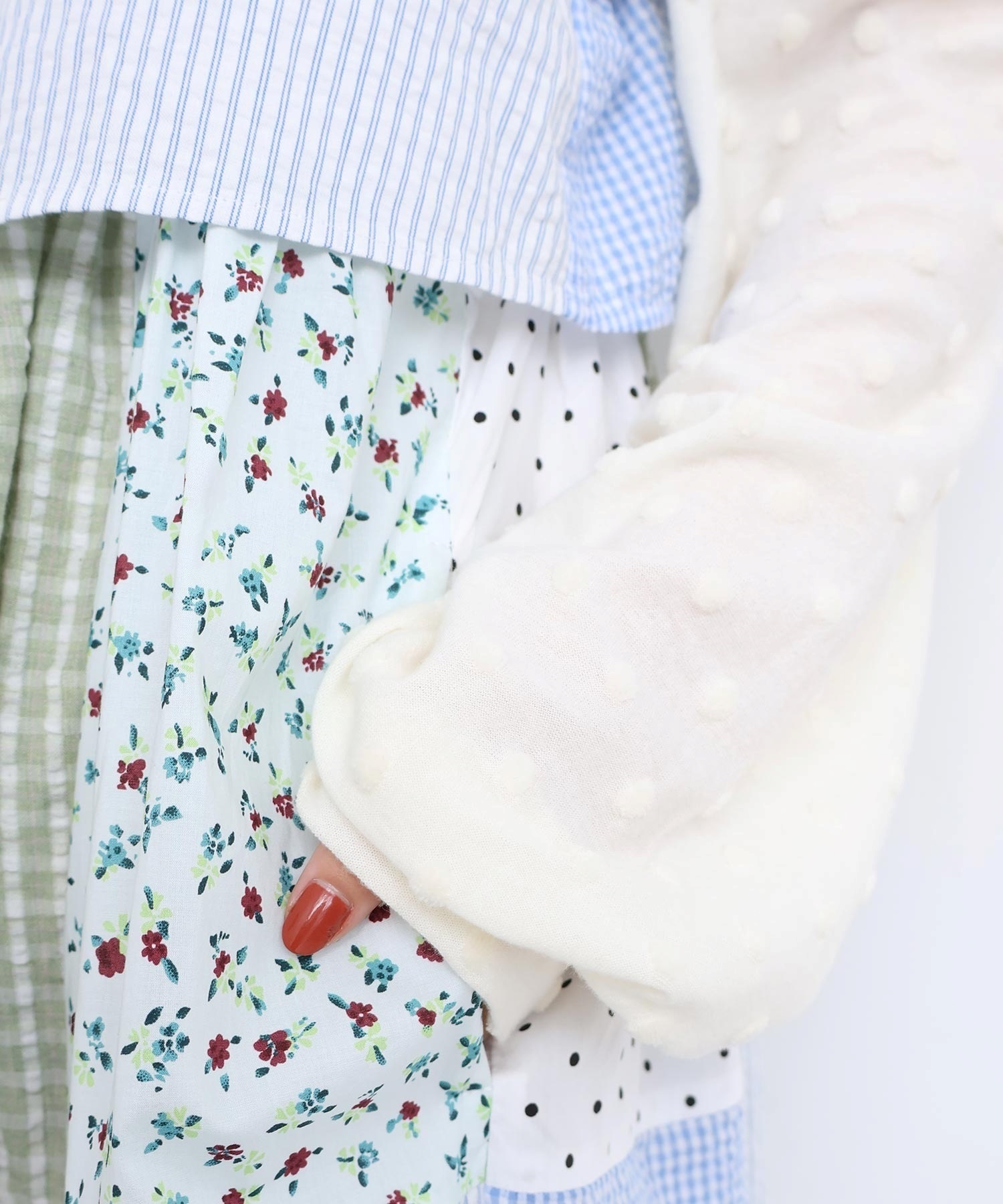 小花柄、ドット、ギンガムチェックを組み合わせたパッチワークは、