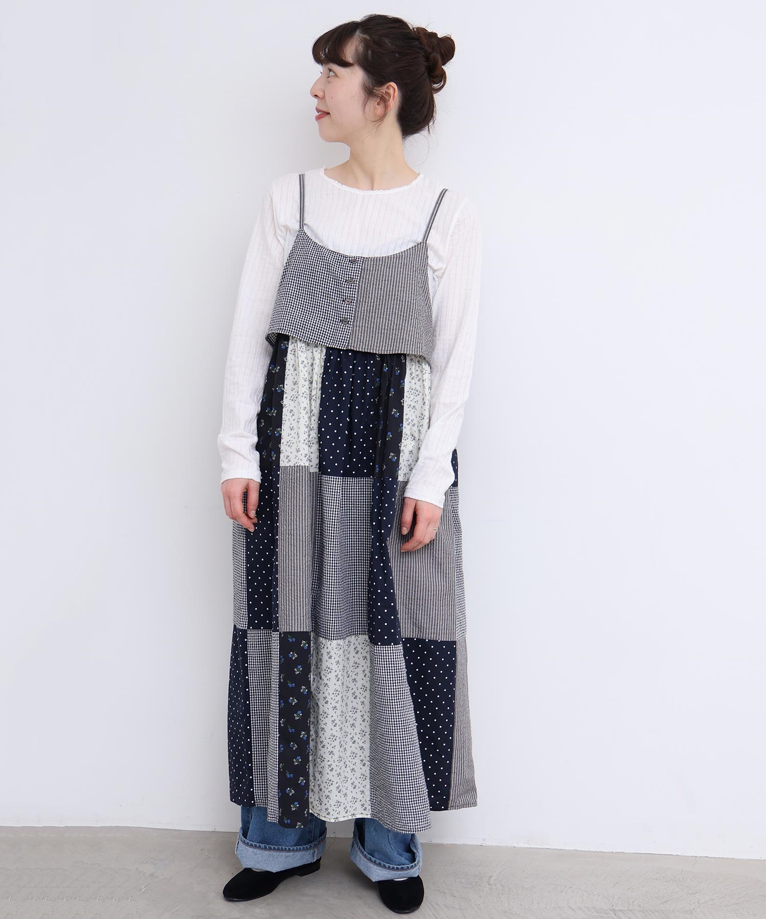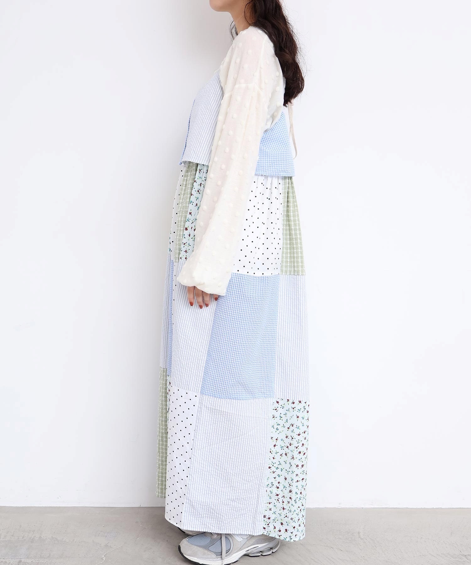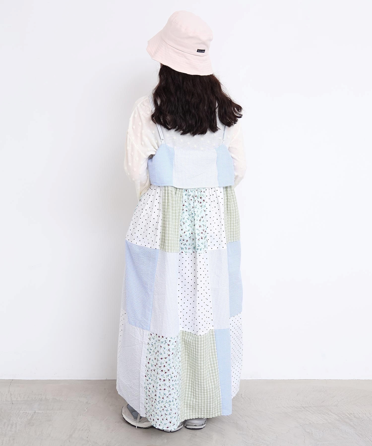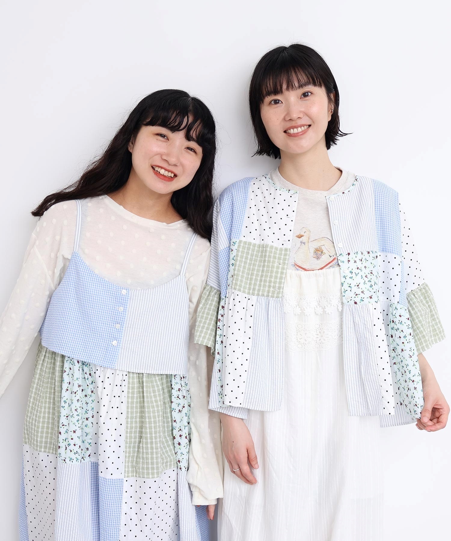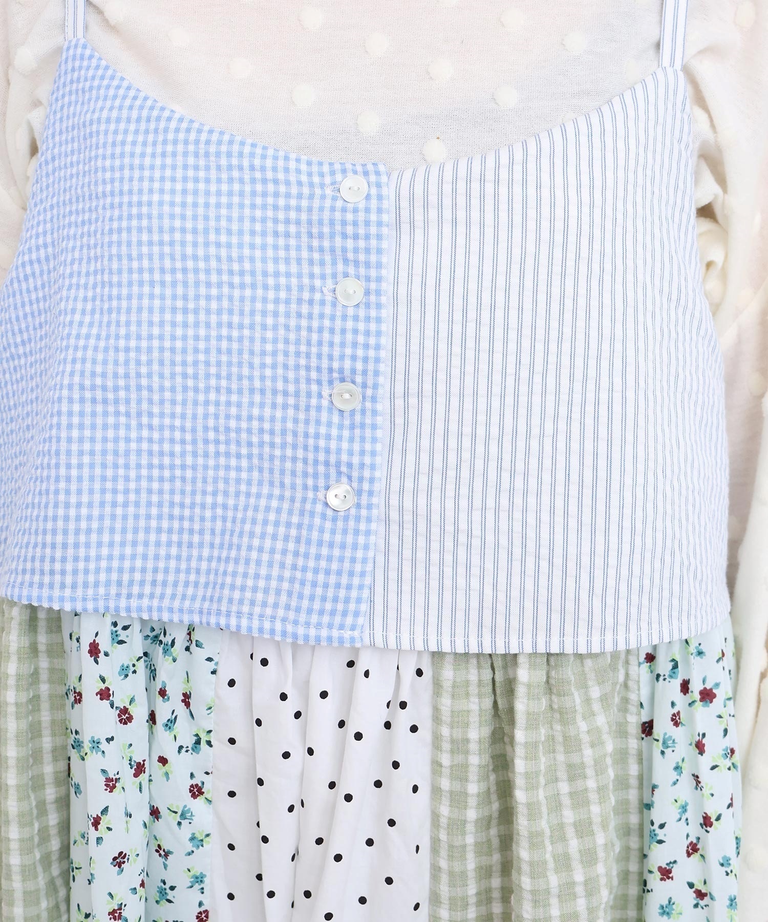 小花柄、ドット、ギンガムチェックを組み合わせたパッチワークは、