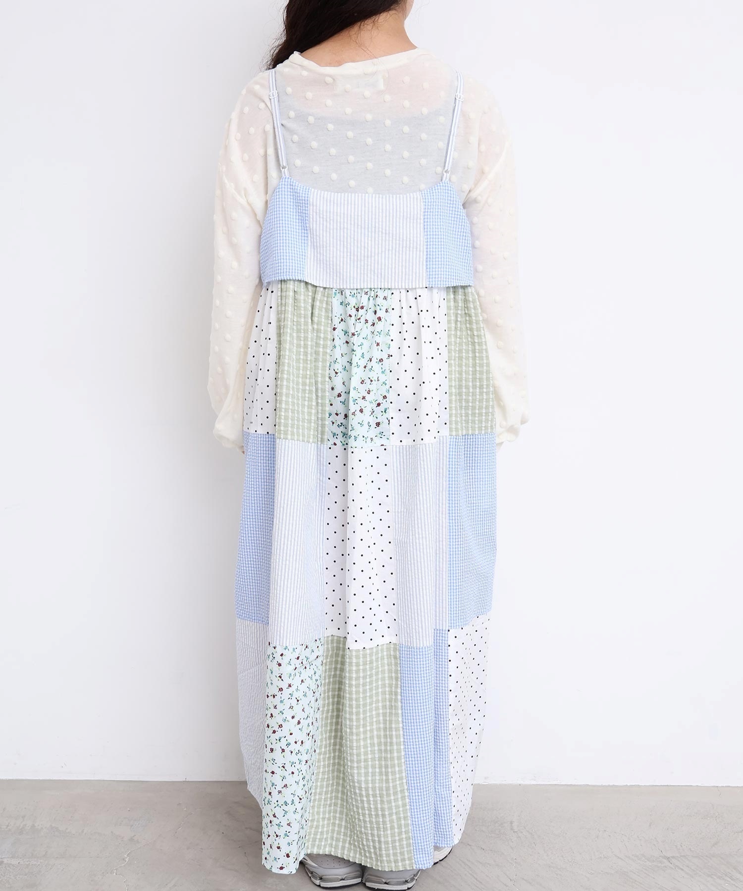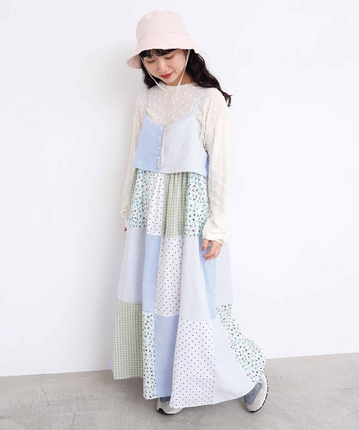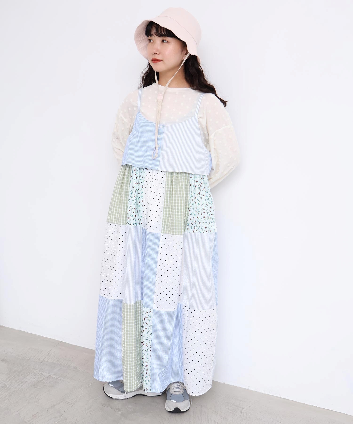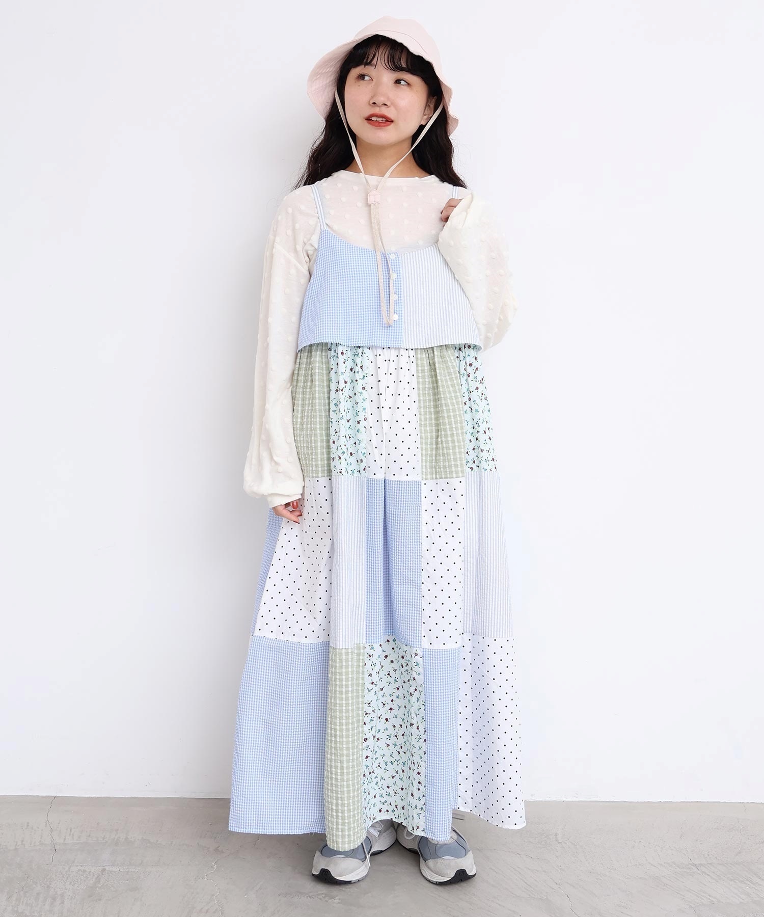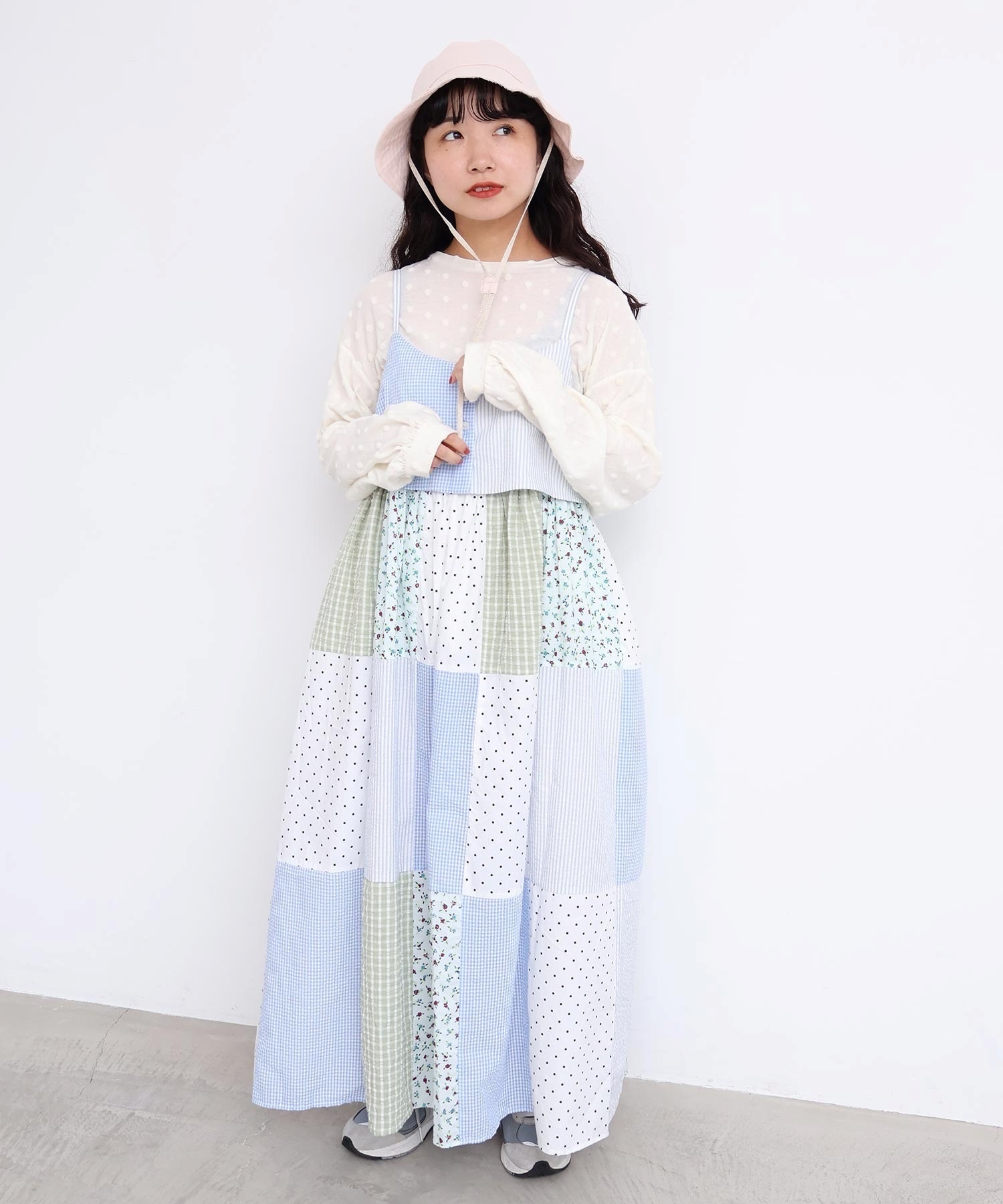 小花柄、ドット、ギンガムチェックを組み合わせたパッチワークは、