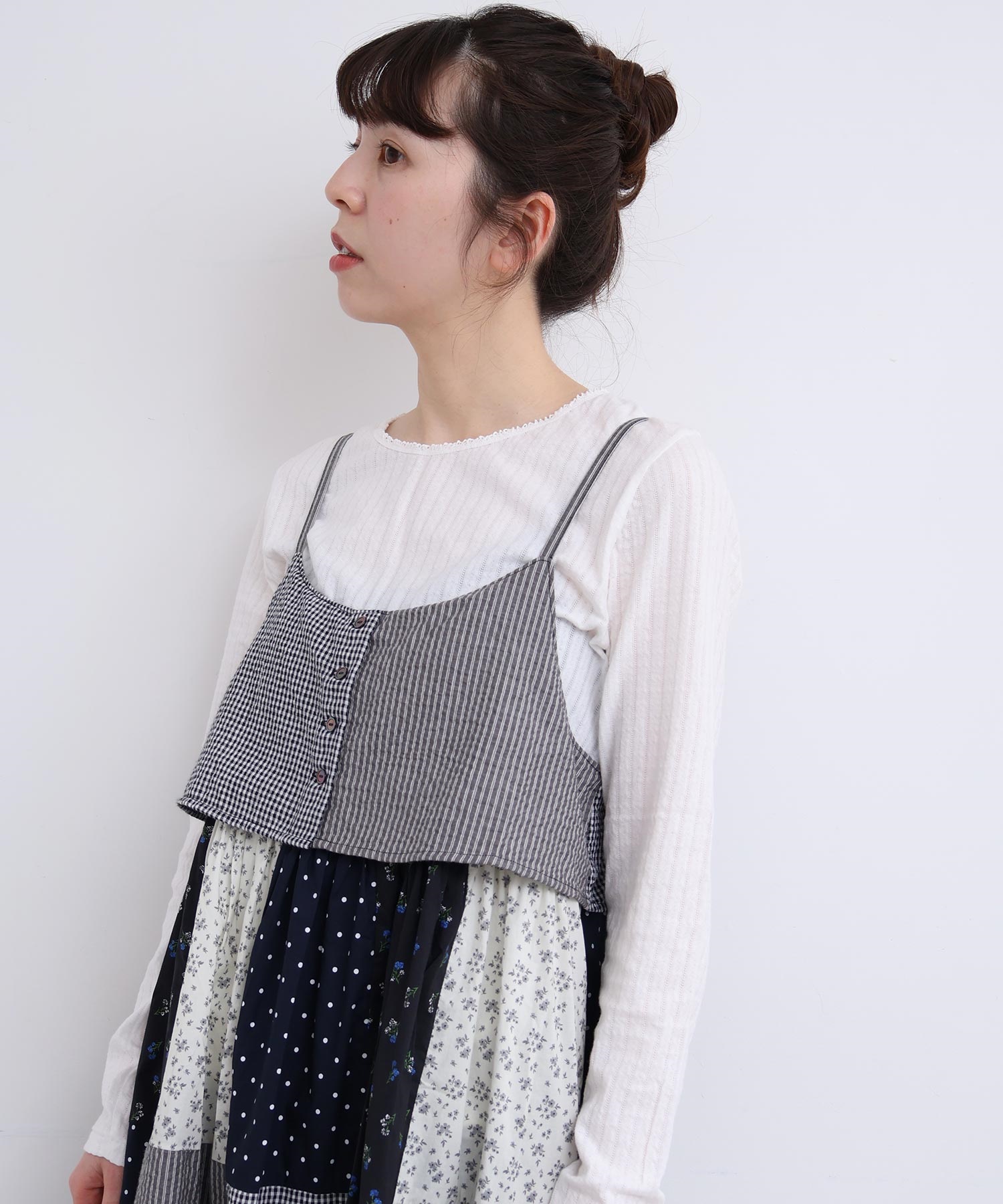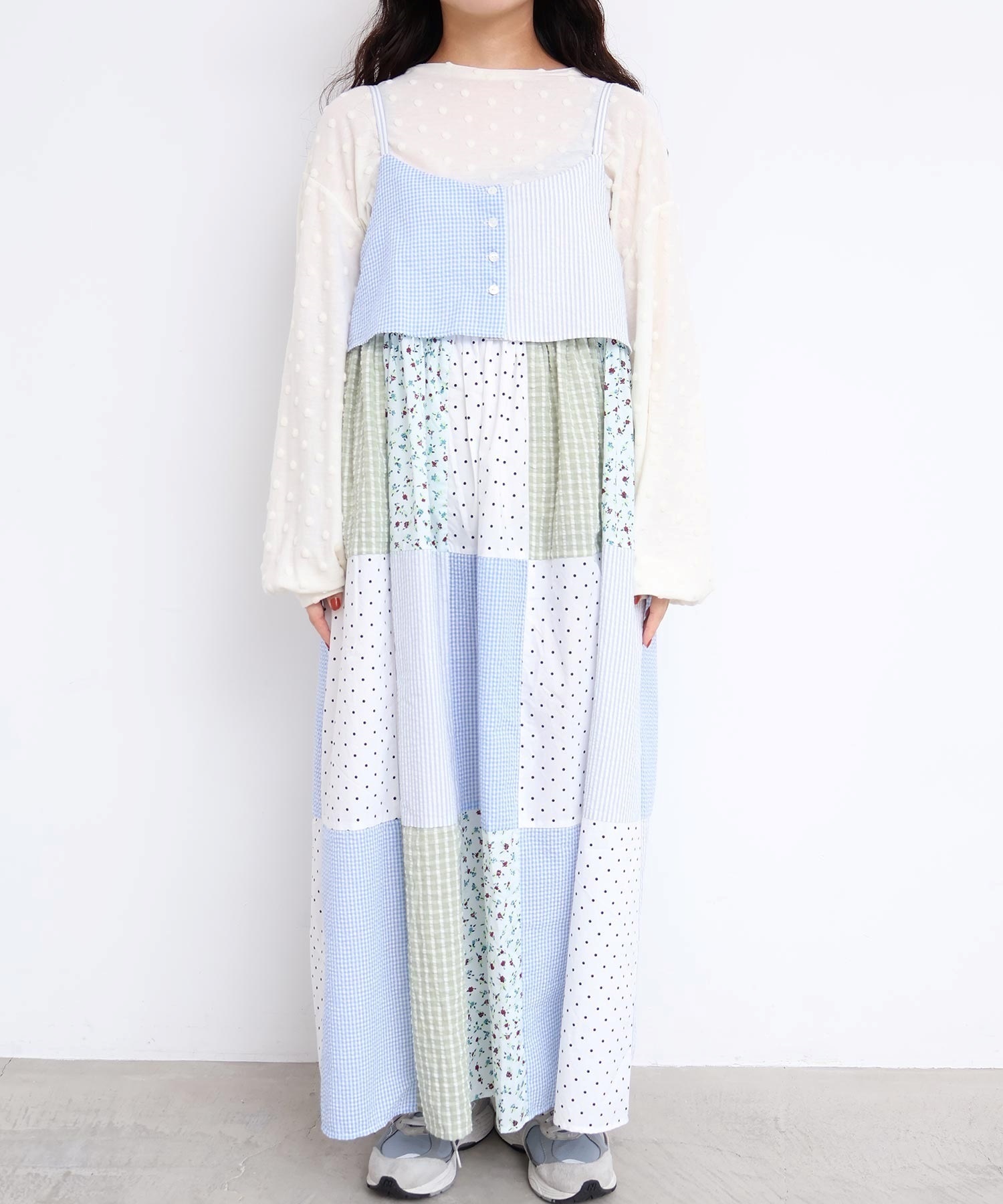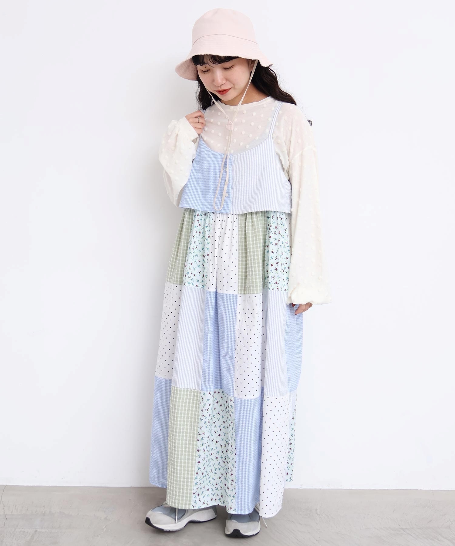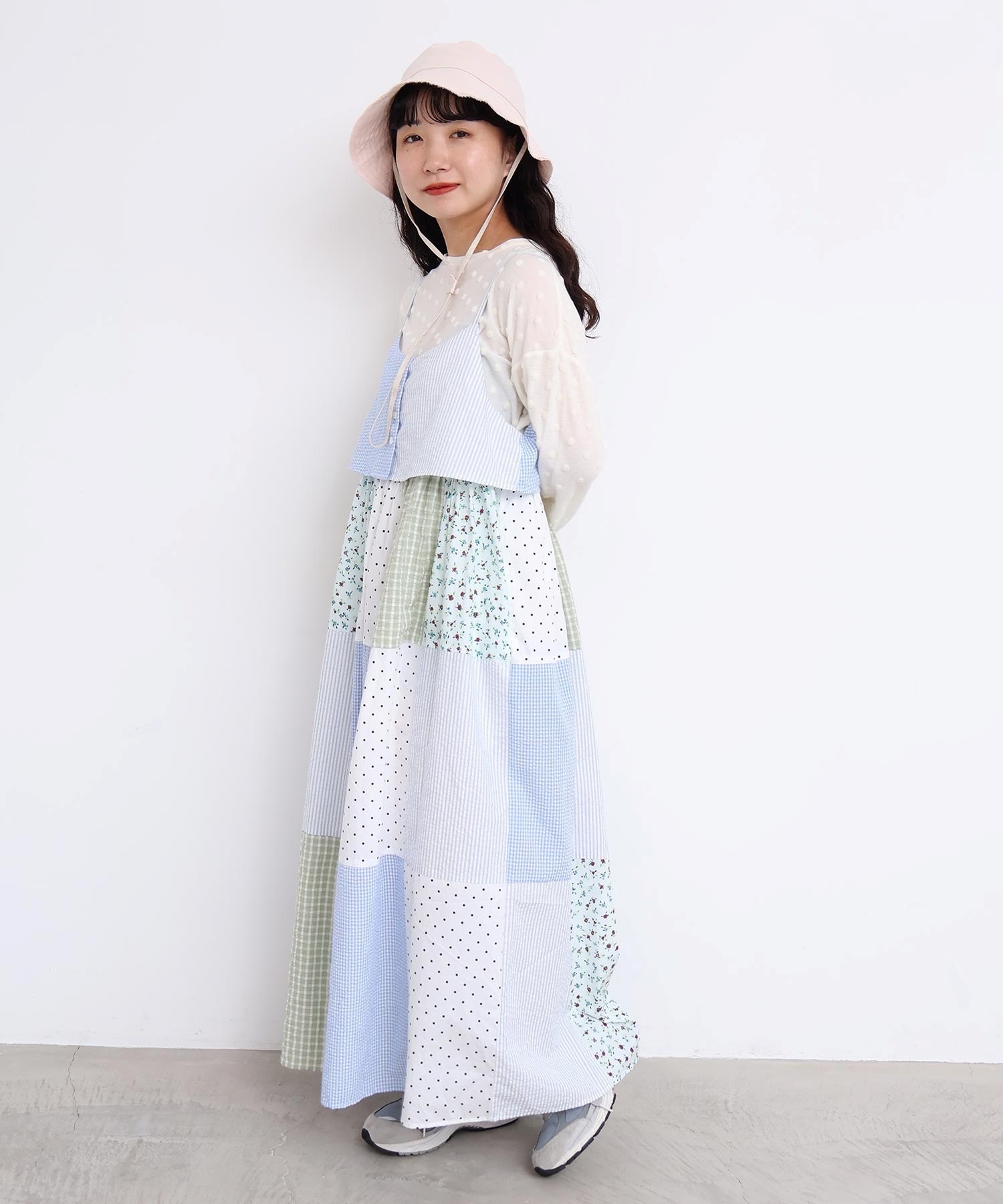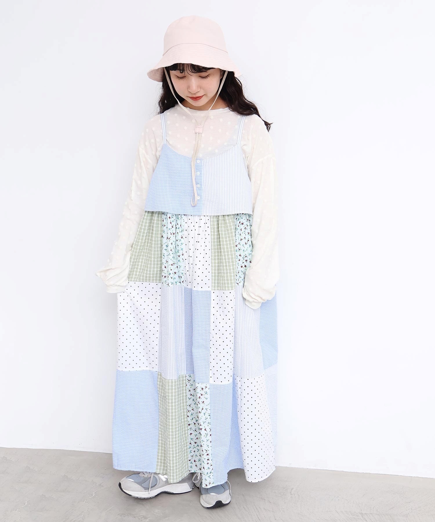 小花柄、ドット、ギンガムチェックを組み合わせたパッチワークは、