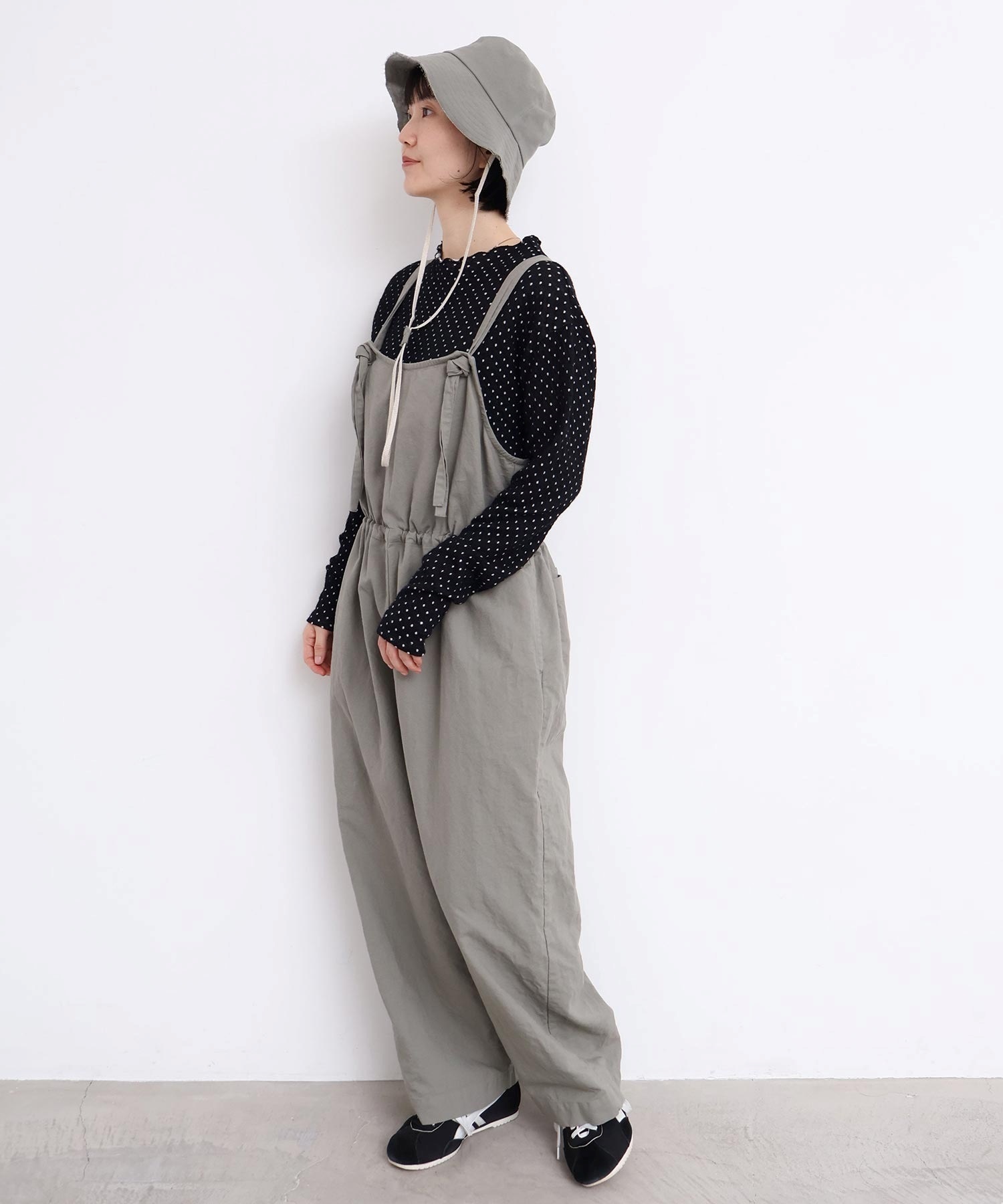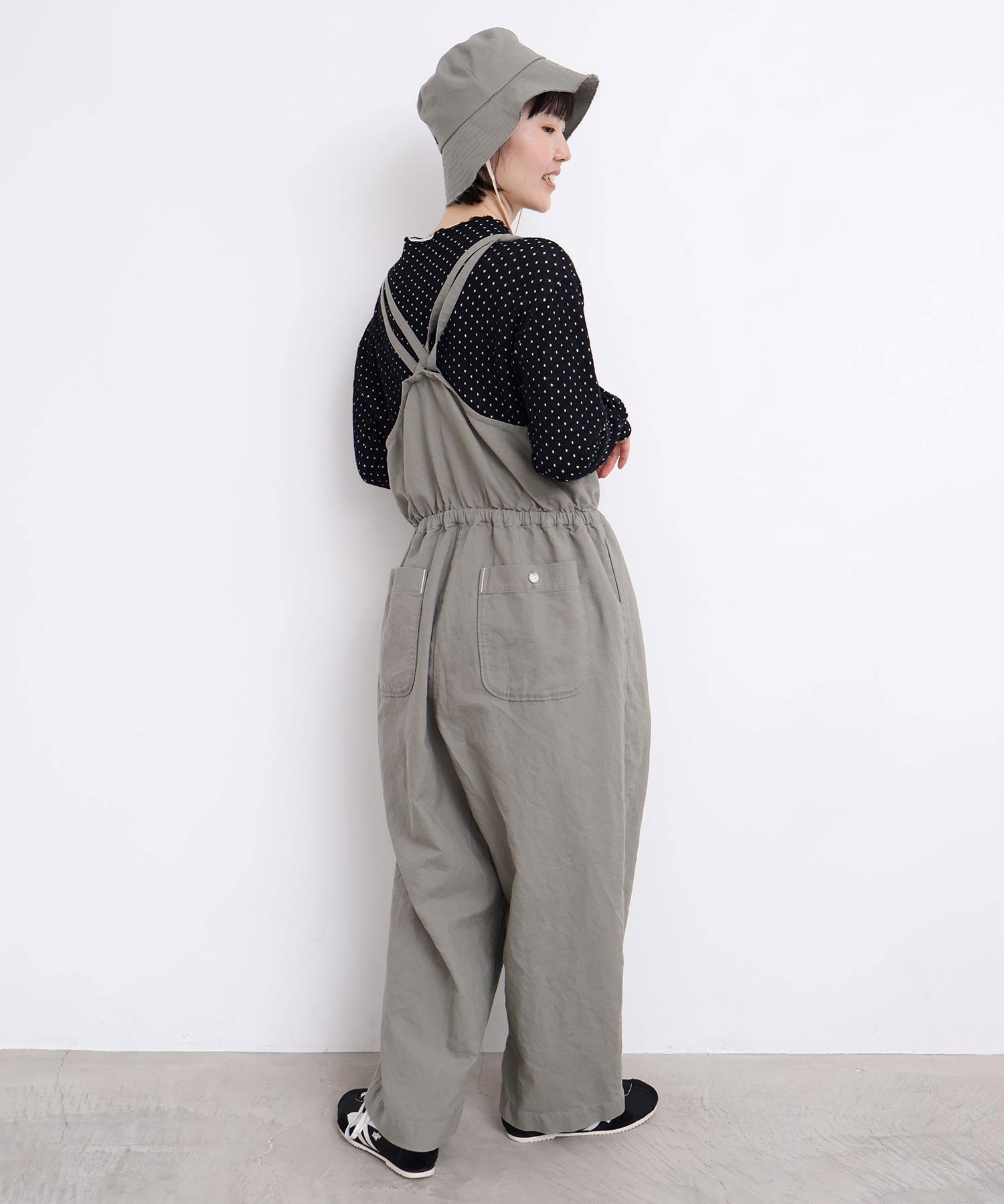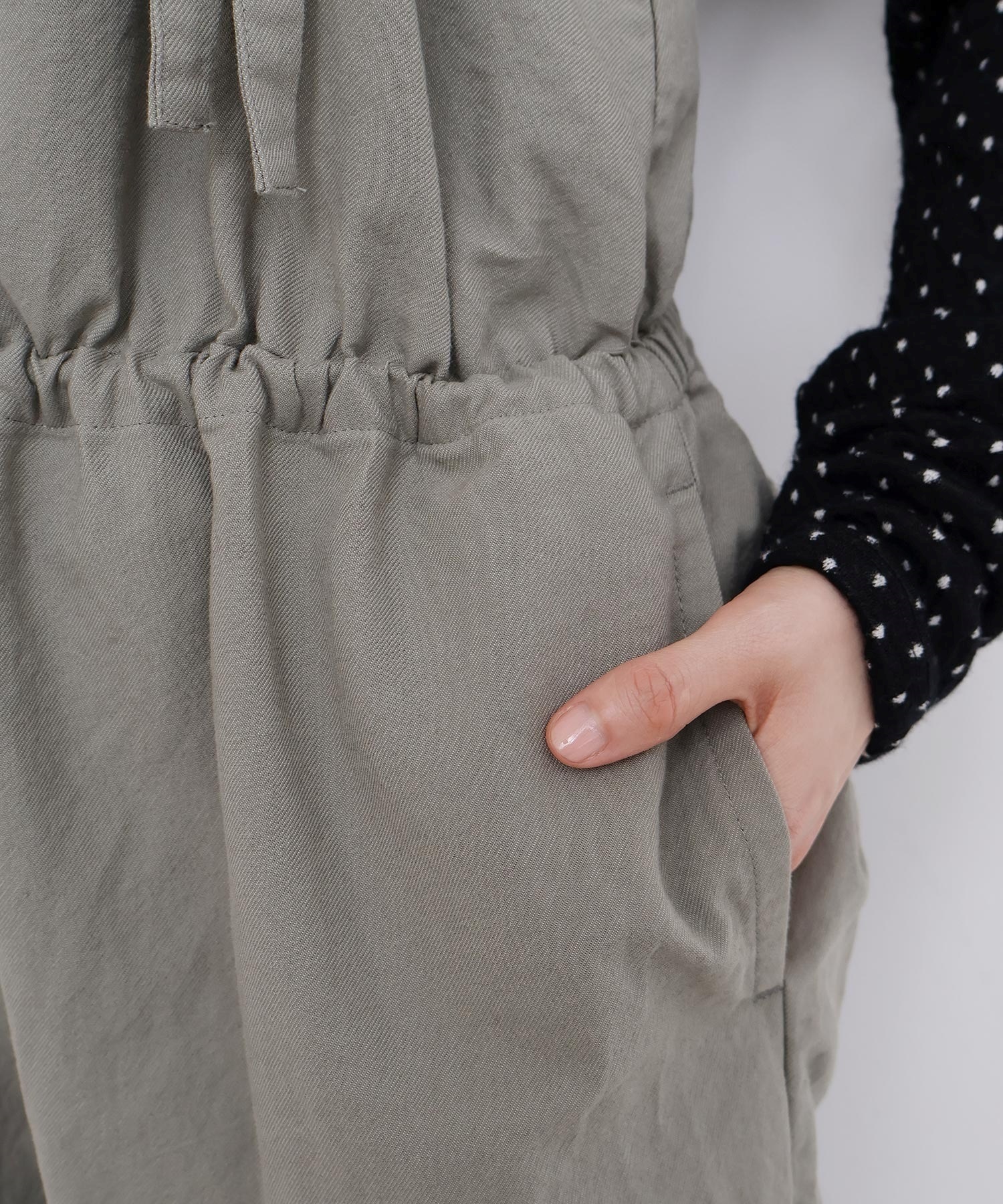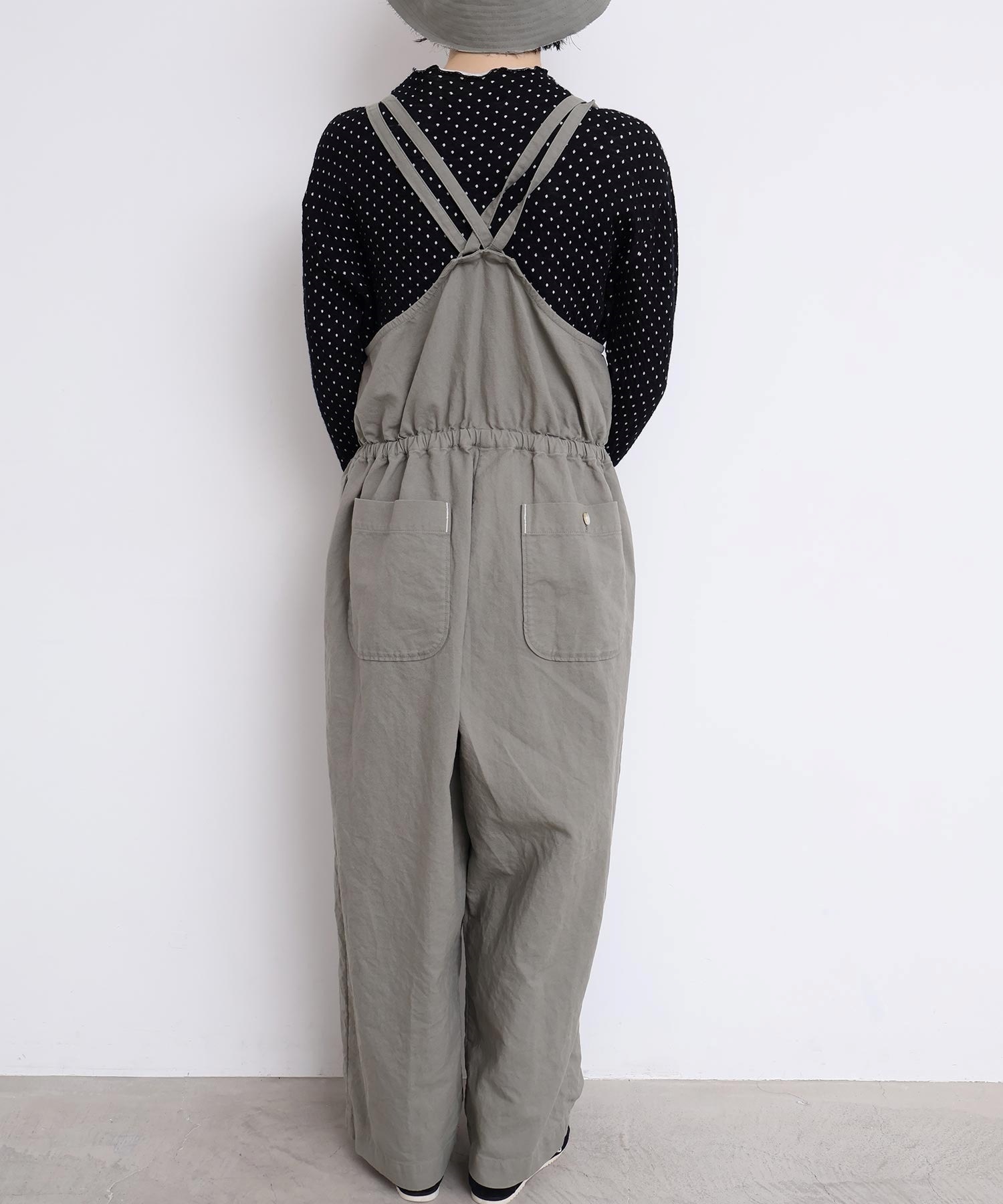 内側に通ったウエストゴムをしぼったり、肩紐の長さを長くして胸当ての位置を変えてゆるりとロンパースのような着方にも。