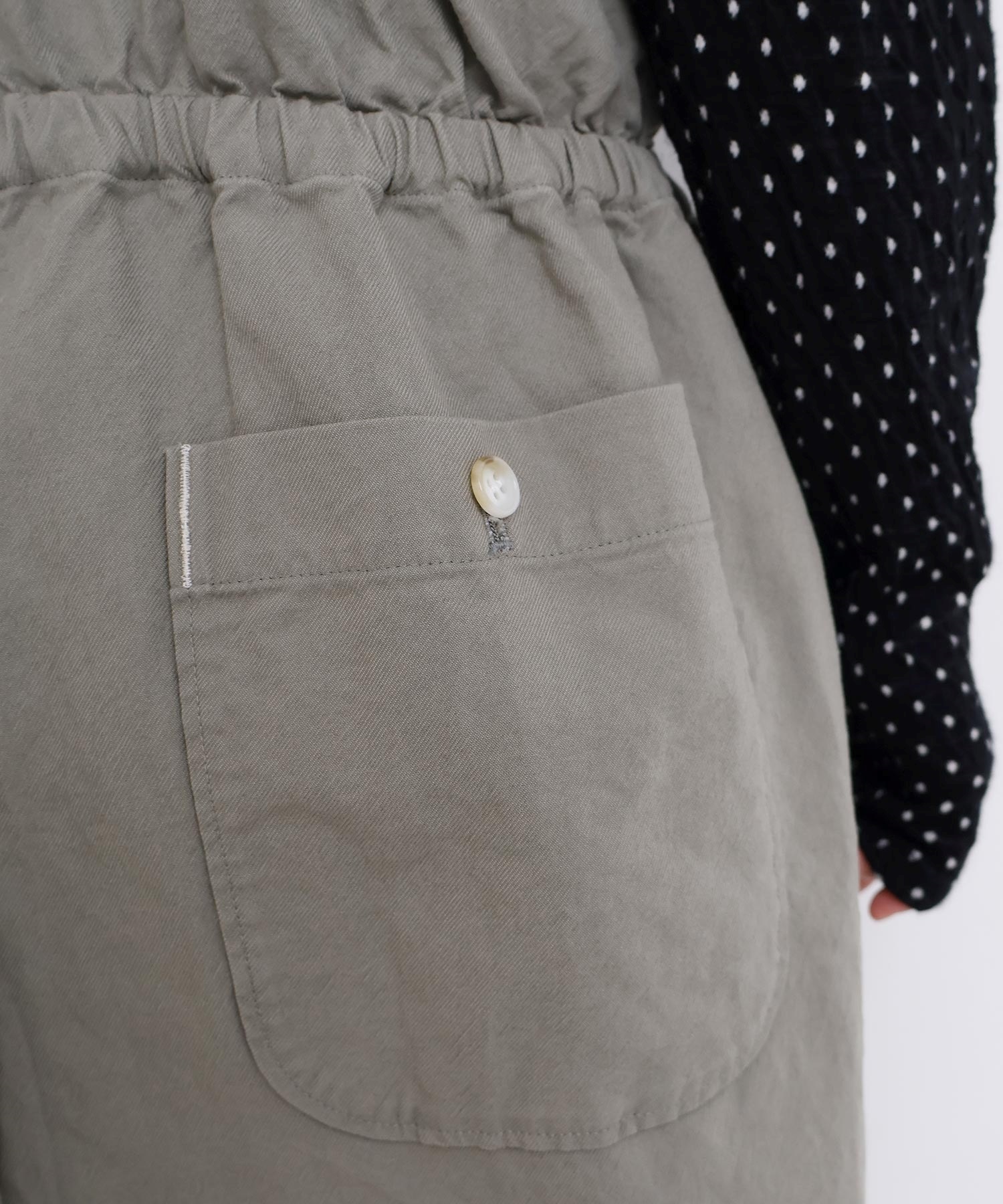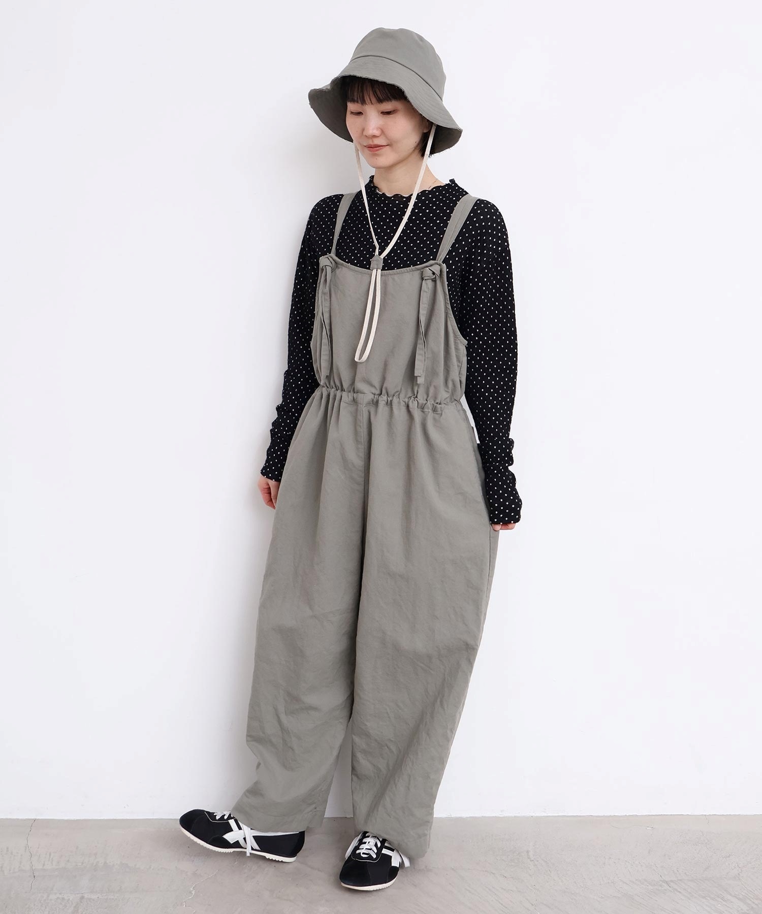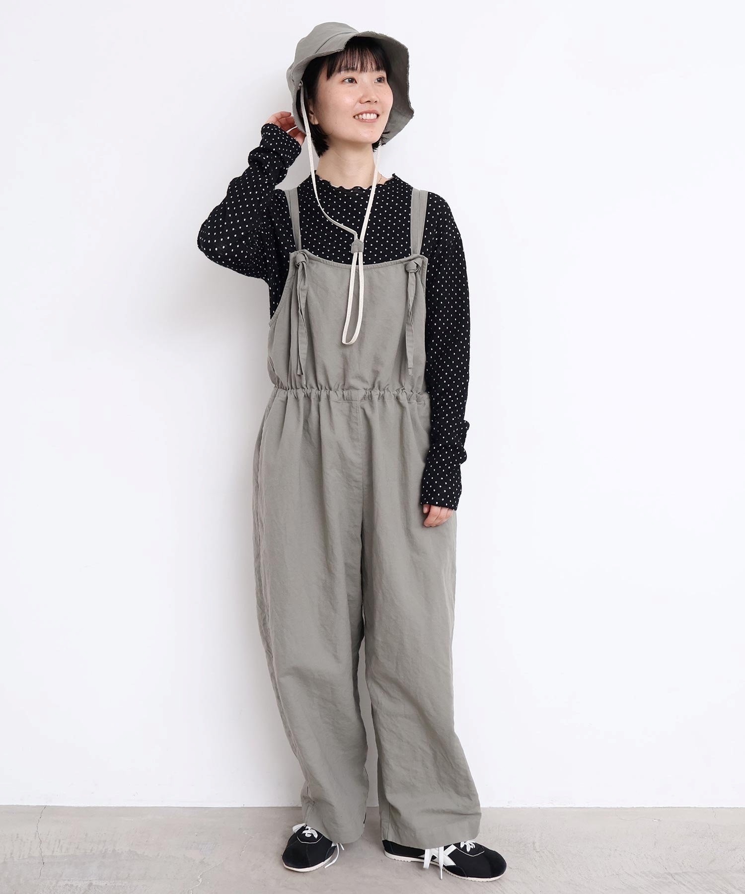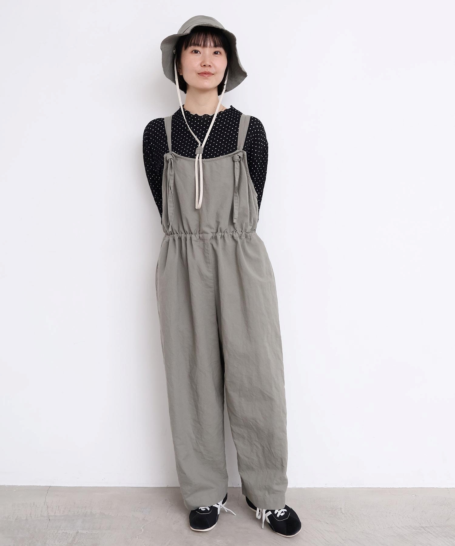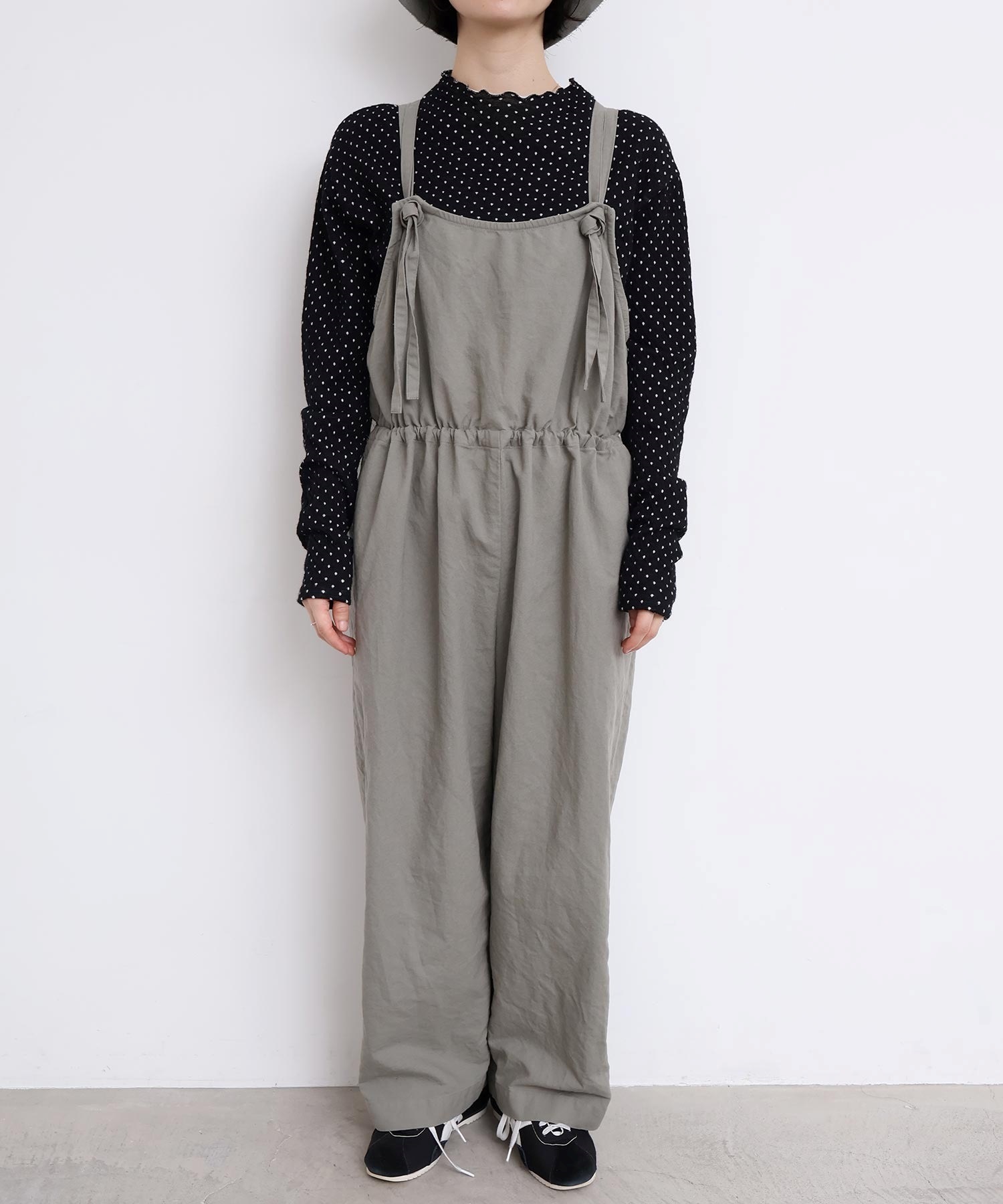 内側に通ったウエストゴムをしぼったり、肩紐の長さを長くして胸当ての位置を変えてゆるりとロンパースのような着方にも。