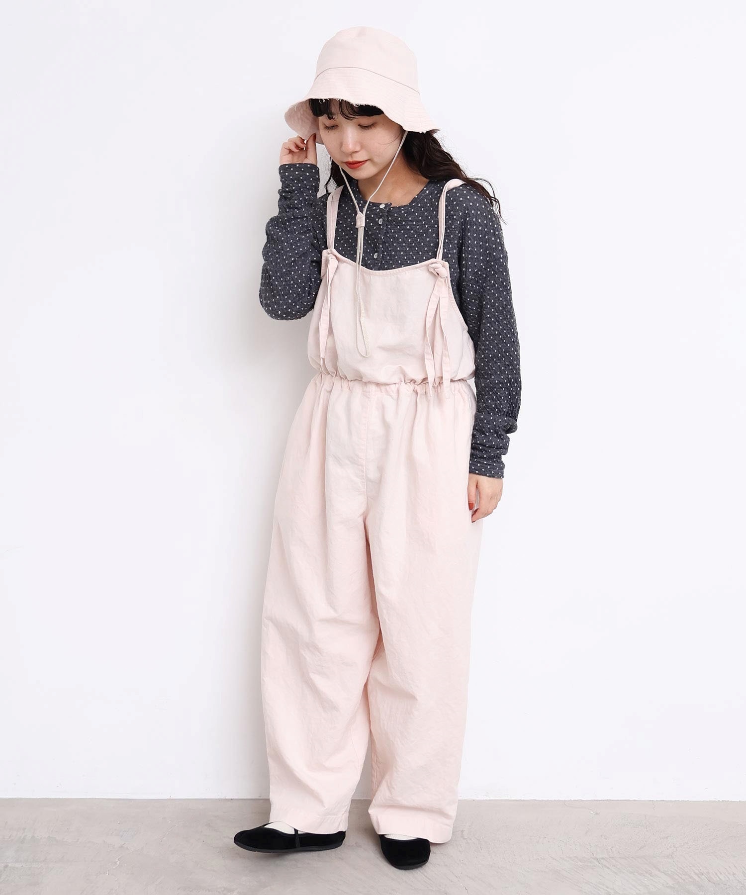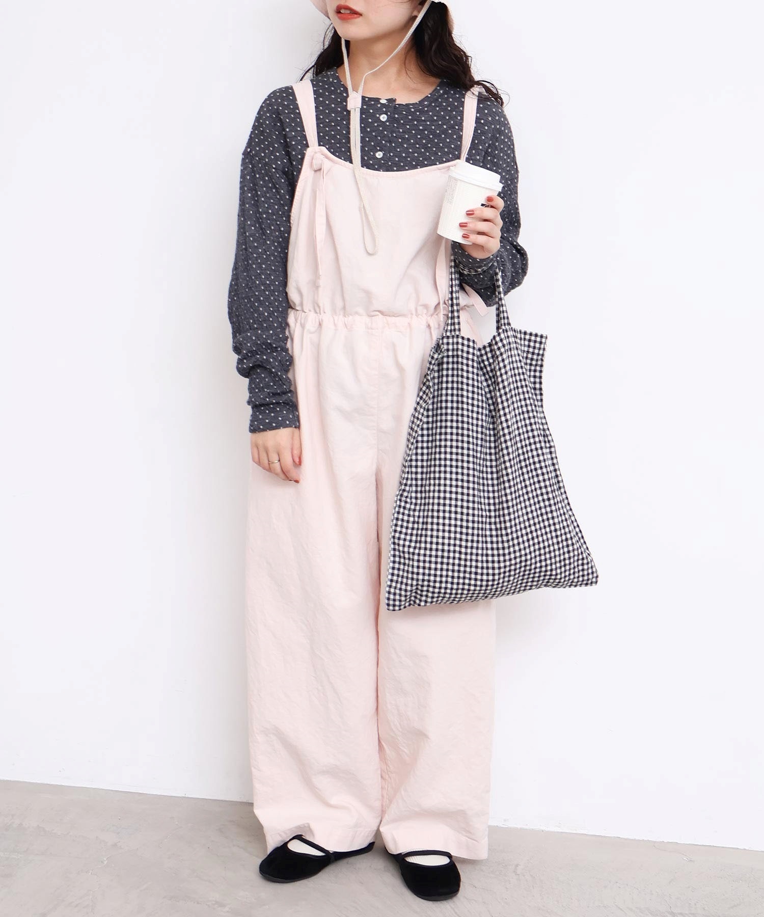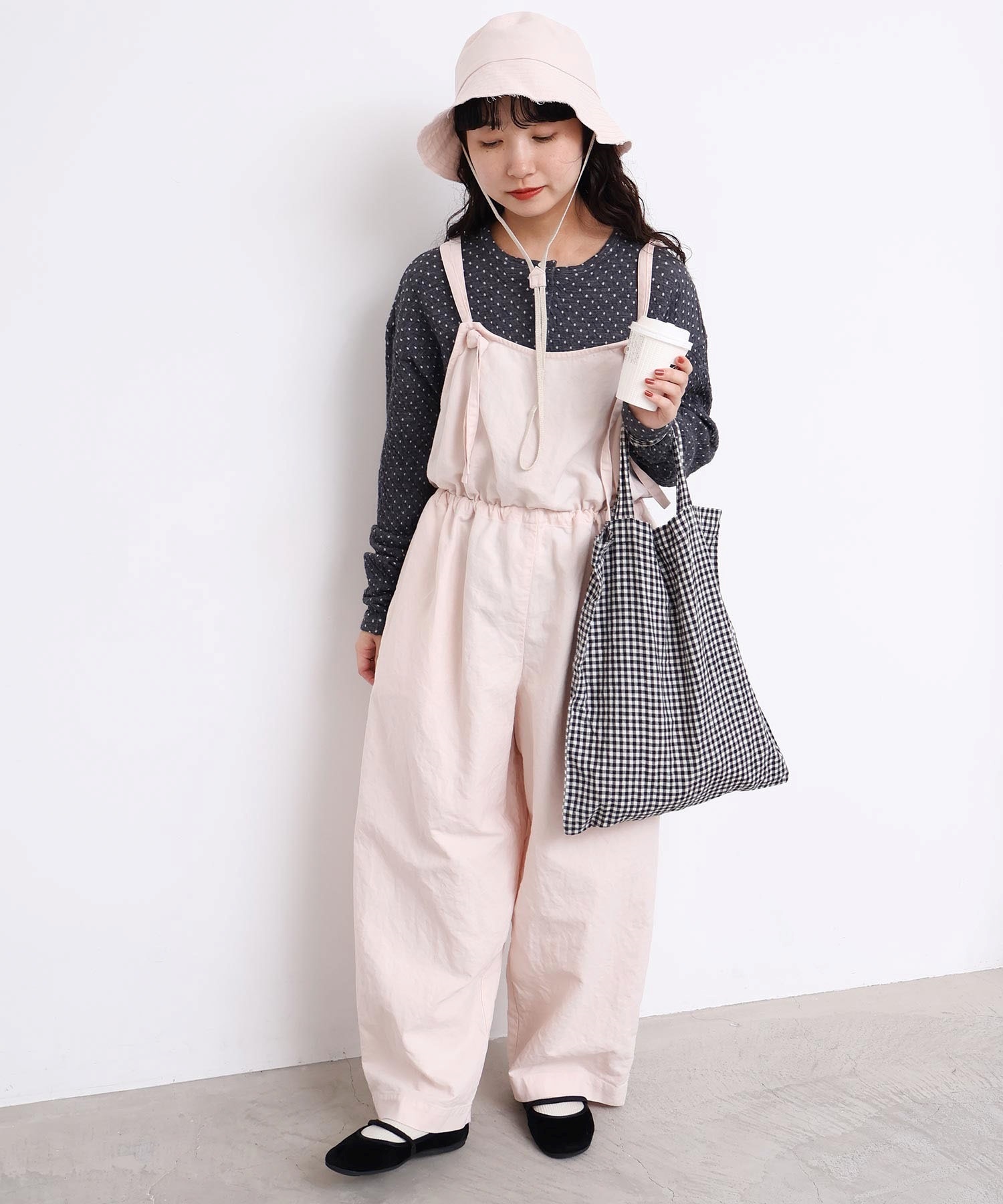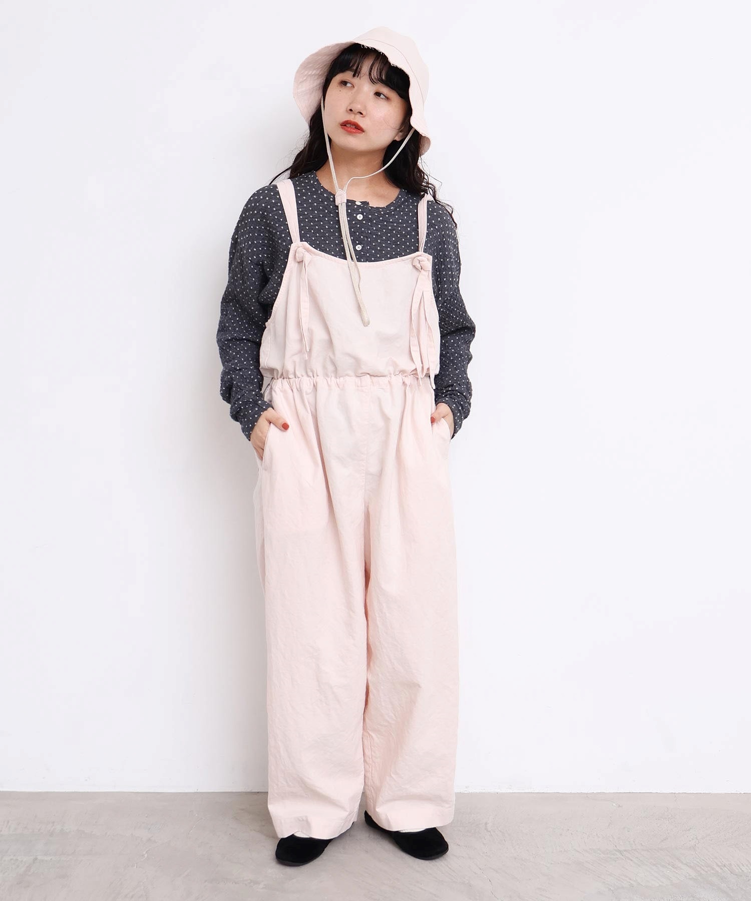 内側に通ったウエストゴムをしぼったり、肩紐の長さを長くして胸当ての位置を変えてゆるりとロンパースのような着方にも。