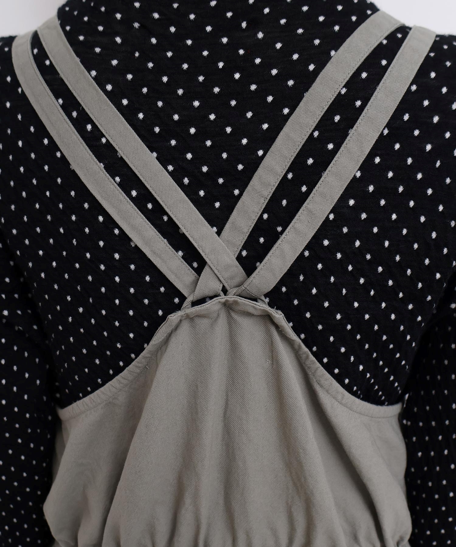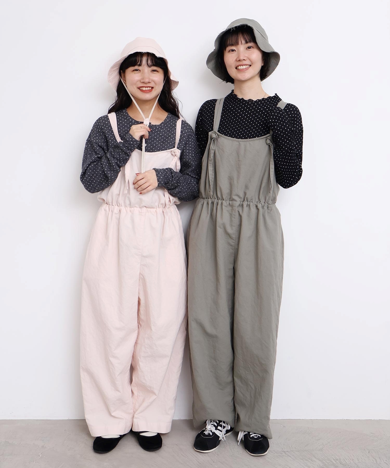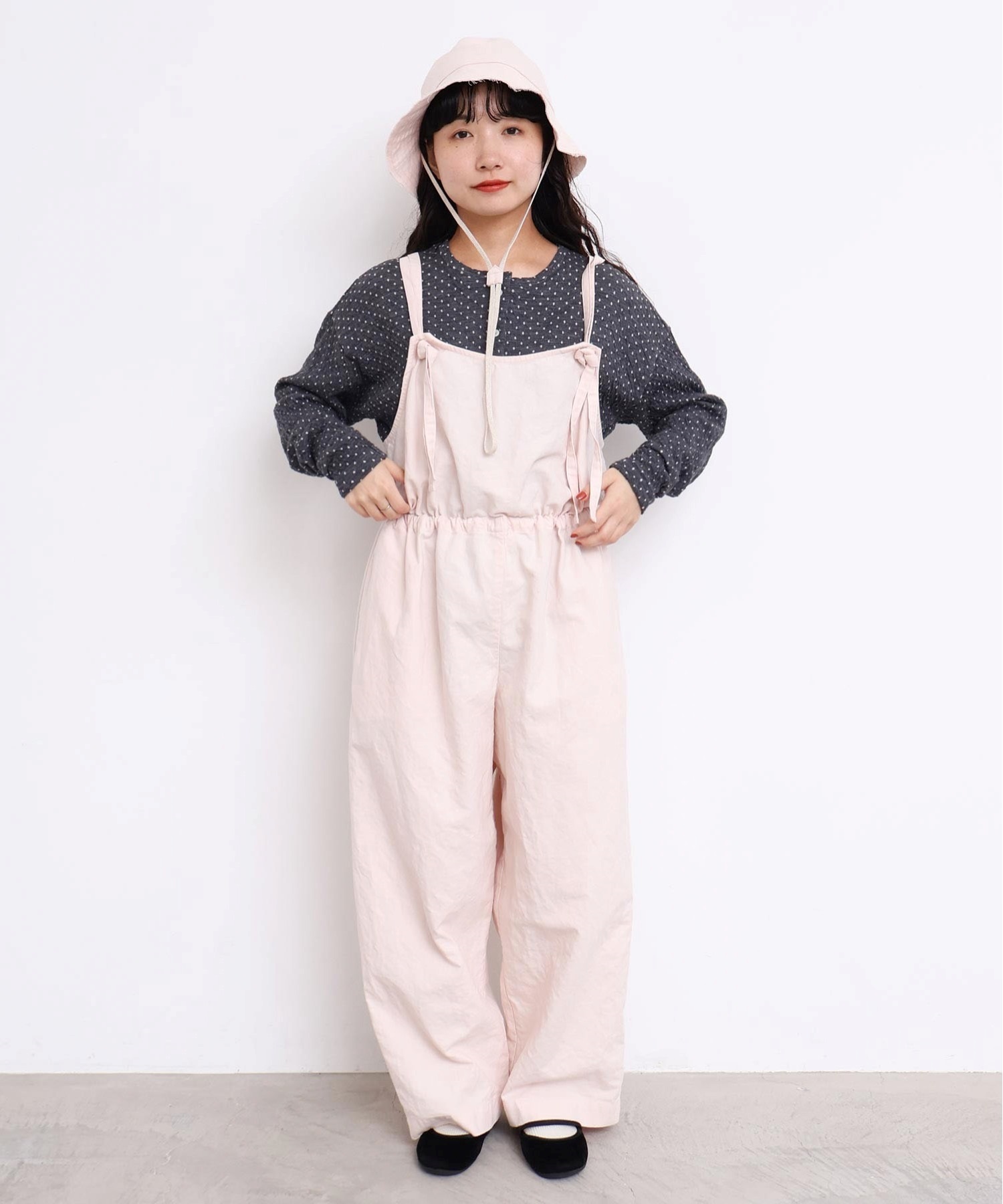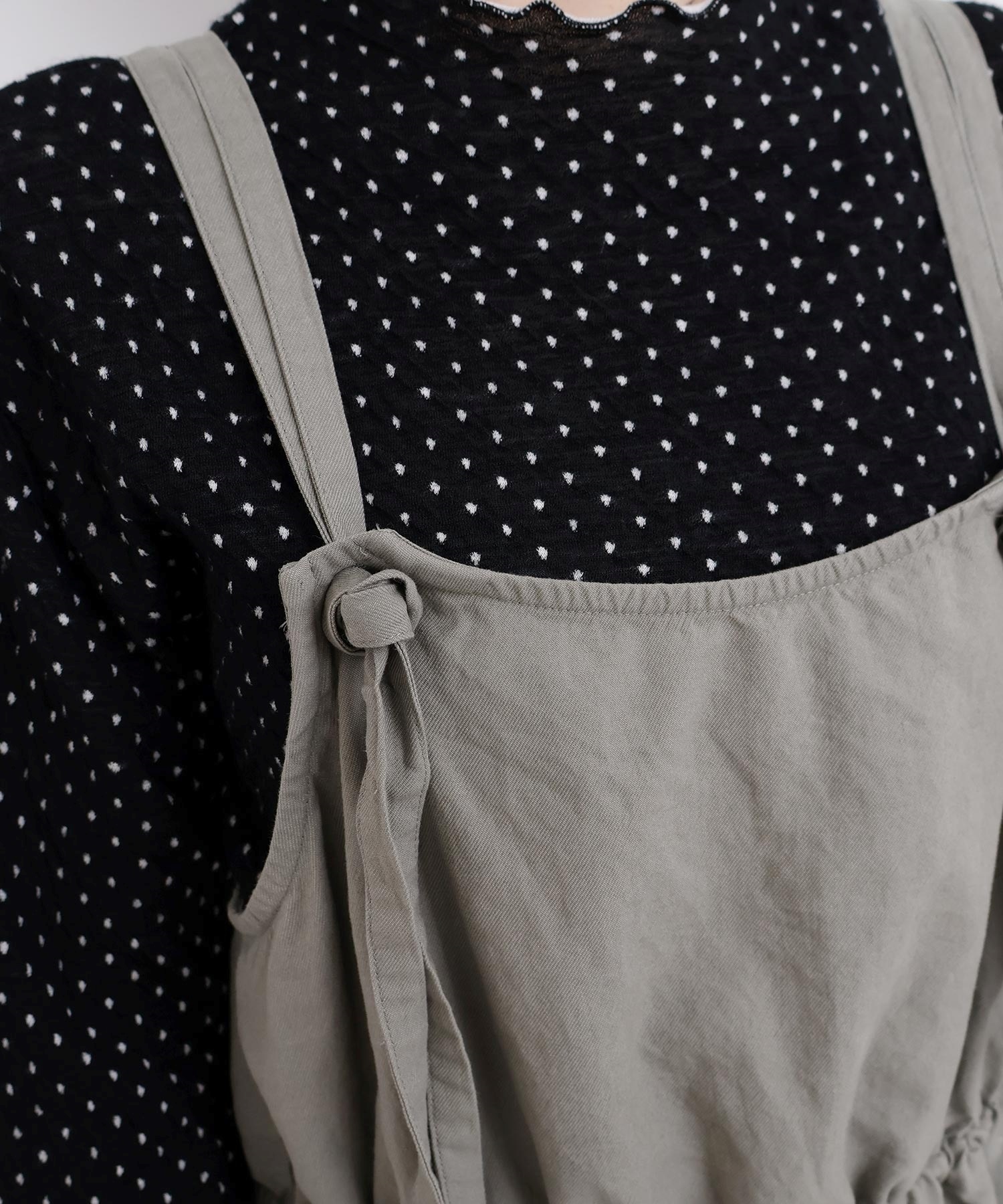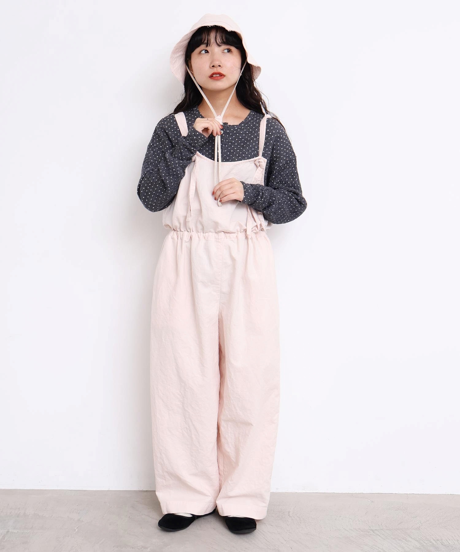 内側に通ったウエストゴムをしぼったり、肩紐の長さを長くして胸当ての位置を変えてゆるりとロンパースのような着方にも。