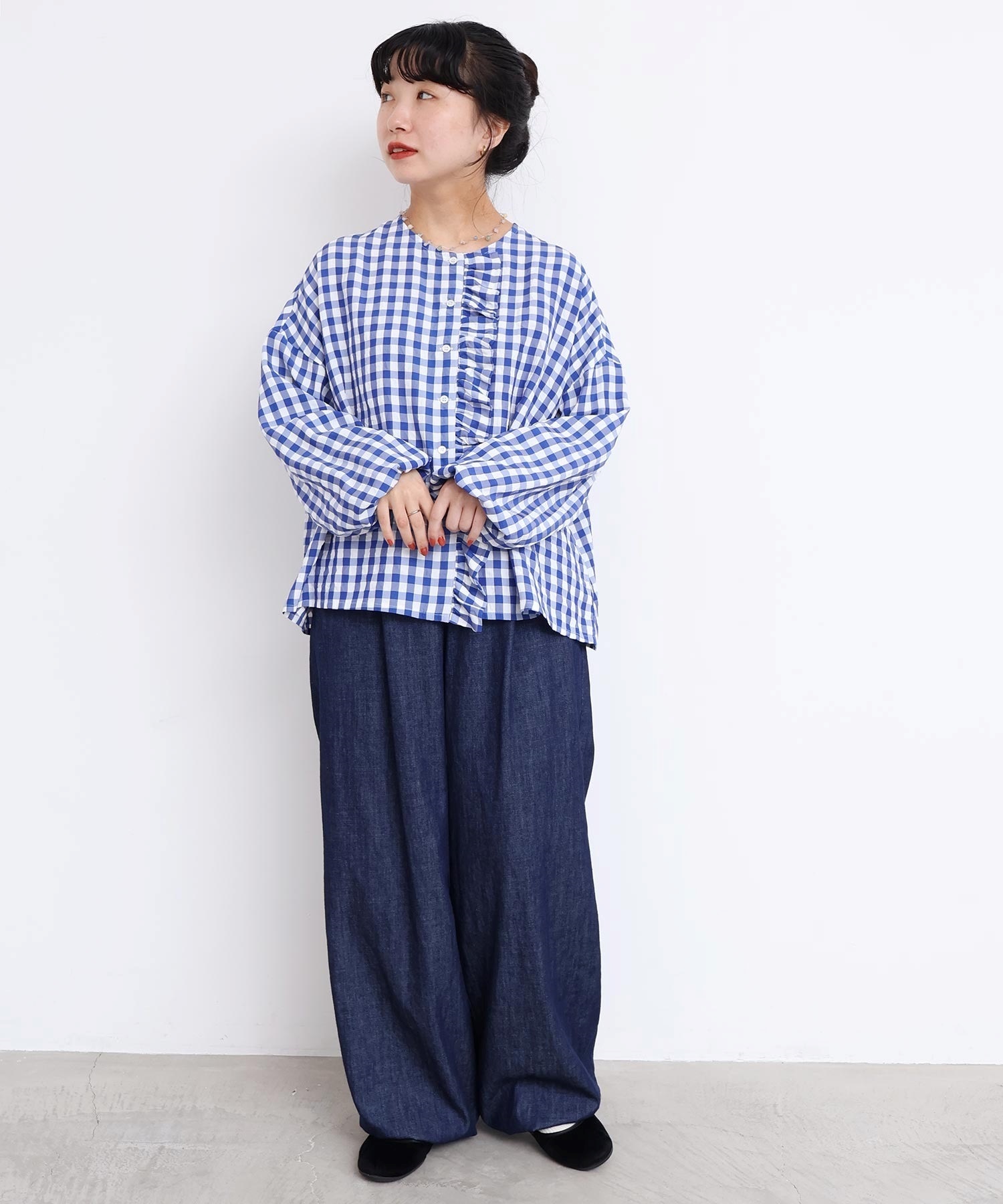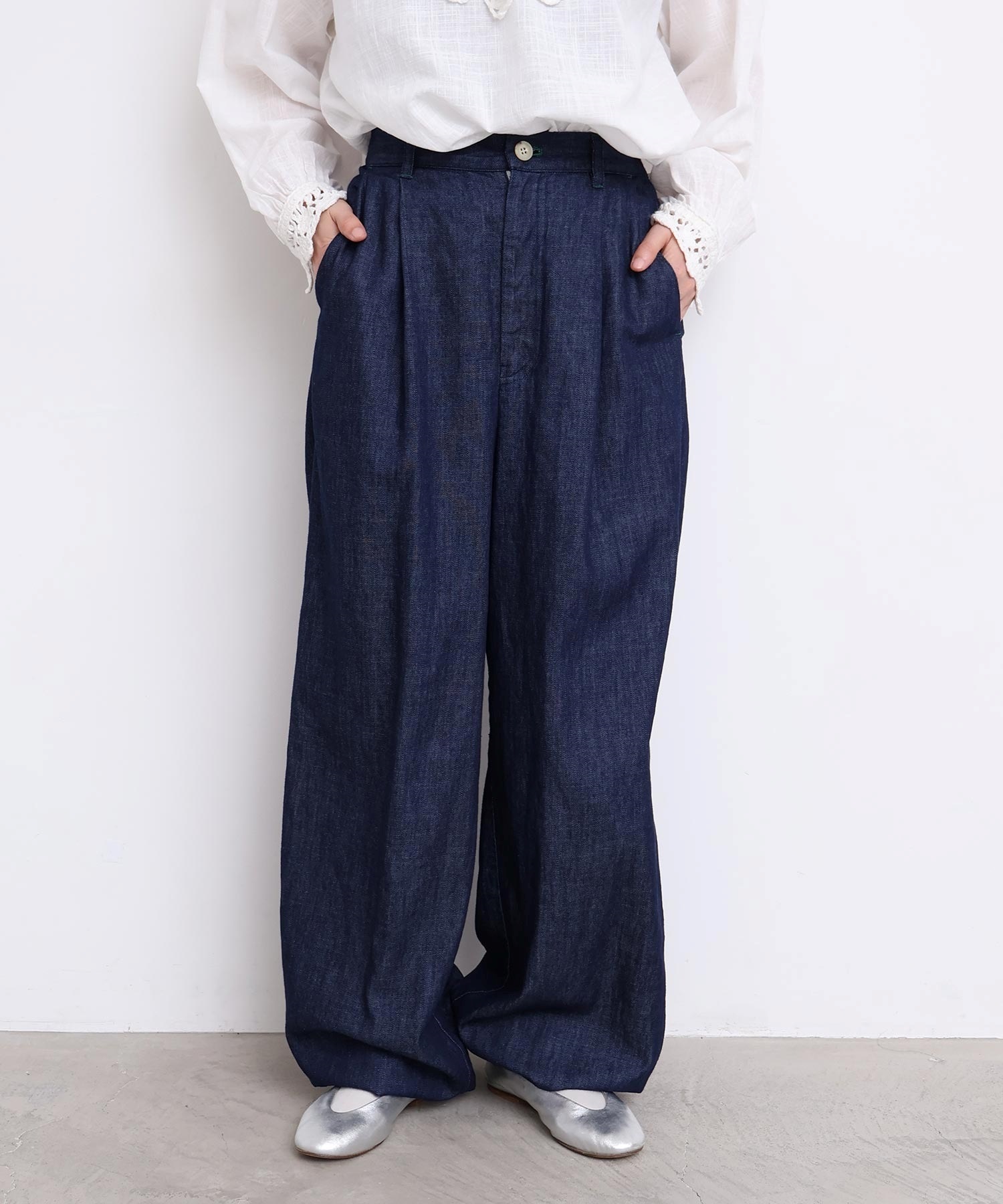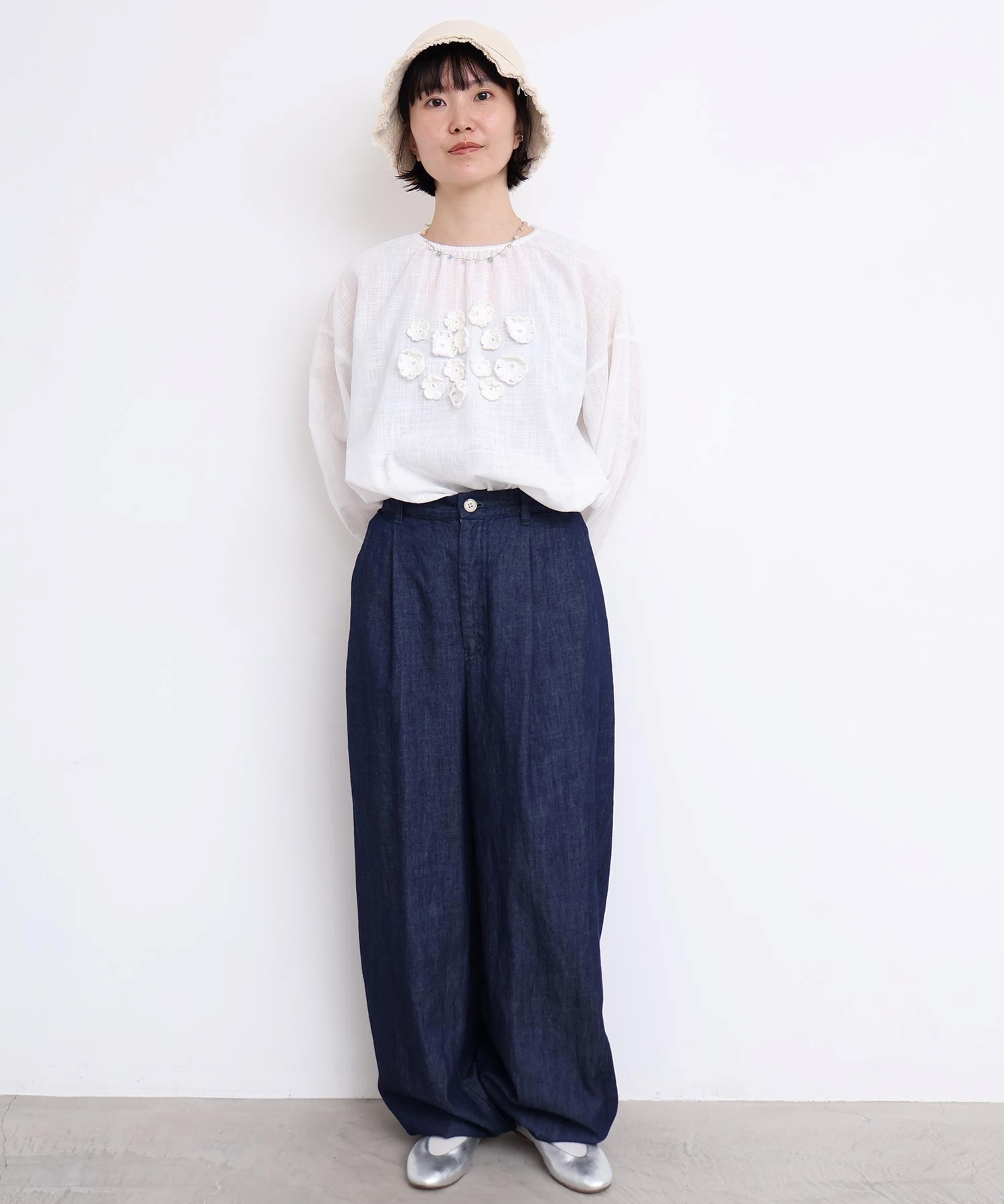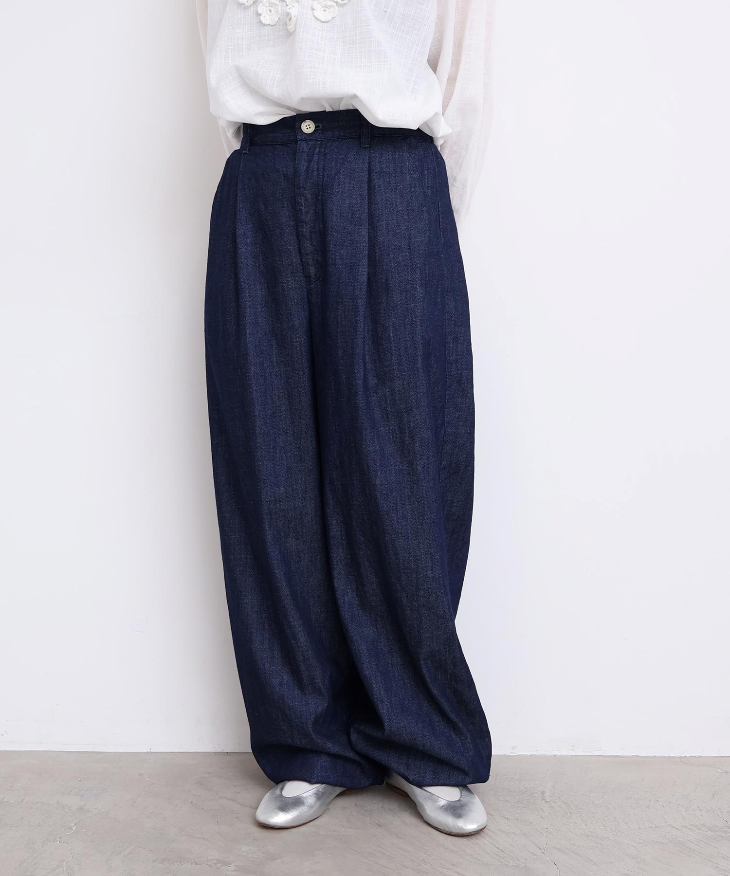 さわやかな薄手デニムで、裾ゴムのリラックスパンツを作りました。