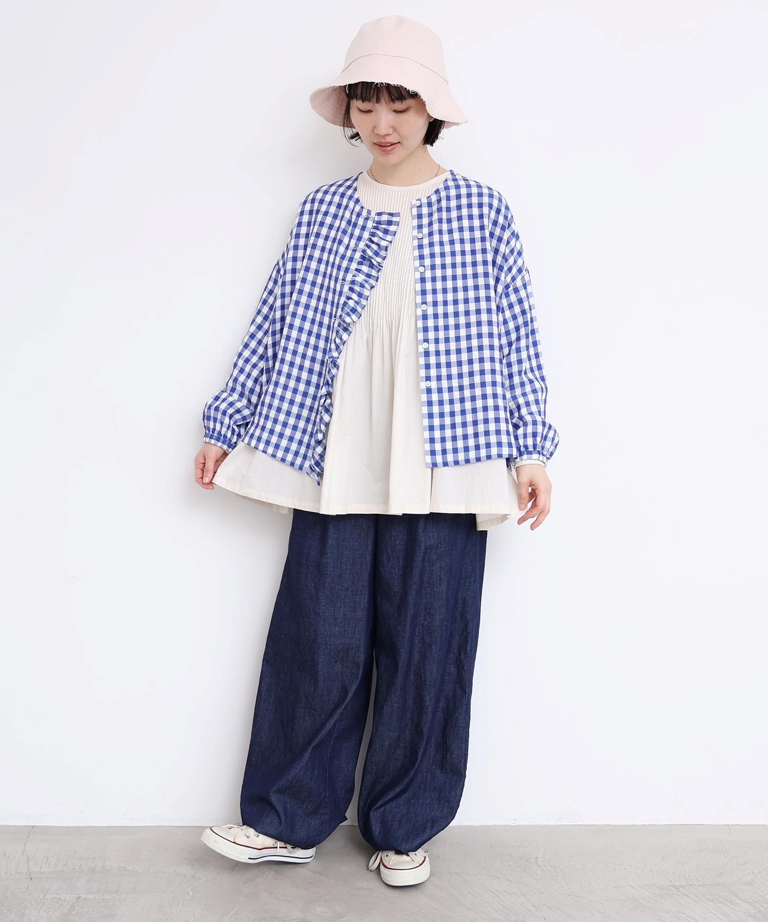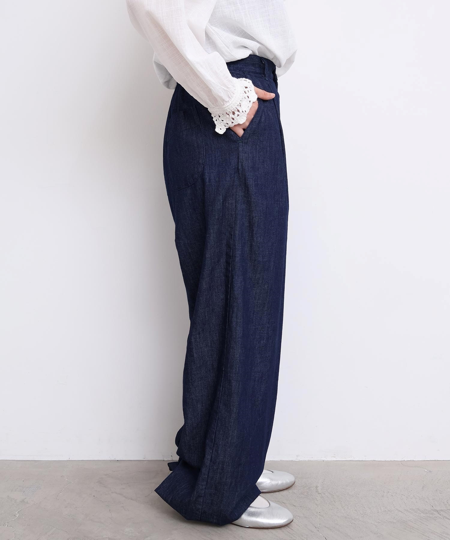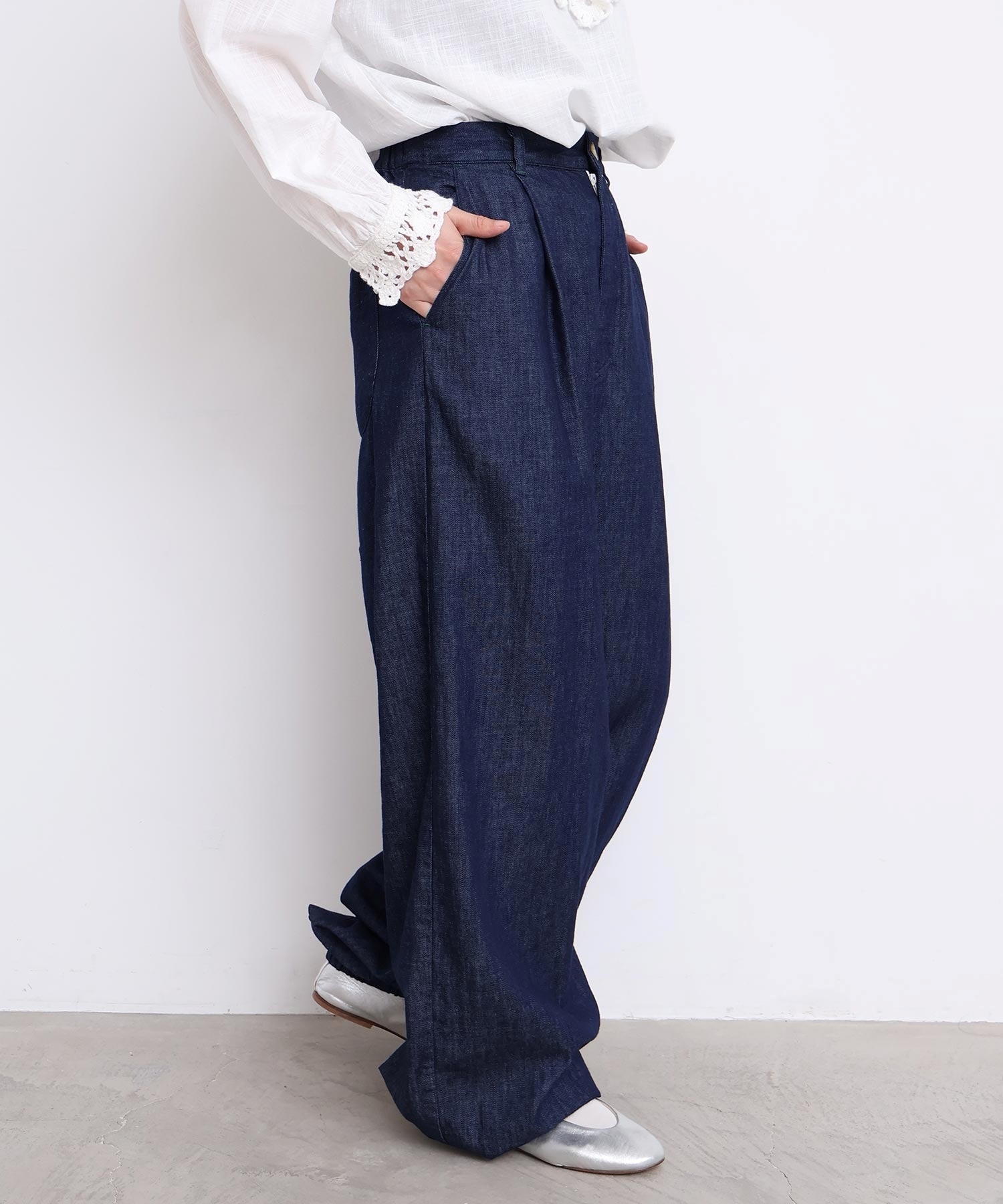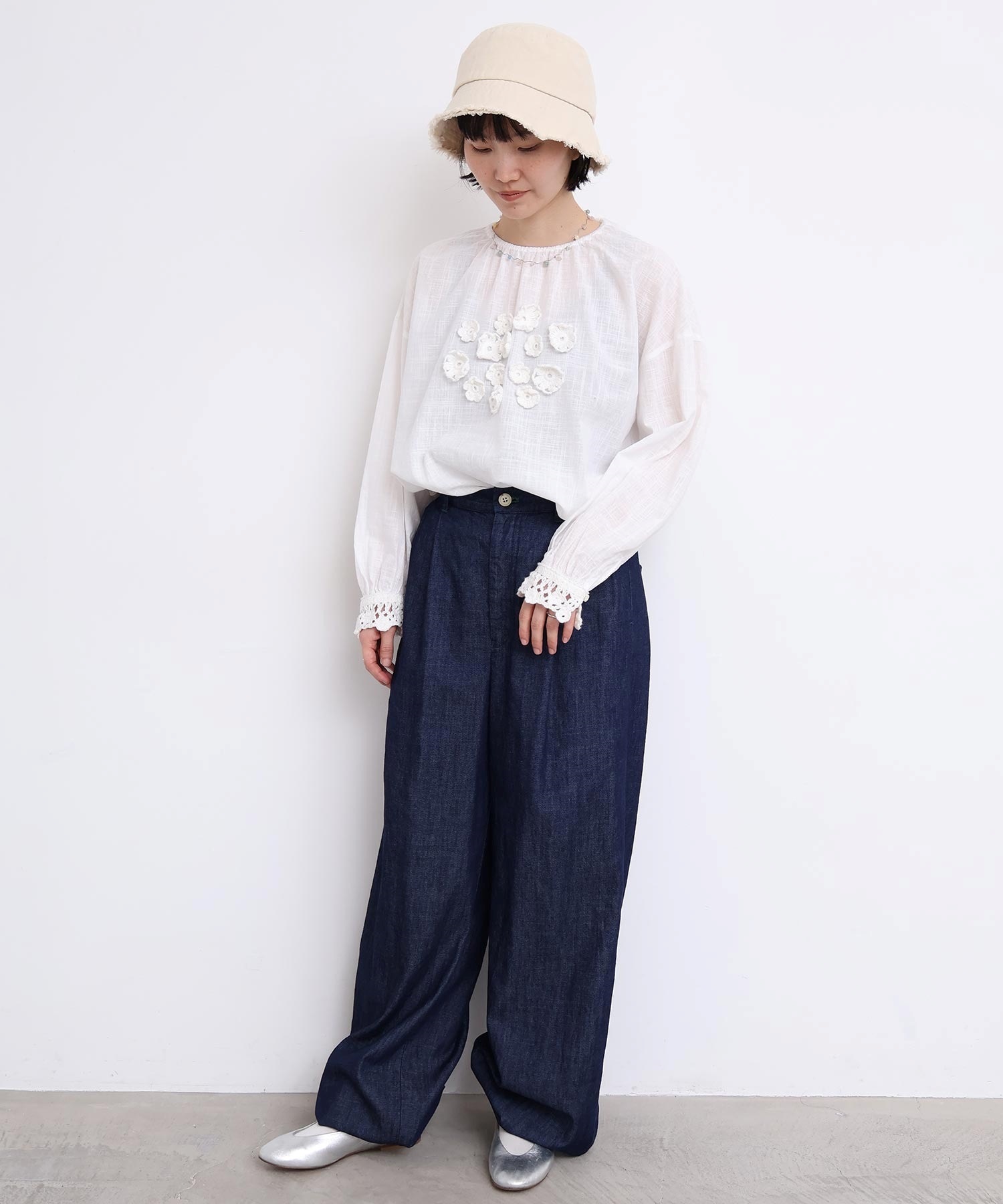 さわやかな薄手デニムで、裾ゴムのリラックスパンツを作りました。