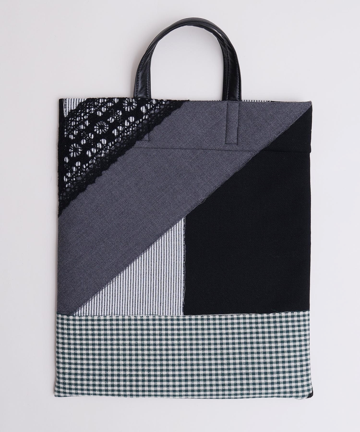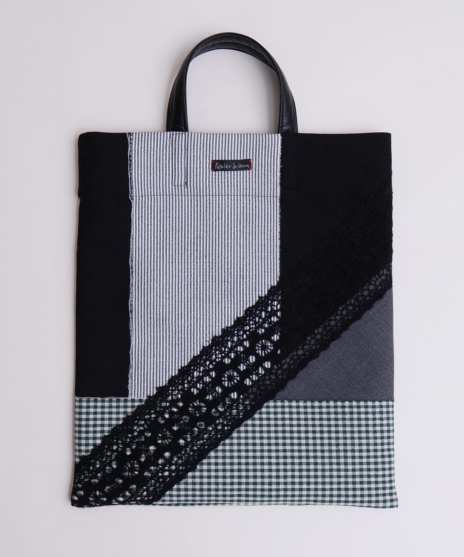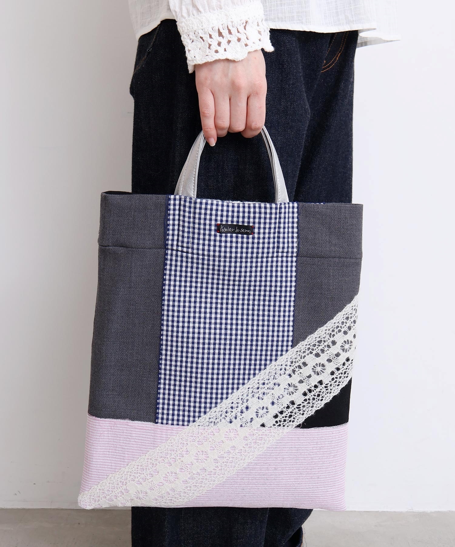 ニードルパンチができる特別な機械を使って、いくつもの生地やレースがコラージュされたあたたかみのあるバッグをつくりました。