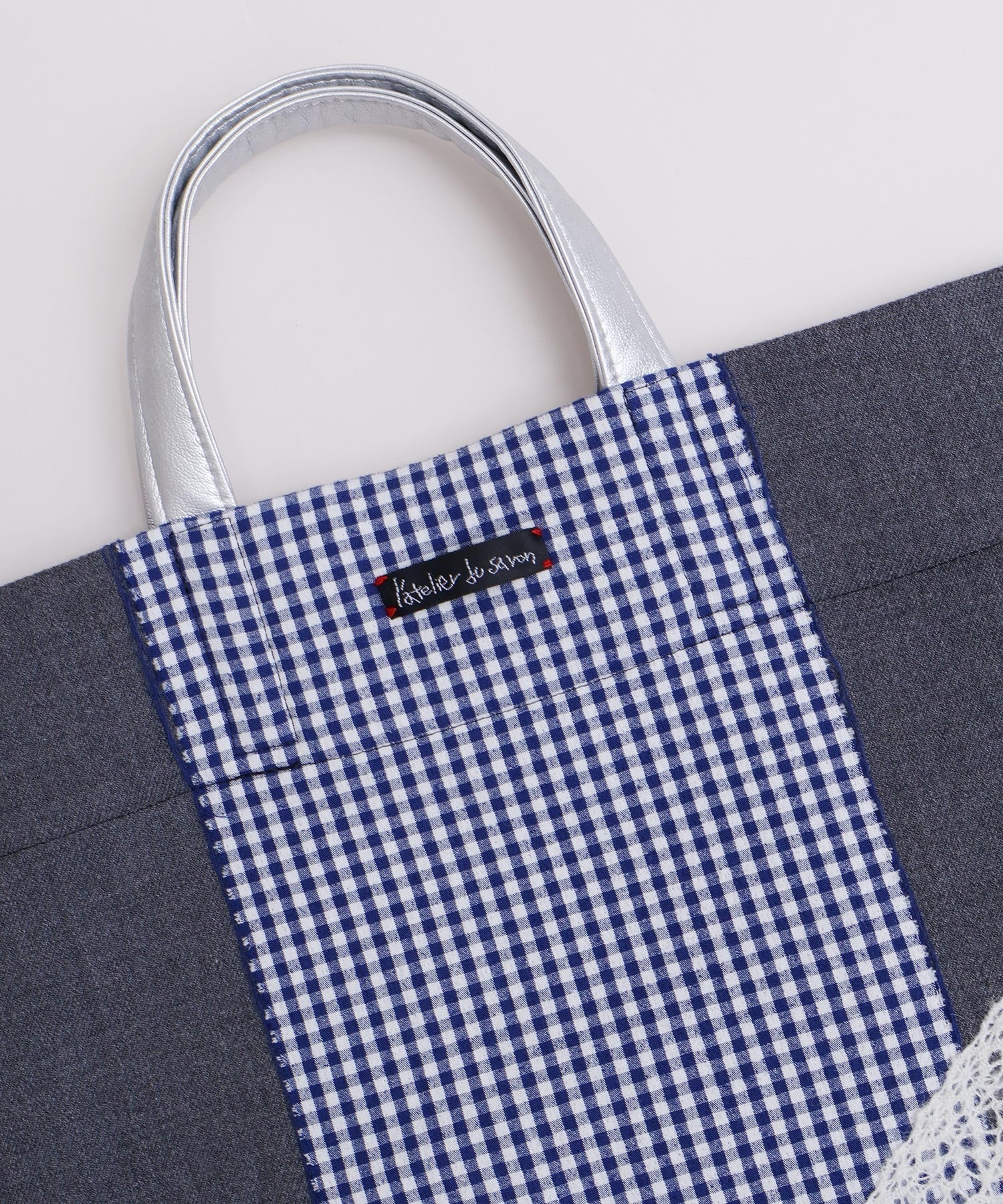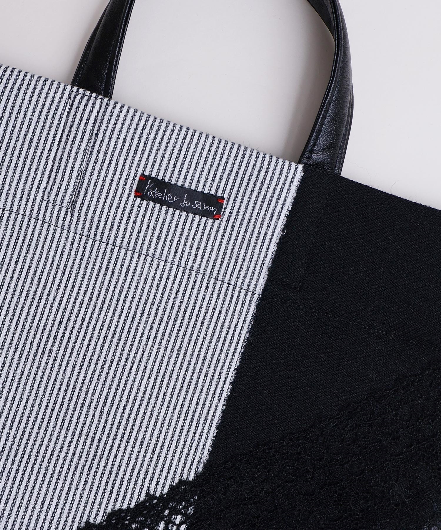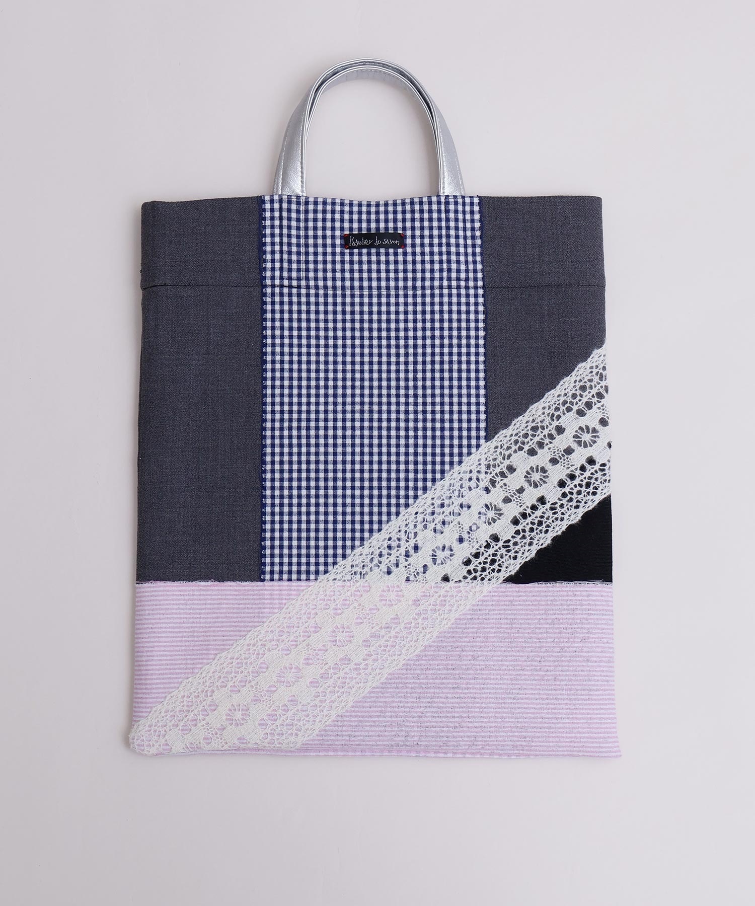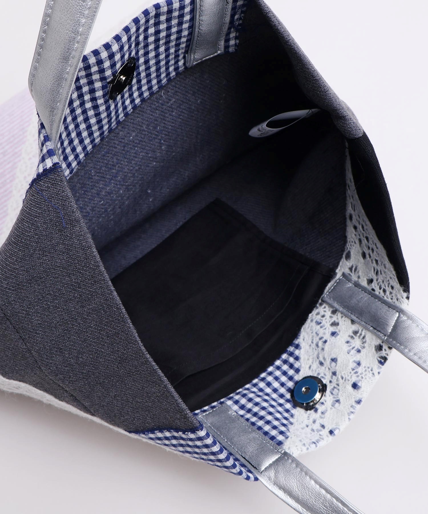 ニードルパンチができる特別な機械を使って、いくつもの生地やレースがコラージュされたあたたかみのあるバッグをつくりました。