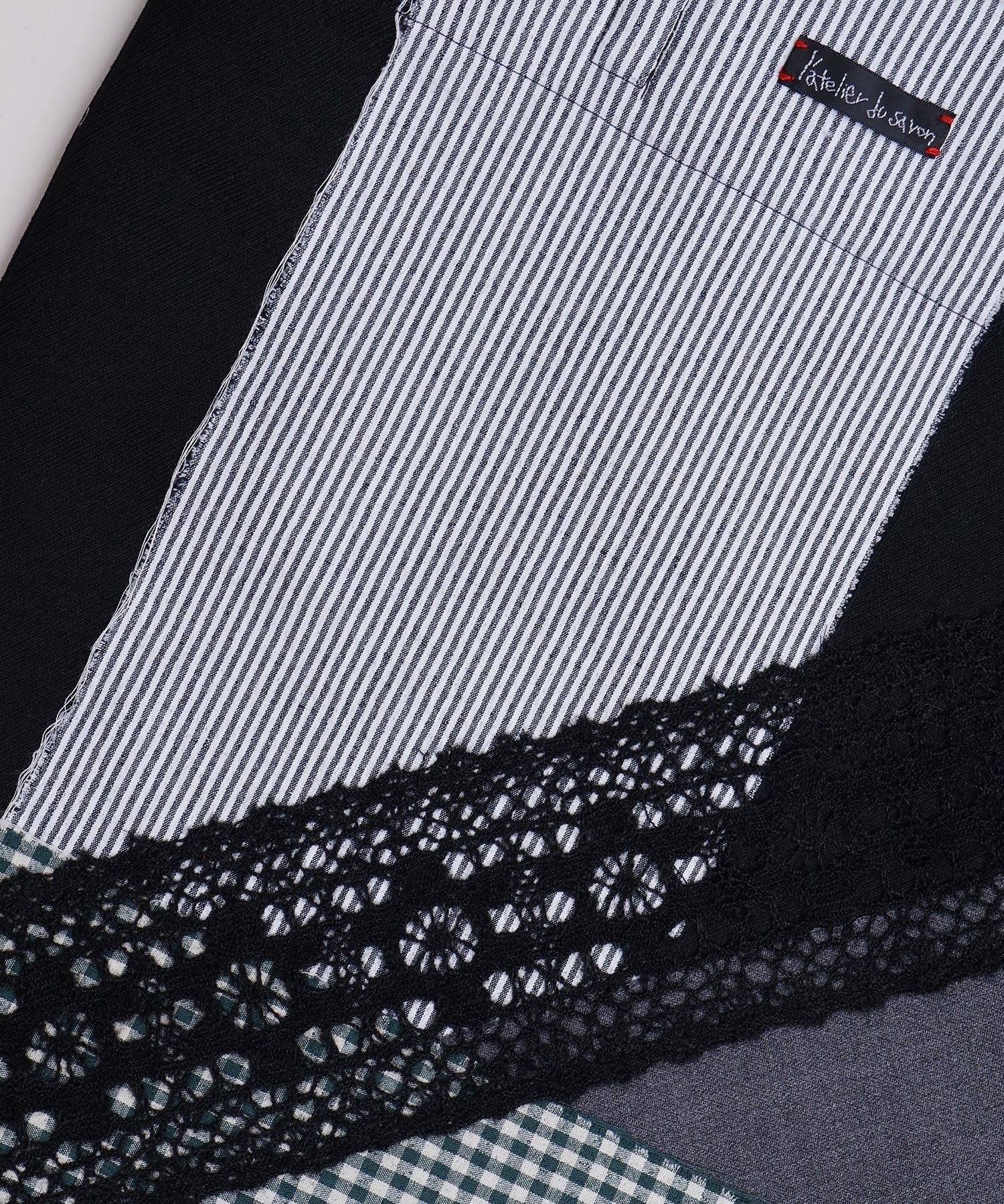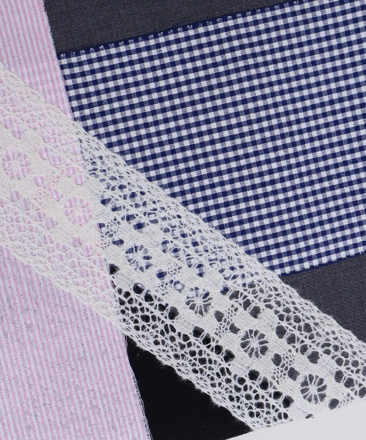布が重なった部分は下の柄が透けてでていて、色のまじりあいがみえます。パッチワークにはだせない質感と風合いです。