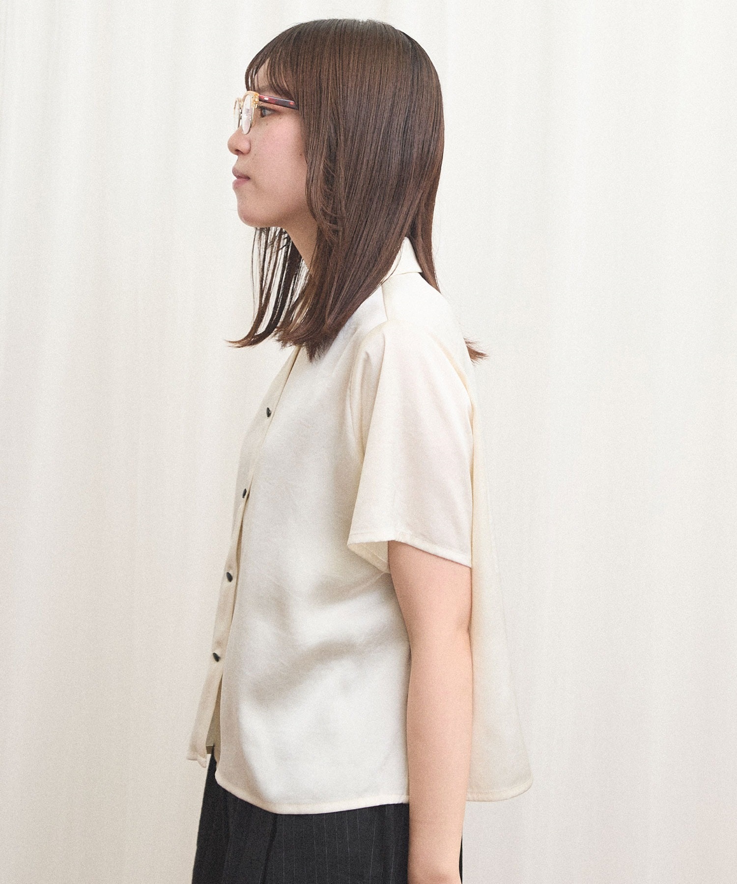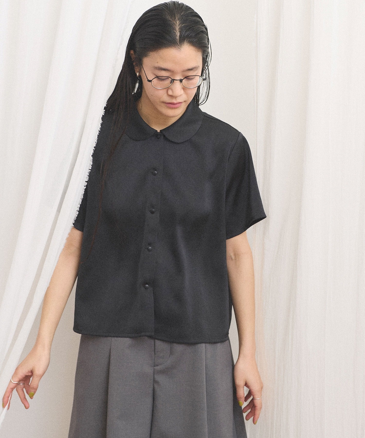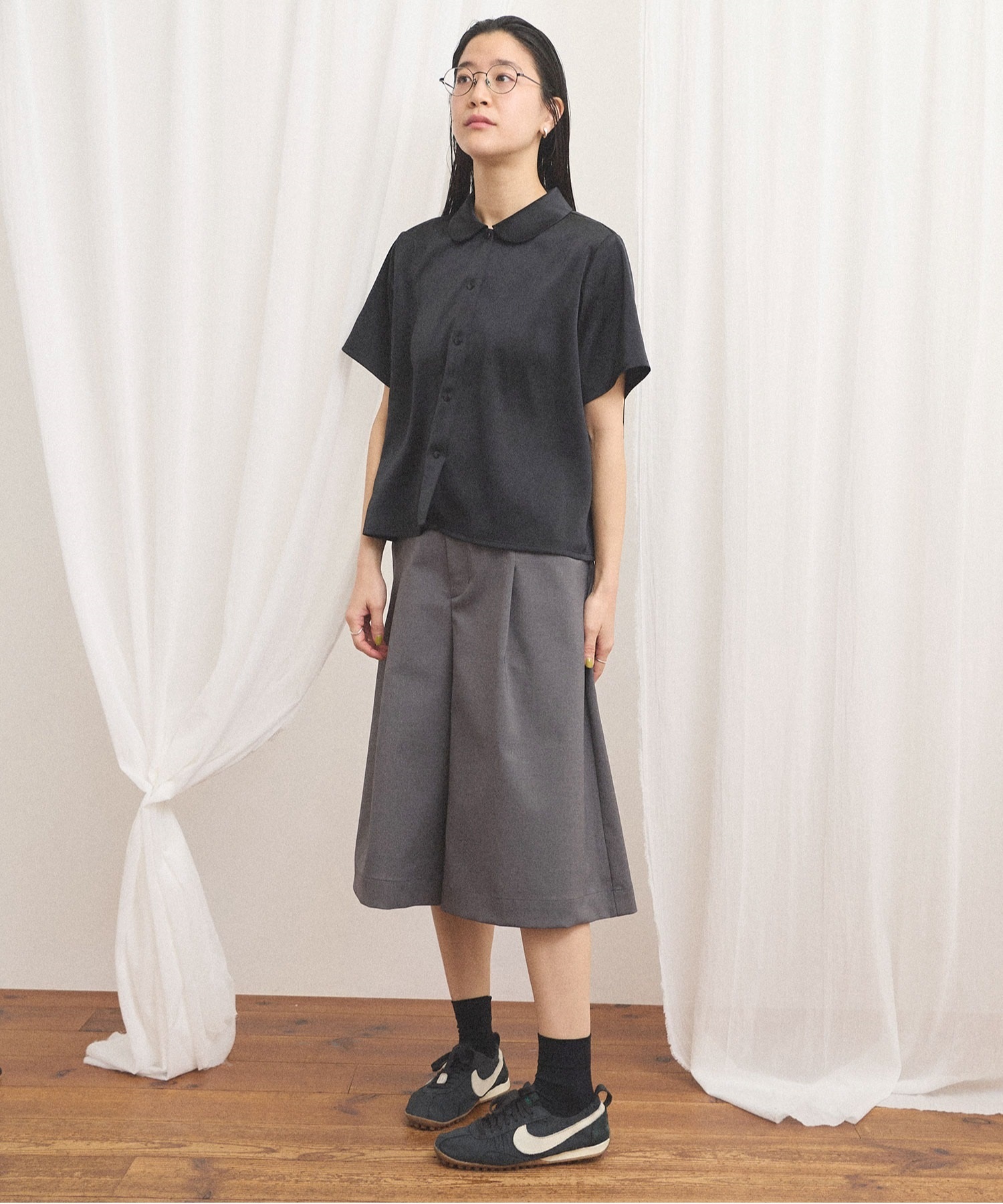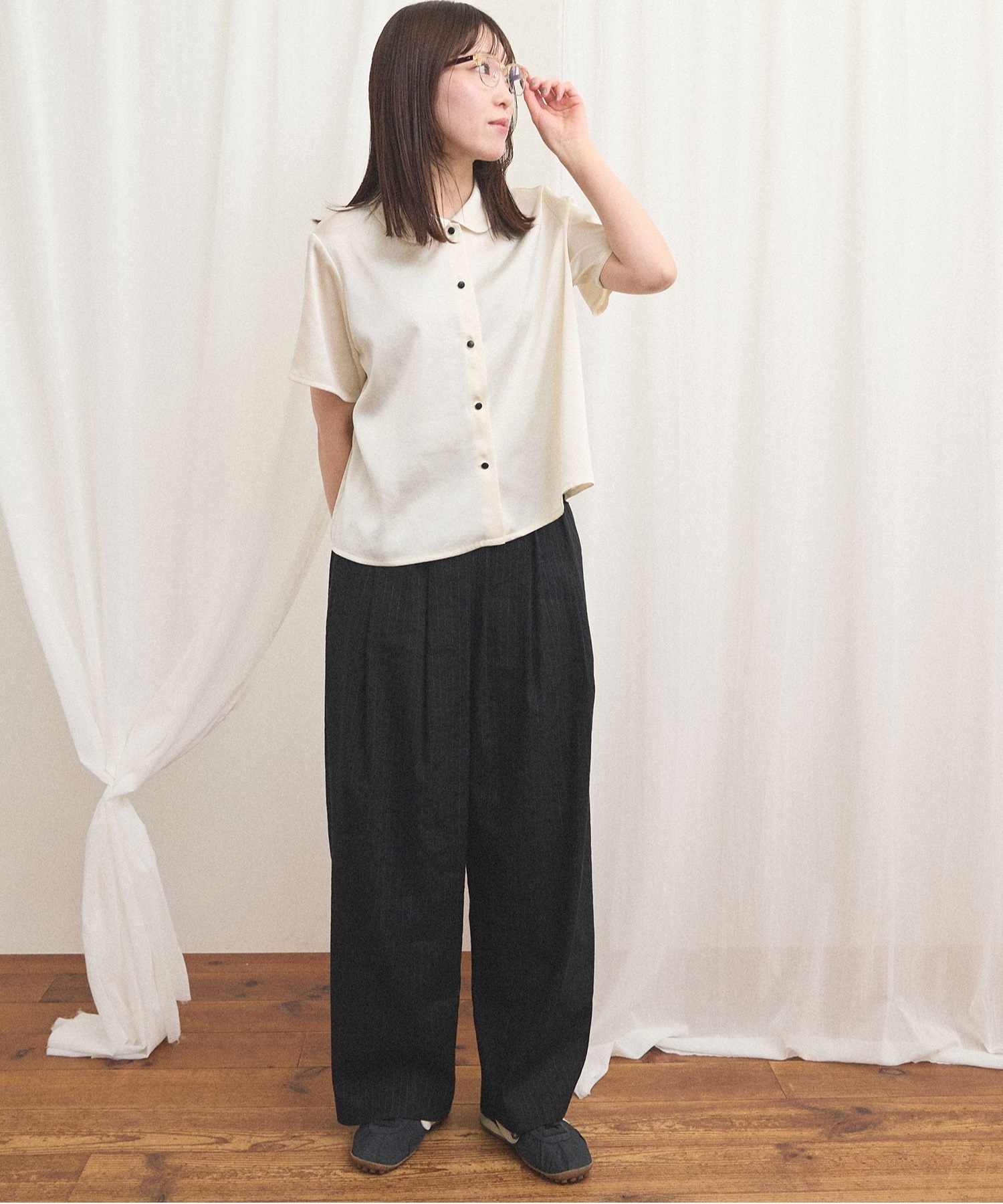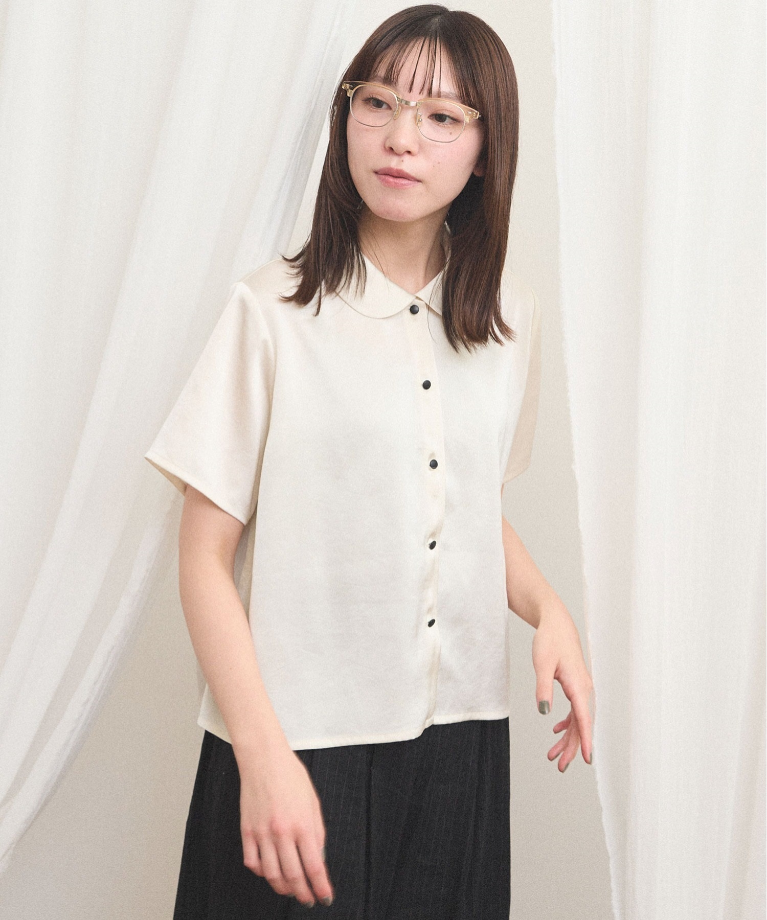 シャツとブラウスの間のような雰囲気で、合わせるボトム次第でメンズライクにも可愛らしいイメージにも。