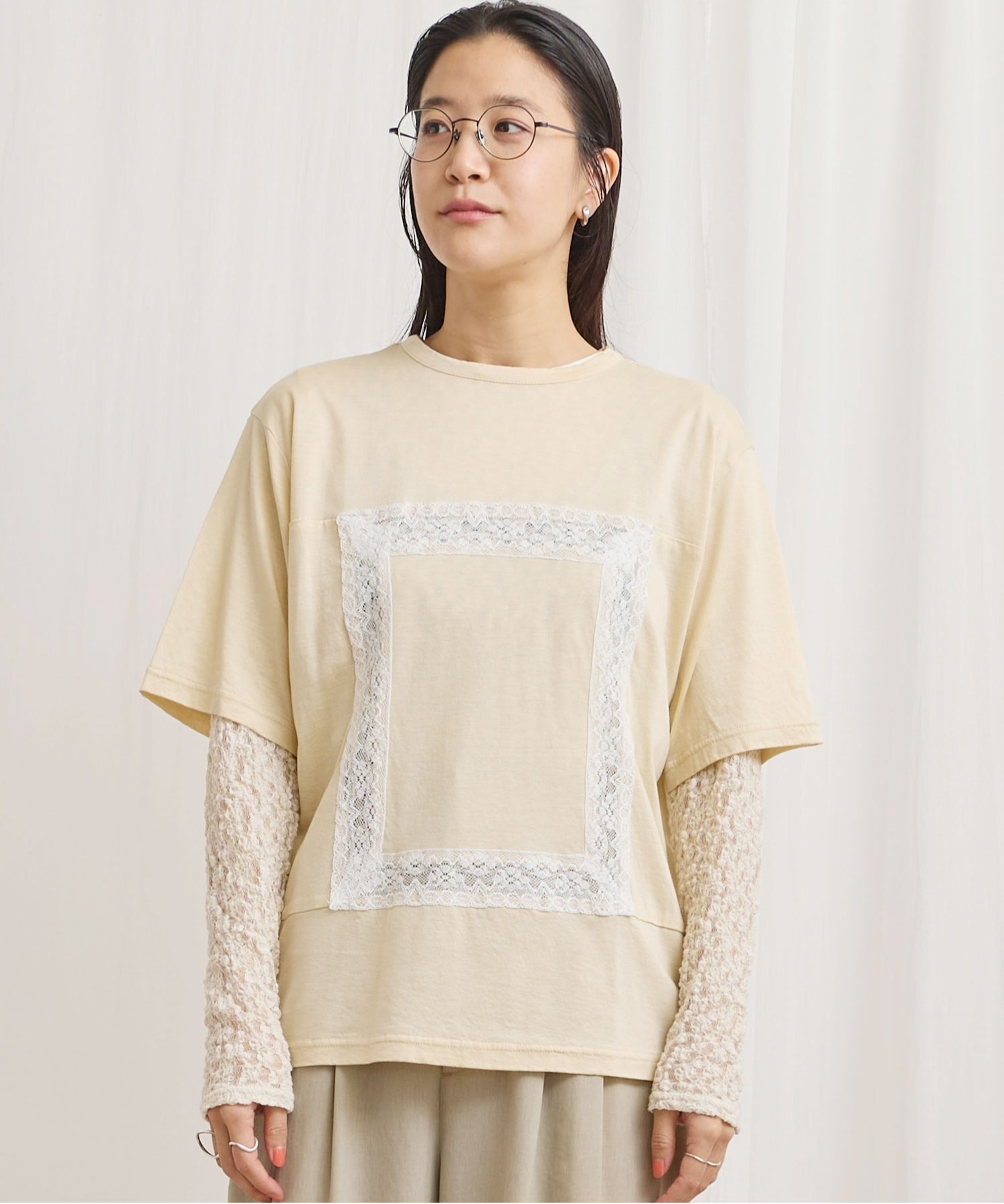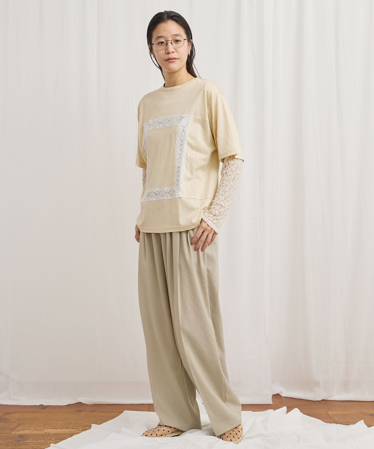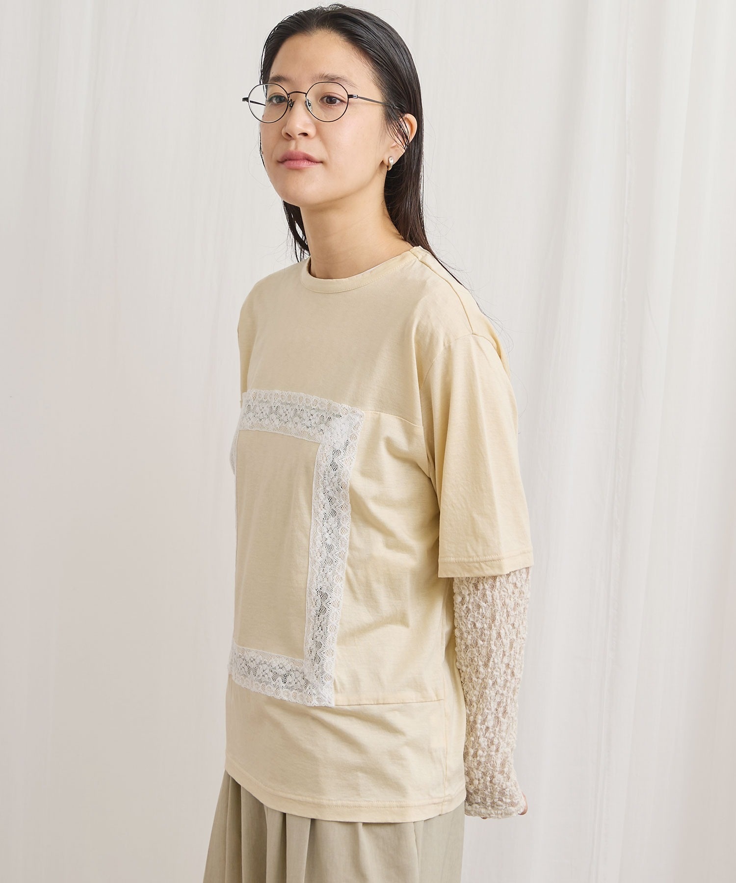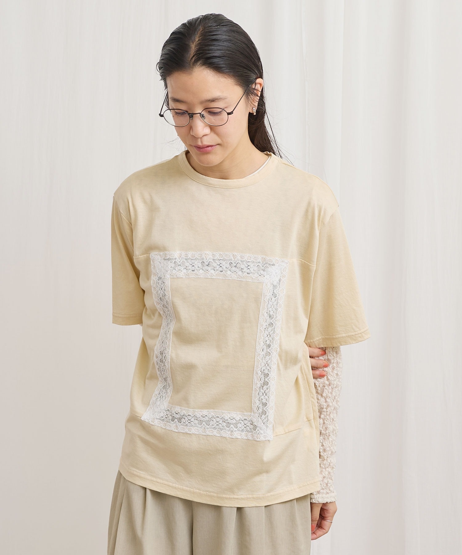 レースの部分は透けさせており、カジュアル過ぎずに着ていただけます。