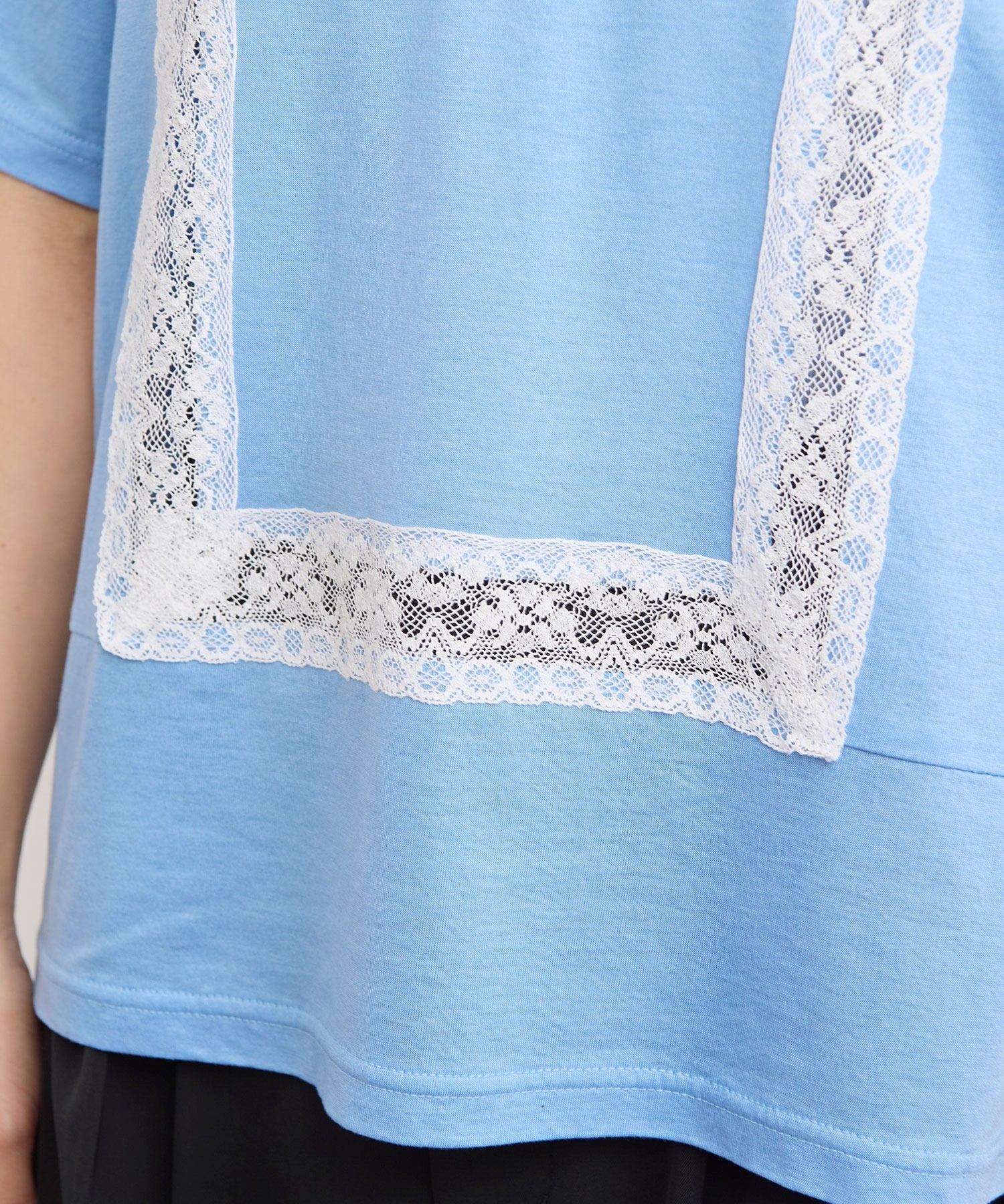 レースの切り替えを施したつるりとした素材のTシャツ。
