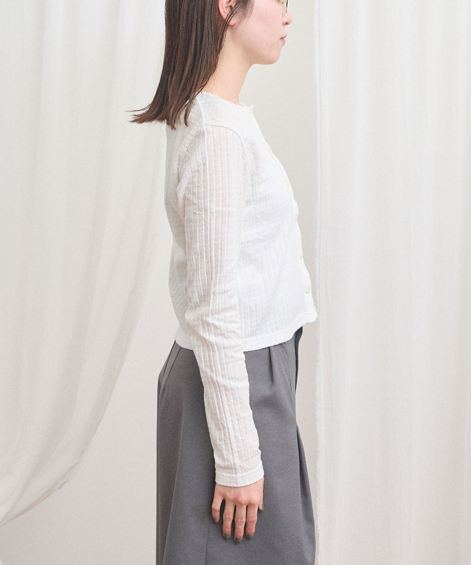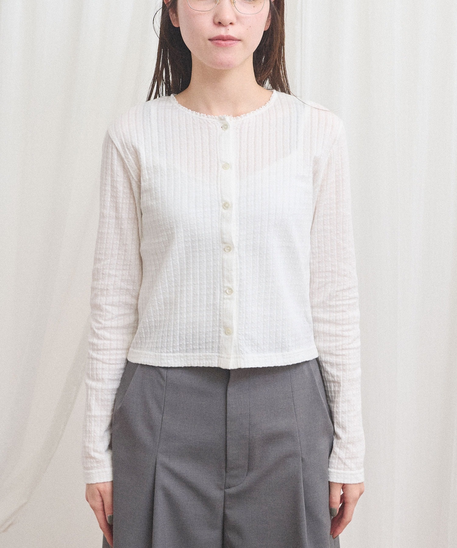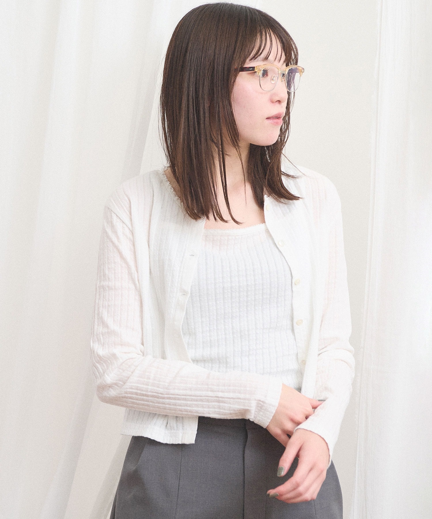 カーディガンはやや短めの丈で羽織りとしても、
