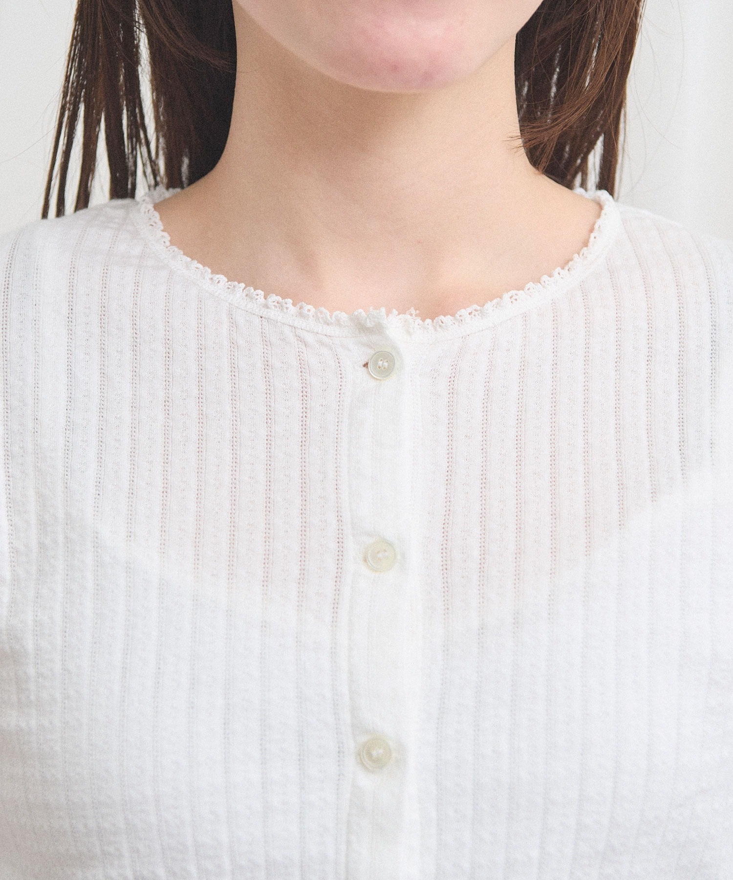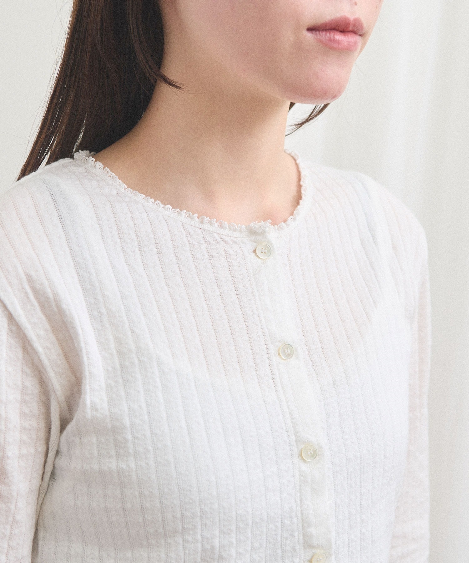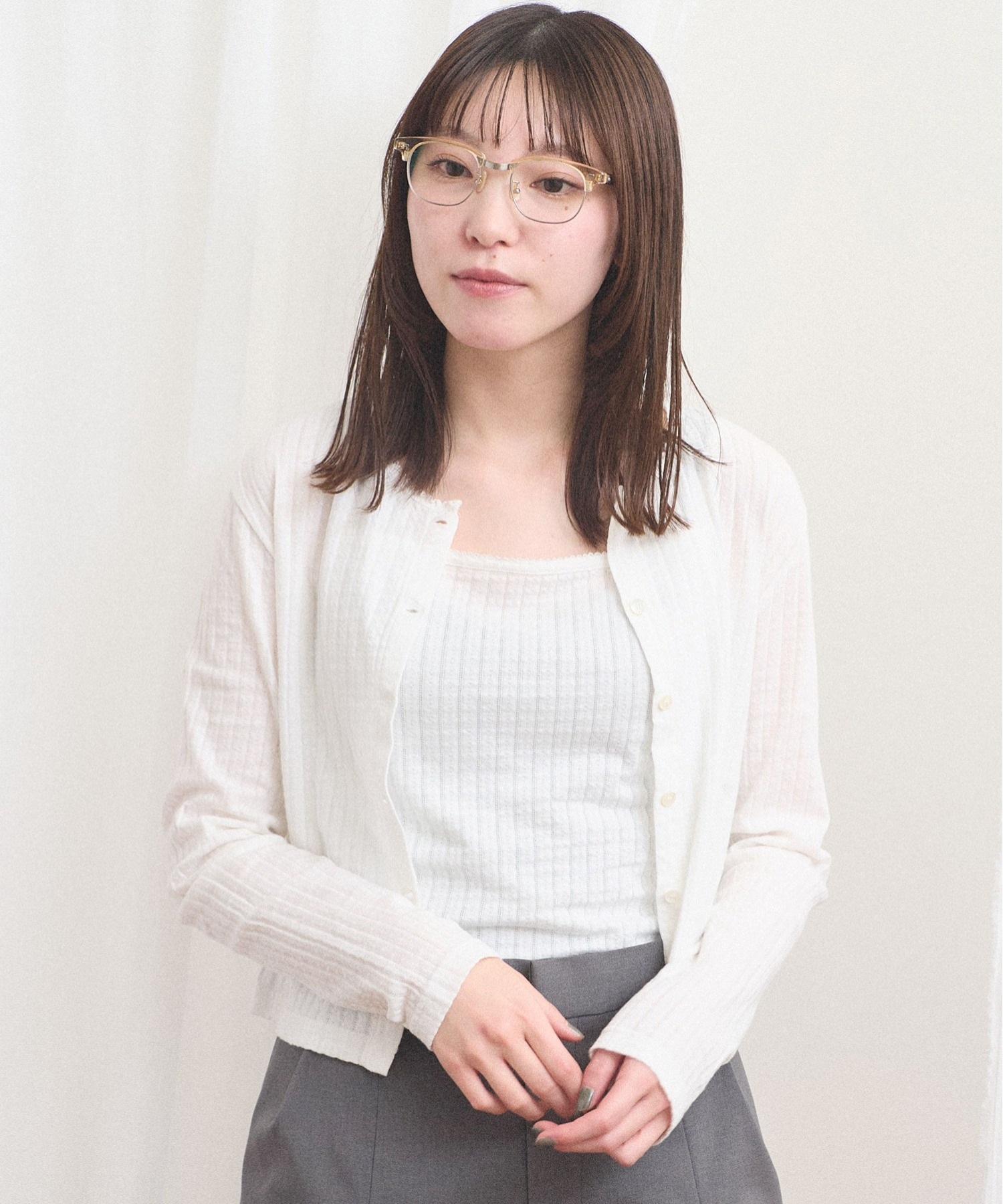 カーディガンはやや短めの丈で羽織りとしても、