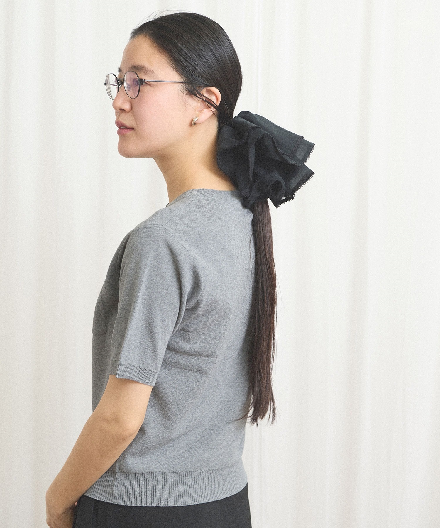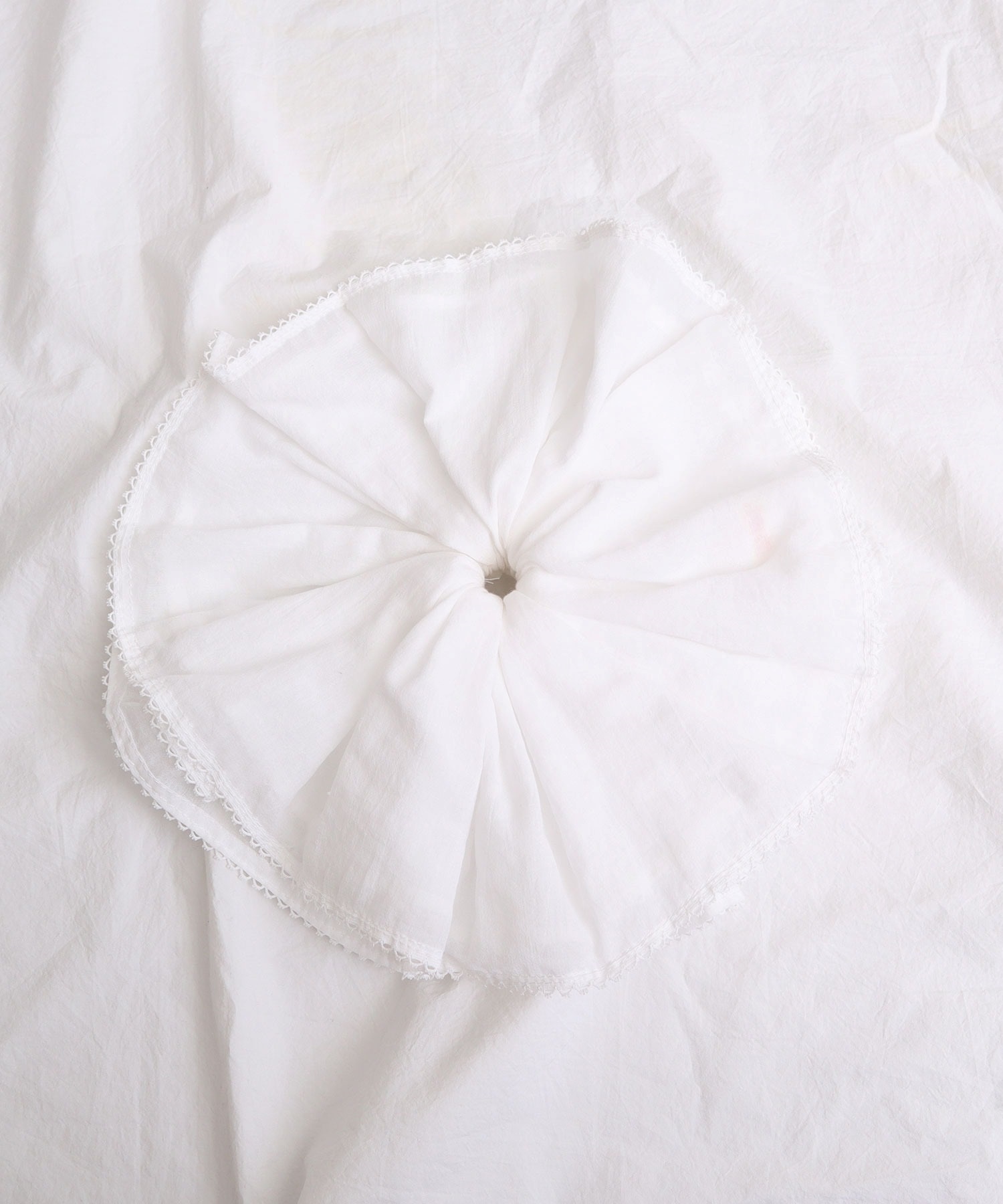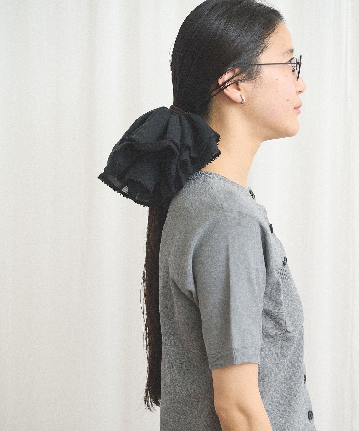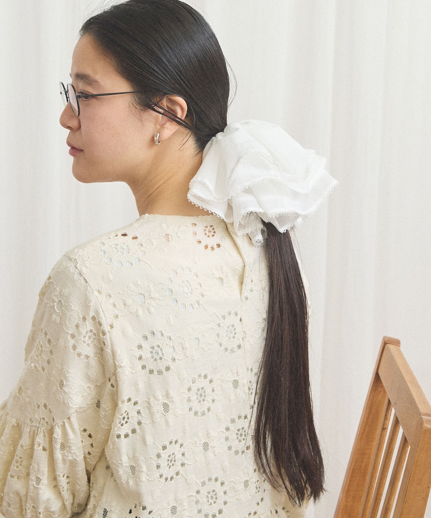 先にゴムで結んでいただくか、おだんごにした髪にはめるだけのシュシュ。