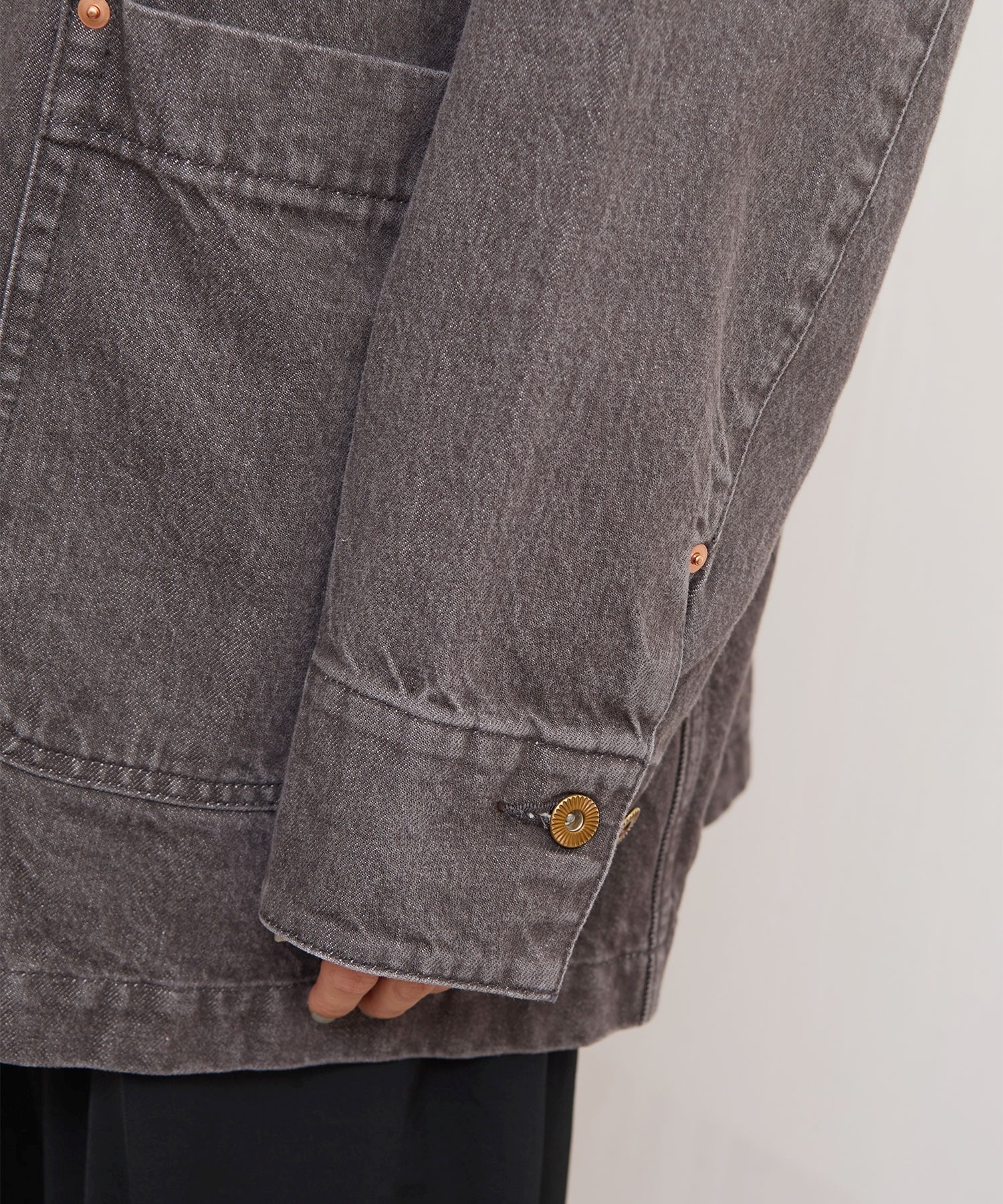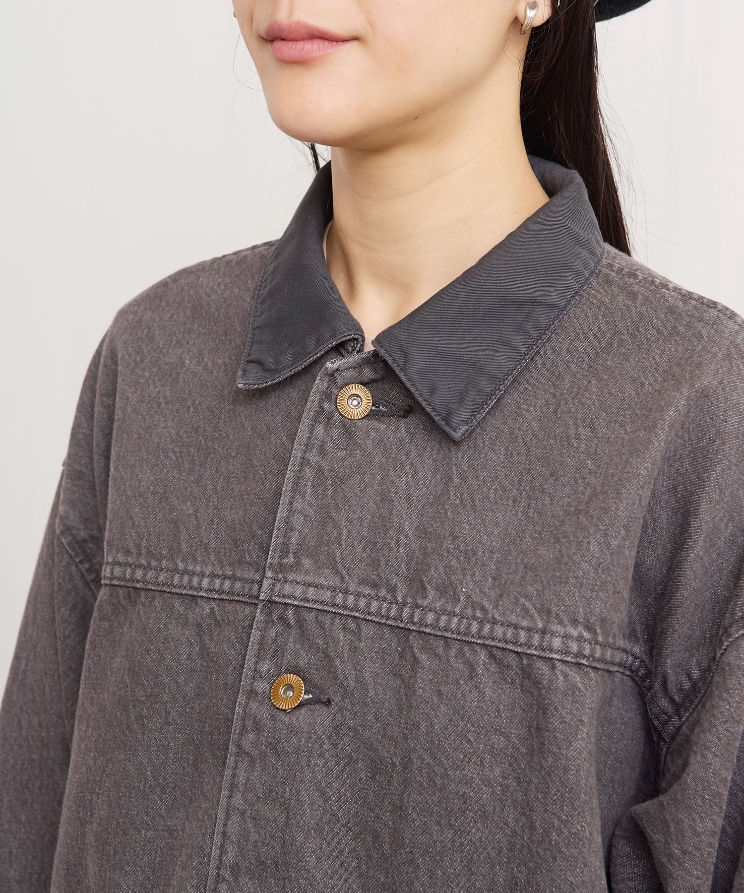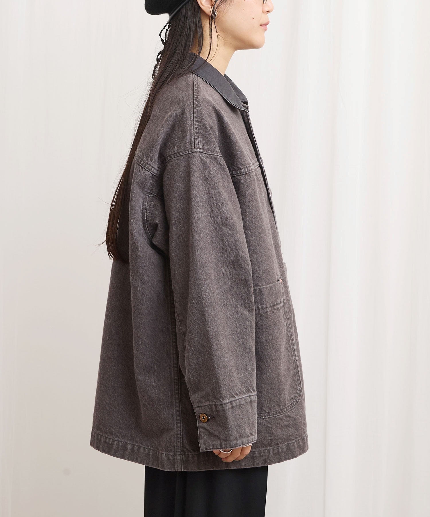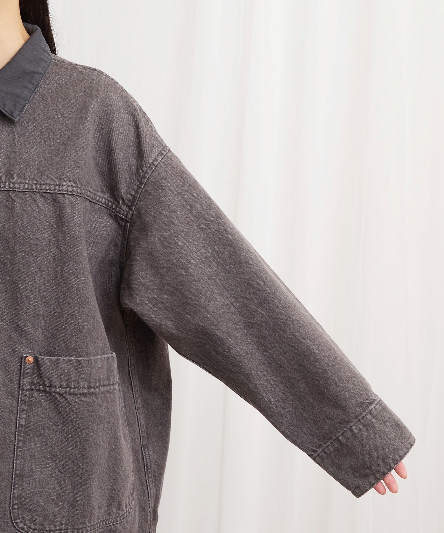 ワークウェア要素のあるアイテムをニュアンスのあるカラーデニムで仕立てたカバーオール。