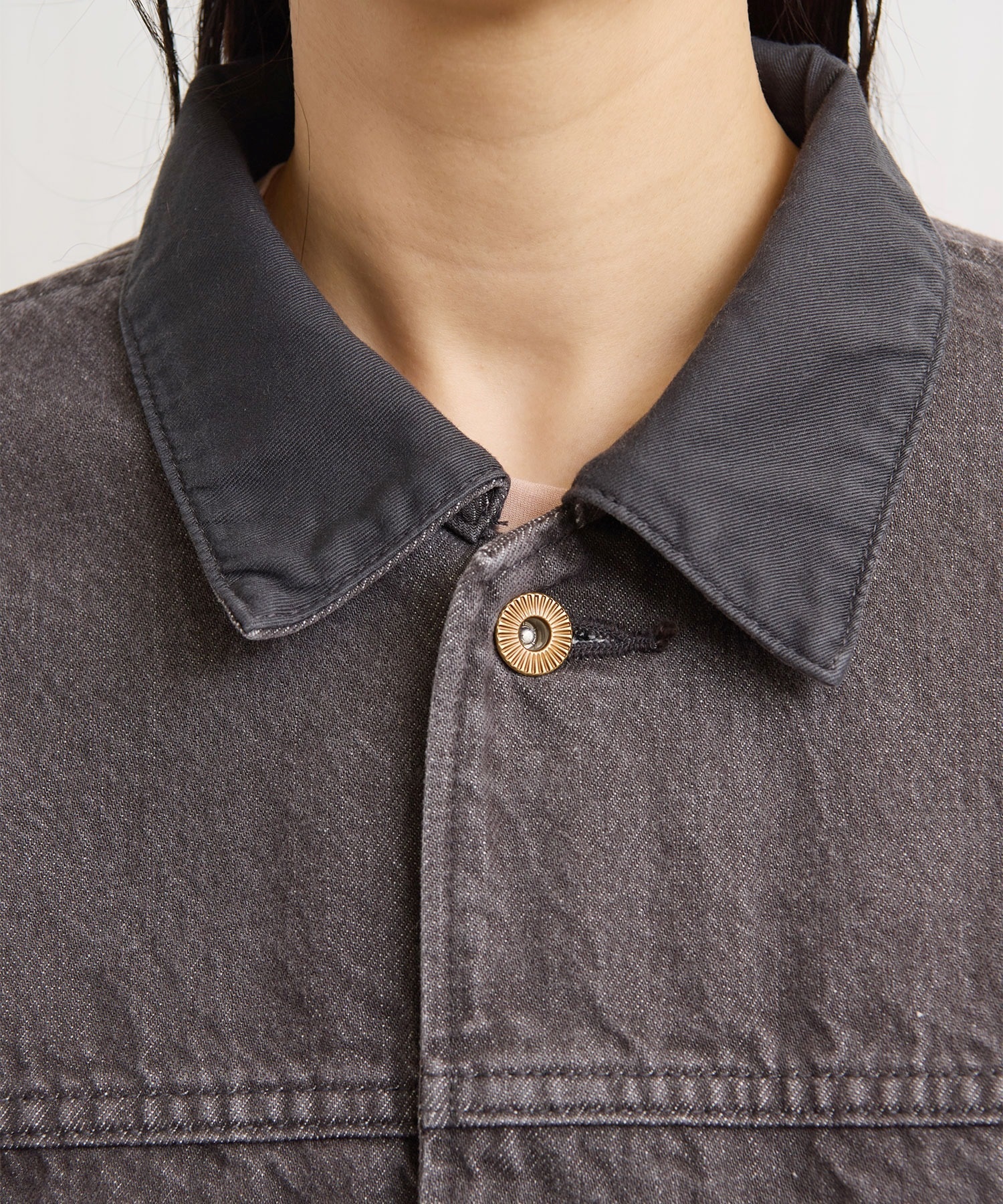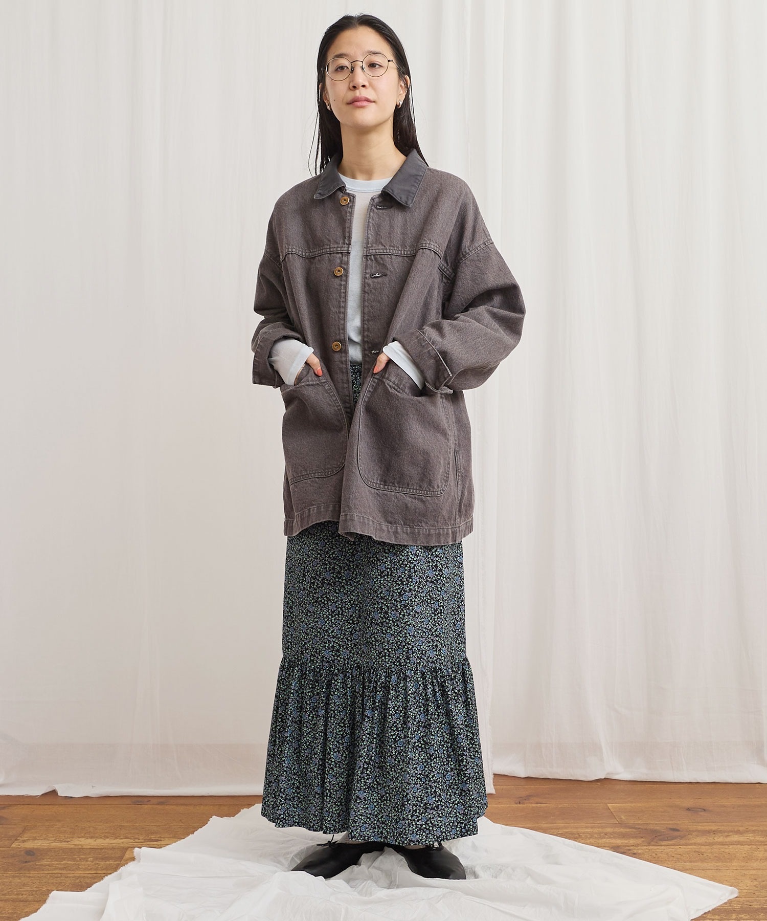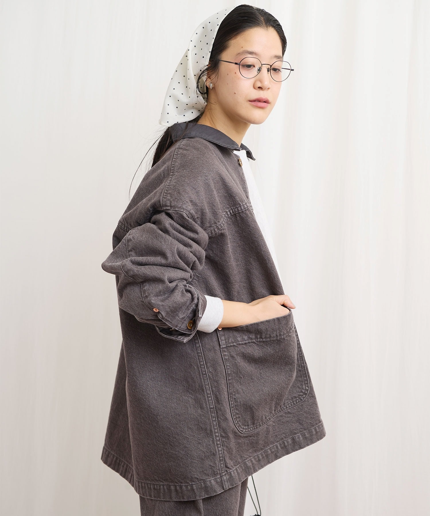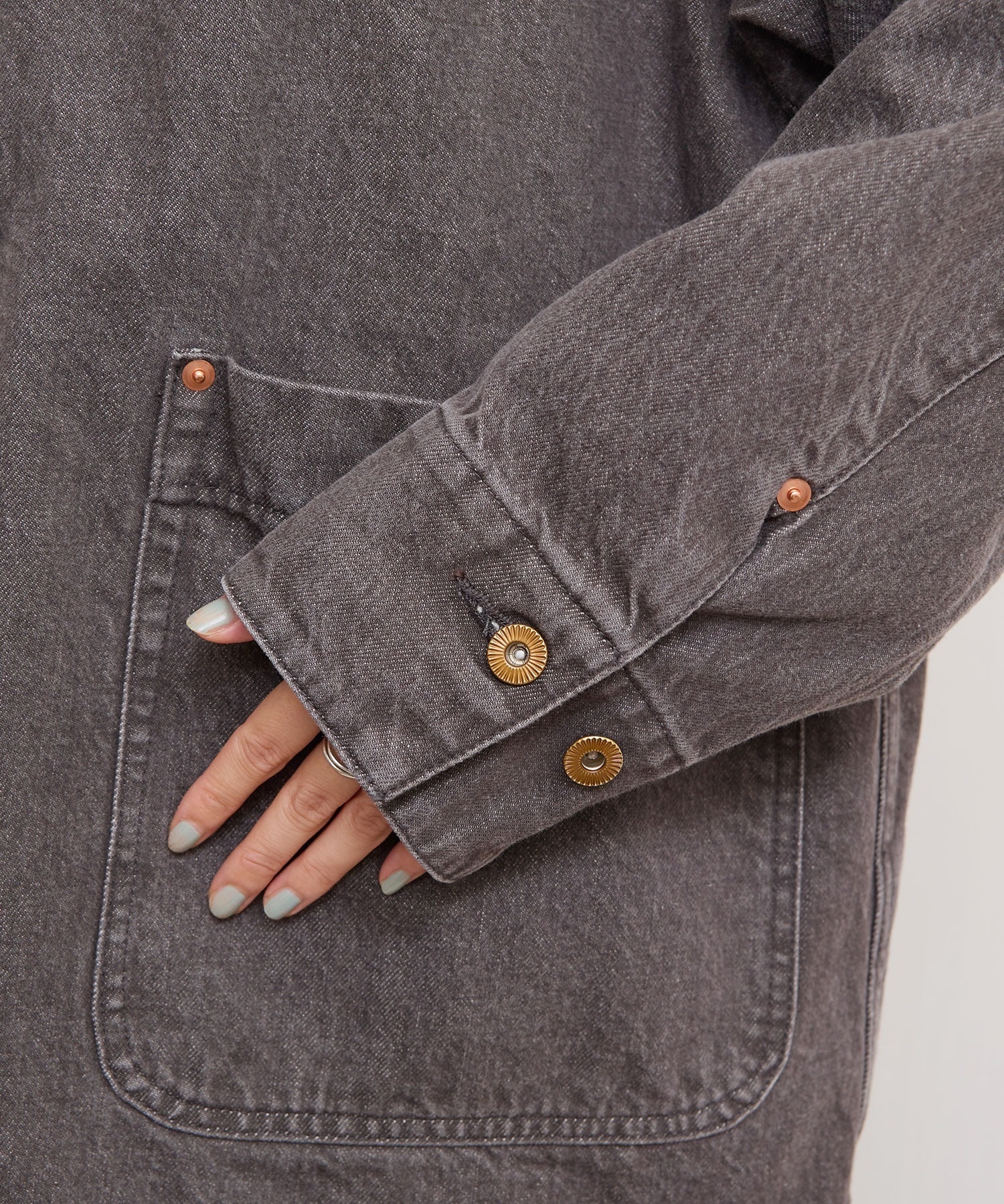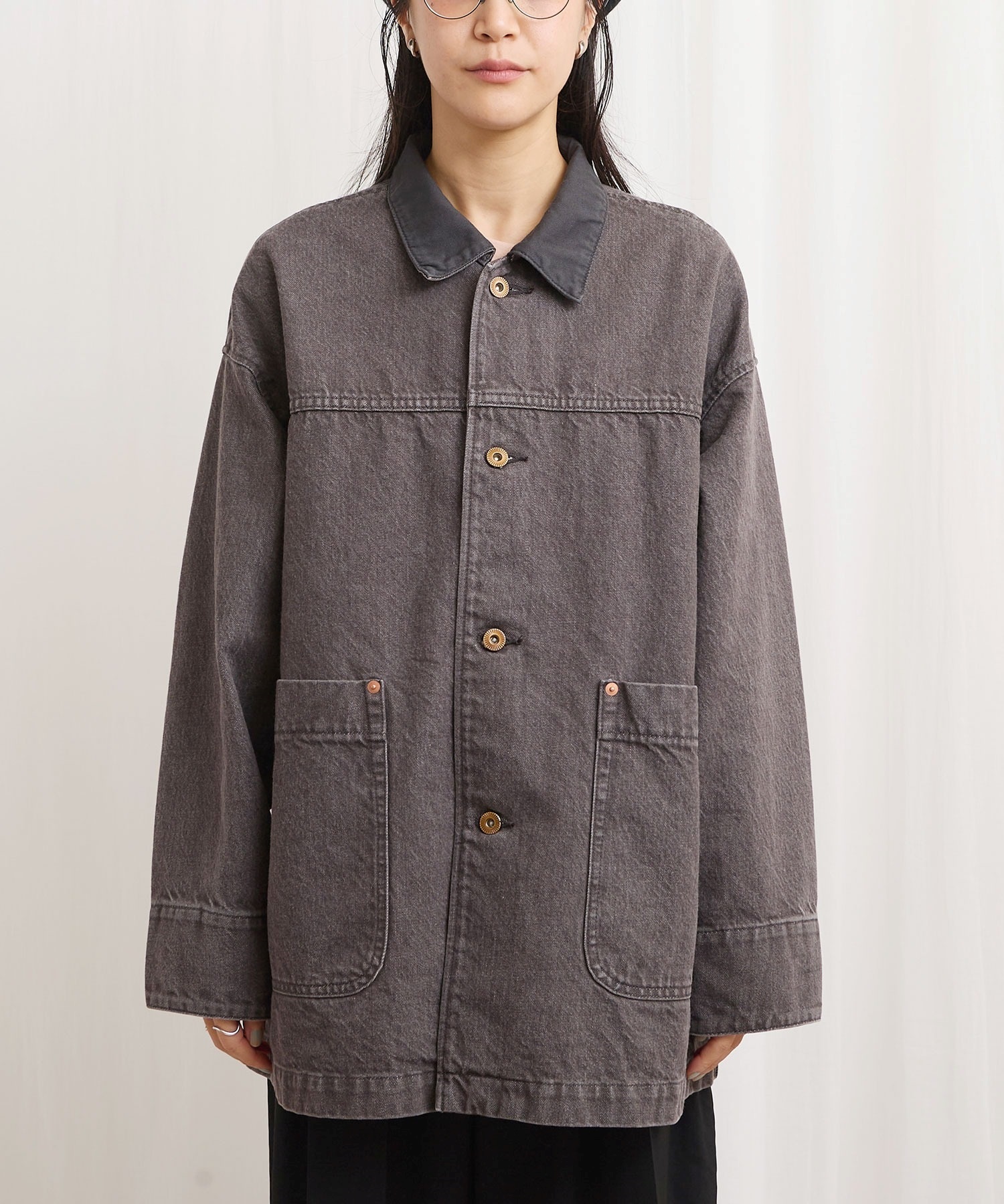 ワークウェア要素のあるアイテムをニュアンスのあるカラーデニムで仕立てたカバーオール。