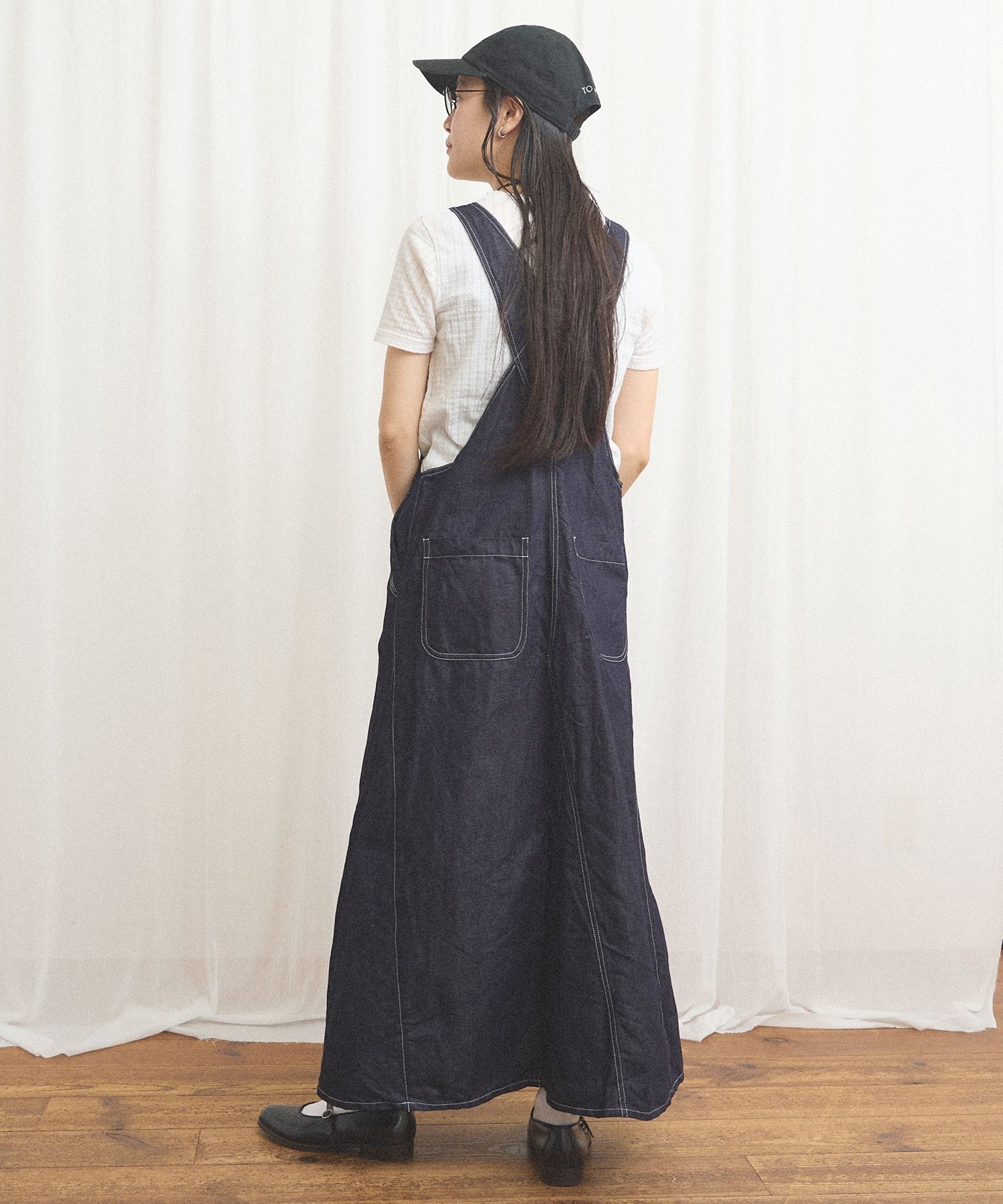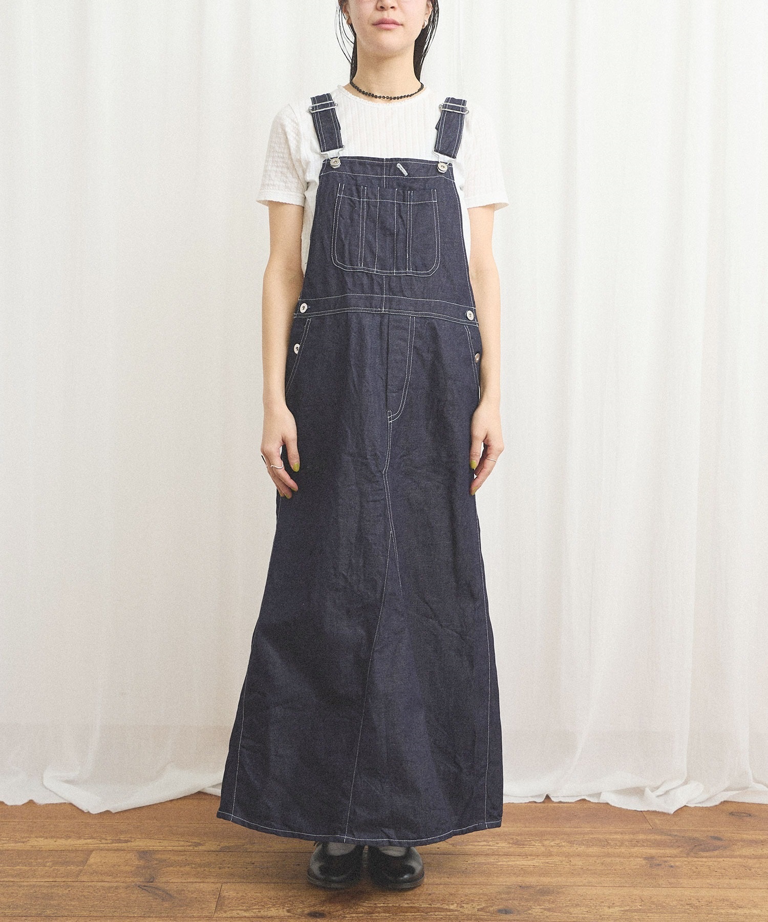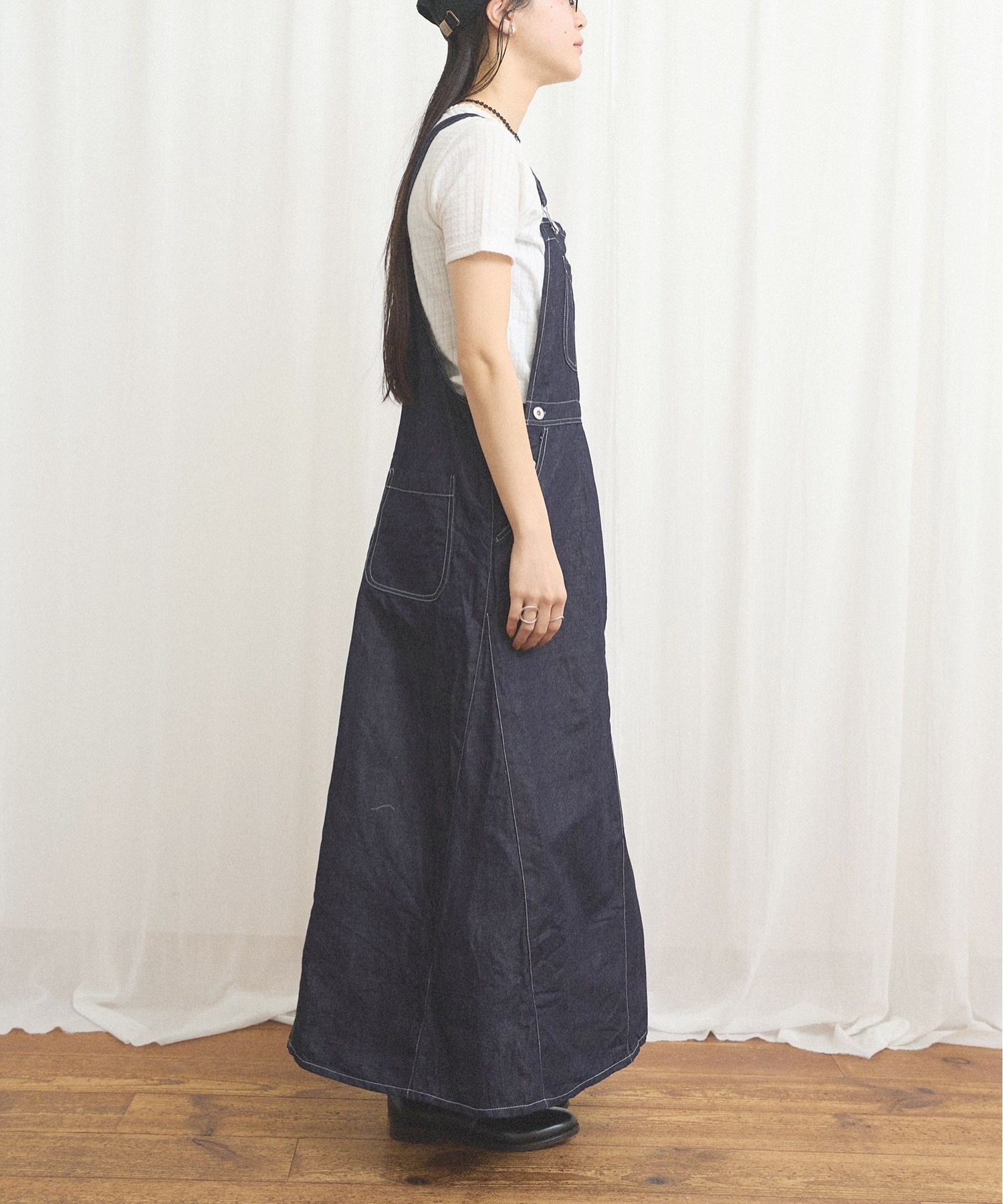 ばさりとした質感を感じられるコットンリネンデニムを使ったジャンパースカート。