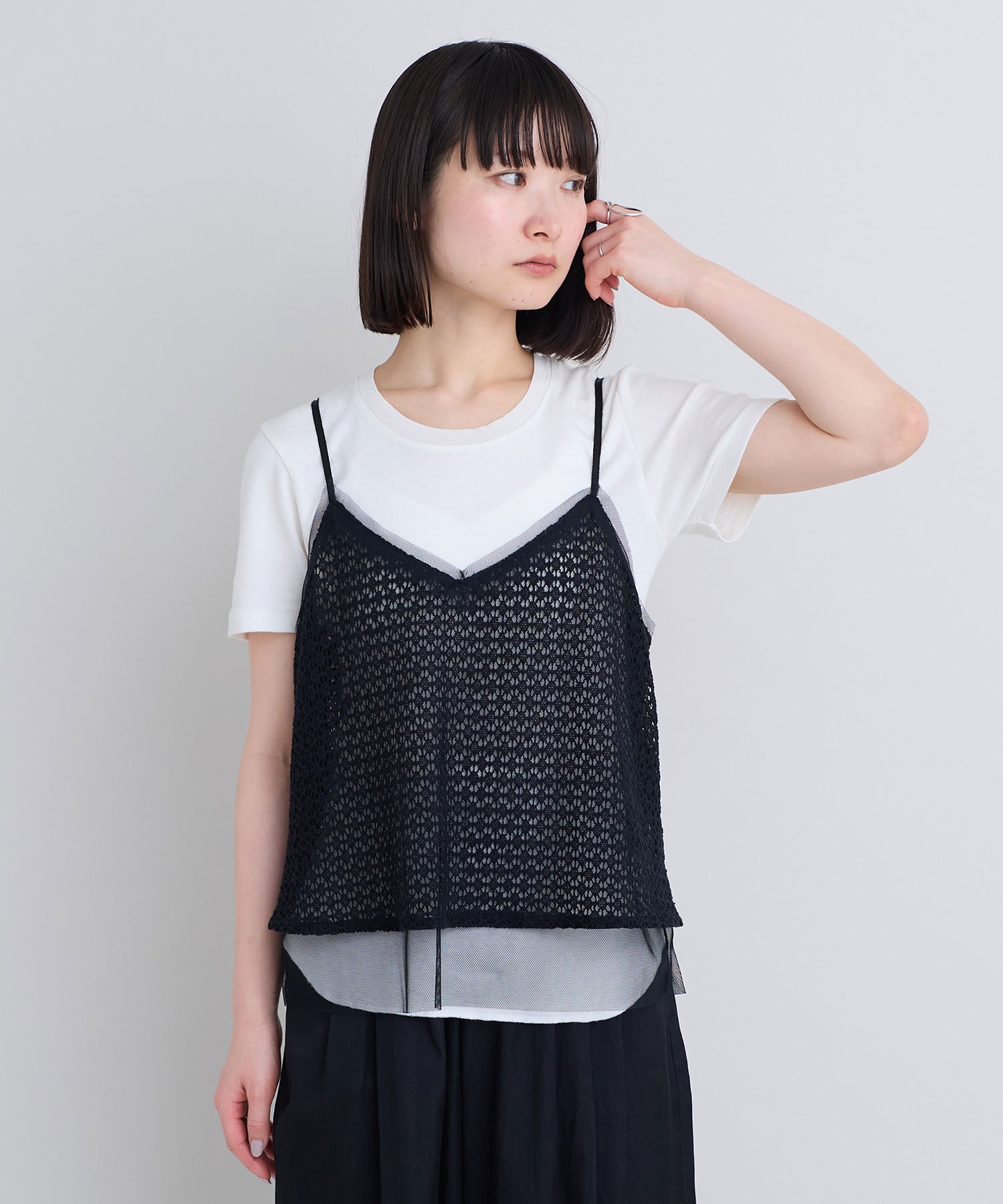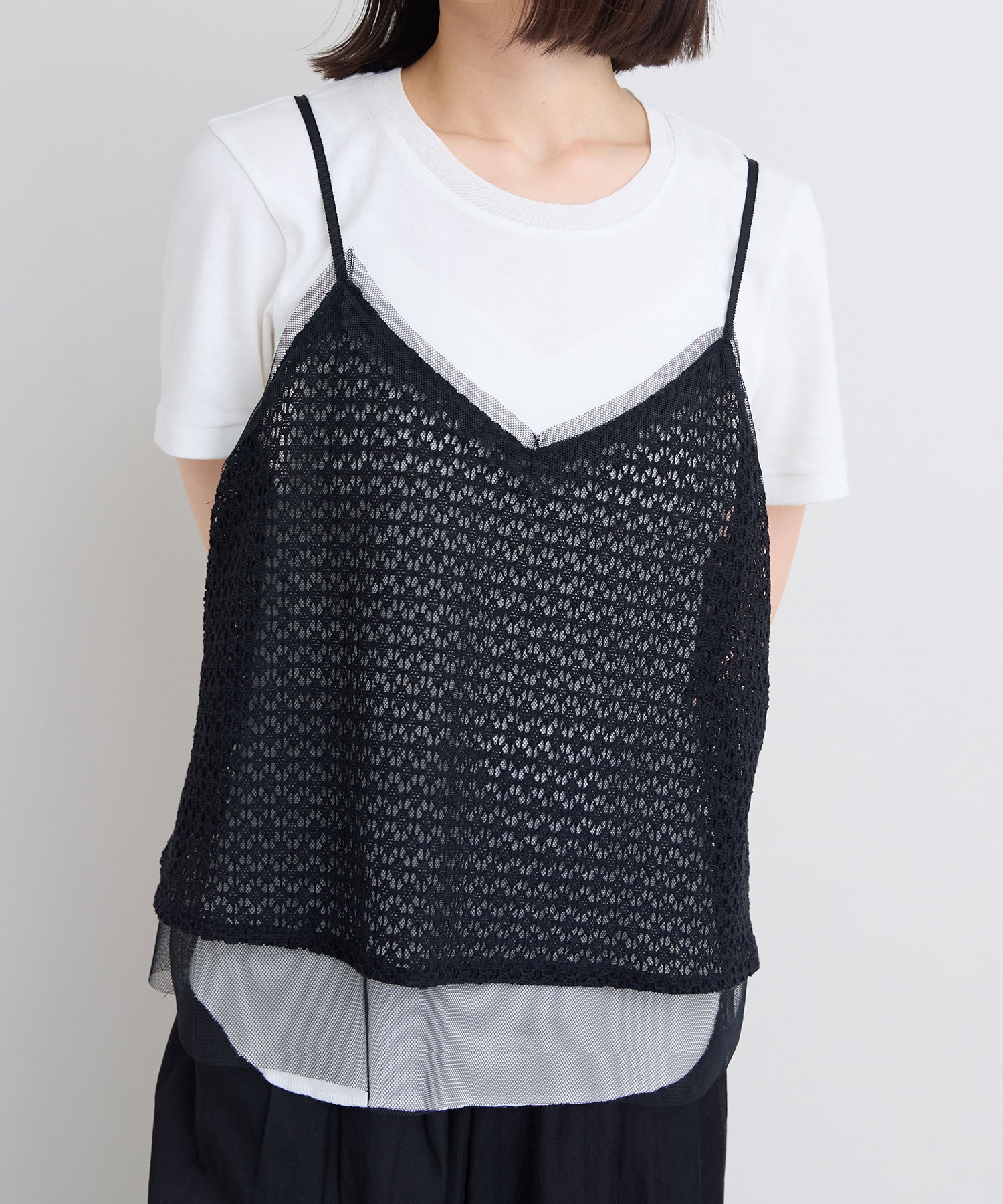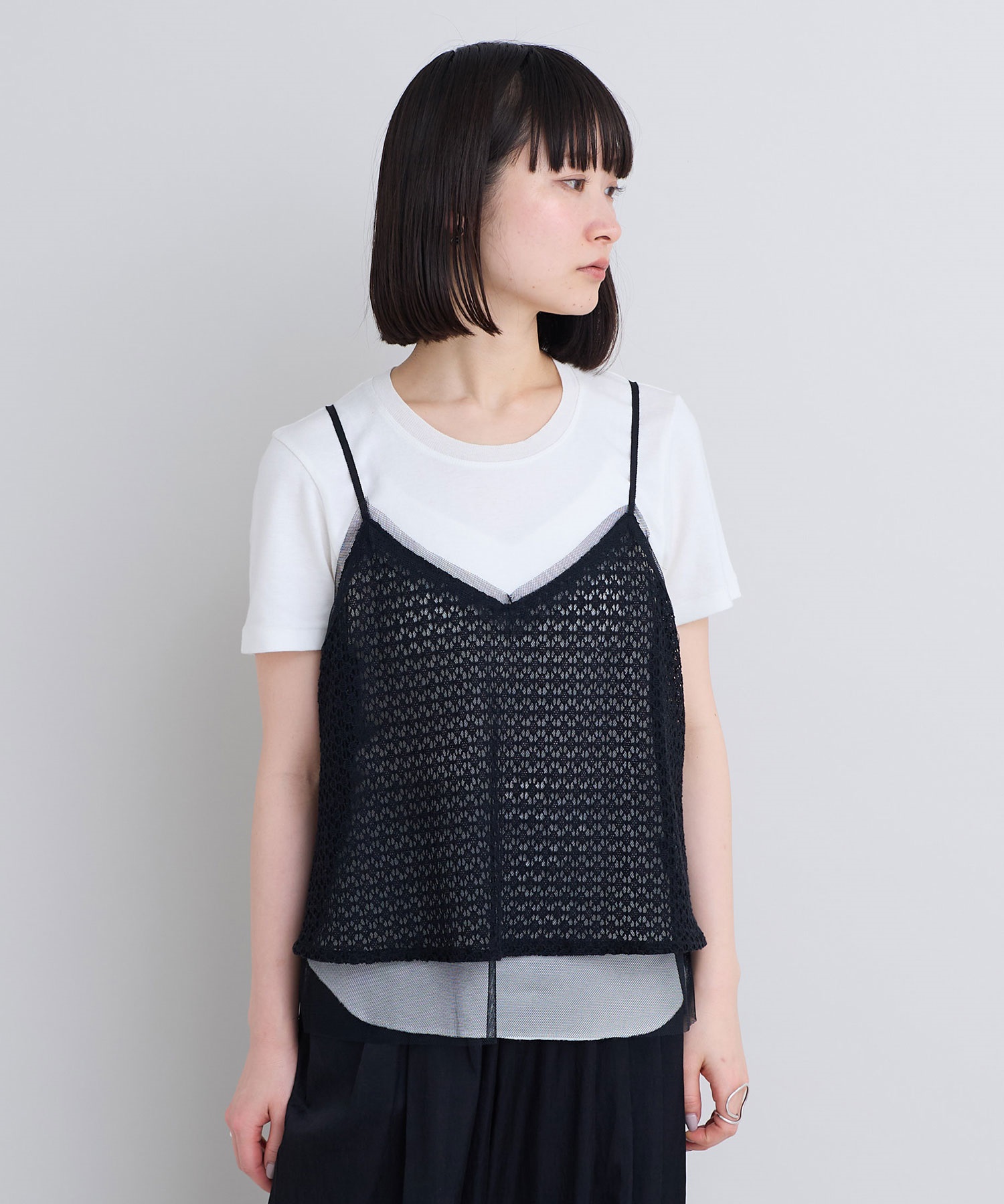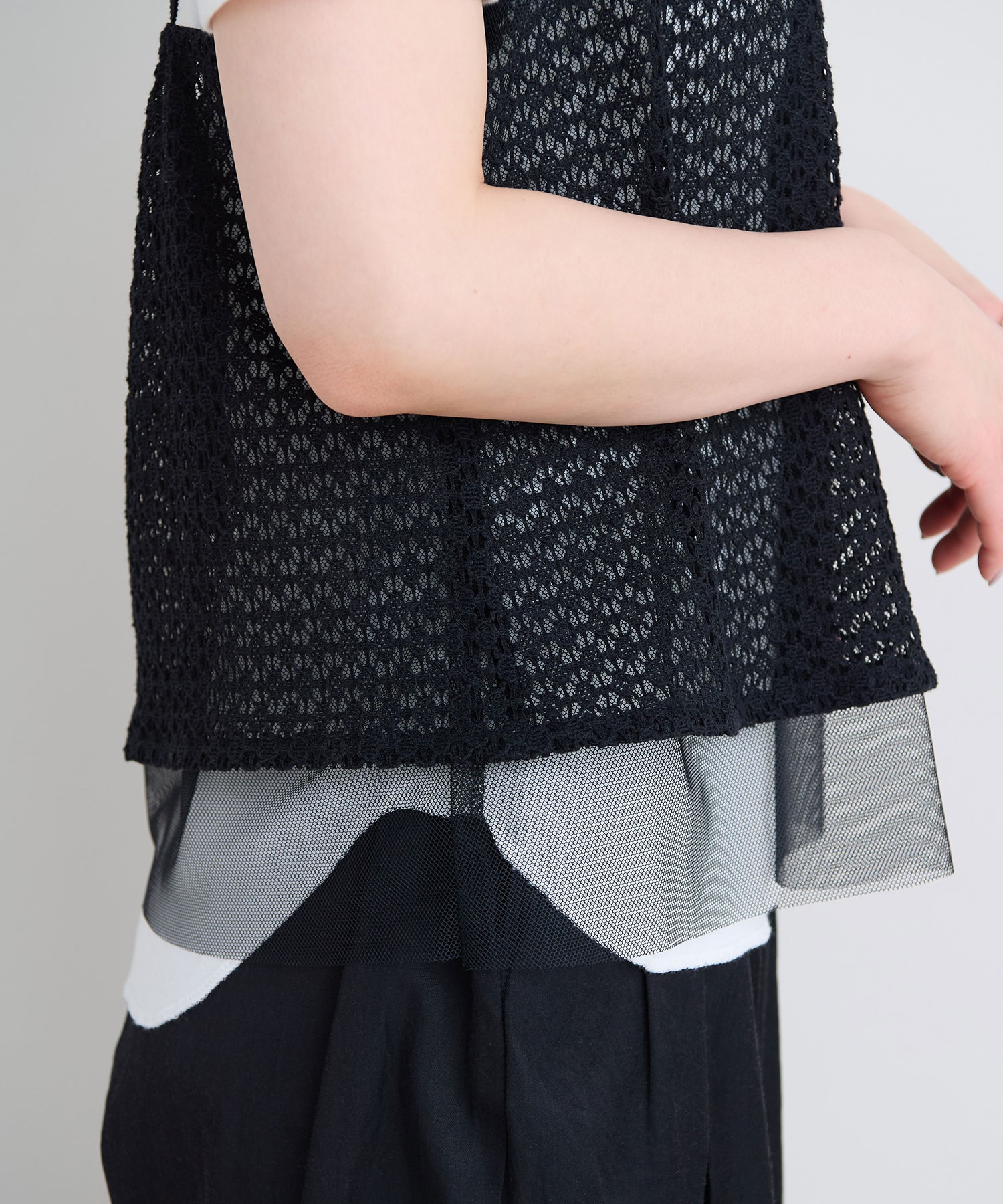 レース×チュールの透け感ある素材同士をレイヤードさせた、遊び心あるアイテム。