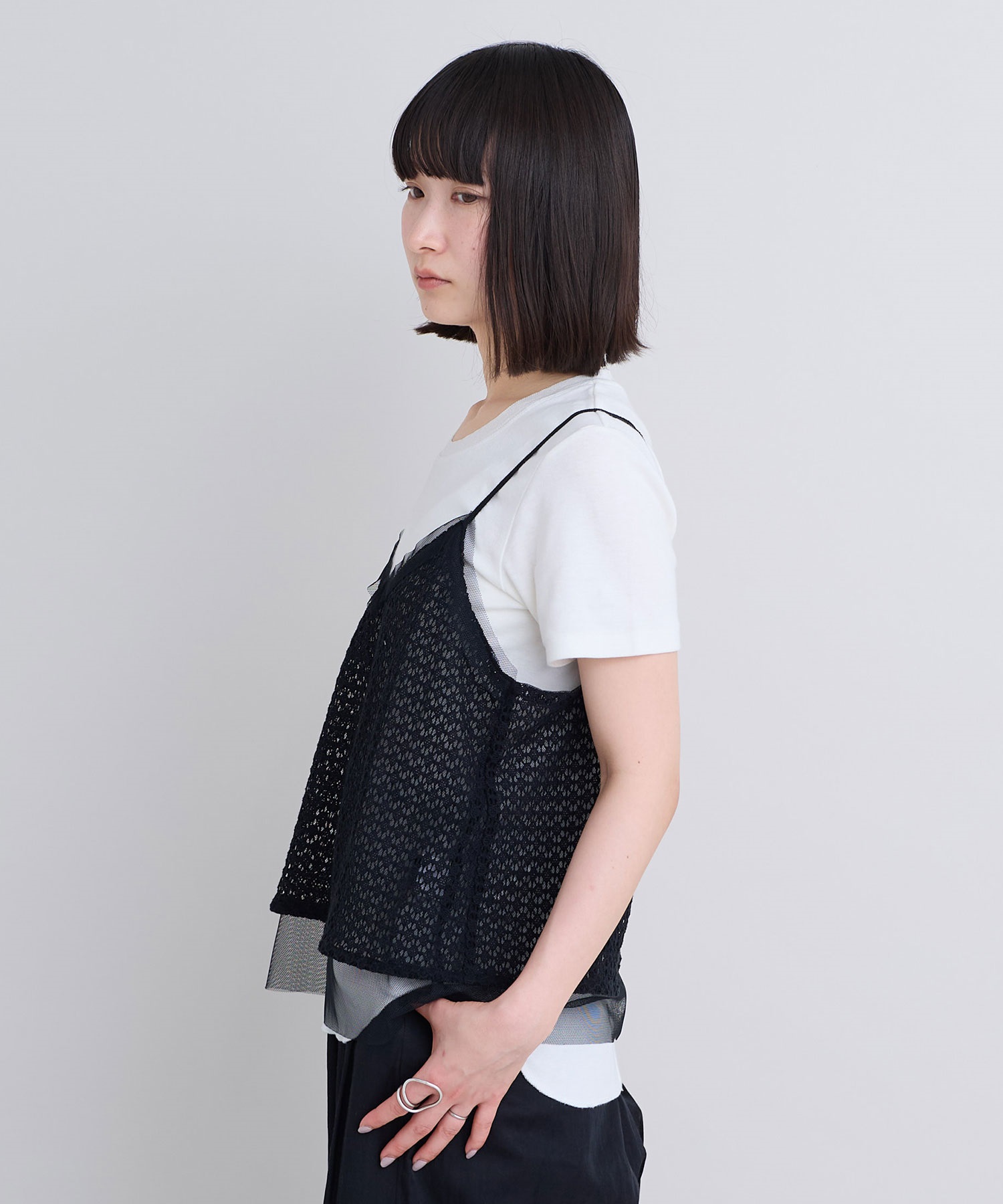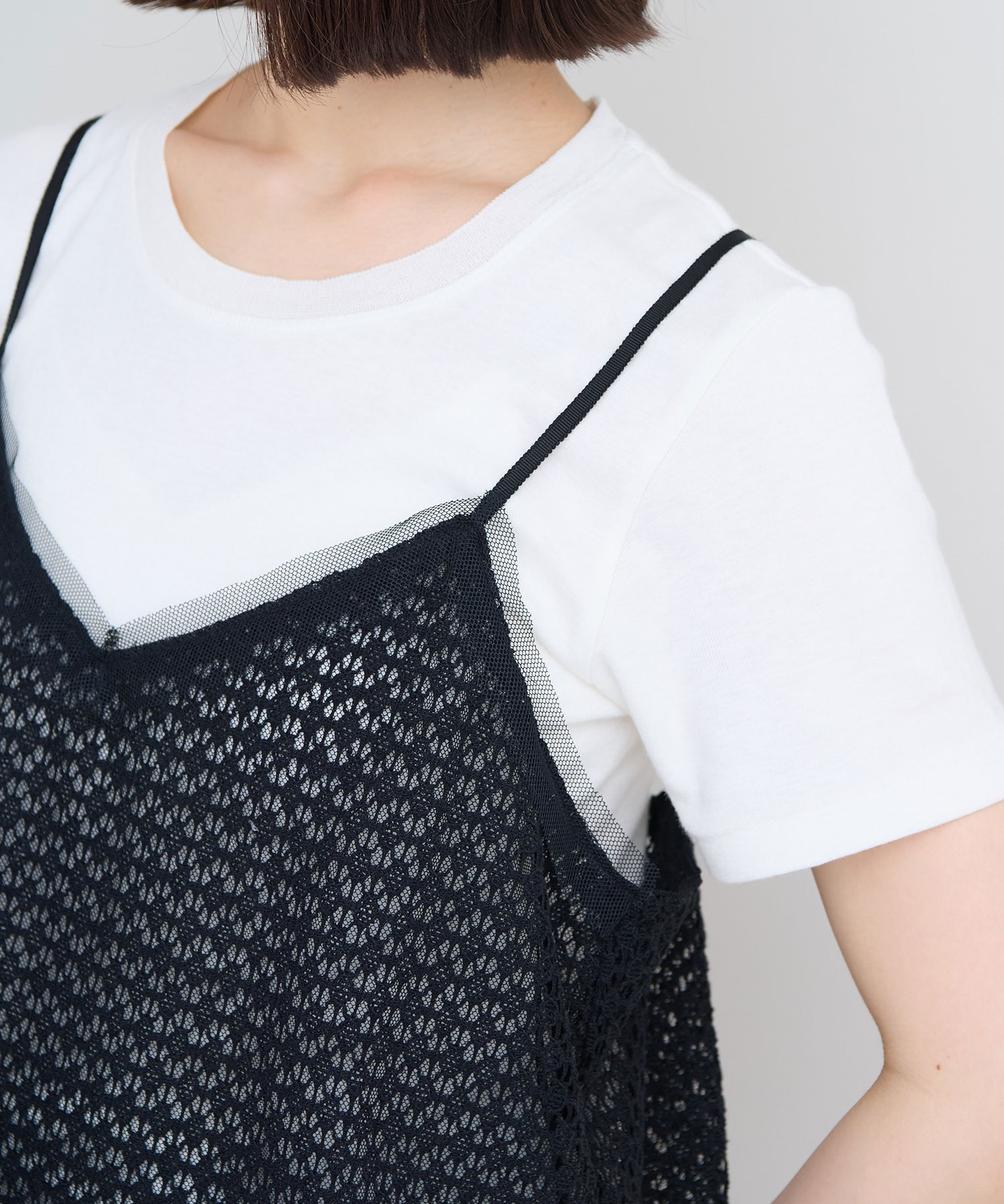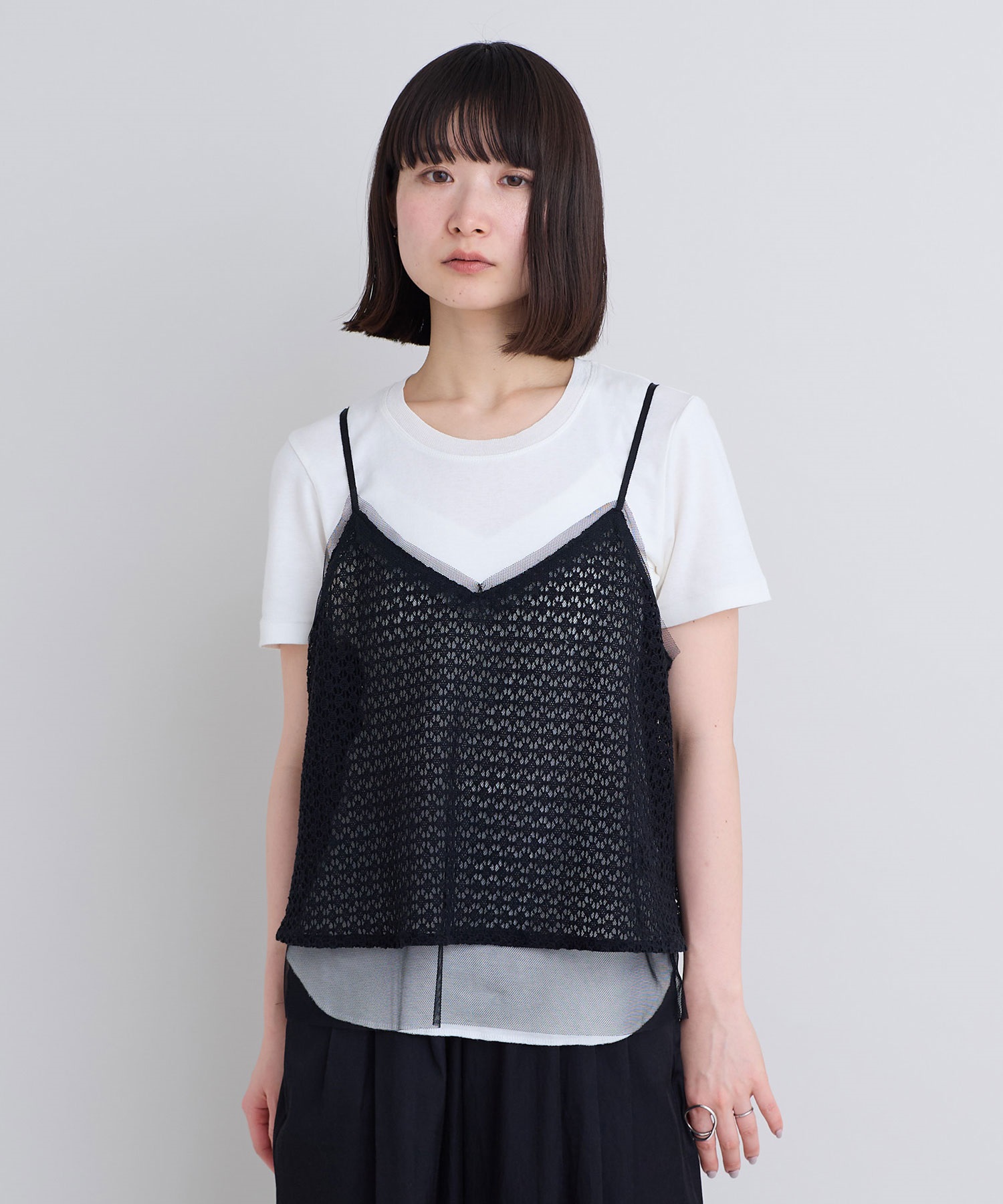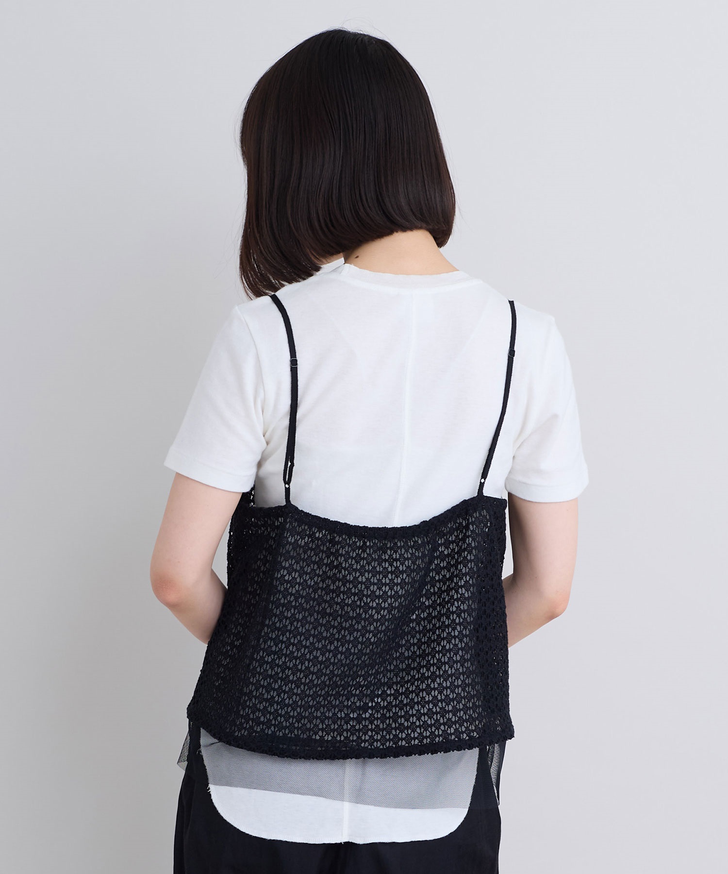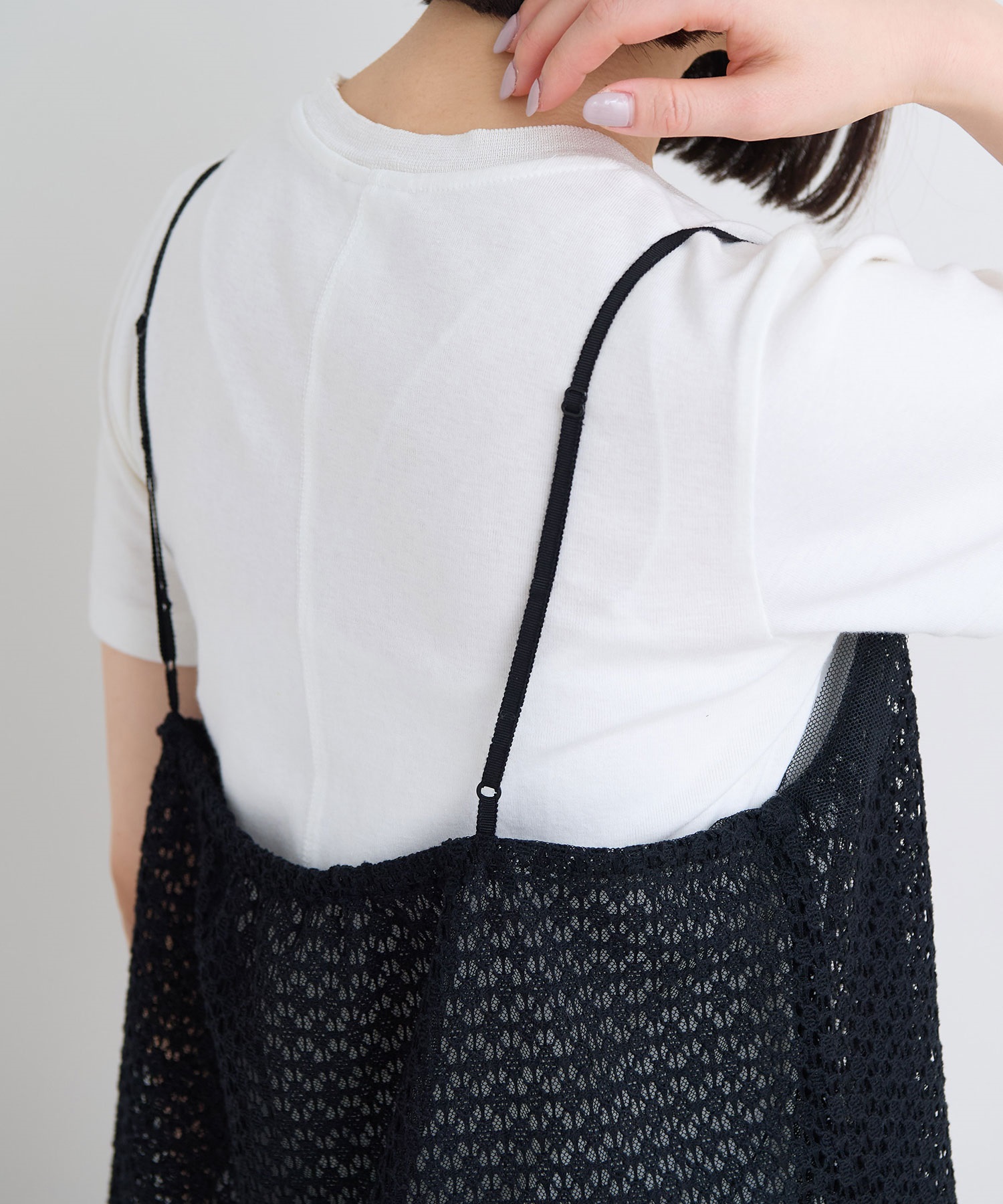 レース×チュールの透け感ある素材同士をレイヤードさせた、遊び心あるアイテム。