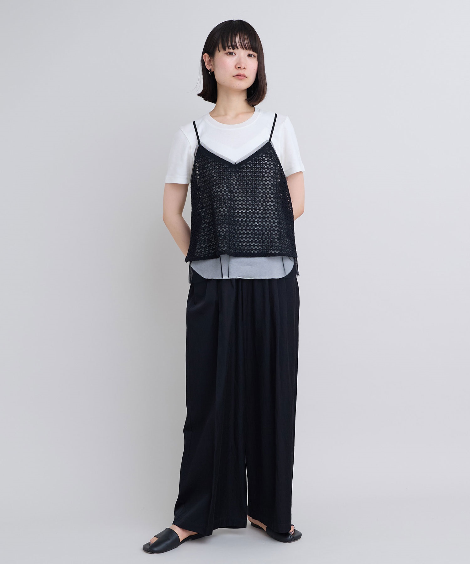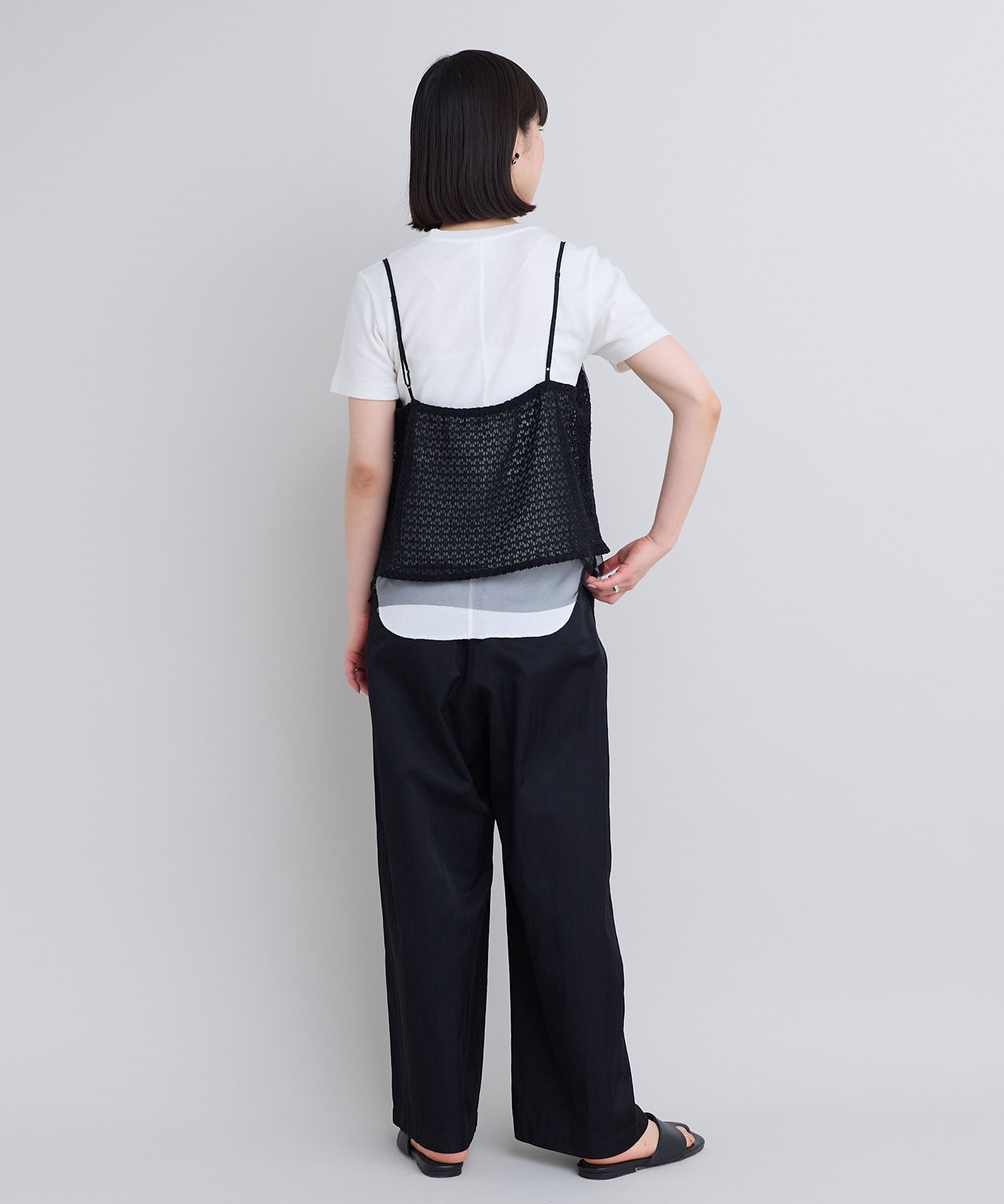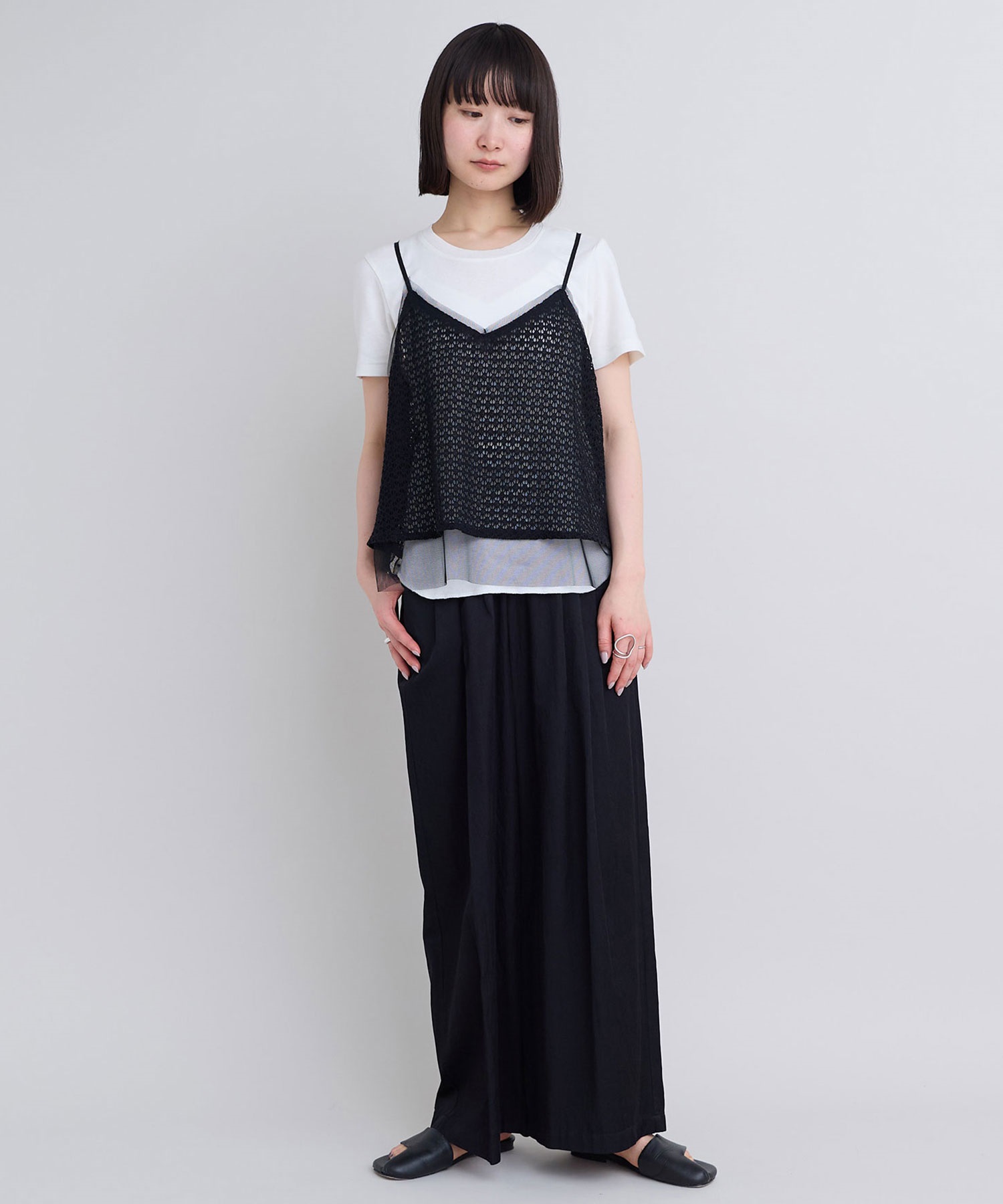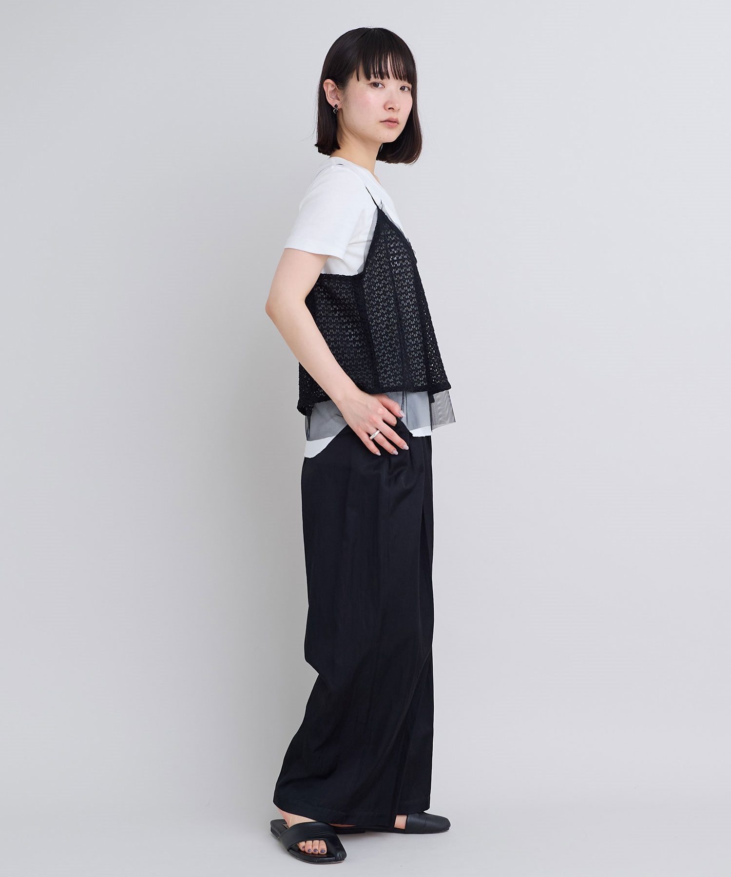 レース×チュールの透け感ある素材同士をレイヤードさせた、遊び心あるアイテム。