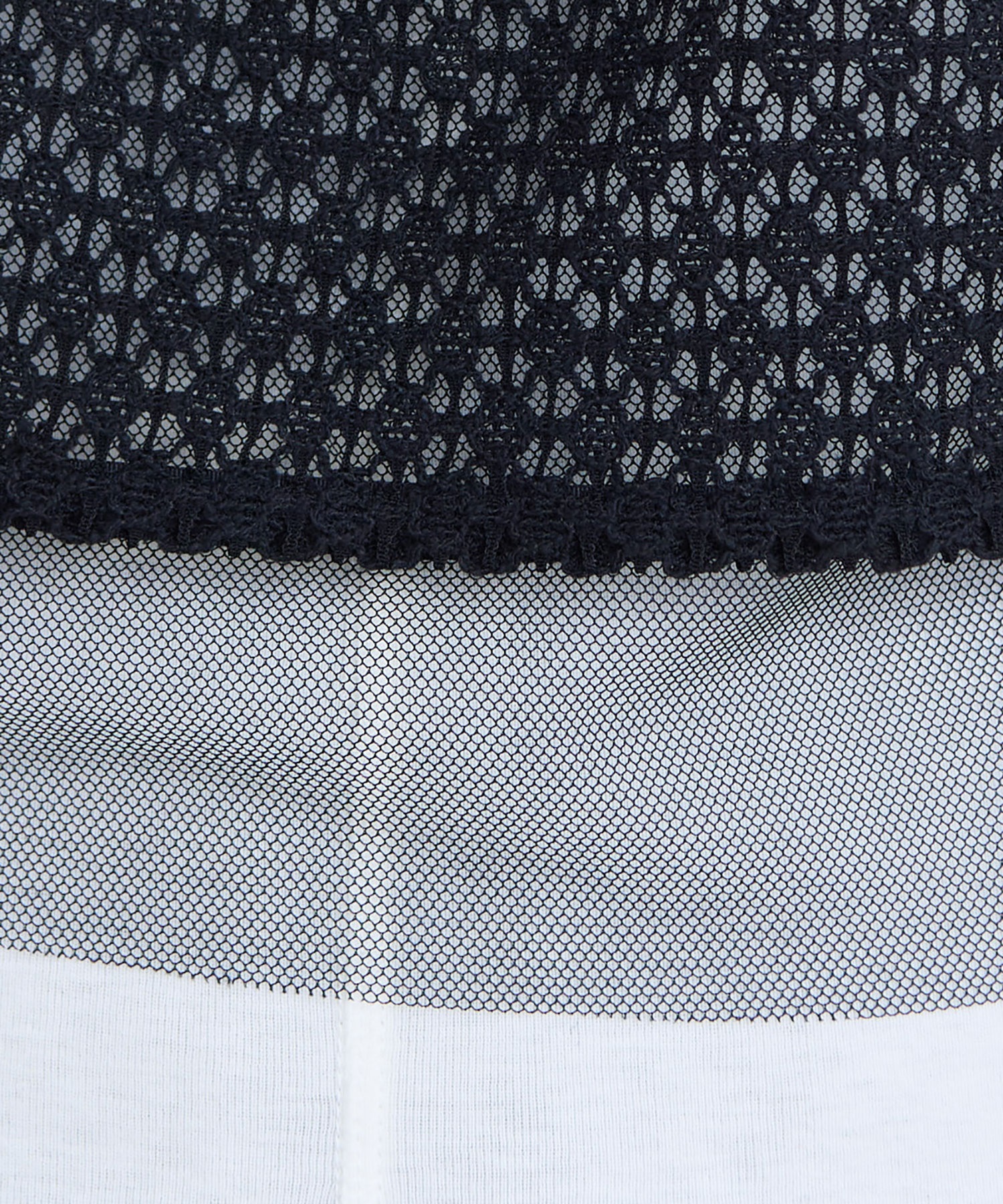 ベースに繊細なナイロン、上に太番の綿が重なった構造のメッシュ見えレースを使用。