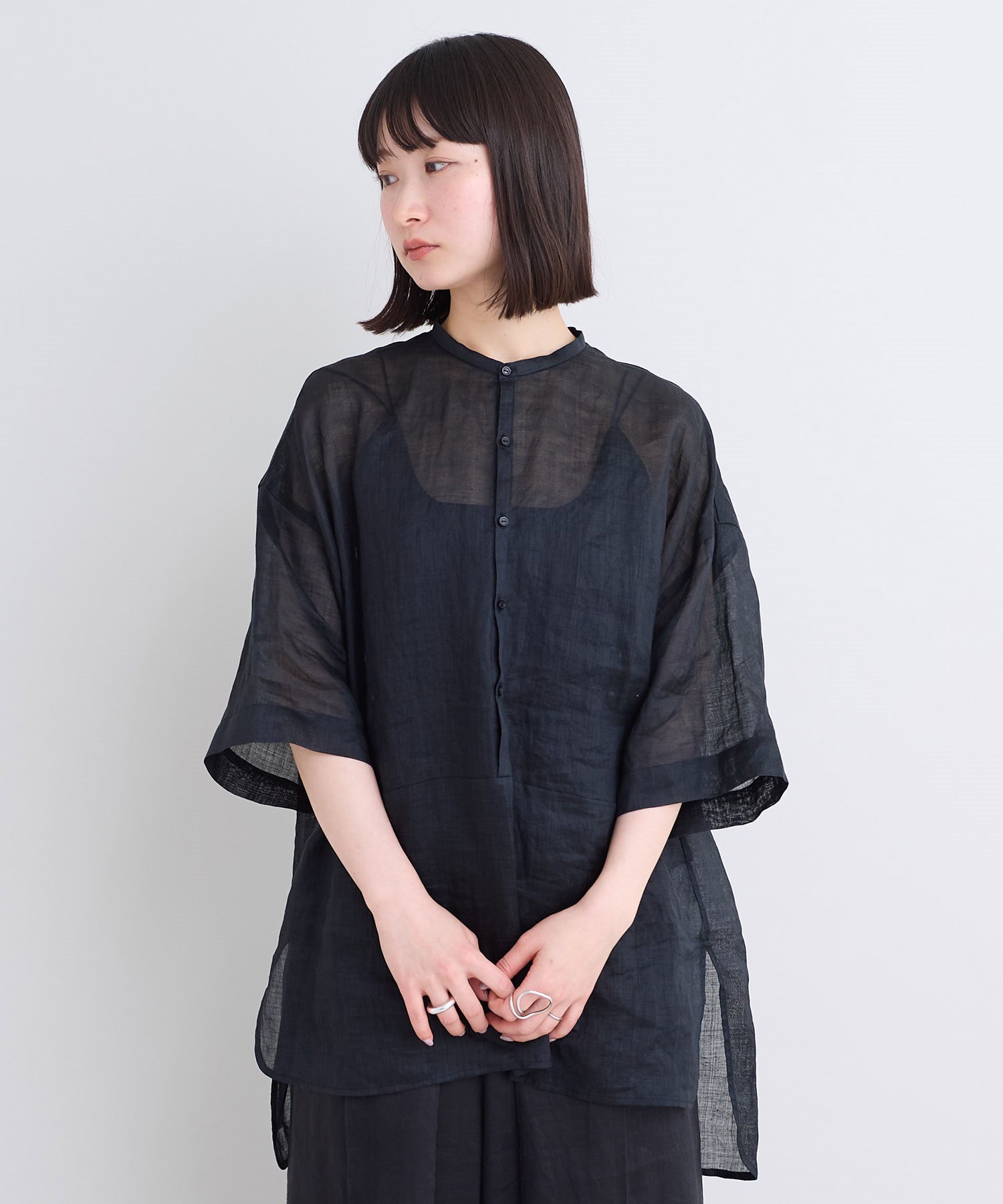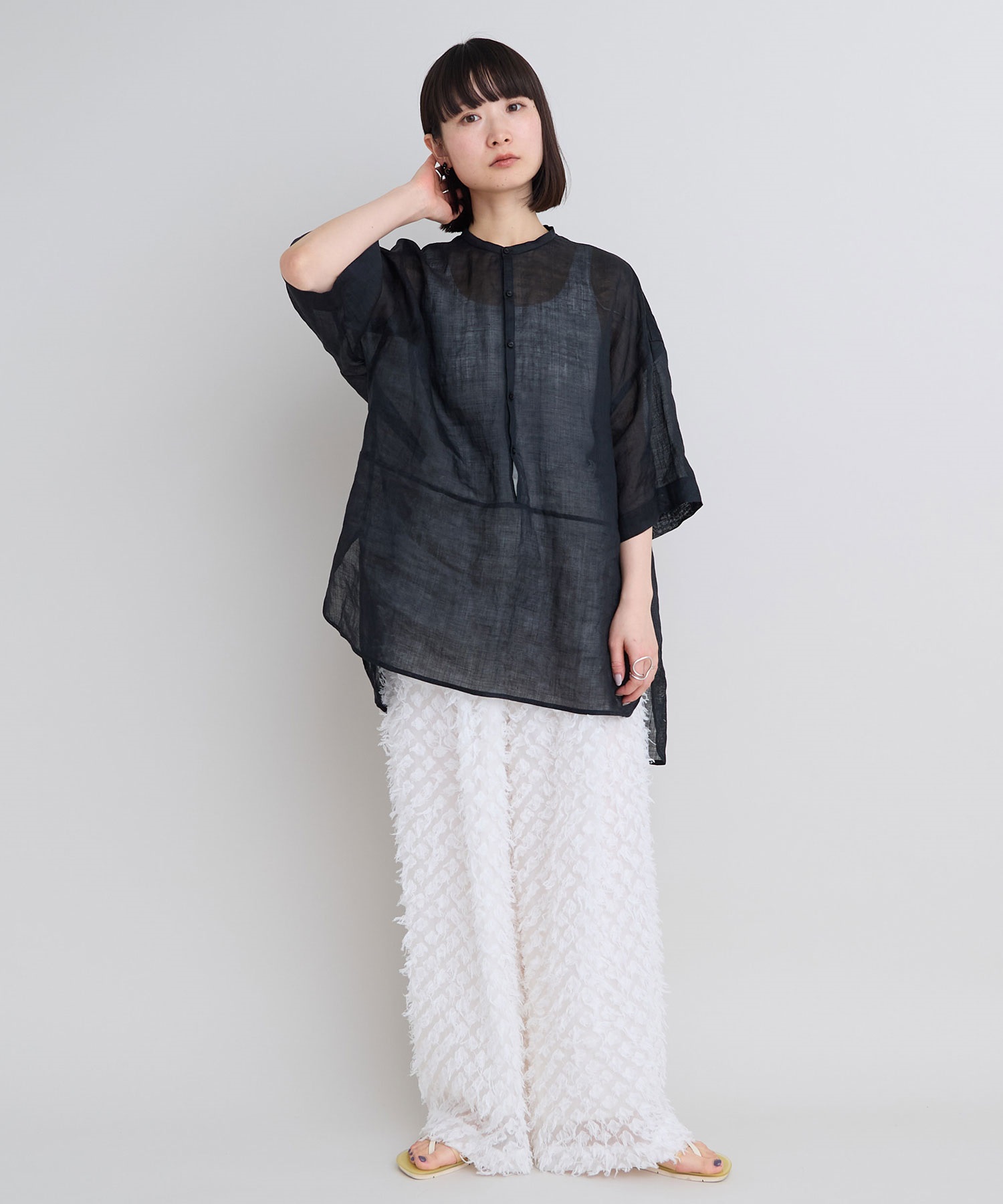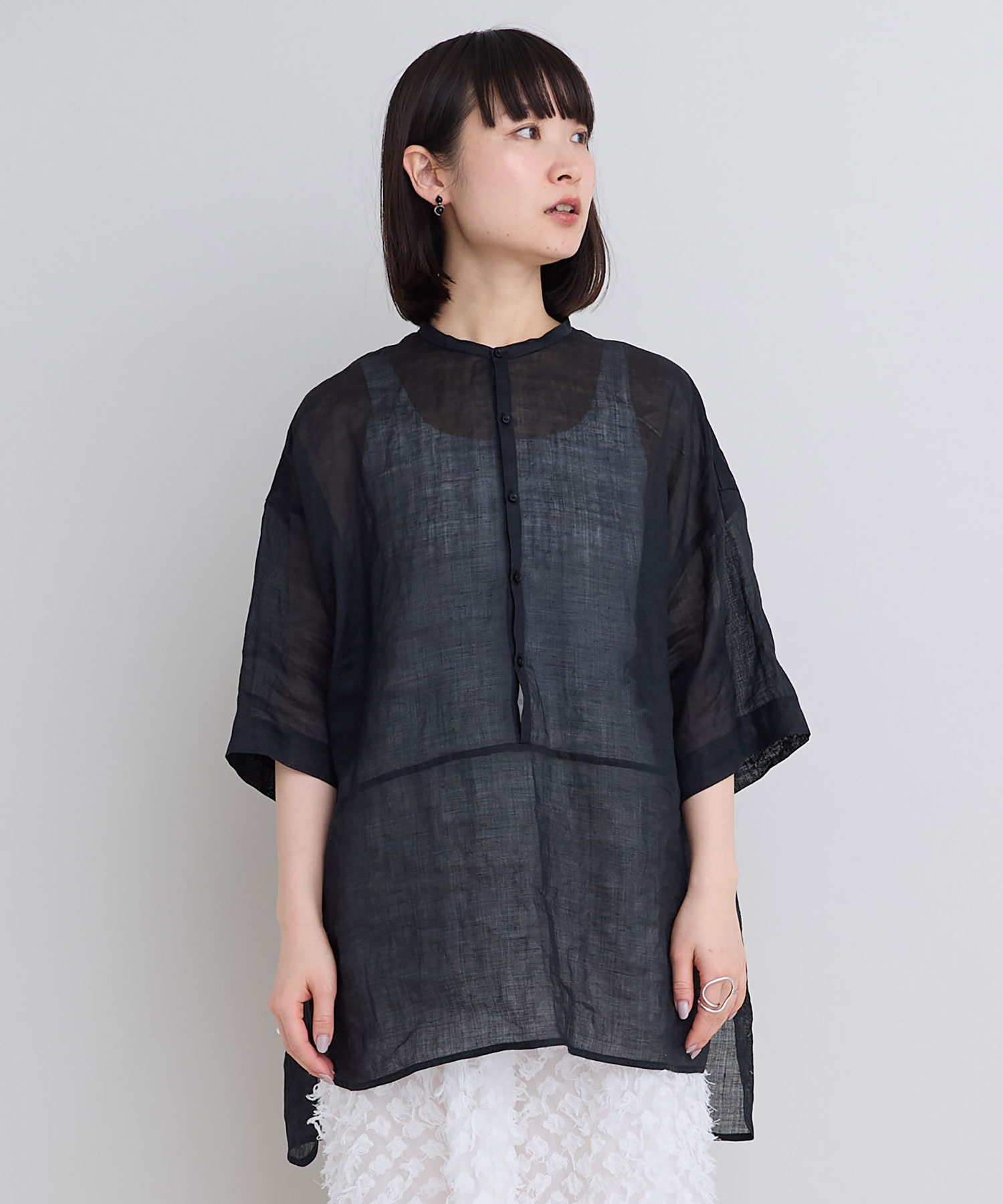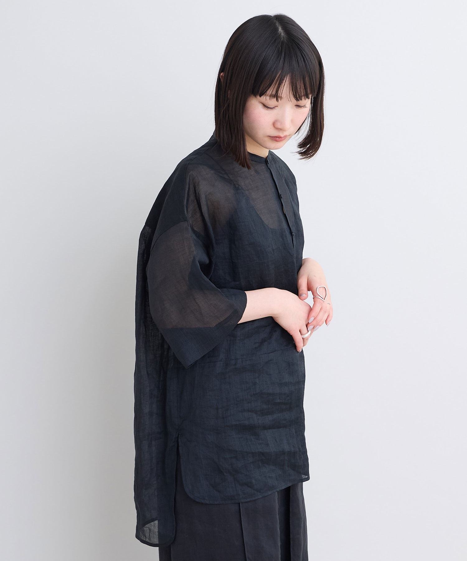 ハリ感と透け感を生かしたジャケットライクなヘンリーネックシャツ。