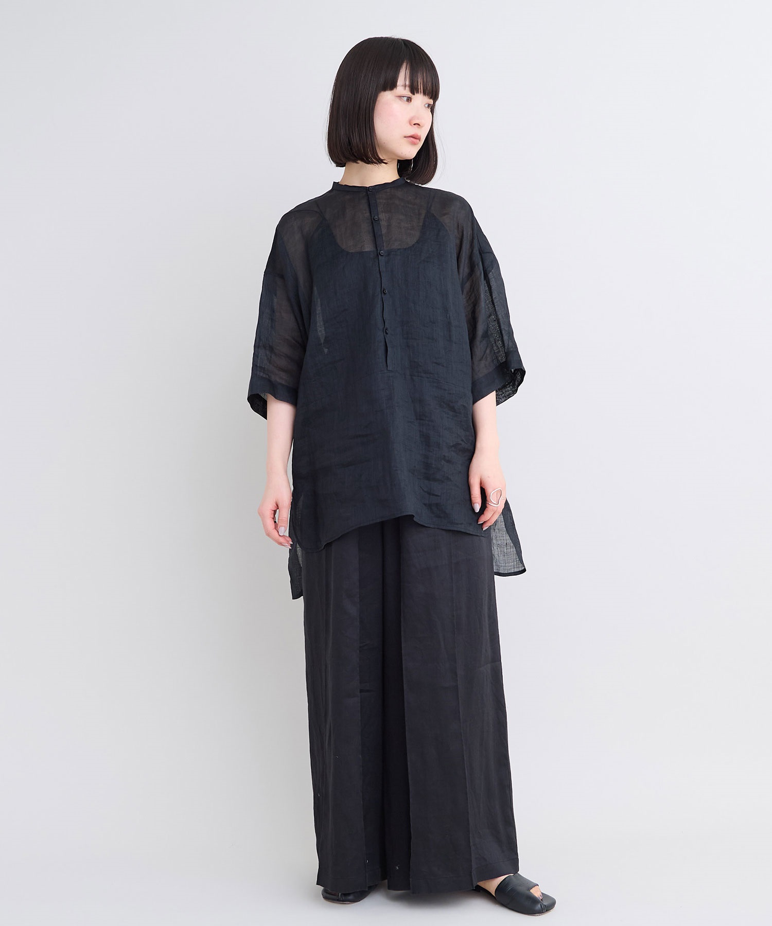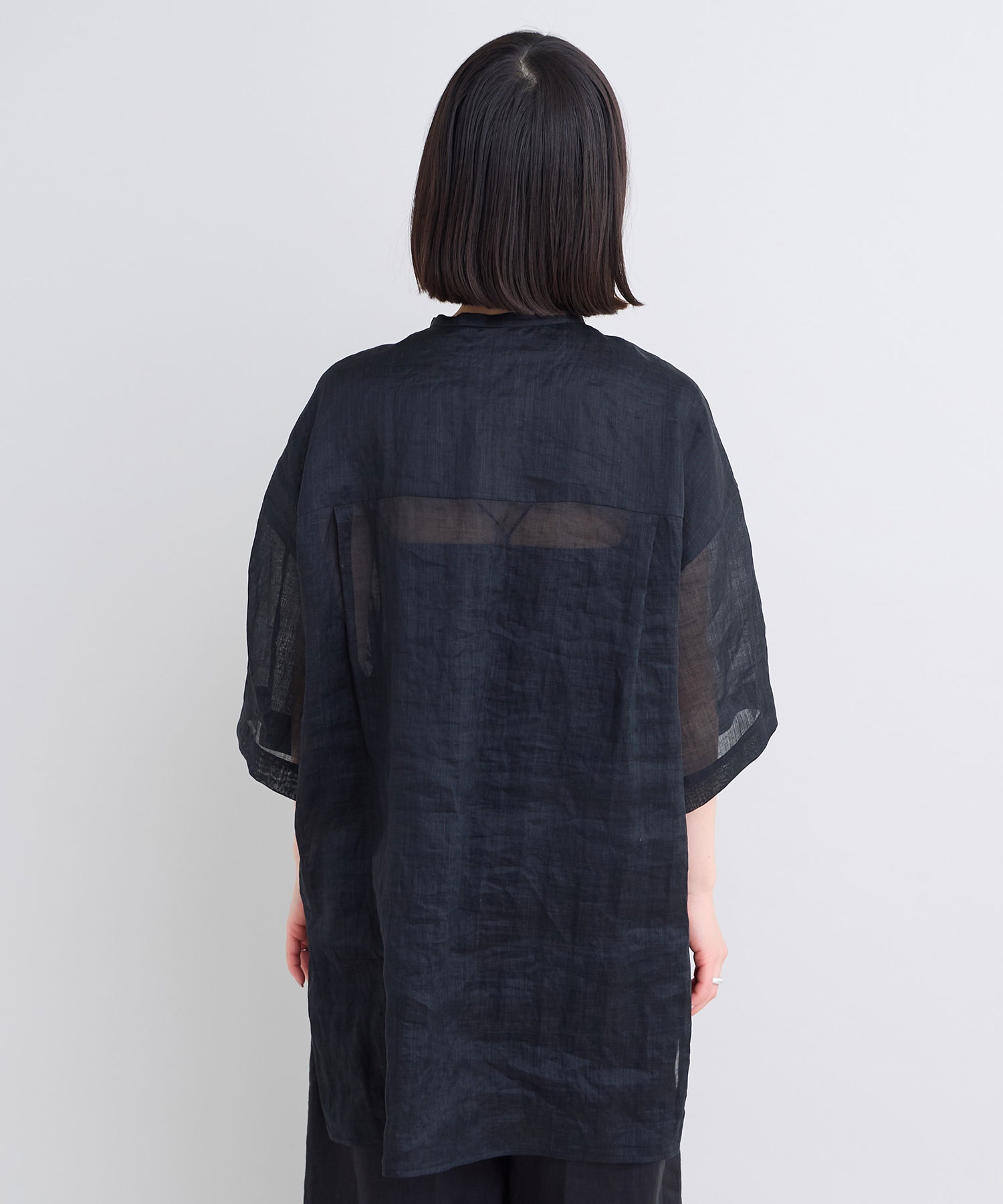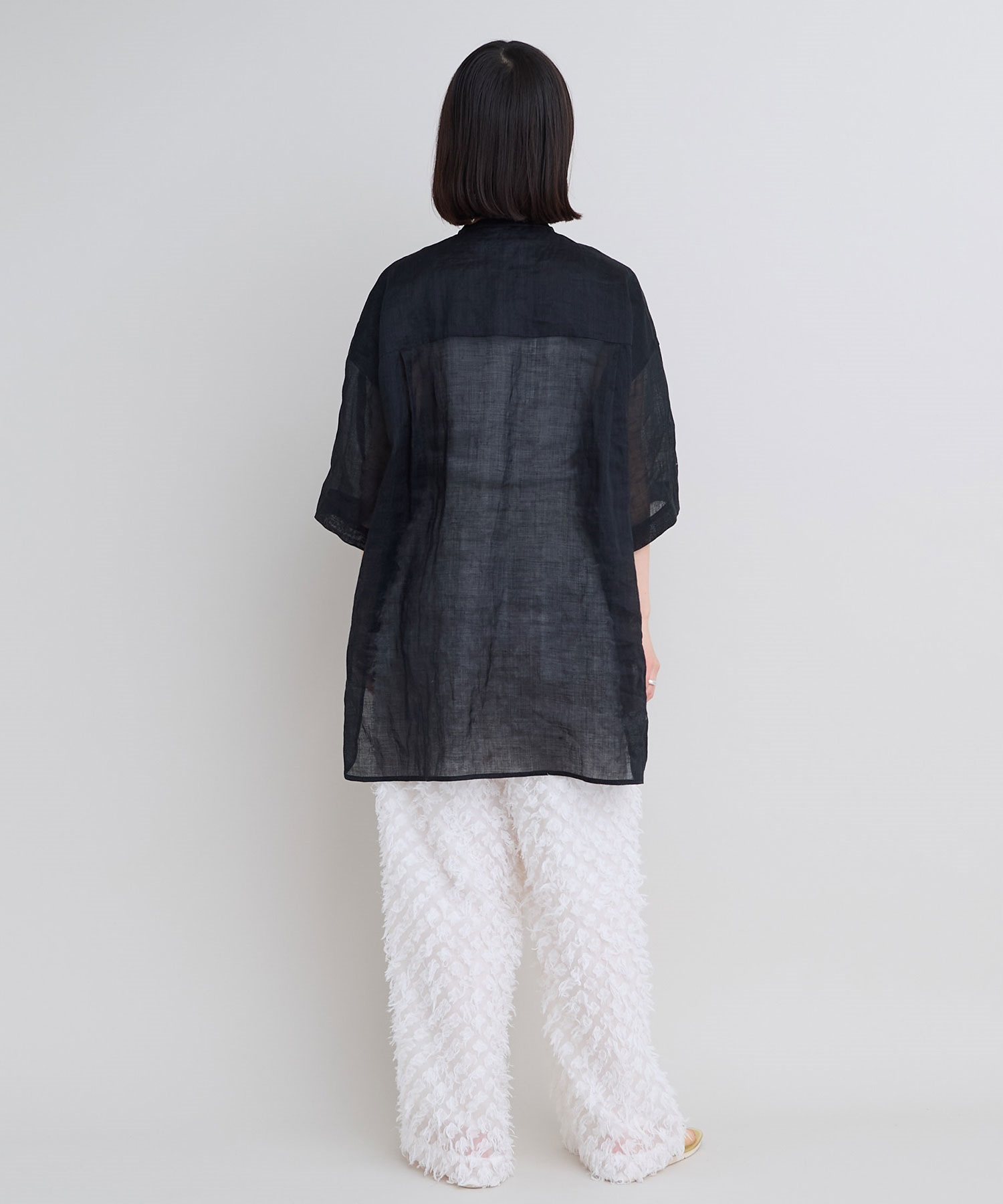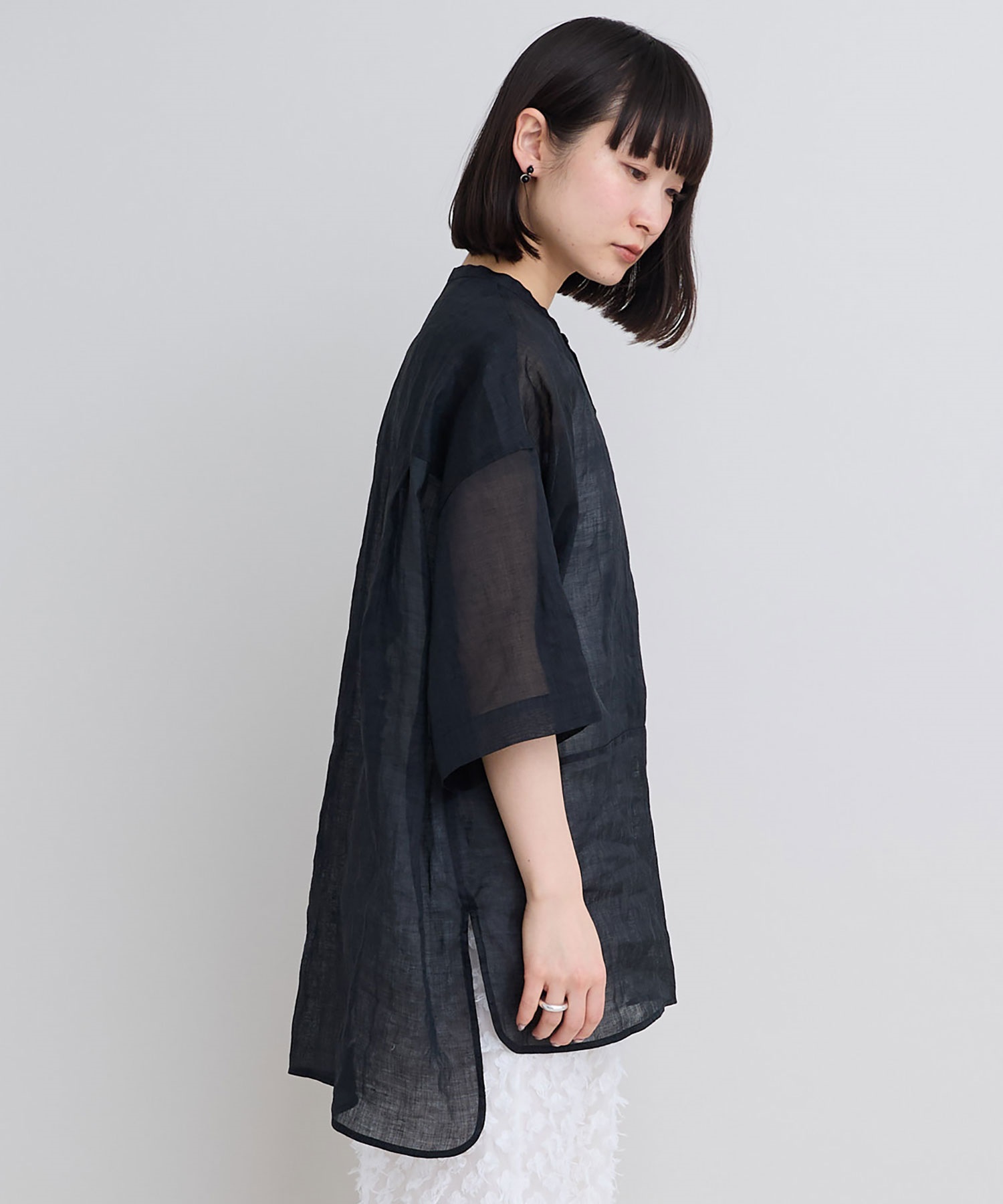 ハリ感と透け感を生かしたジャケットライクなヘンリーネックシャツ。