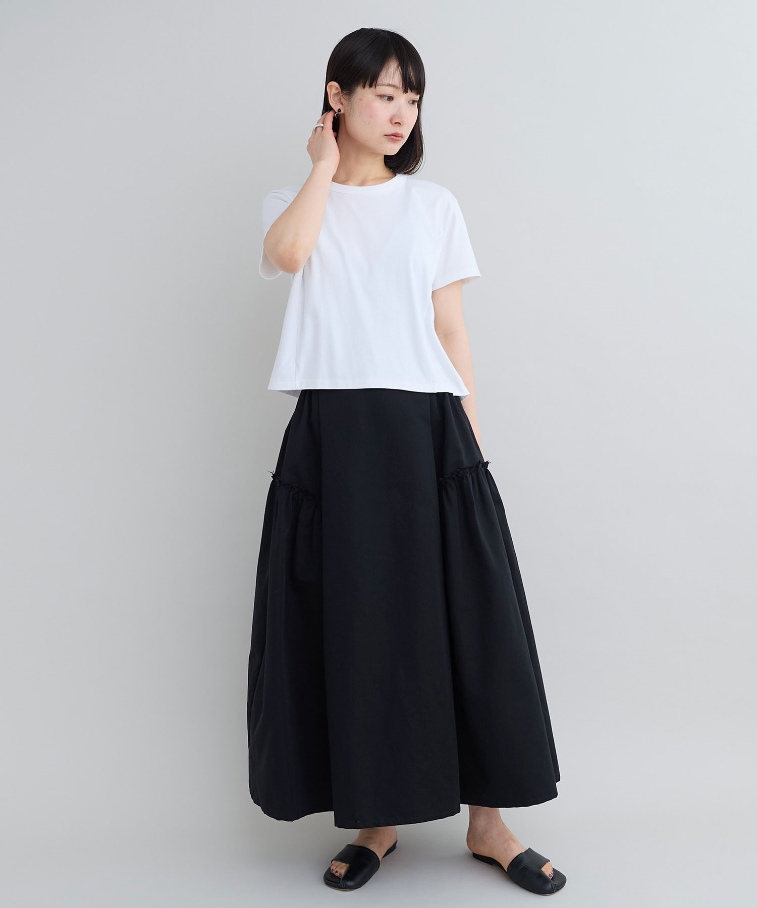 ショート丈のバランスに合わせて身幅はゆとりのあるサイズ感にすることでコーディネートしやすいバランスに。