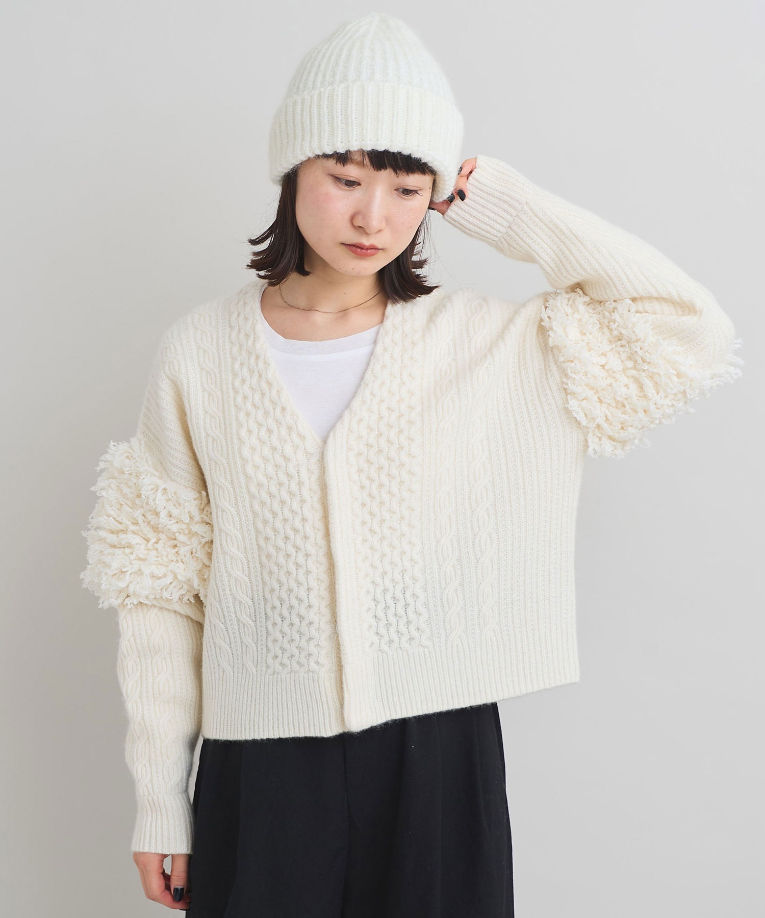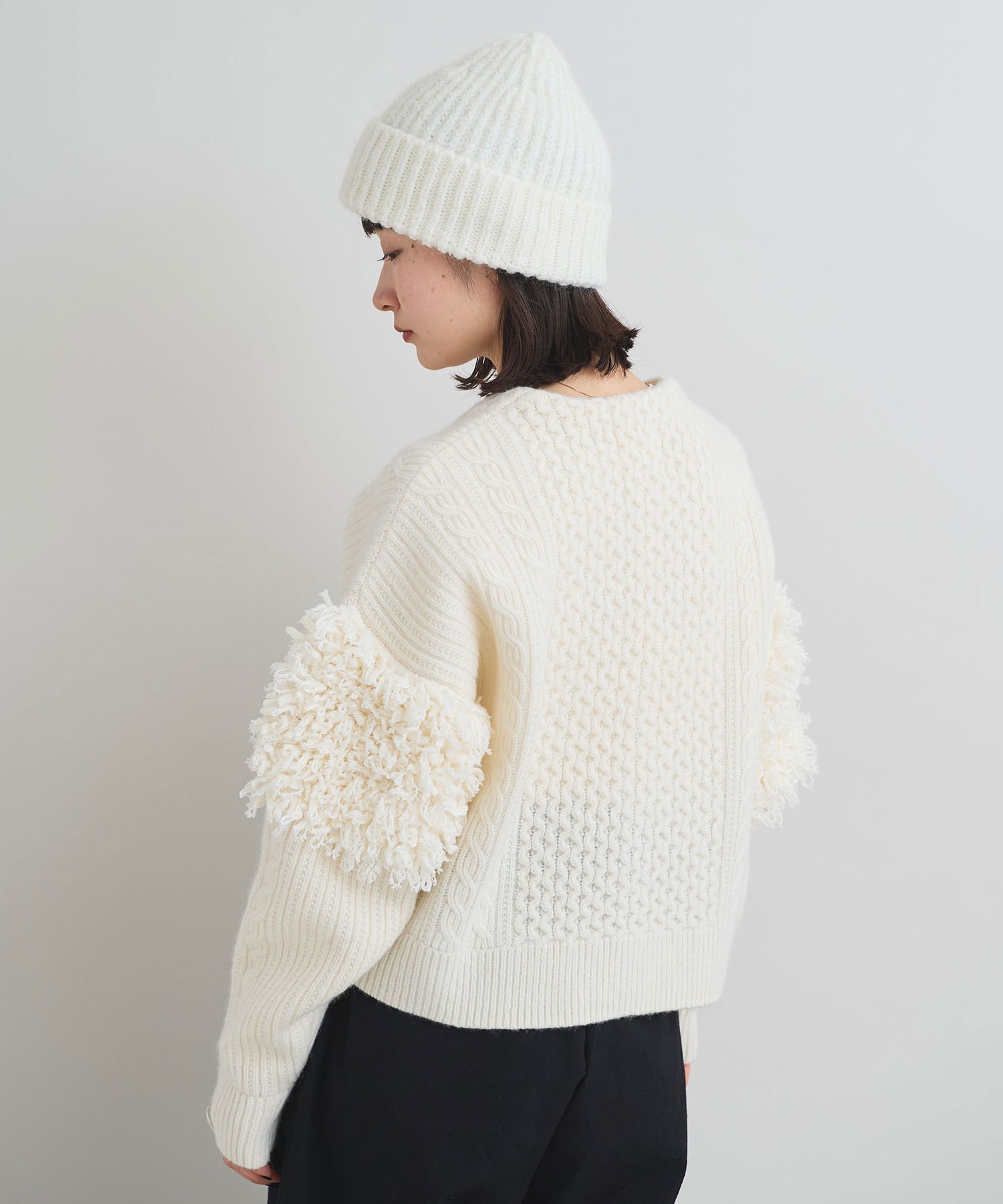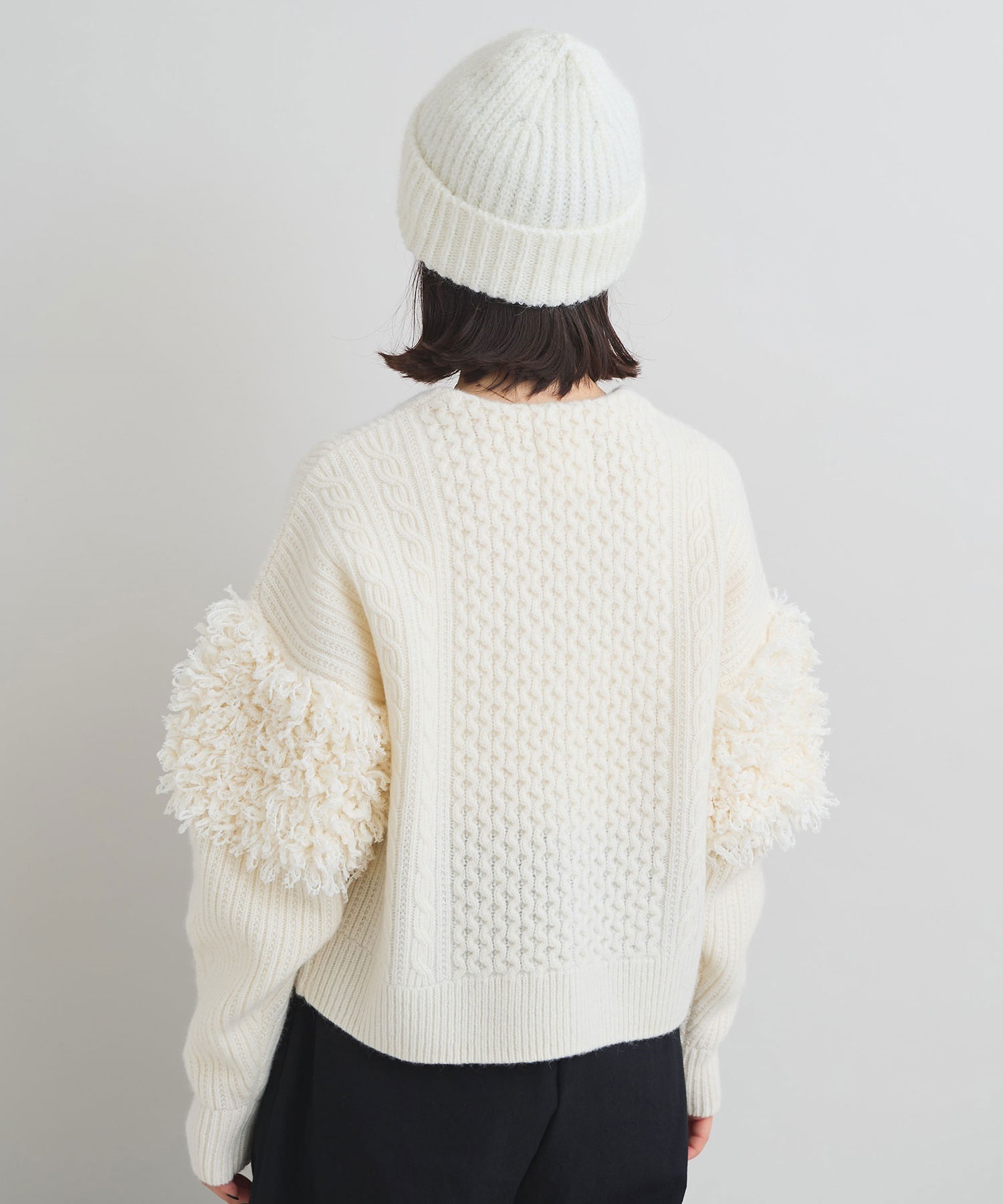 ・この製品に使用しております素材はモヘヤが含まれているため、素材の特性上こすられたりした場合、毛が抜けて他のものに付着する事がありますのでご注意ください。また、伸縮性の強い素材を使用しているため、着用を重ねると伸びてくる可能性があります。あらかじめご了承下さい。