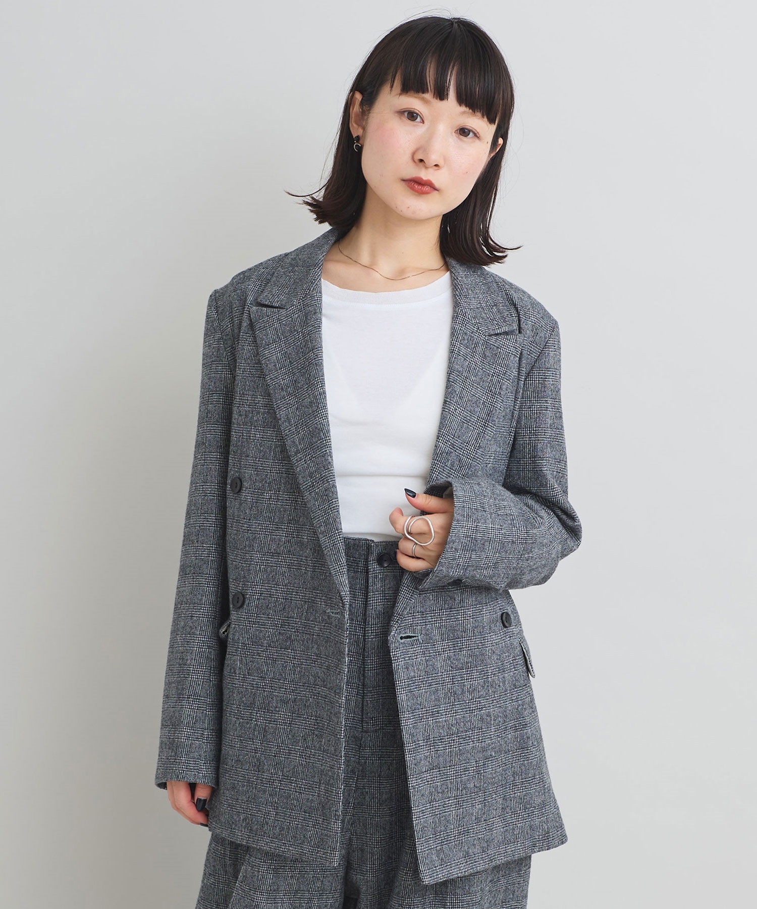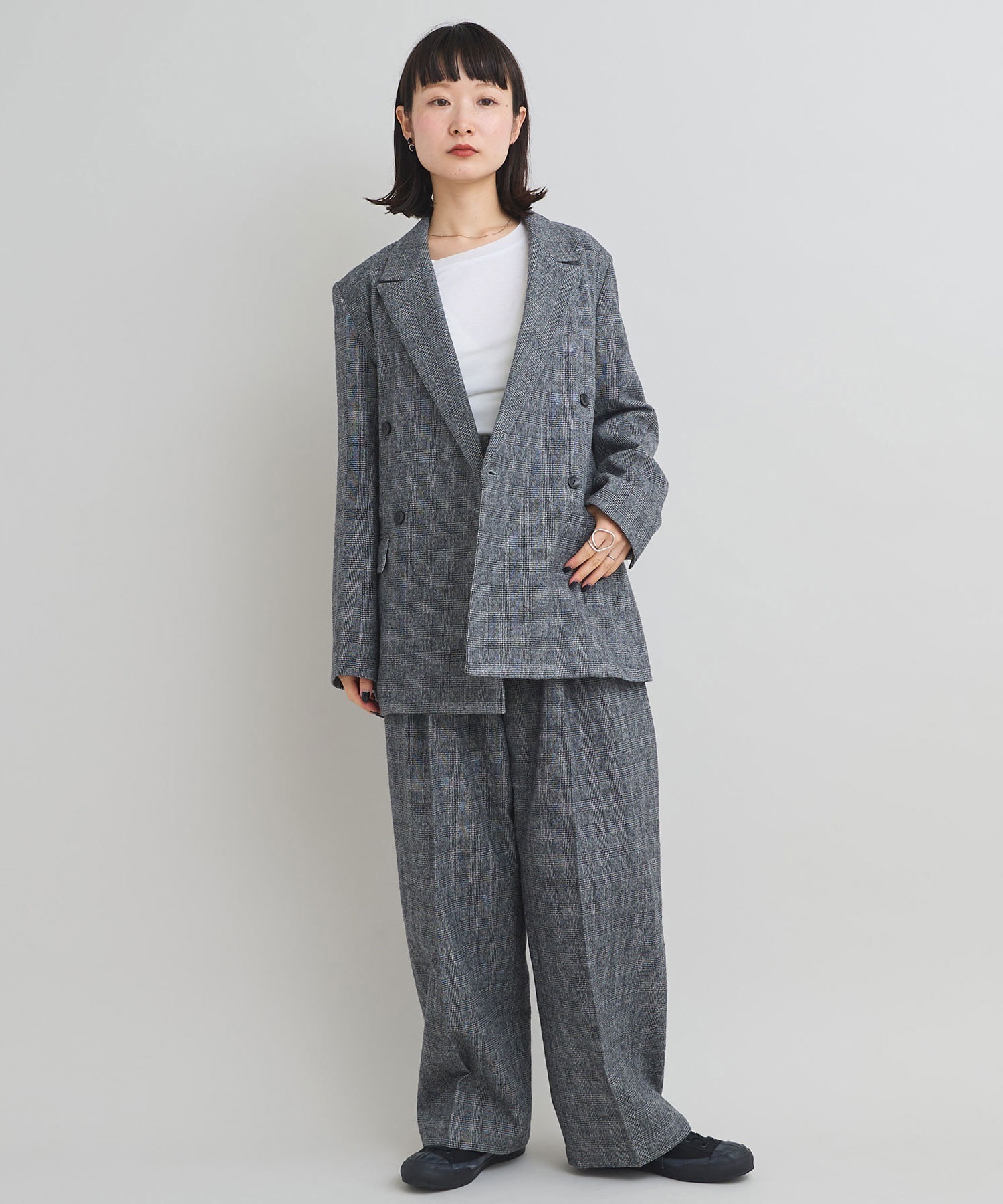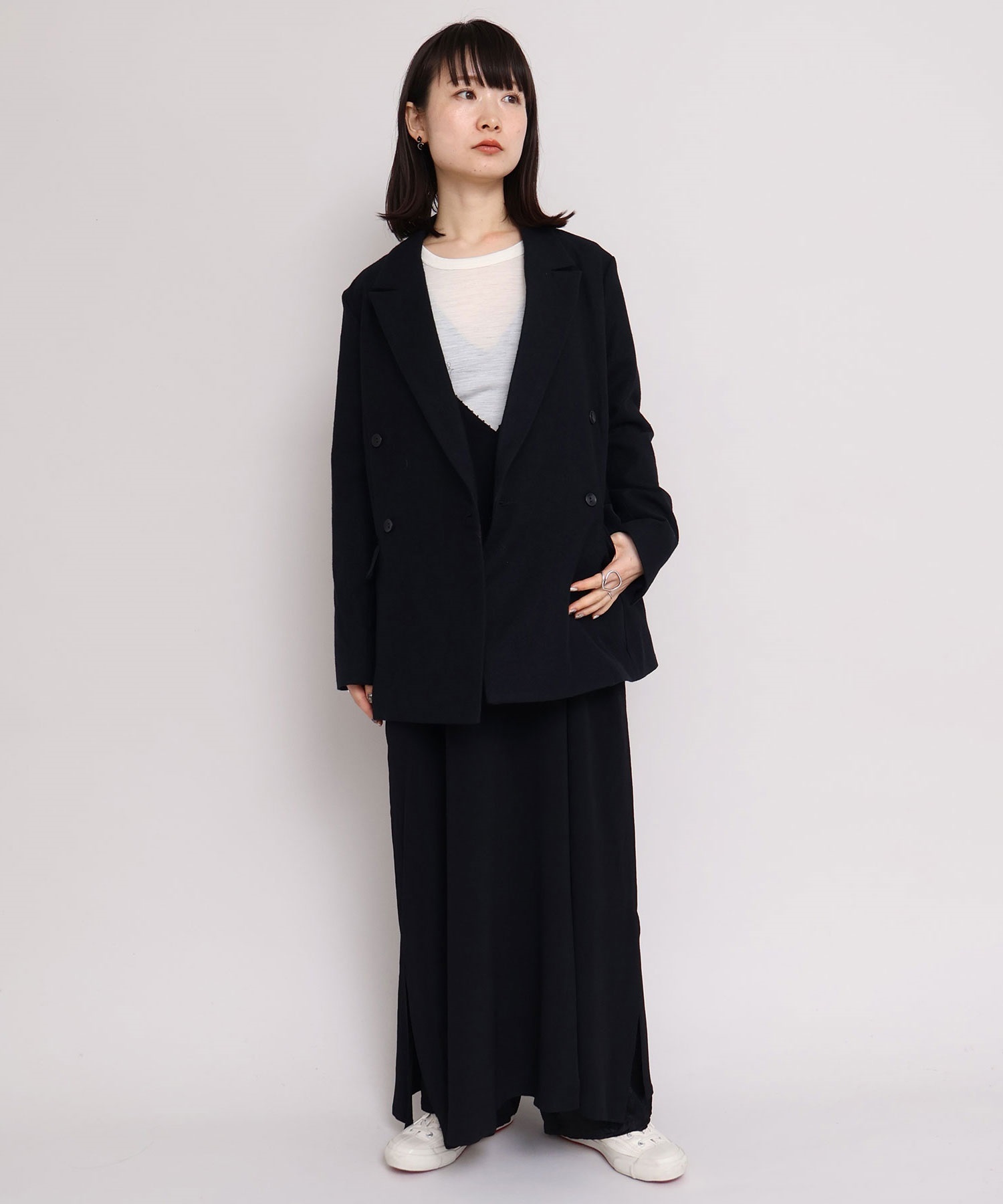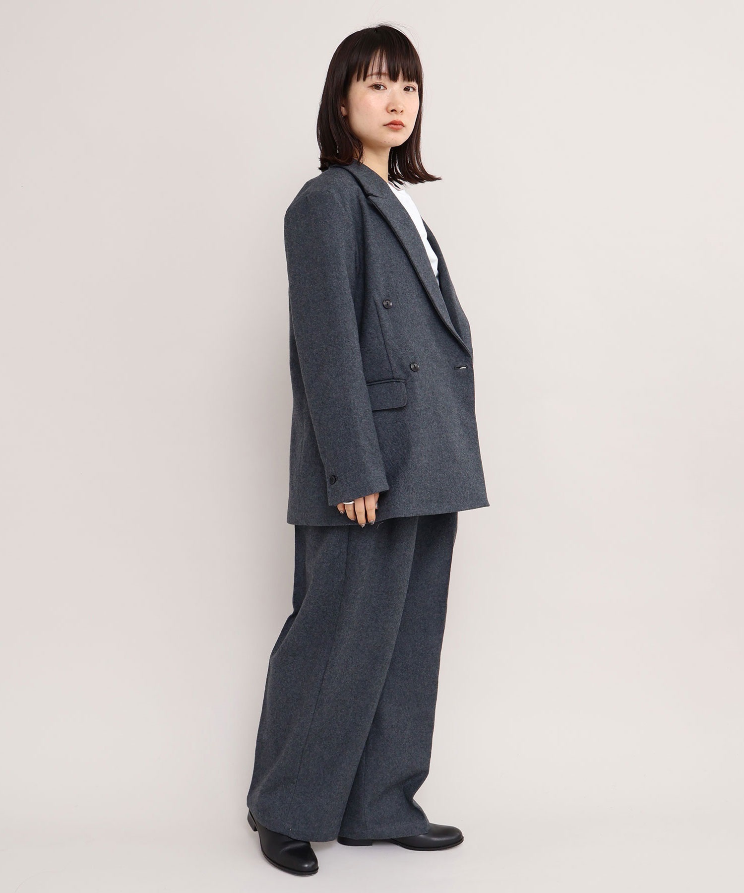 ジャケットは大き目のピークドラペルとダブルの合わせで辛めの印象に。