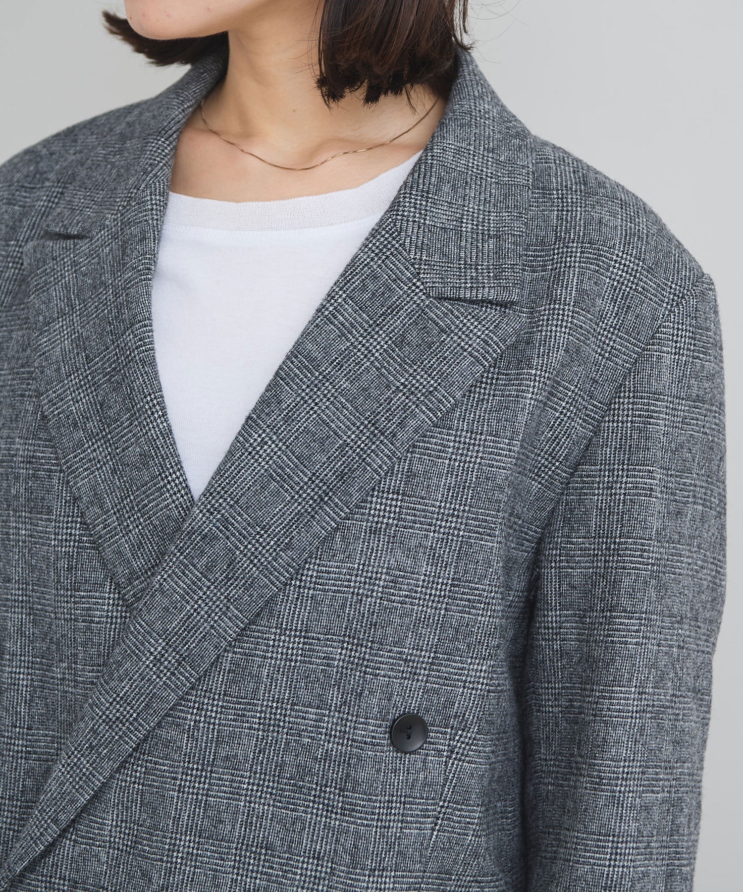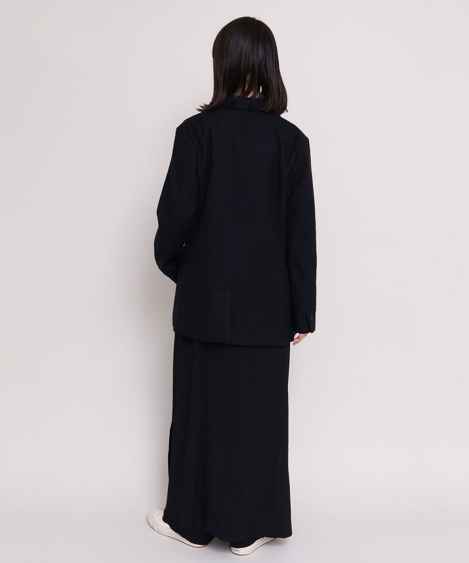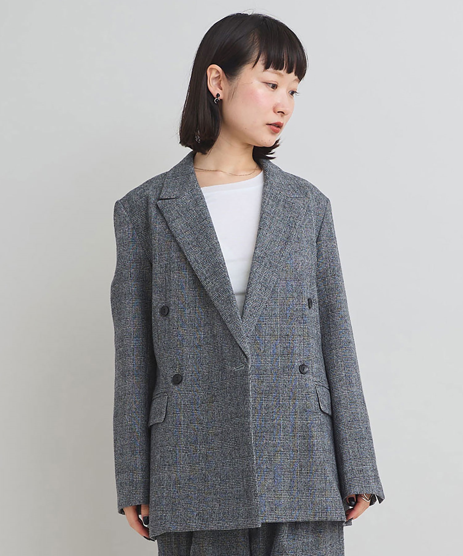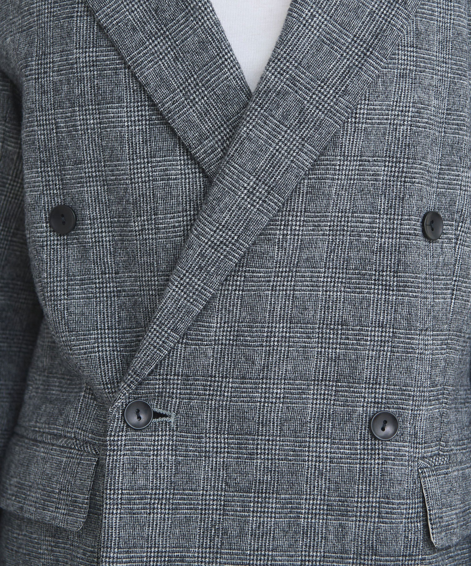 ジャケットは大き目のピークドラペルとダブルの合わせで辛めの印象に。