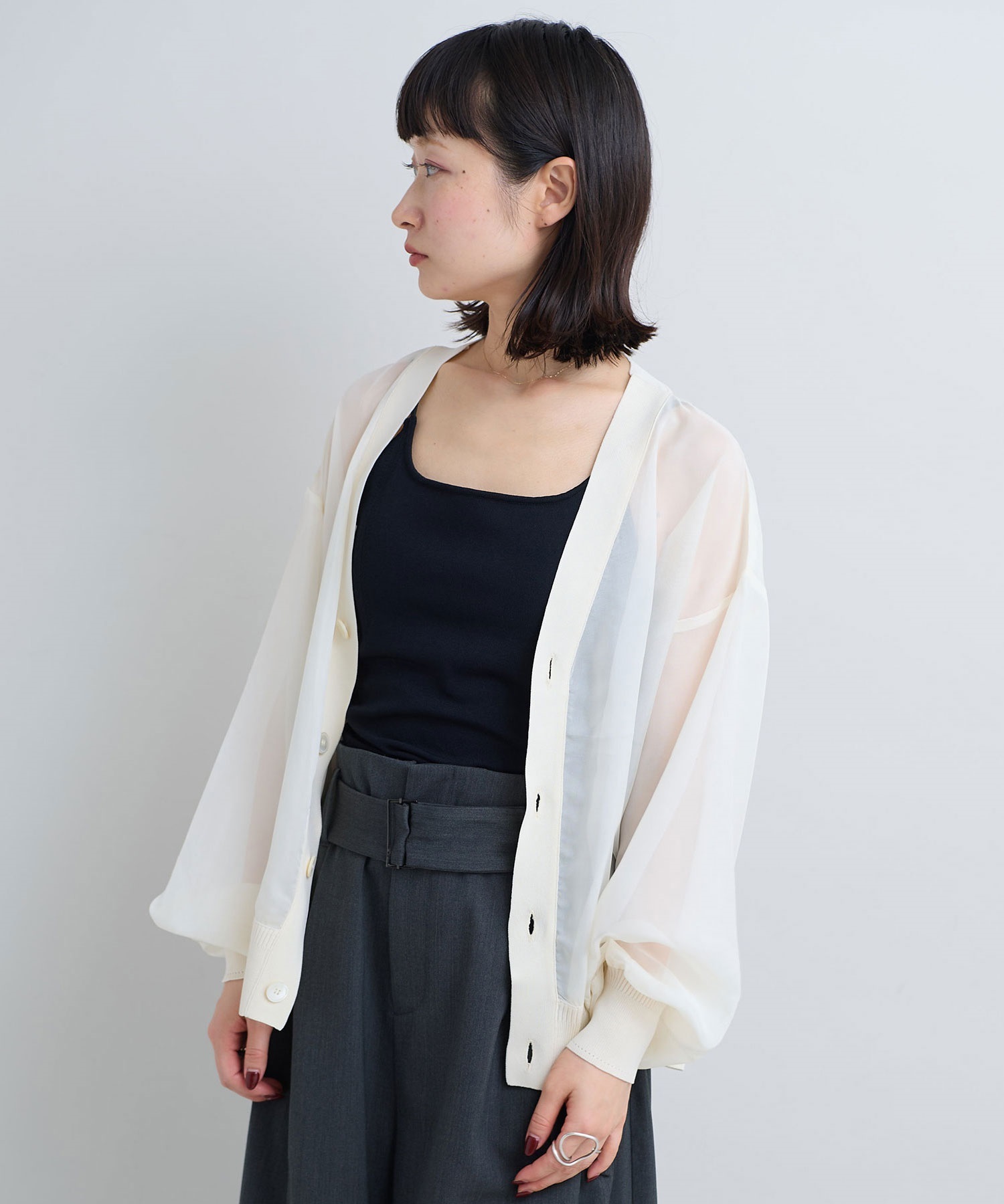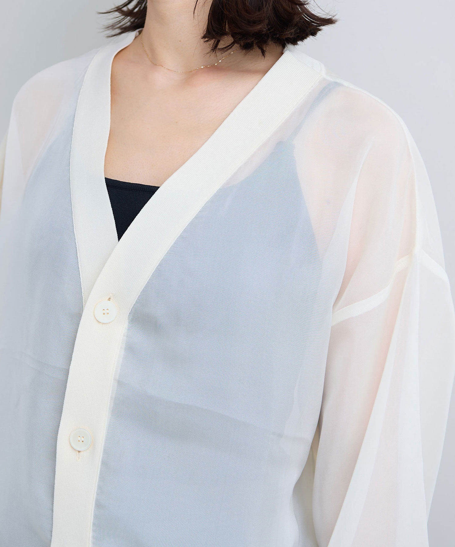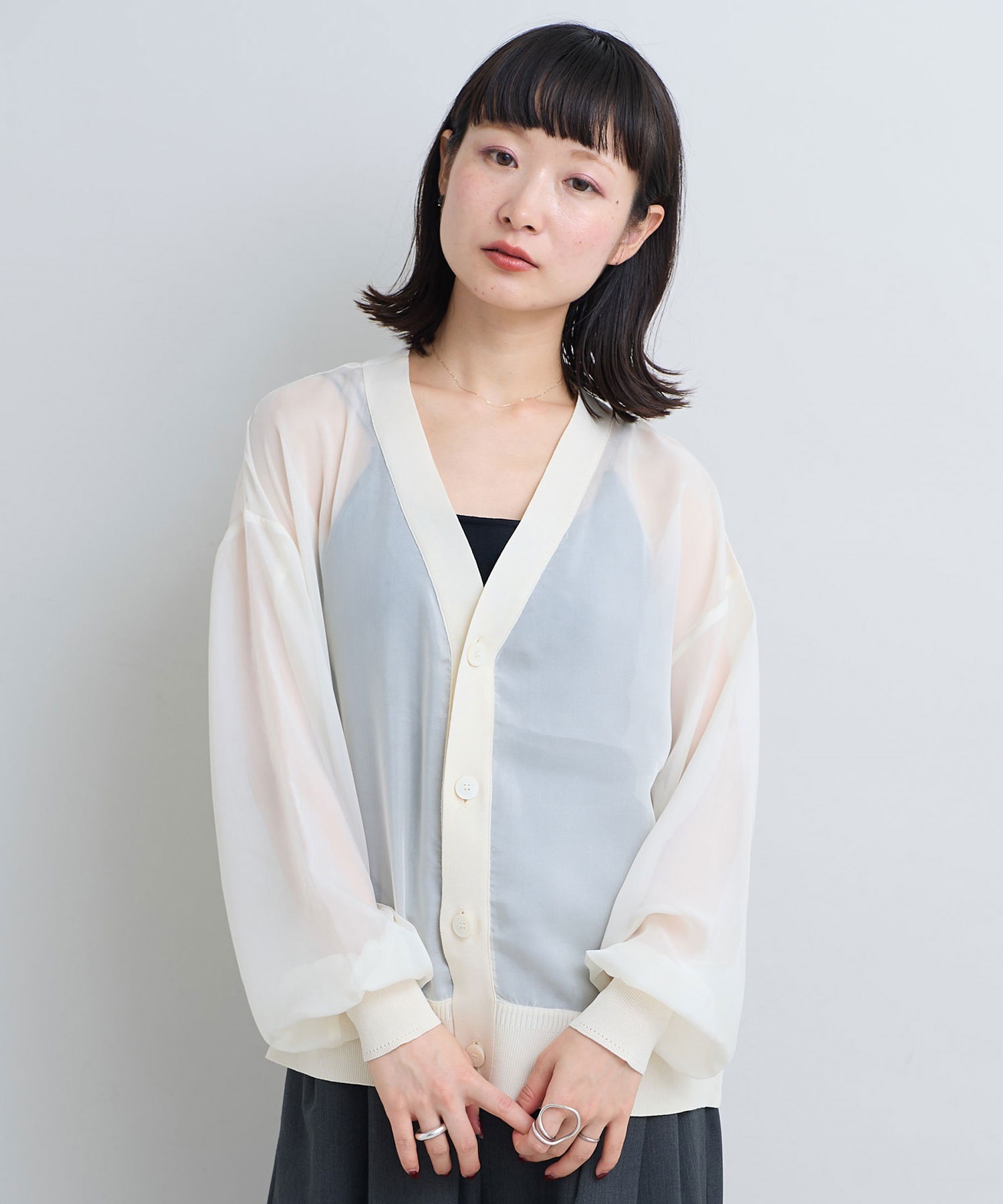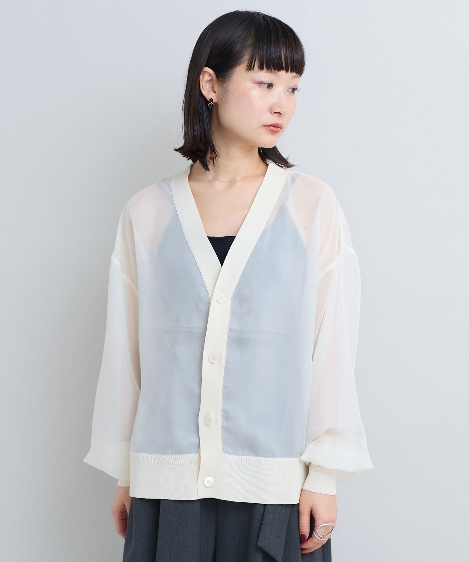 シアーな素材感のニットドッキングカーディガン。