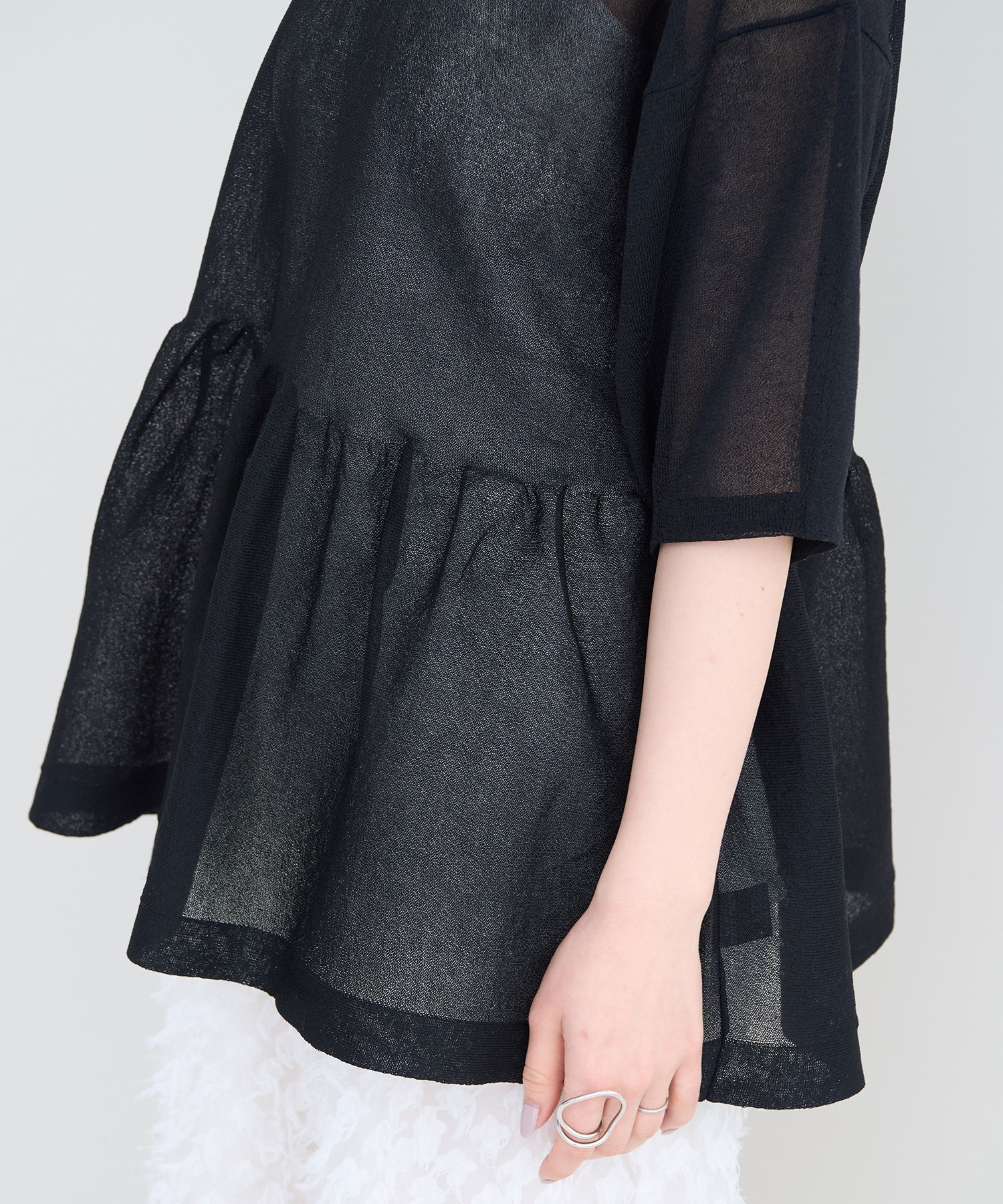 横に編んで目数を減らすことで編み続きでフレアのギャザーを作っています。