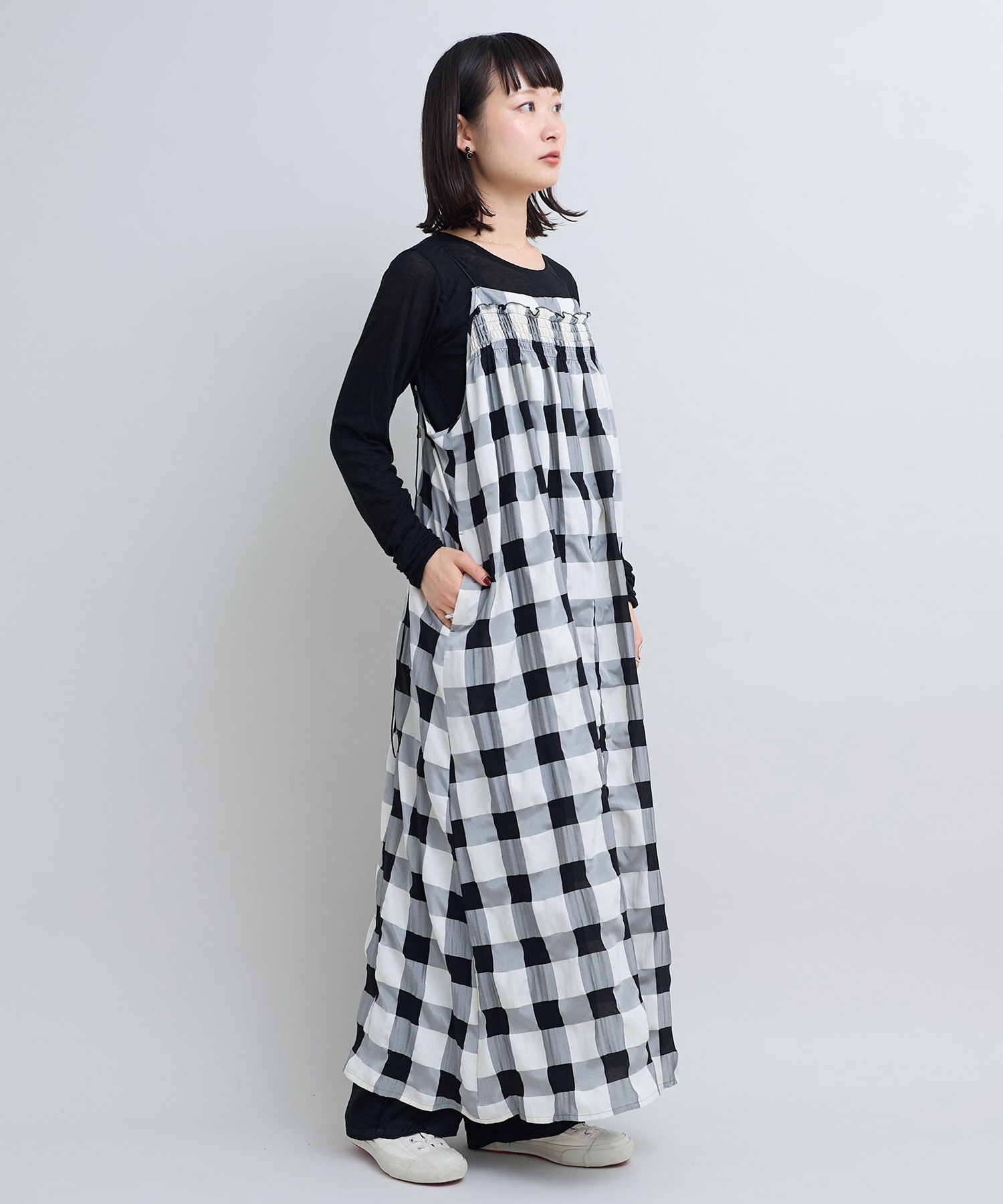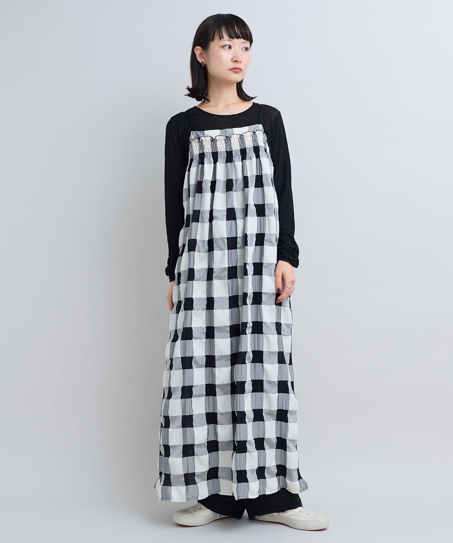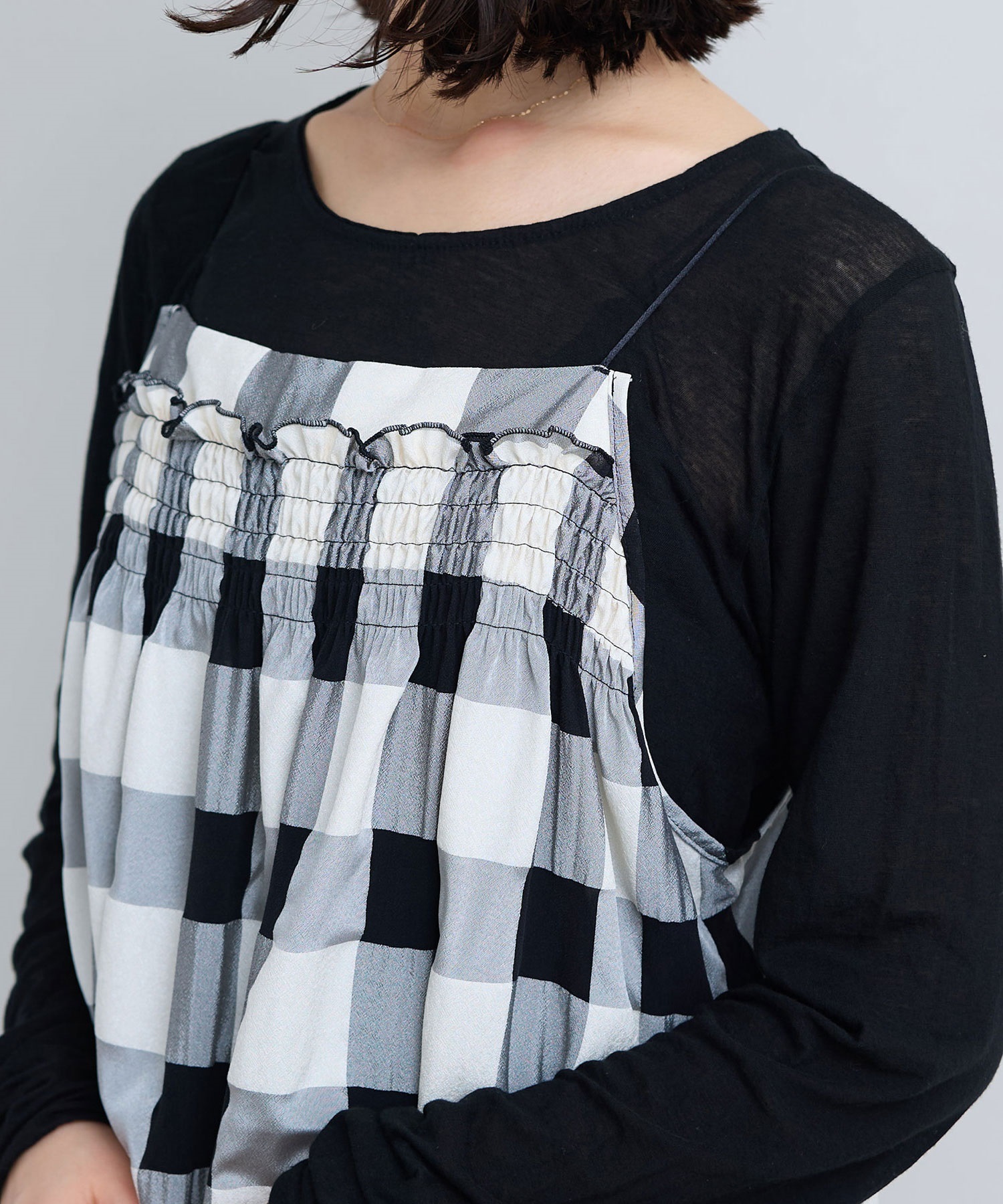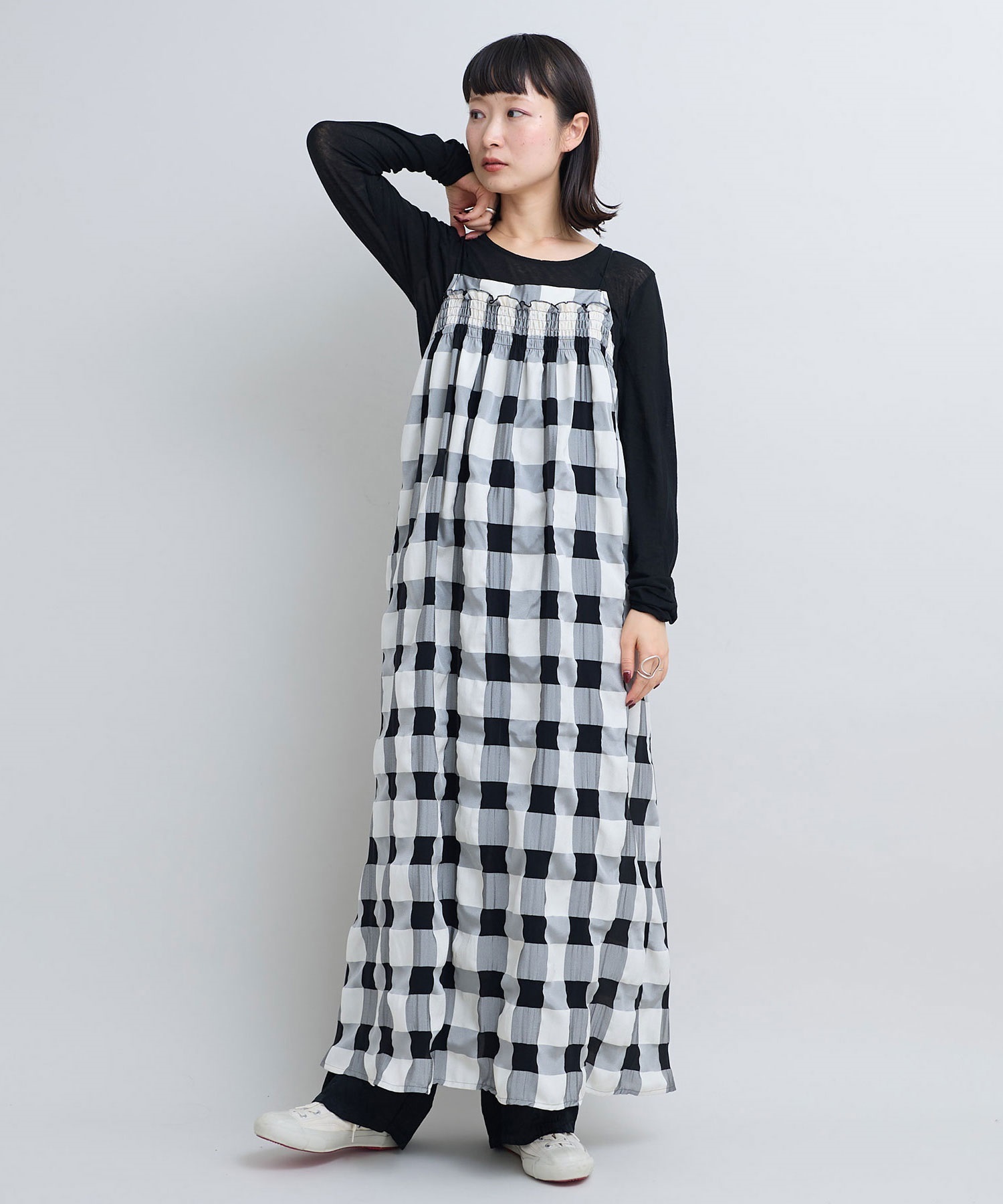 襟元に入れたシャーリングとボリューム感が印象的なワンピース。